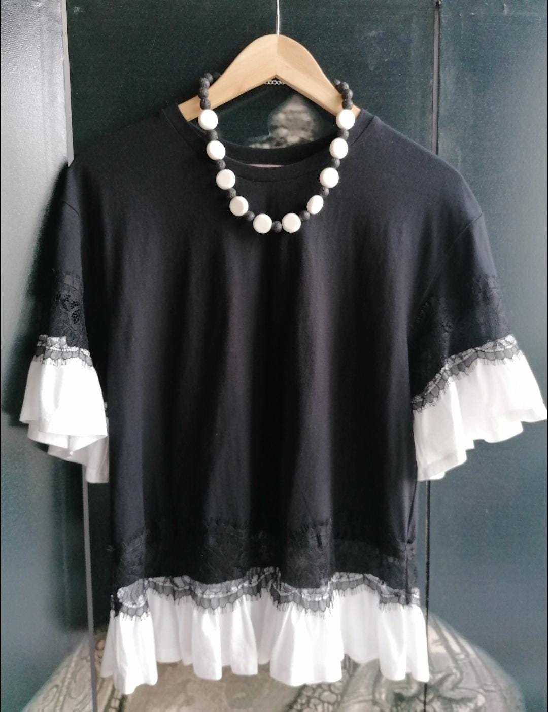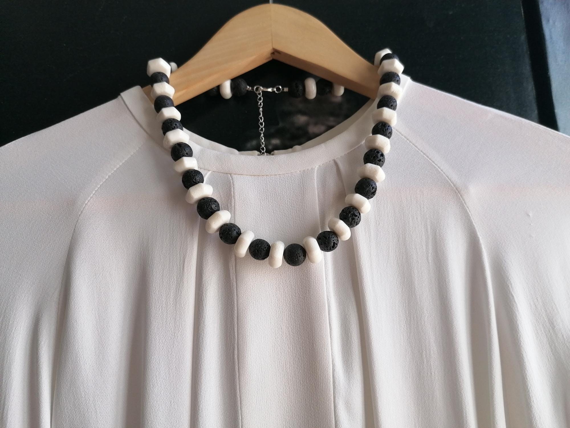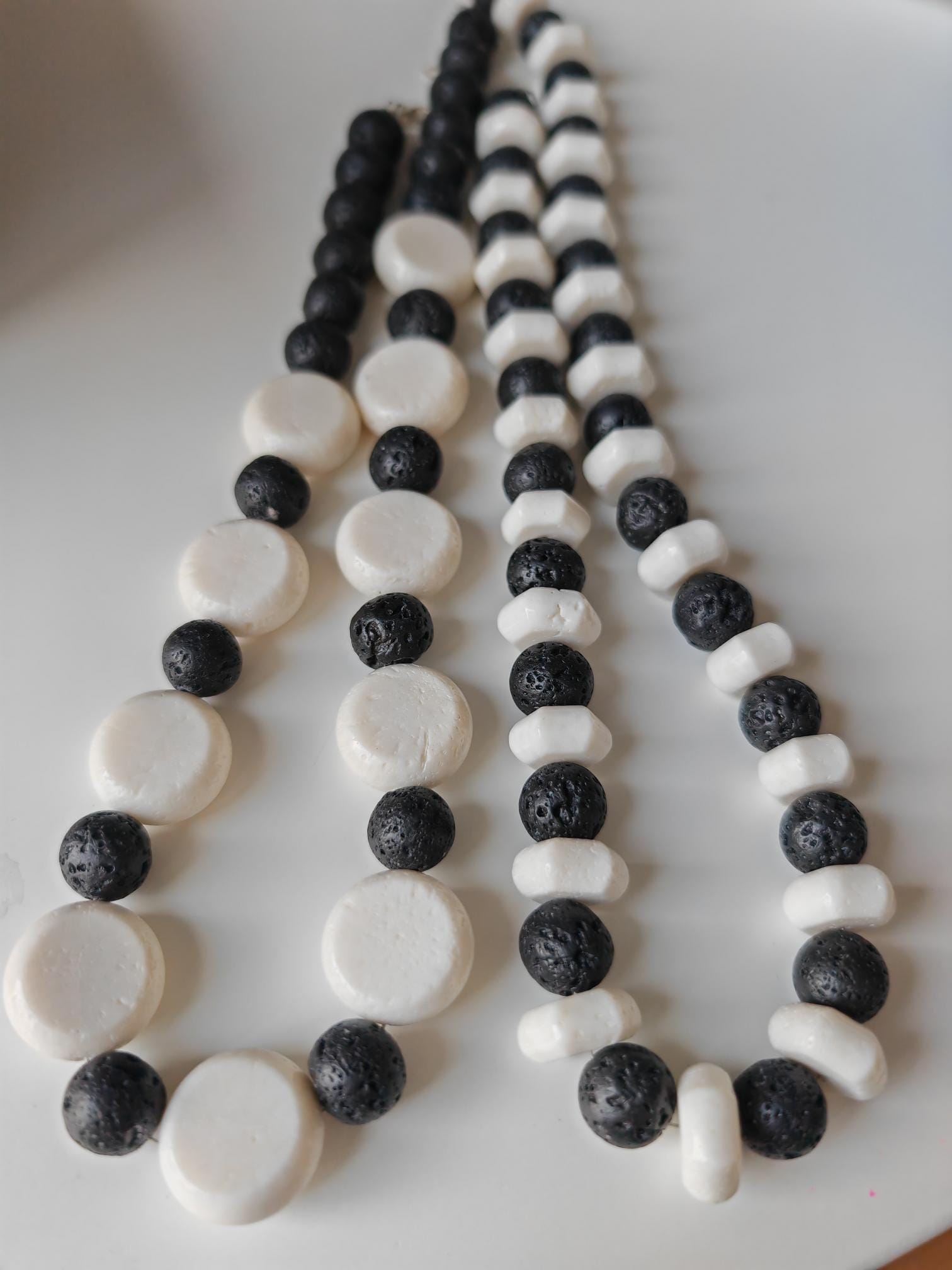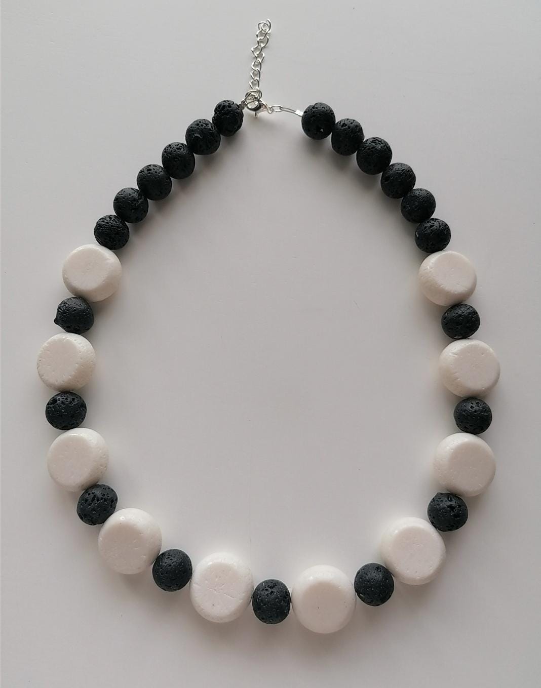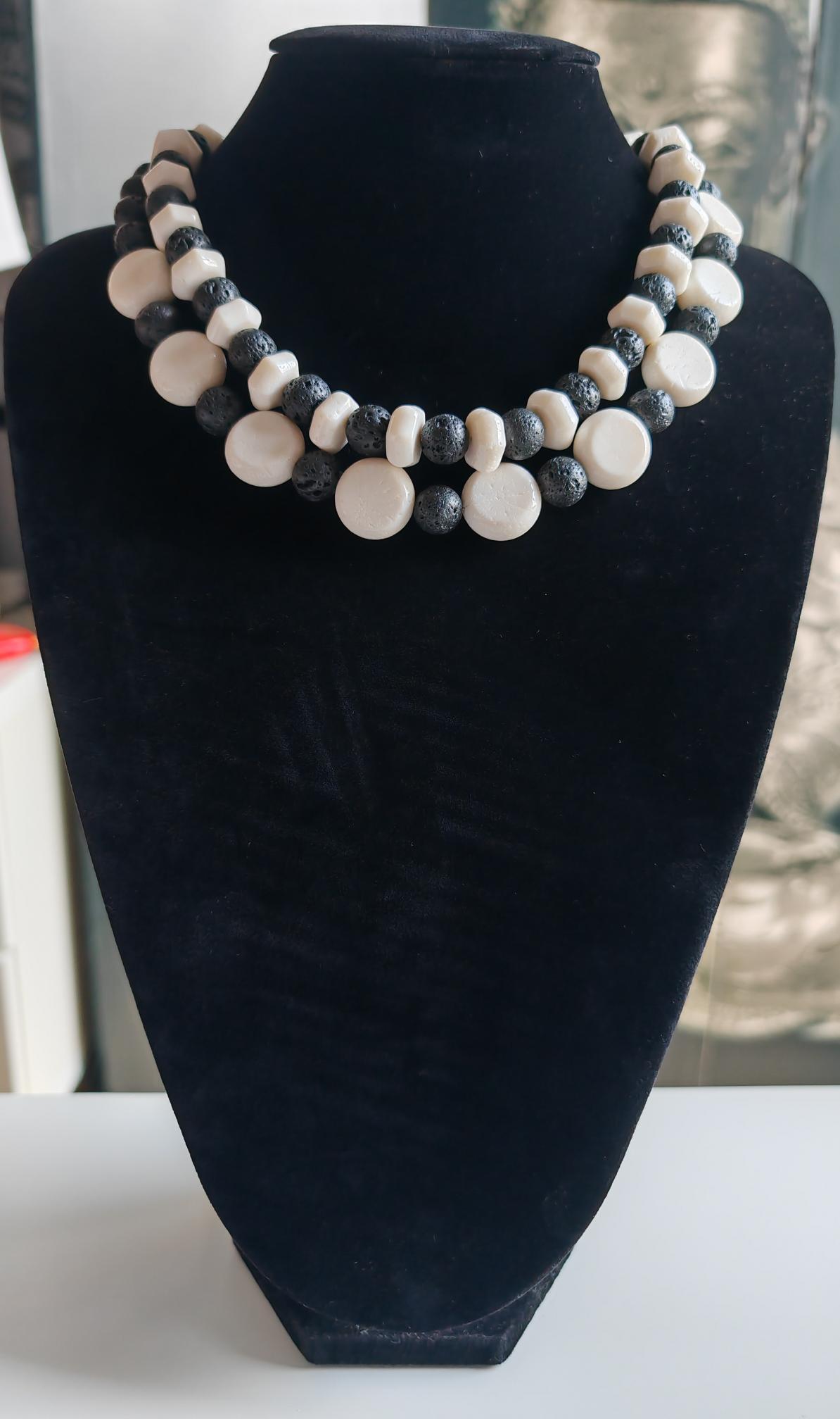 Handmade black and white necklaces made of coral and lava stone. Two chain options available.