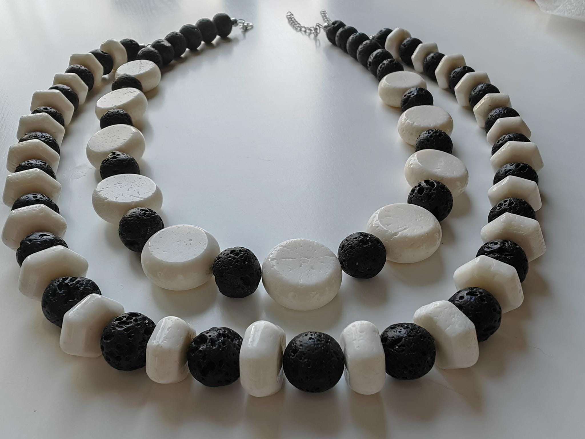 The two-tone necklace with hexagonal white coral beads is approximately 50 cm long, plus a 7 cm extender. The necklace is made of hexagonal white coral beads (approx. 15 mm x 5 mm) and round black lava stone beads (approx. 12 mm). The clasp and extender are silver. A lovely gift!