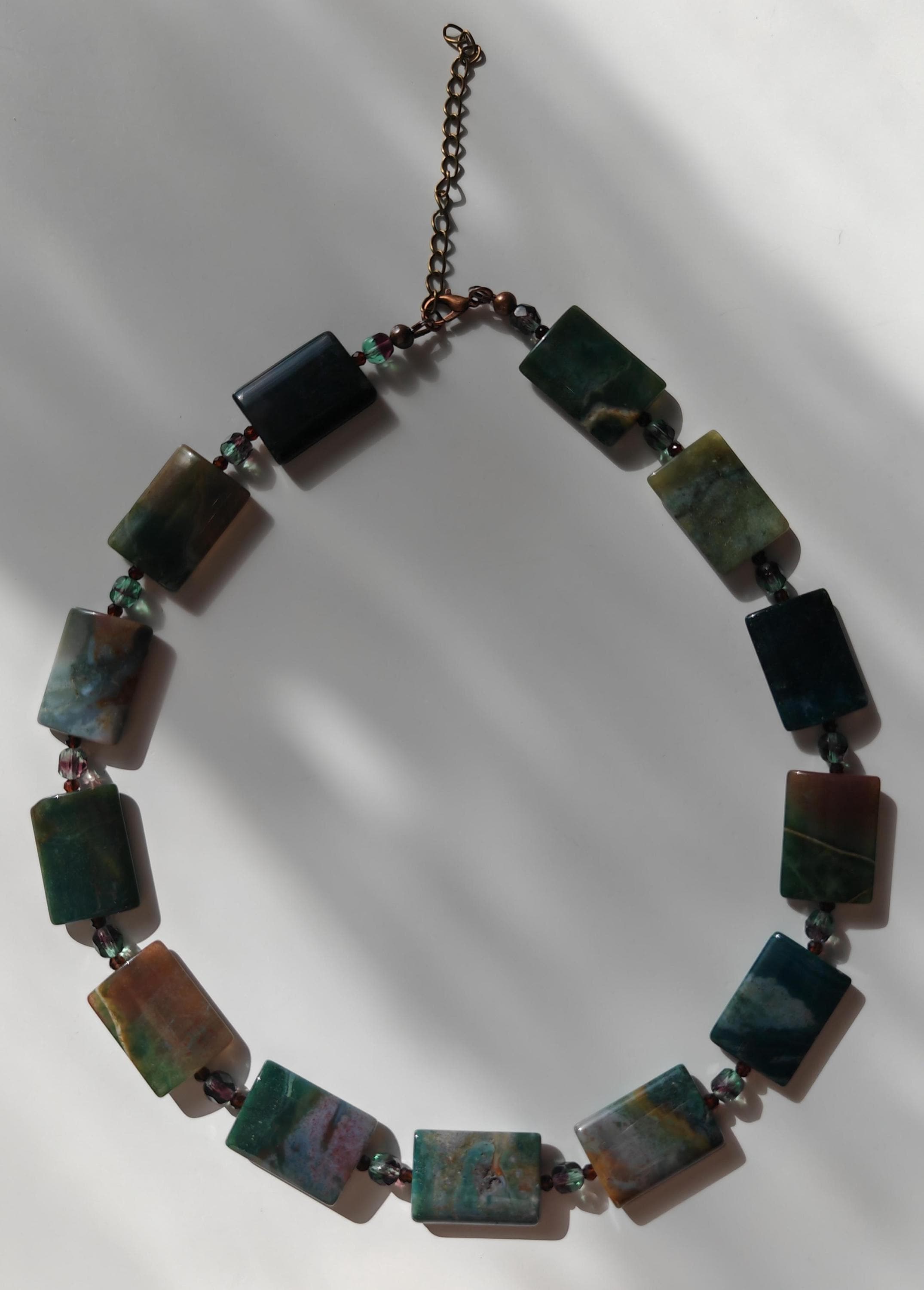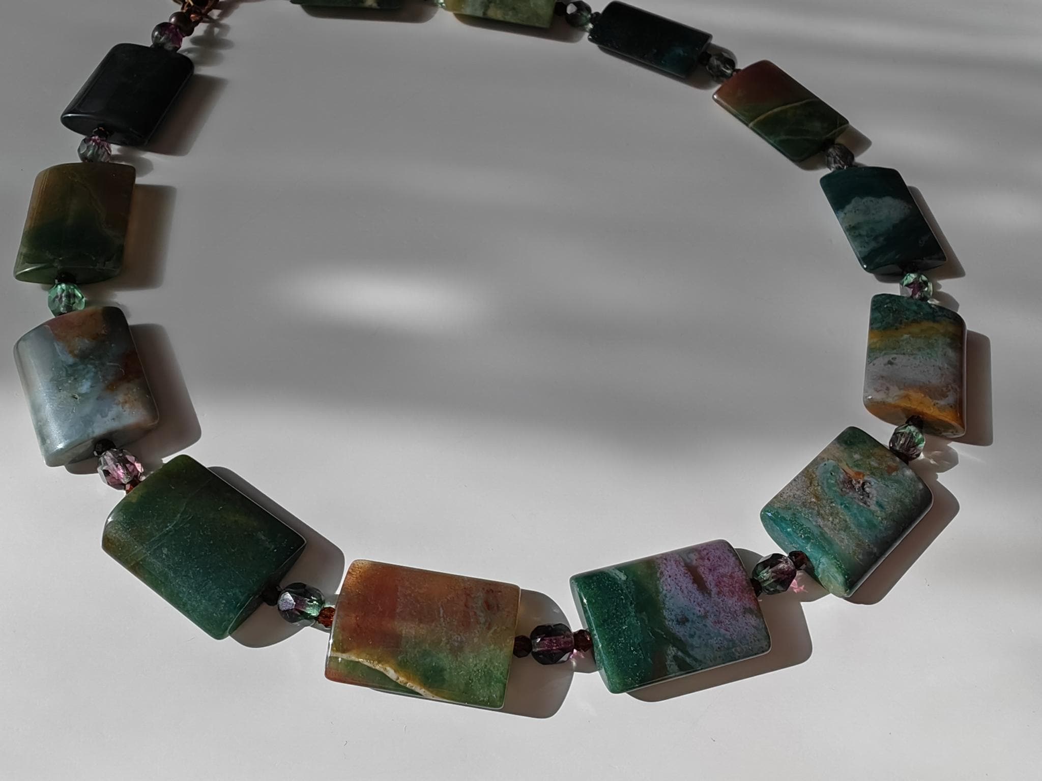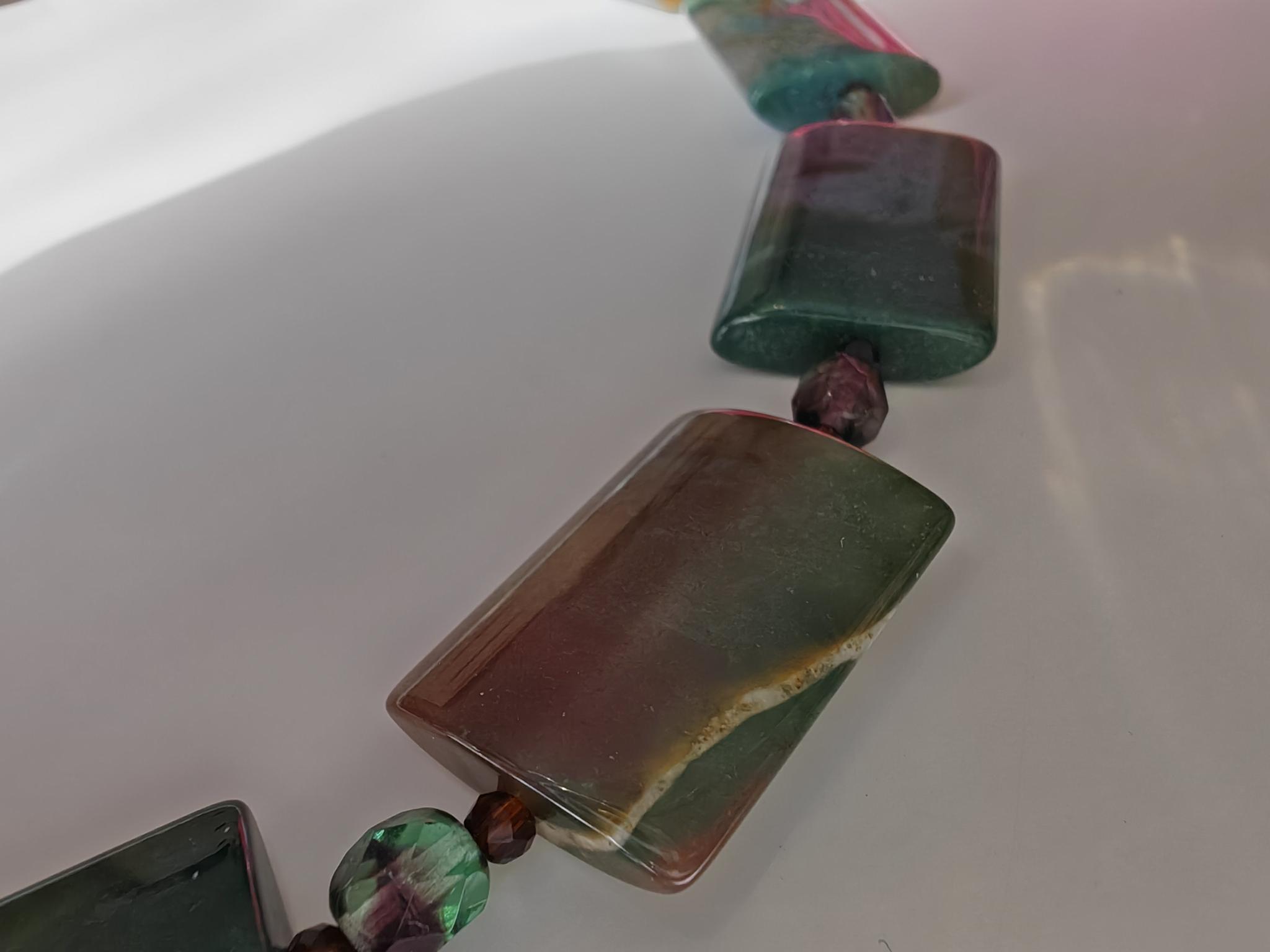 The other necklace is 50 cm long. It was made from square beads (25 mm x 18 mm x 5 mm) in shades of green, purple, red, and yellow, faceted brown spinel beads (3 mm), and faceted green/purple Bohemian glass beads (6 mm). The clasp and extension chain are bronze-colored. These necklaces can be worn every day as well as for special occasions. They can be combined with other jewelry.