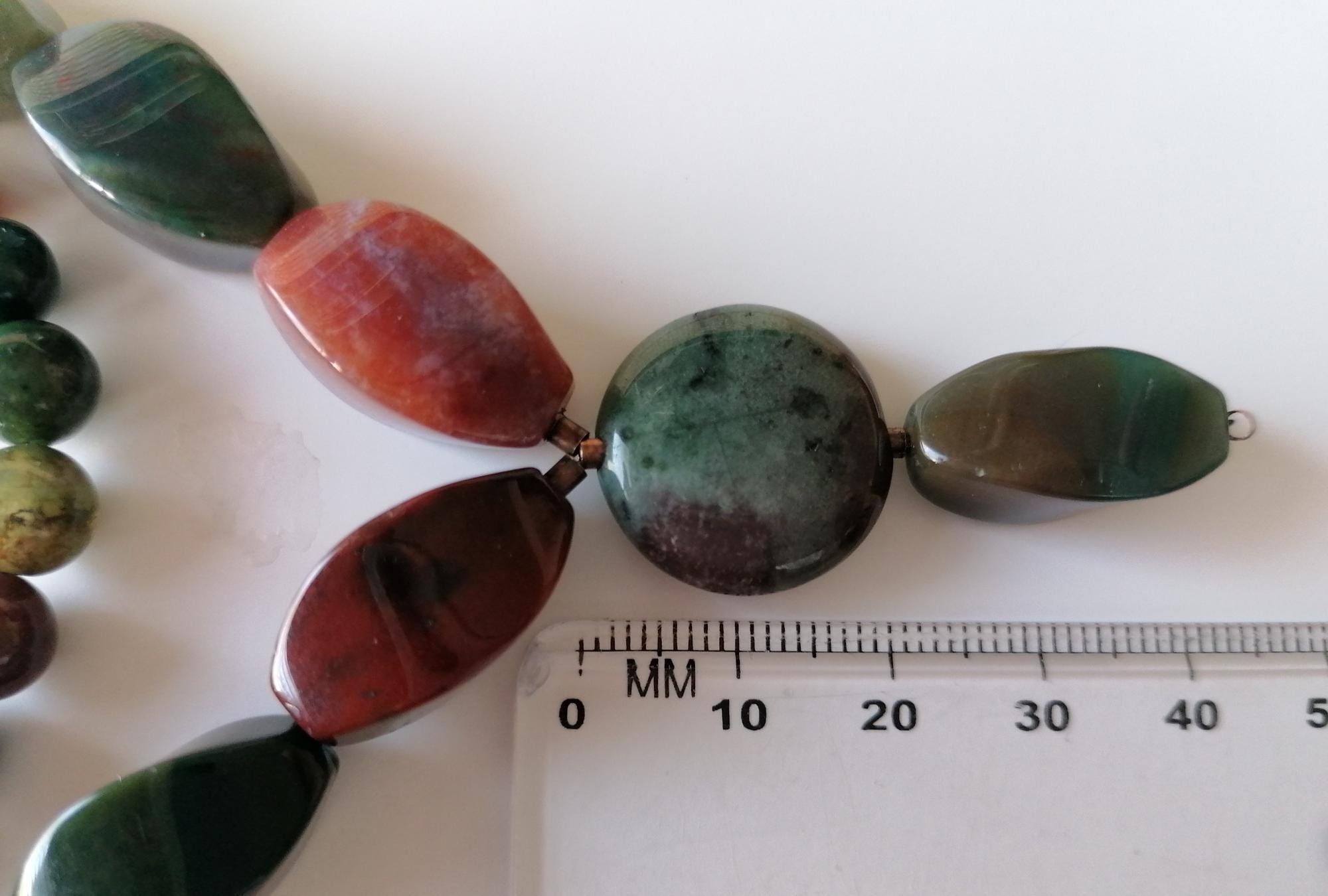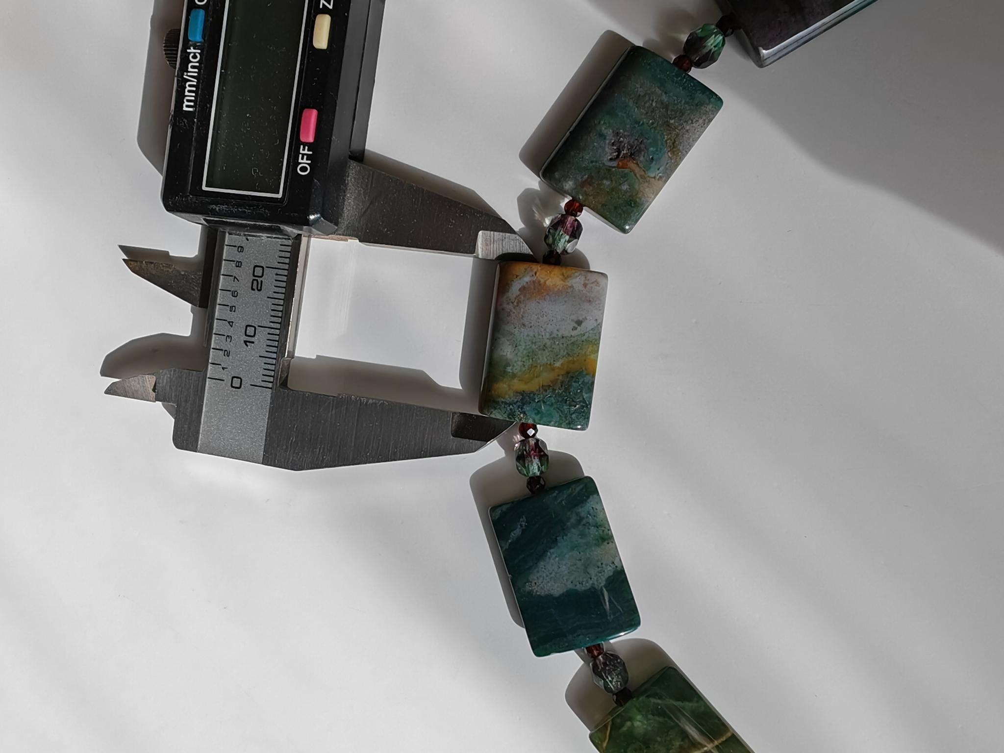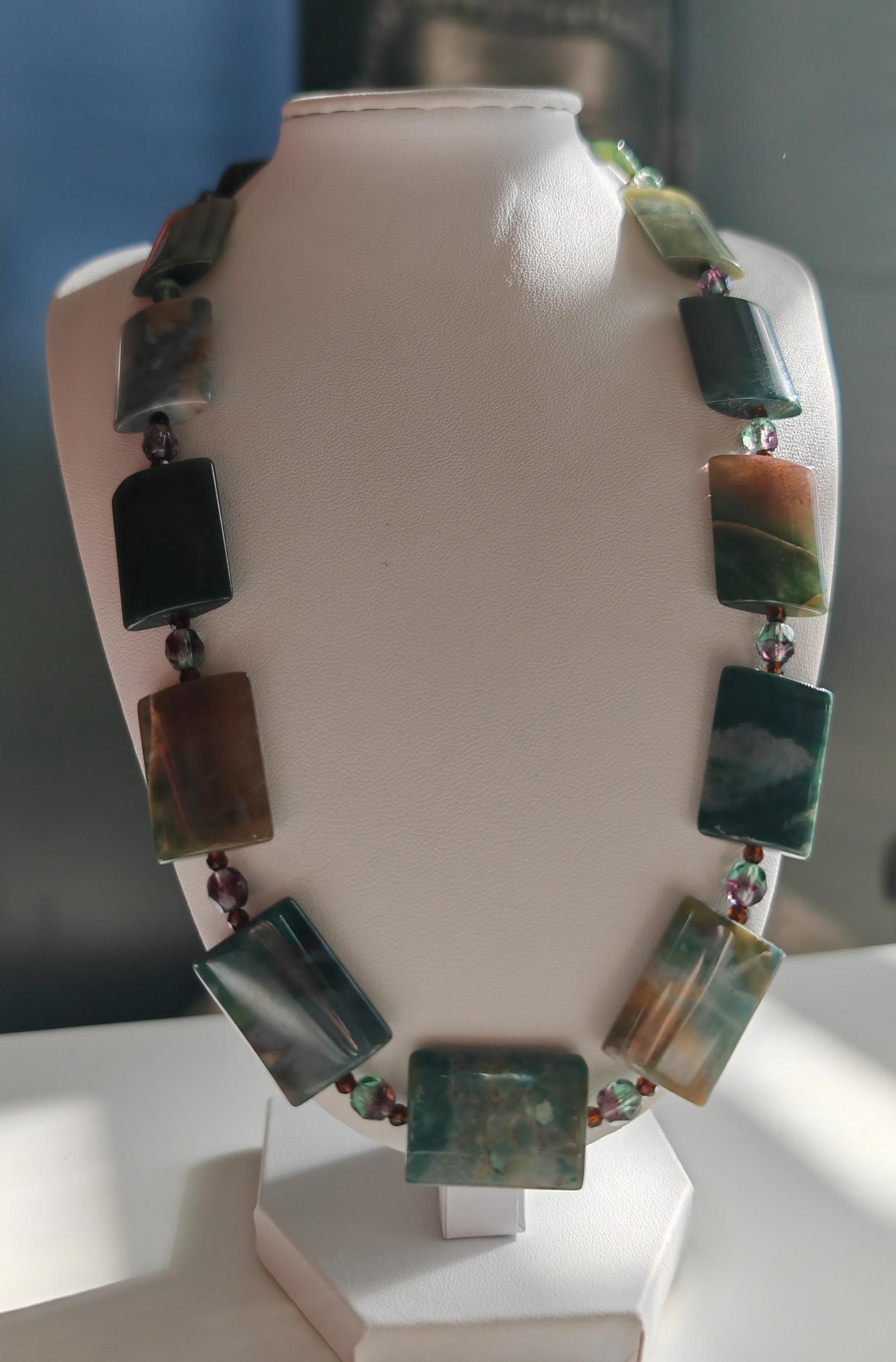 The other necklace is 50 cm long. It was made from square beads (25 mm x 18 mm x 5 mm) in shades of green, purple, red, and yellow, faceted brown spinel beads (3 mm), and faceted green/purple Bohemian glass beads (6 mm). The clasp and extension chain are bronze-colored. These necklaces can be worn every day as well as for special occasions. They can be combined with other jewelry.