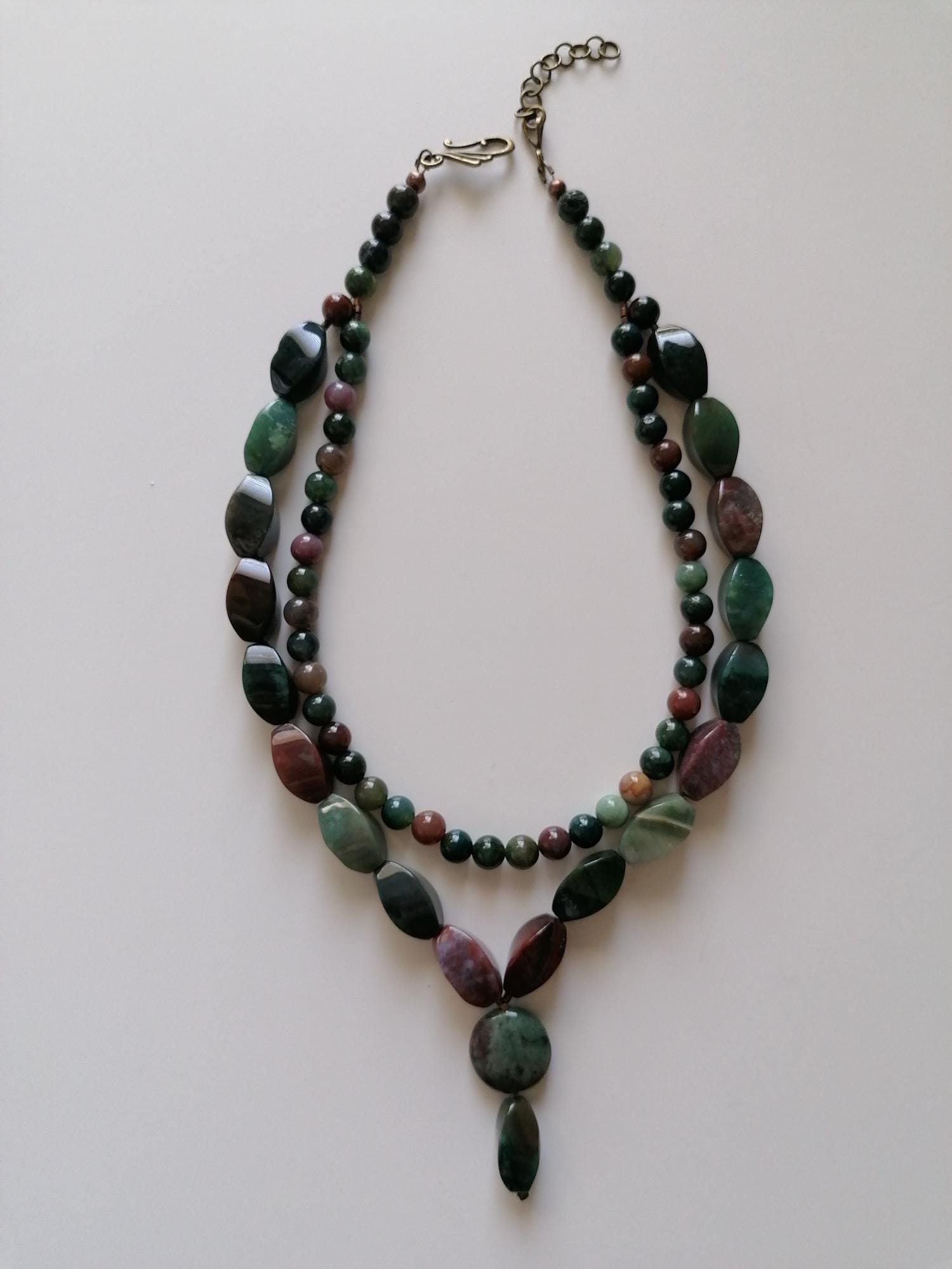 This double-strand jasper necklace comes with a pendant. The necklace is 45 cm long, plus an extension chain. It is crafted from heliotrope jasper beads. The inner strand consists of 8 mm round beads, while the outer strand is made of rectangular beads (approximately 20 mm x 11 mm). The pendant is approximately 45 mm long. The multicolored heliotrope jasper beads are in shades of green, with some also featuring brown/red. The S-clasp and extension chain are bronze-colored.