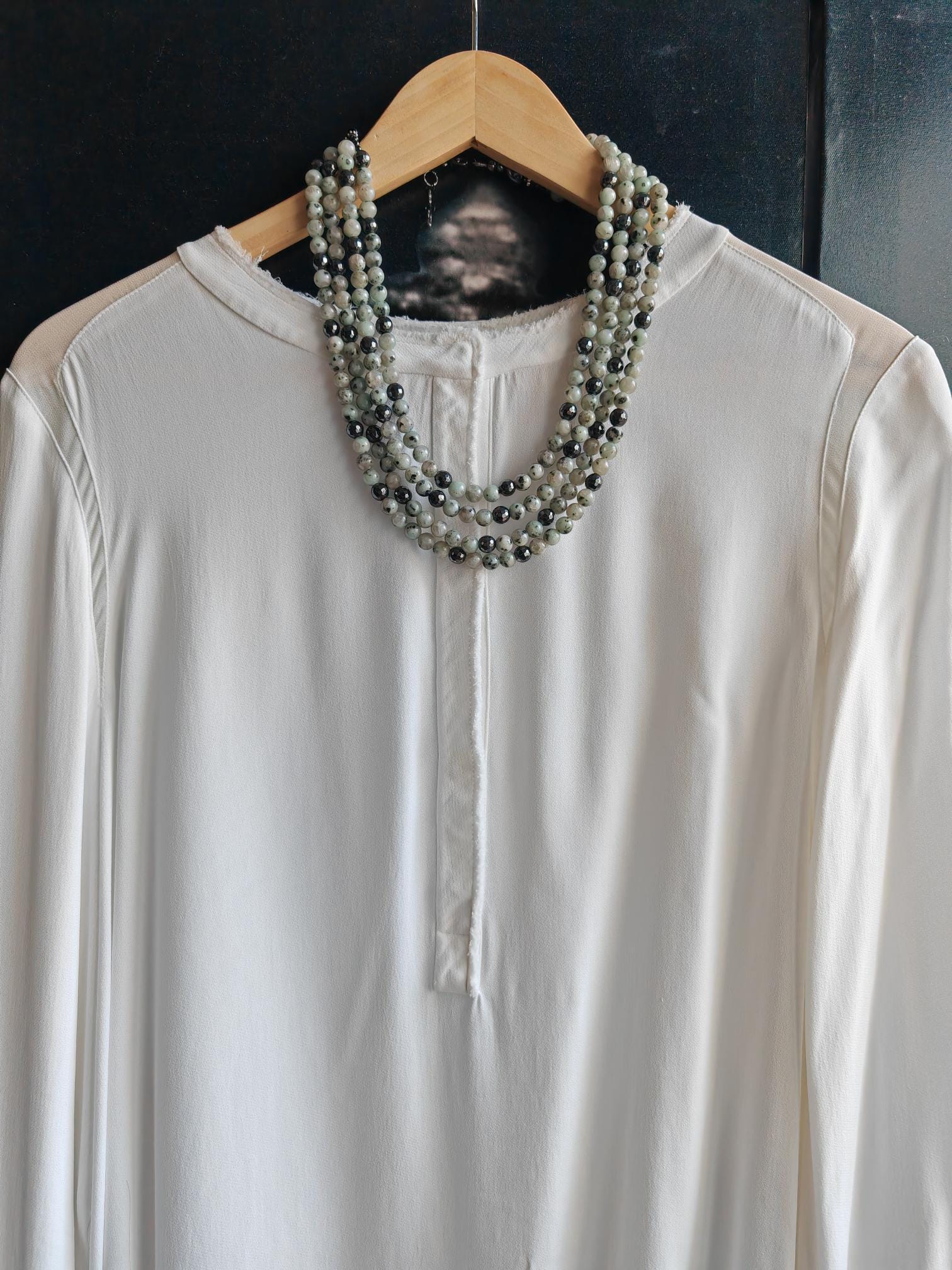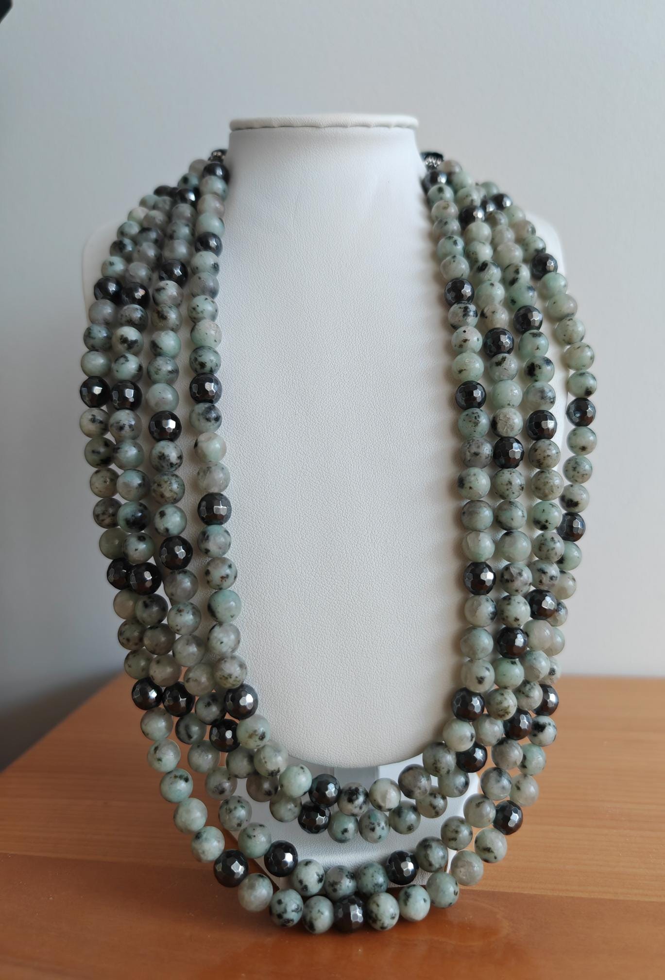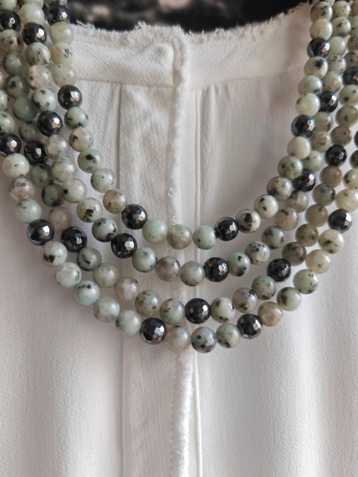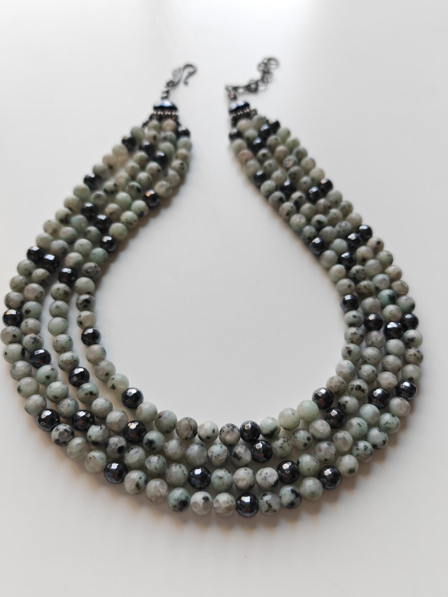 This voluminous, four-strand necklace is approximately 51 cm long, plus an extension chain. The light blue and black necklace is crafted from round sesame kiwi jasper beads (8 mm), faceted round hematite beads in black (8 mm), and faceted round spinel beads in black (3 mm). The S-clasp, extension chain, and bead caps are black, while the spacers are antique silver. These necklaces can be worn every day as well as for special occasions. They can be combined with other jewelry.