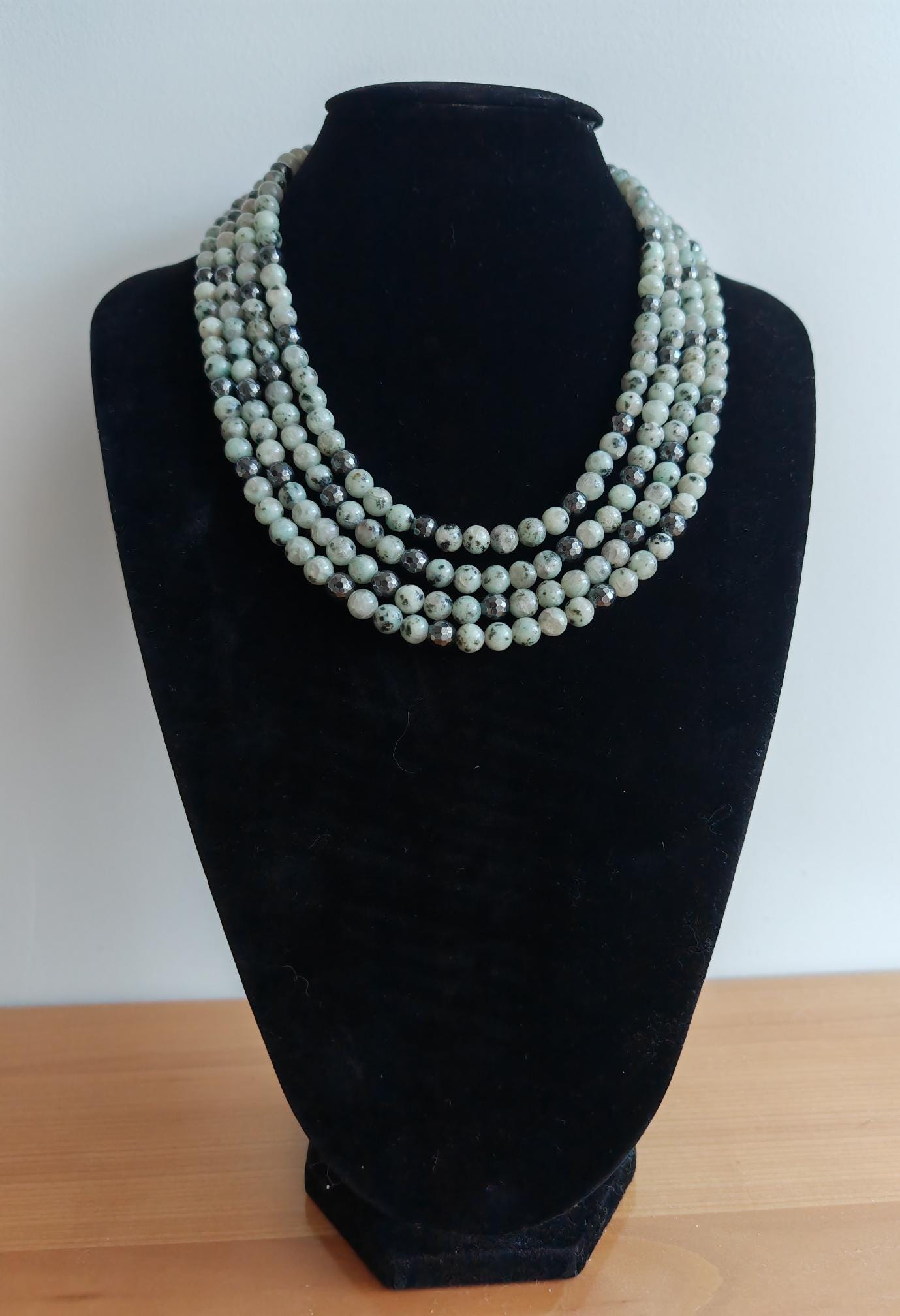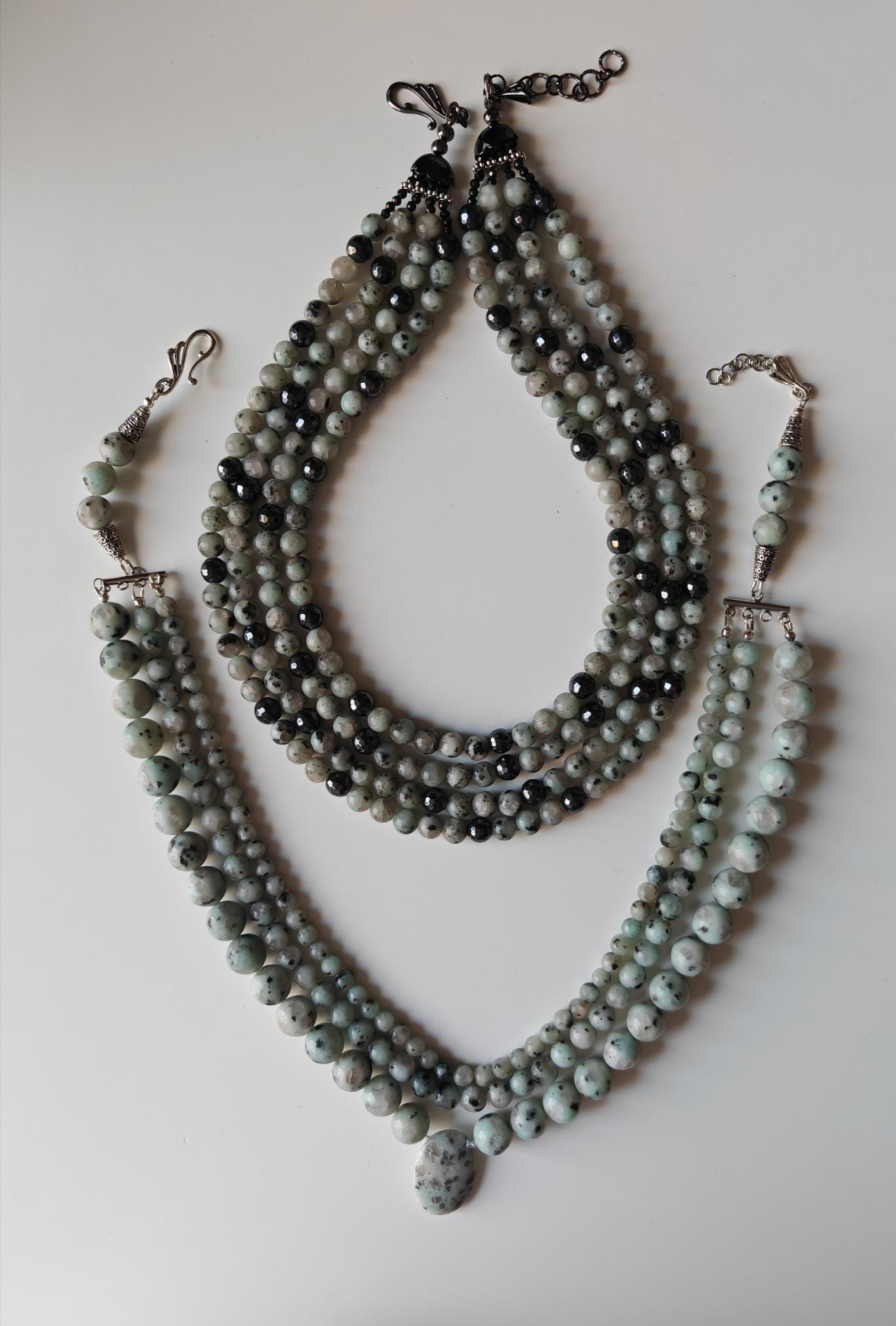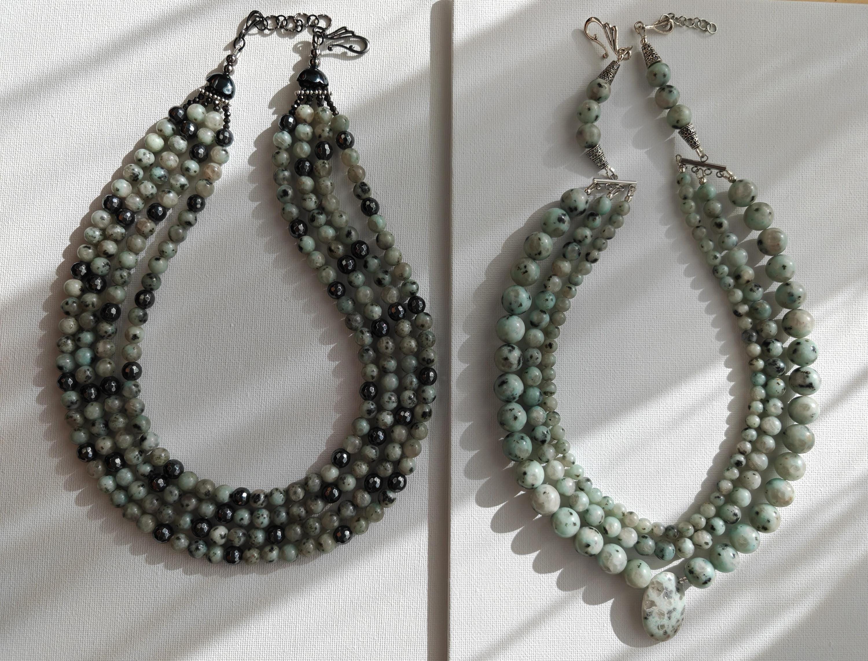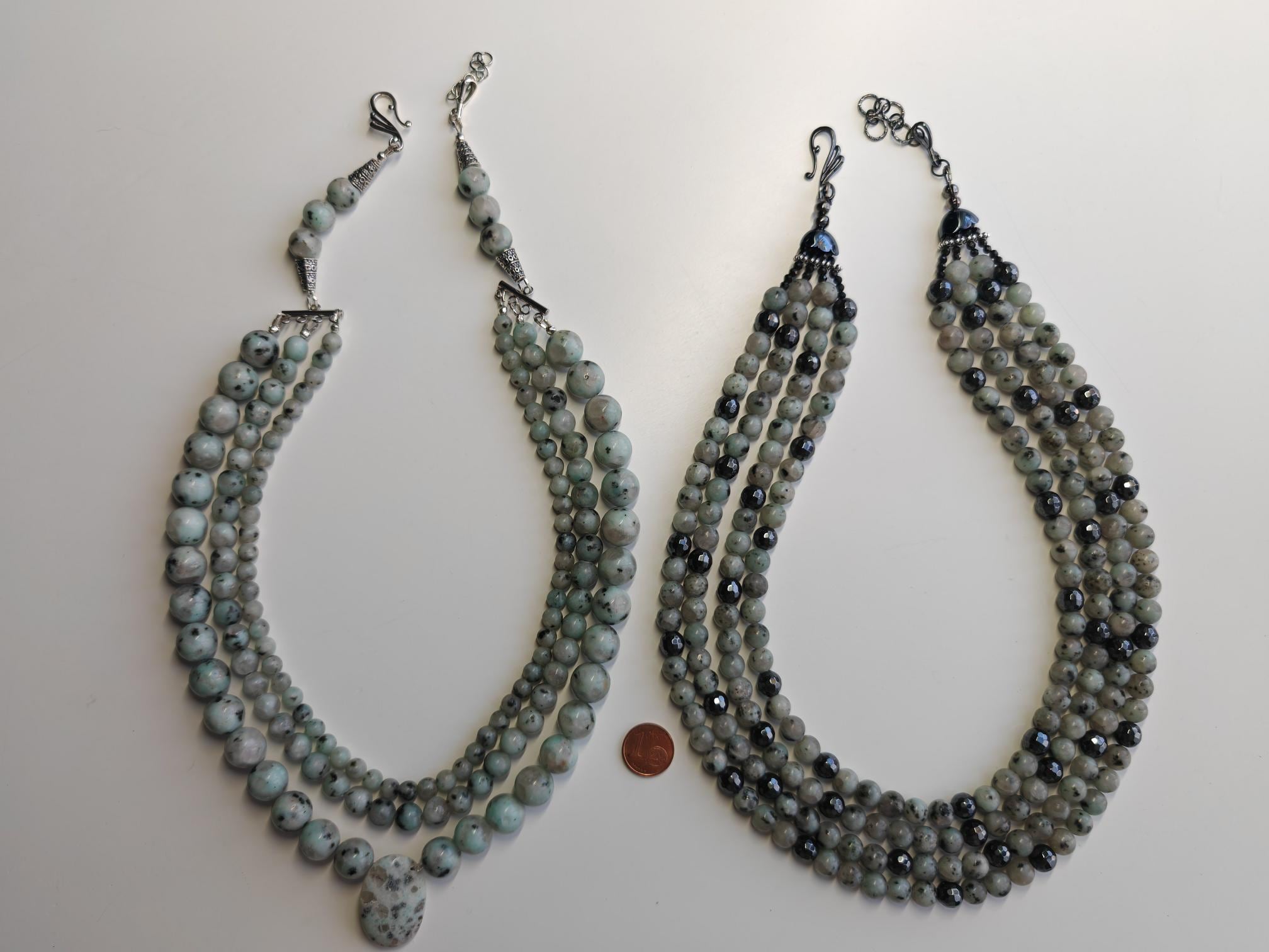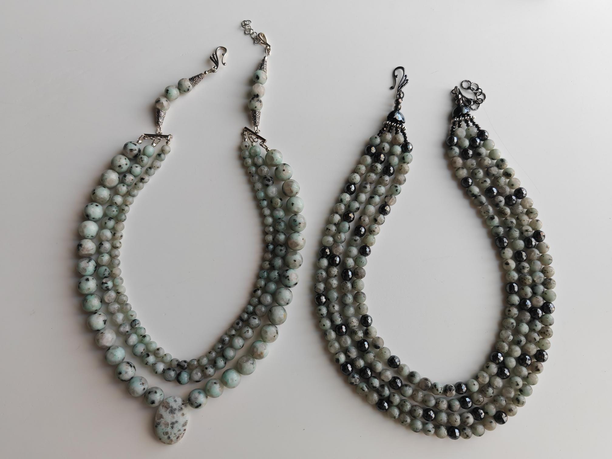 Handmade opulent necklaces made of sesame and kiwi jasper in light blue/black. Two necklaces are available.