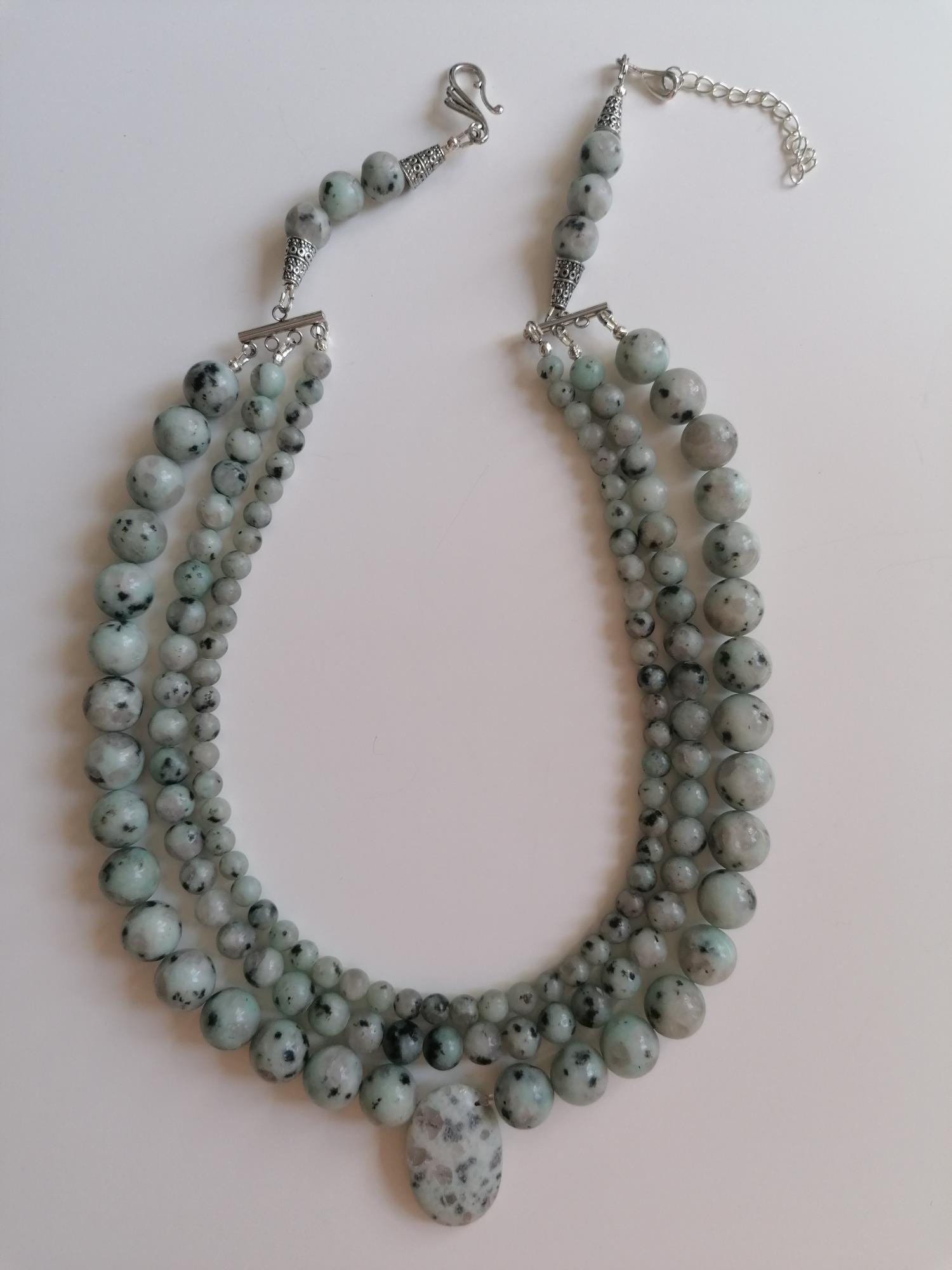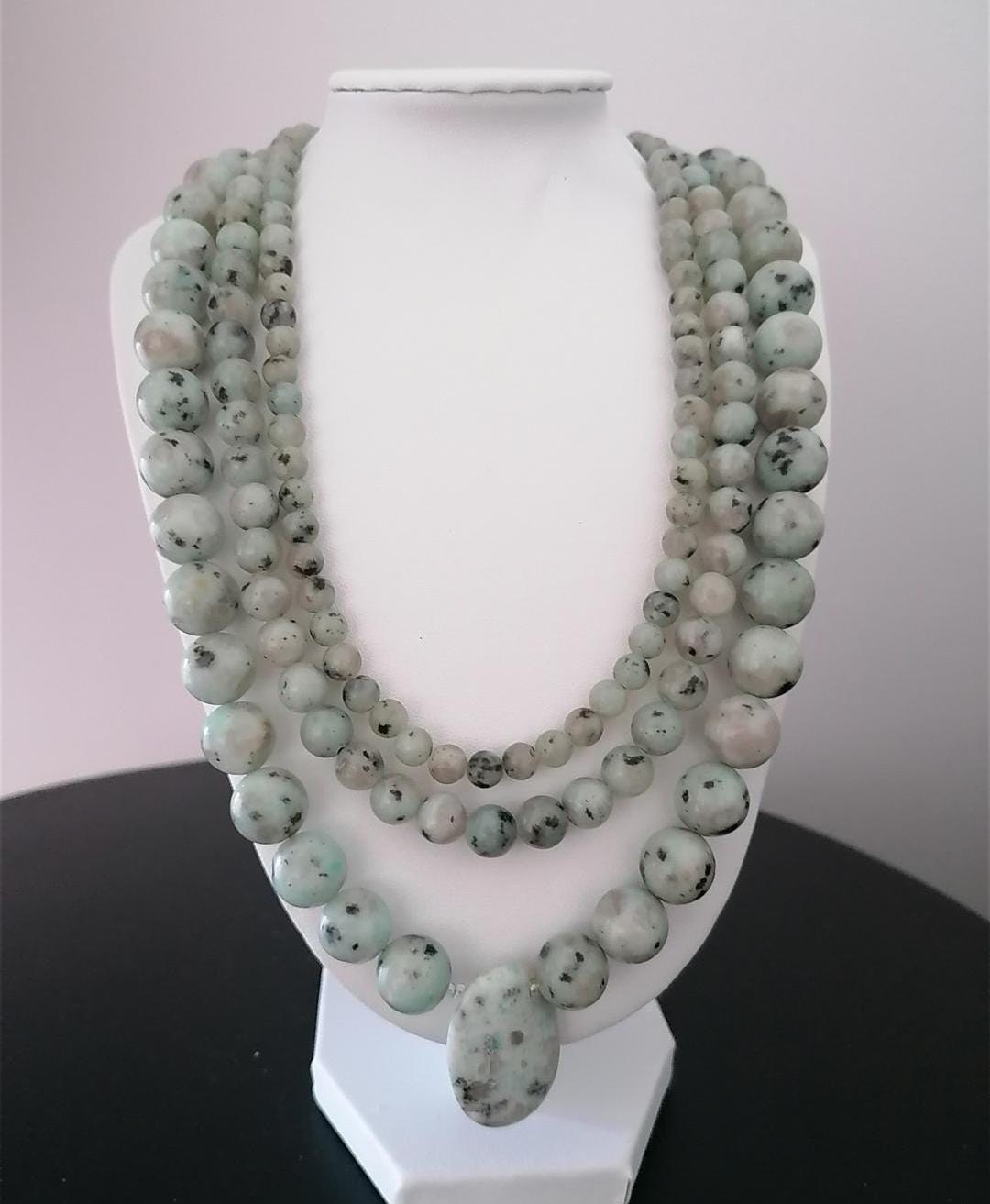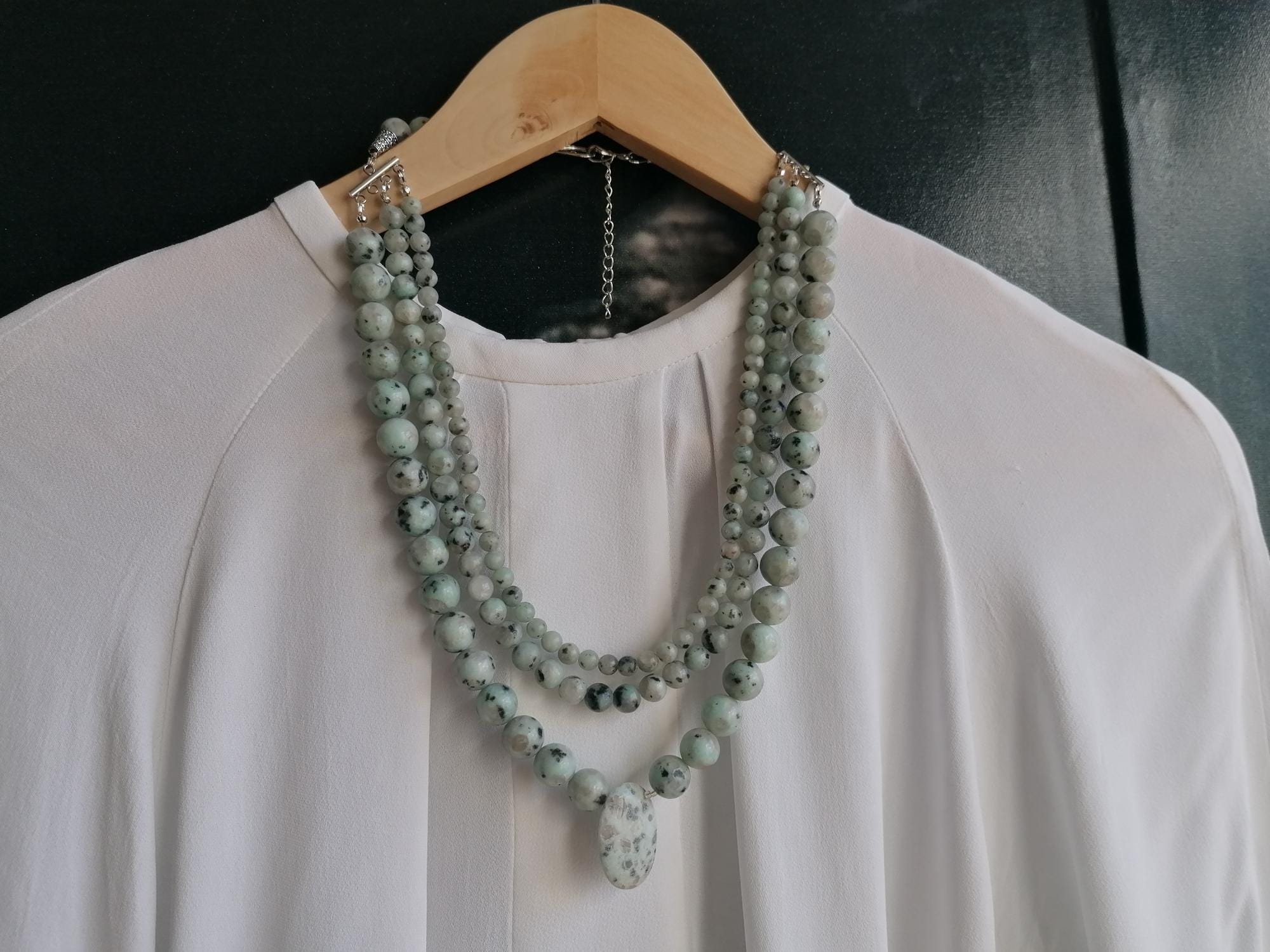 This opulent, three-strand necklace with a pendant is approximately 55 cm long, plus an extension chain. The light blue and black necklace with pendant is made of sesame kiwi jasper beads (12 mm, 10 mm, 8 mm, and 6 mm). The oval pendant measures approximately 3 cm x 2 cm. Great gift!!!