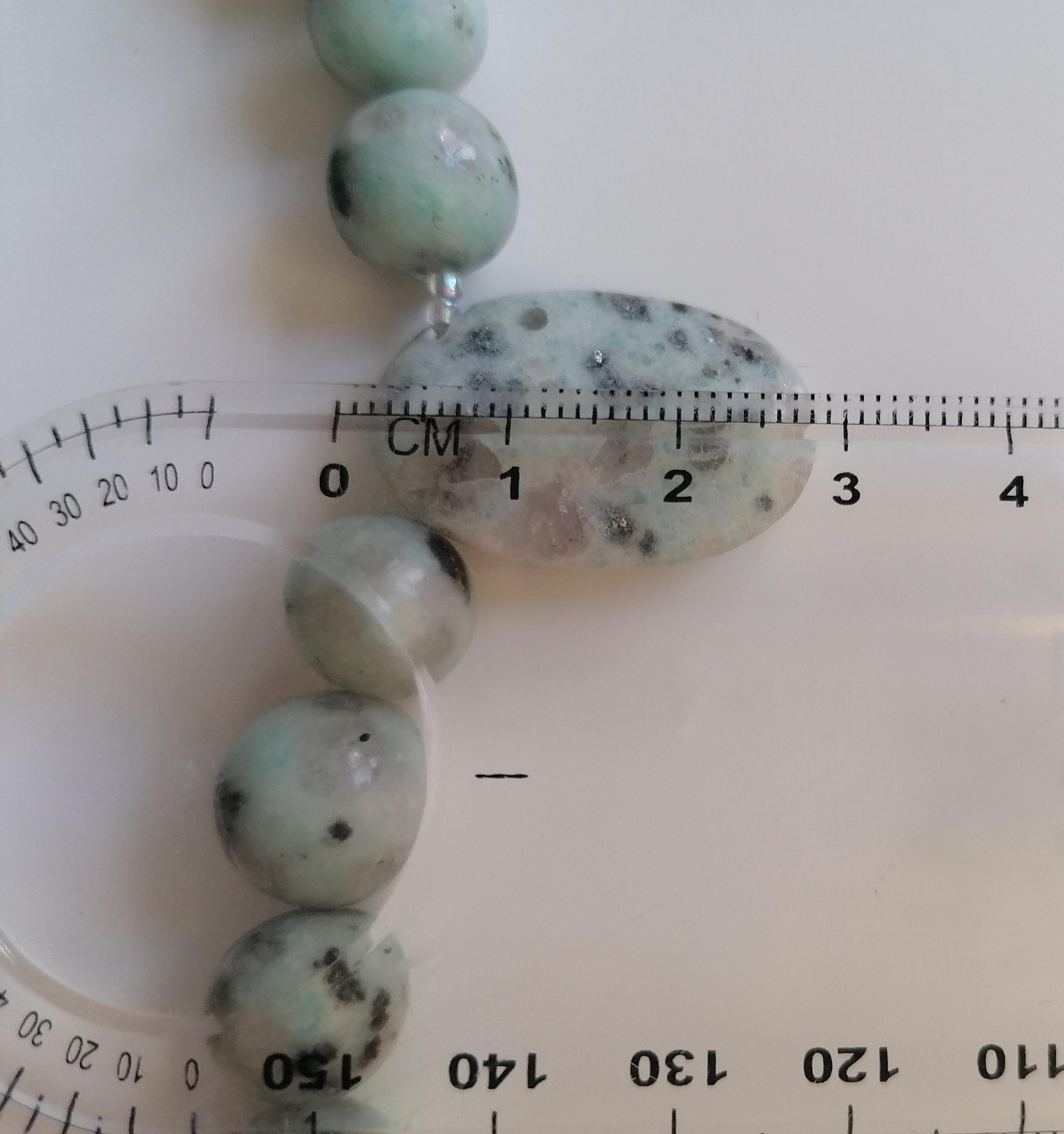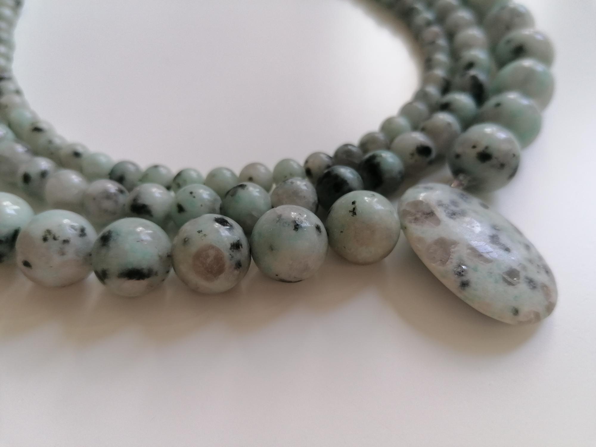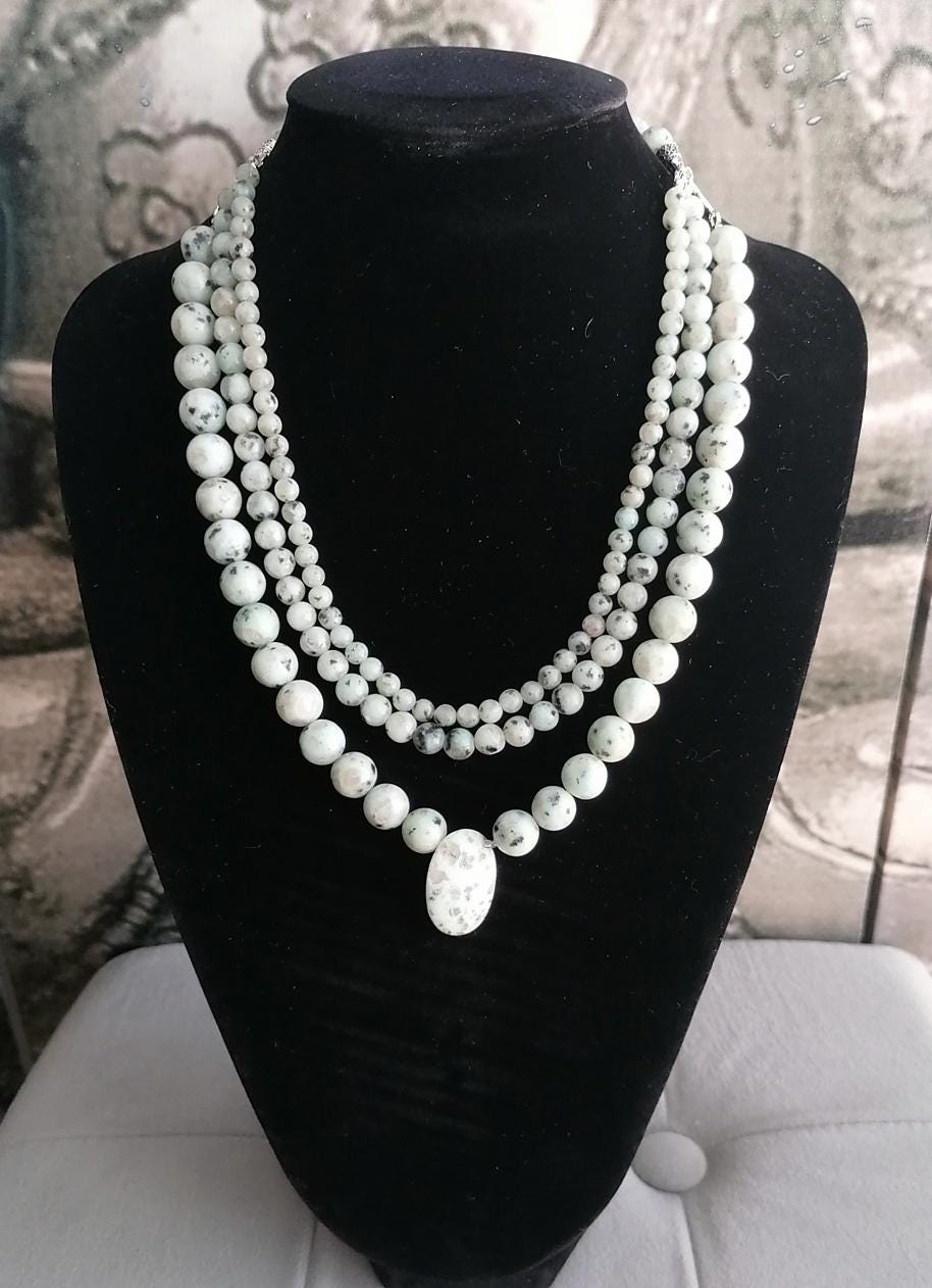 This opulent, three-strand necklace with a pendant is approximately 55 cm long, plus an extension chain. The light blue and black necklace with pendant is made of sesame kiwi jasper beads (12 mm, 10 mm, 8 mm, and 6 mm). The oval pendant measures approximately 3 cm x 2 cm. Great gift!!!
