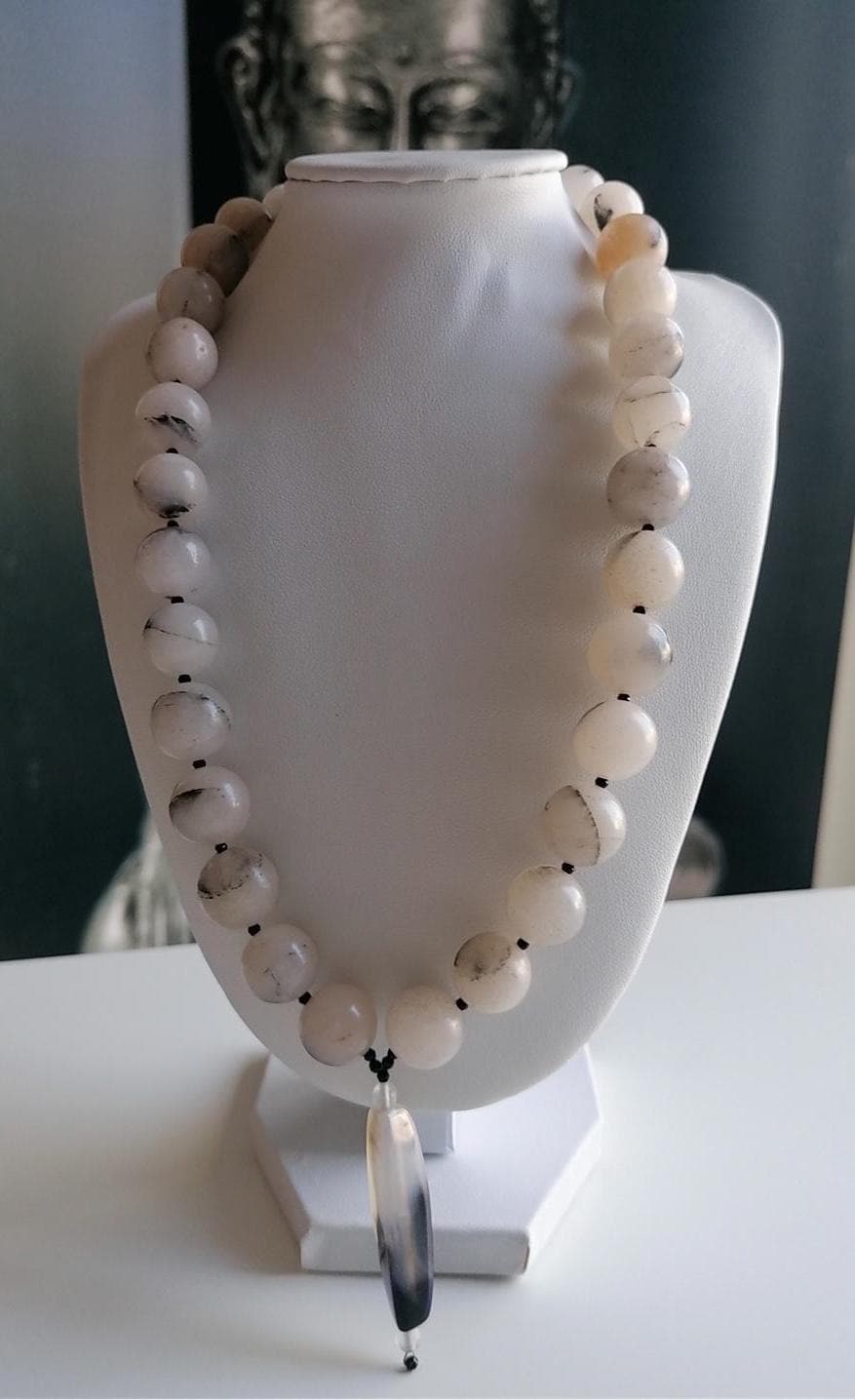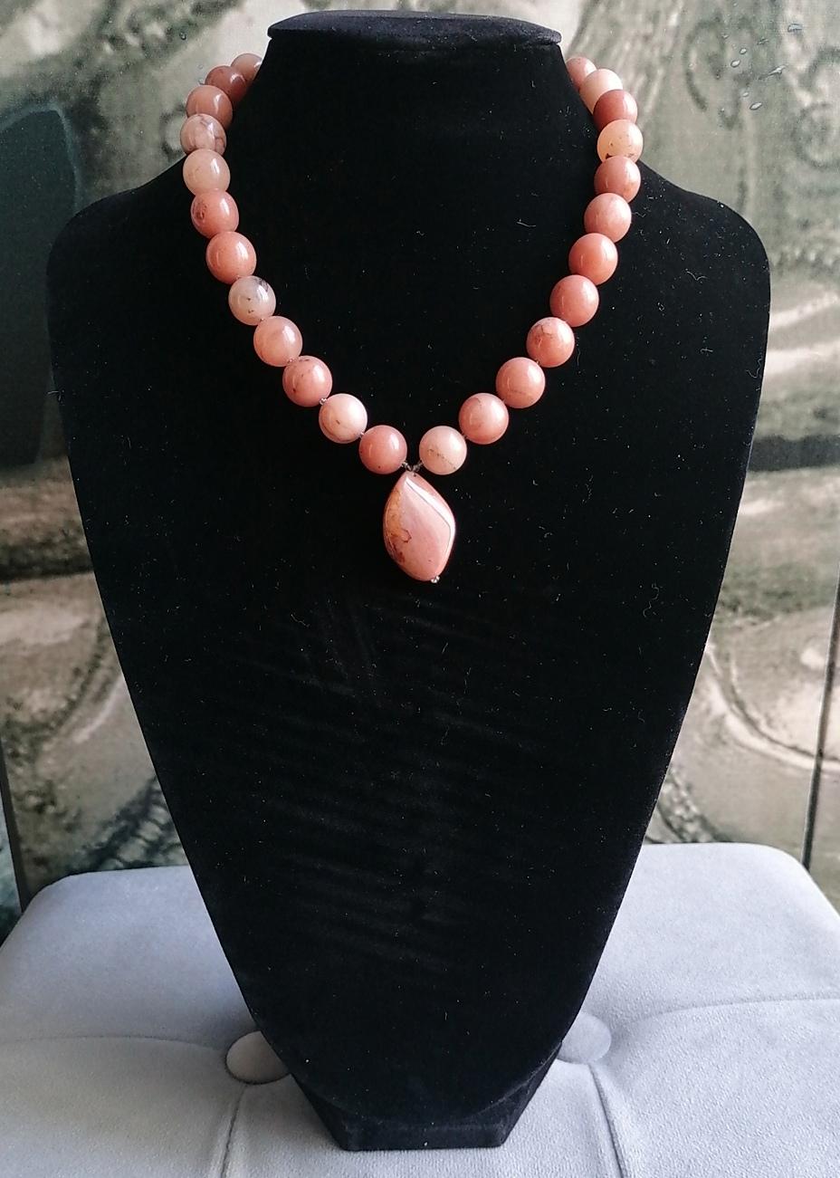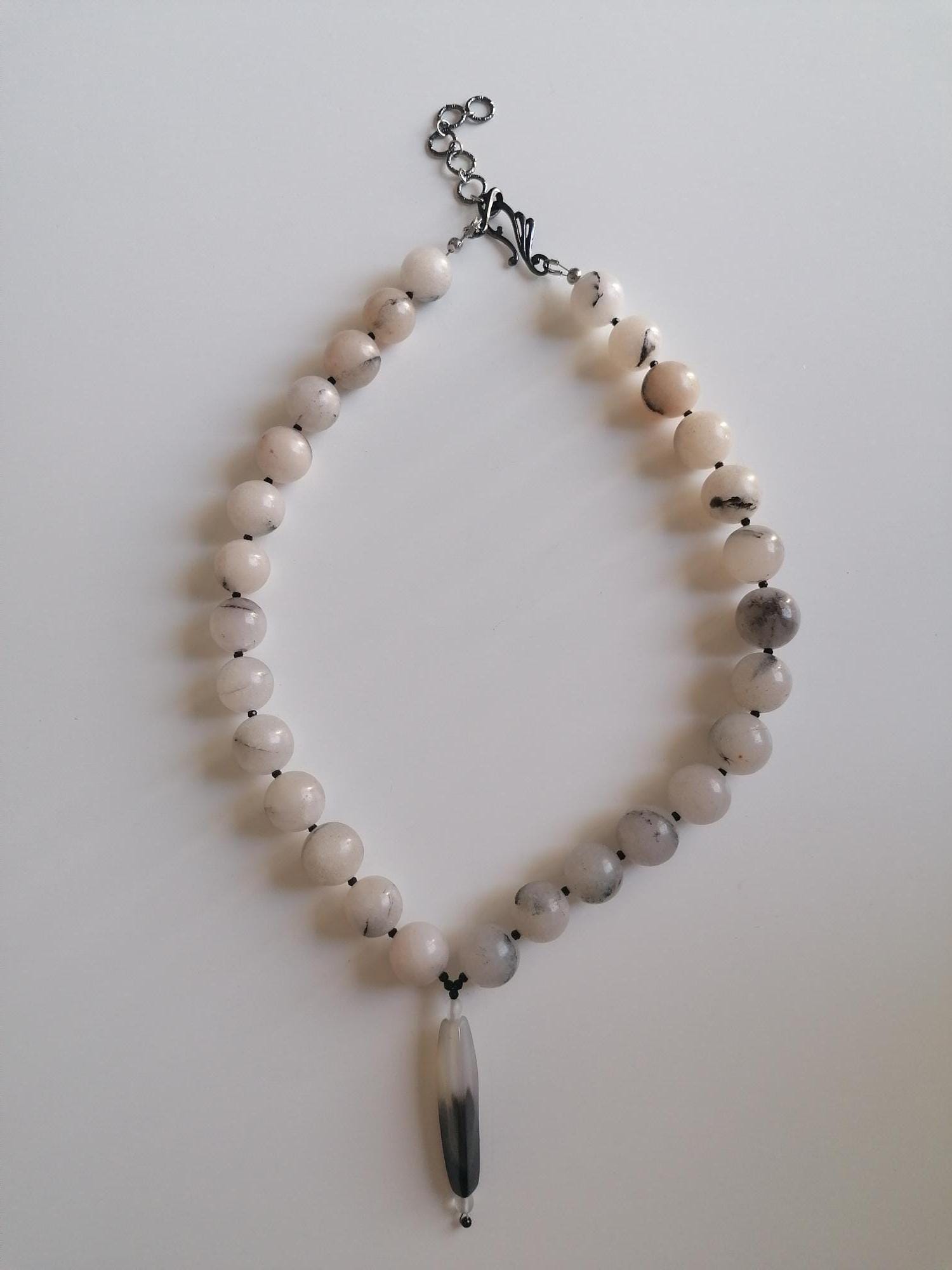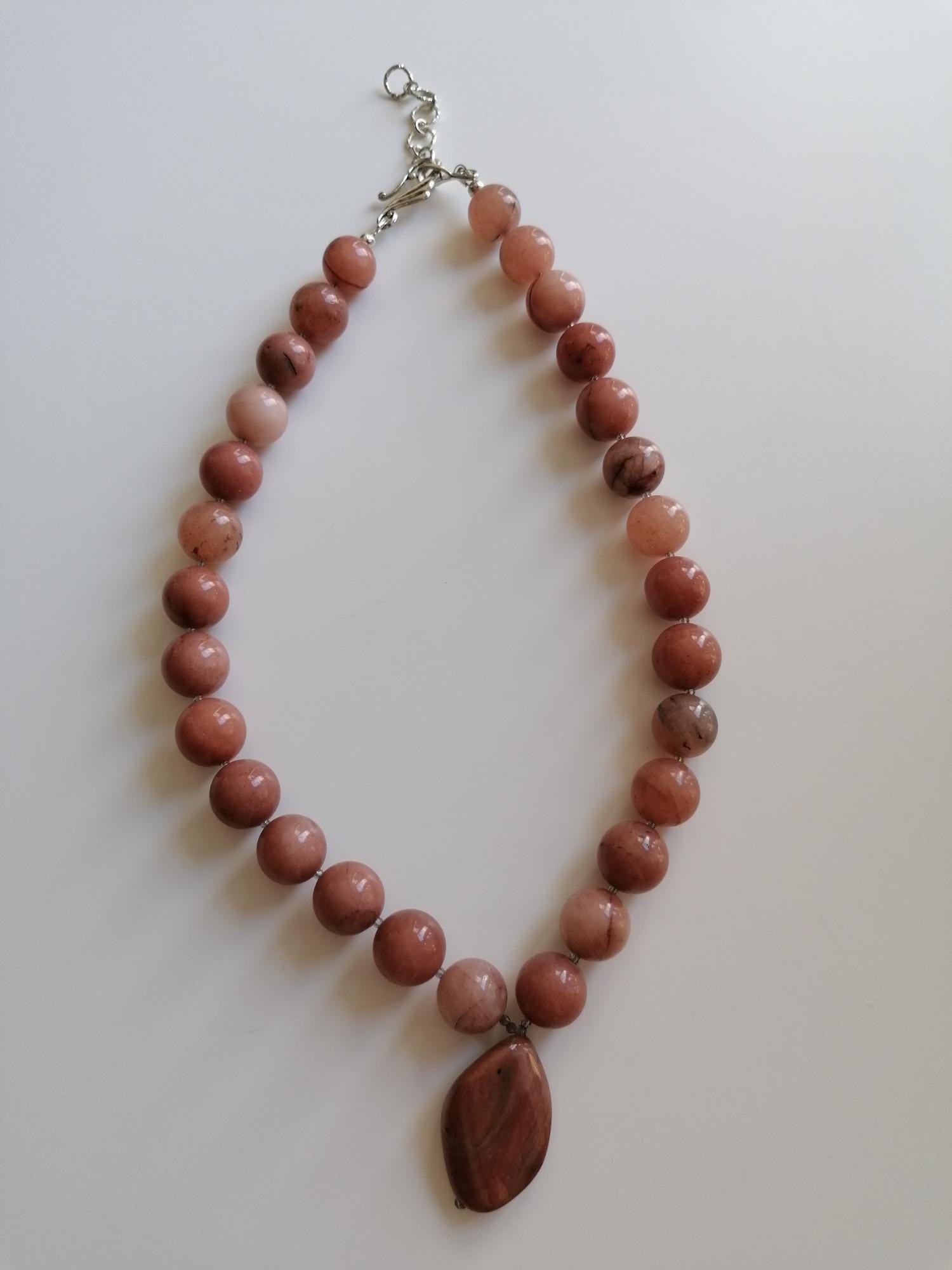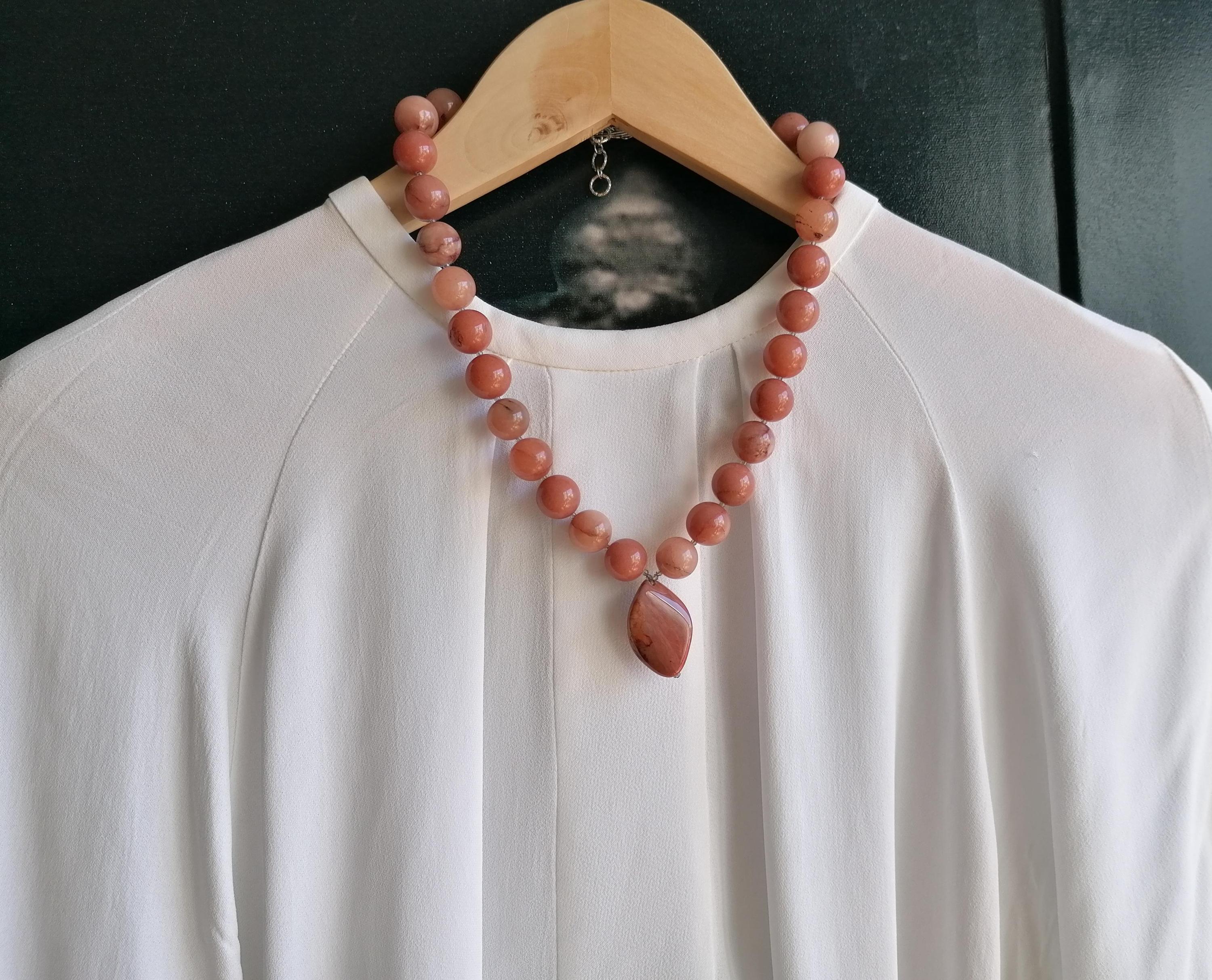 This natural agate necklace is in peach tones. The necklace length is 48.5 cm plus an extension chain. This statement necklace is made of large, round, high-gloss natural agate beads (14 mm) and gray, faceted spinel beads (2 mm). The pendant is approximately 3.5 cm long and 2.2 cm wide. The S-shaped chain clasp and the extension chain are silver. The necklace is simple and elegant. You can wear it everyday or for special occasions. Or combine it with other necklaces. It makes a lovely gift!