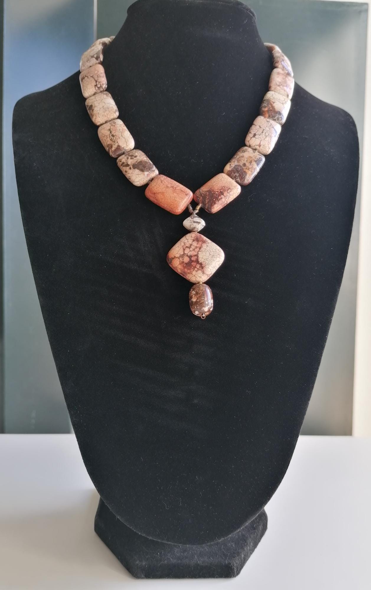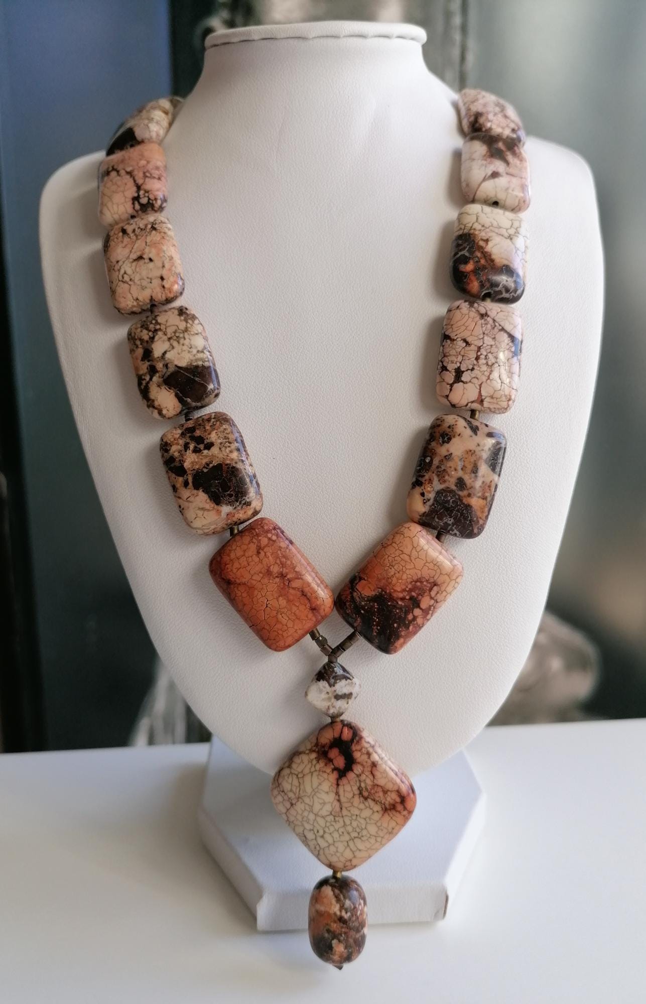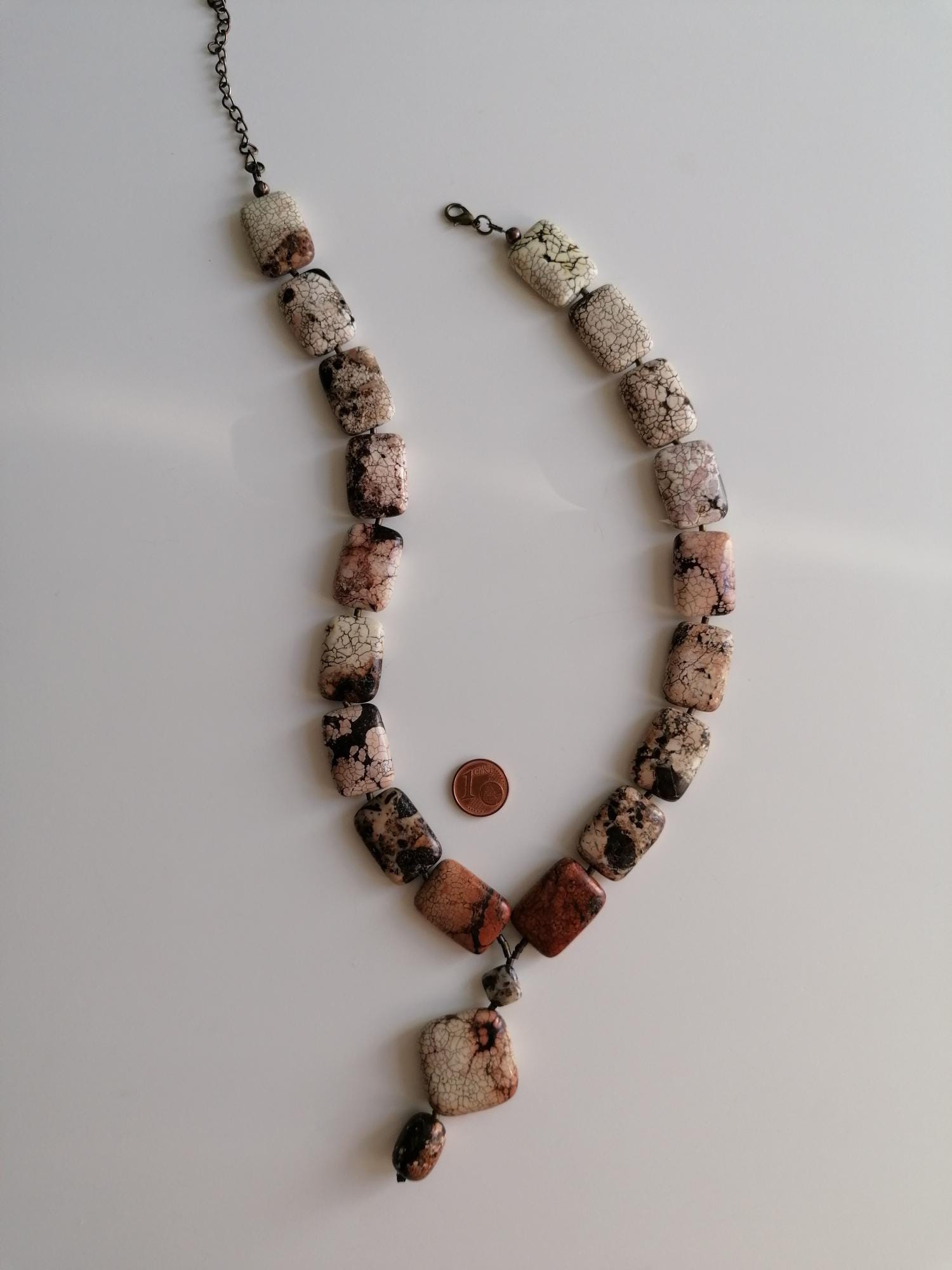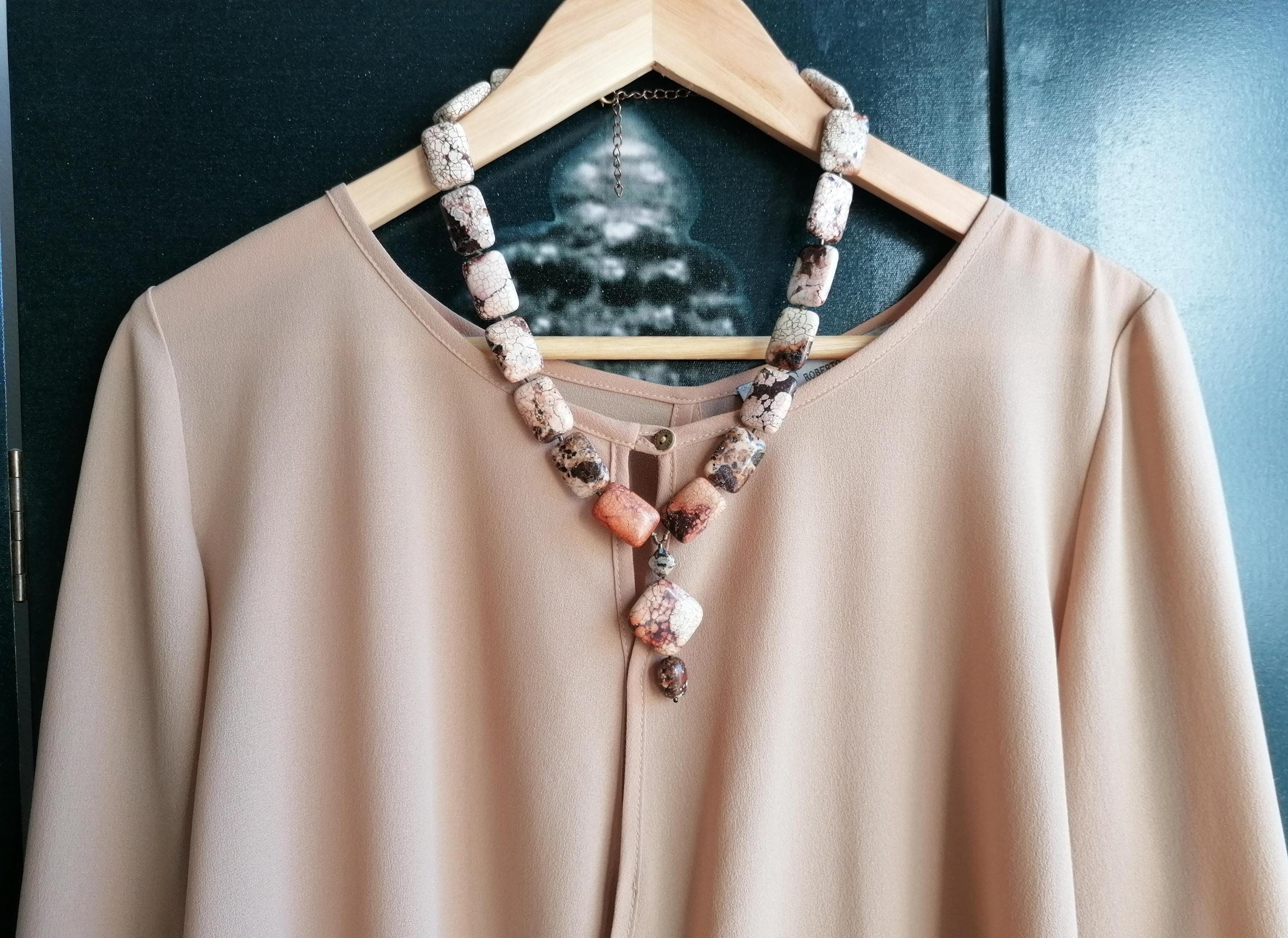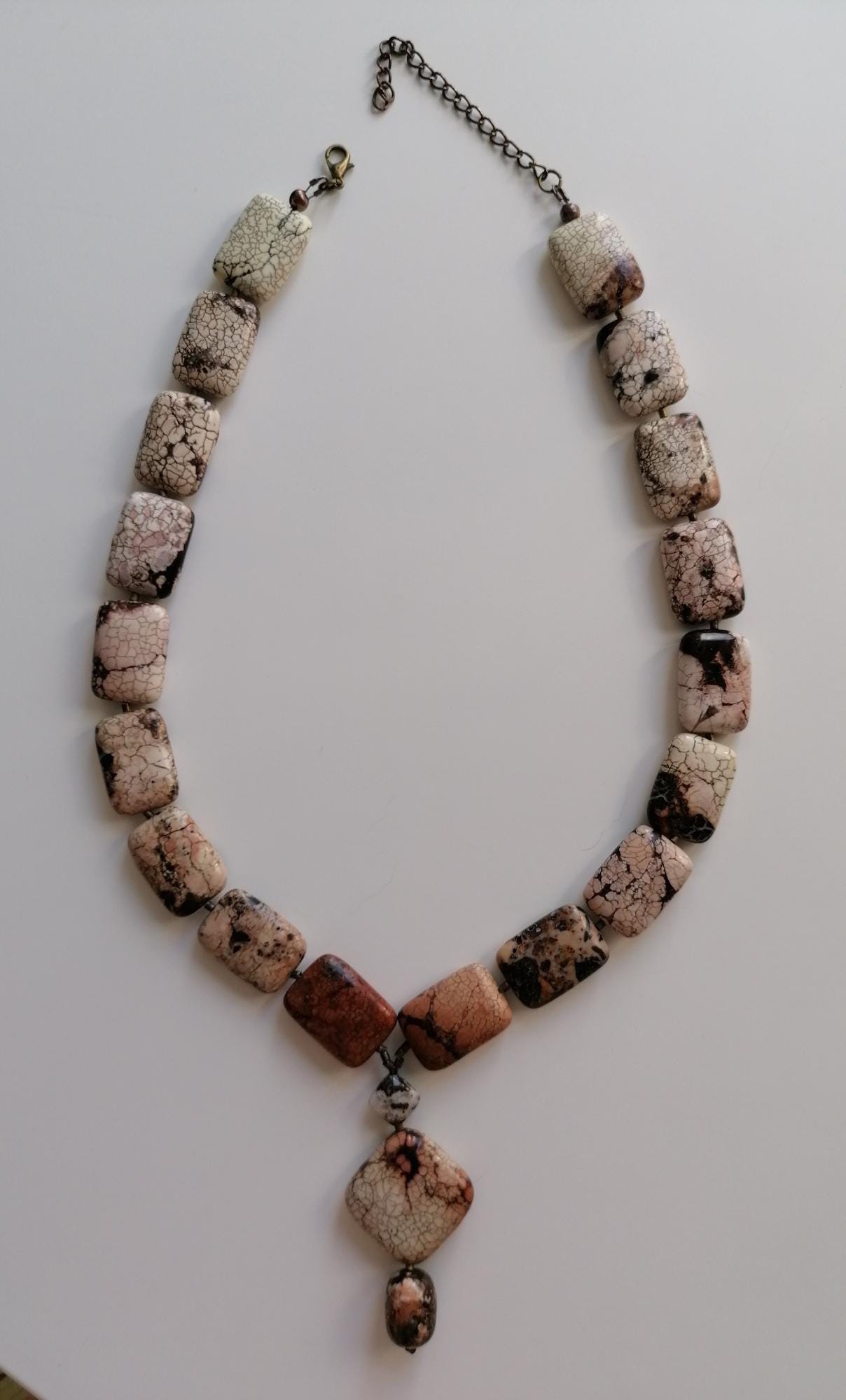 Handmade necklace with a chrysopa pendant in cognac brown/beige/rose. The necklace is 52.5 cm long plus a 7.5 cm extender. The multicolored necklace is made of square chrysopa beads (25 mm x 18 mm x 8 mm). The pendant is approximately 6 cm long. The necklace clasp, the extender chain, and the metal beads are bronze.