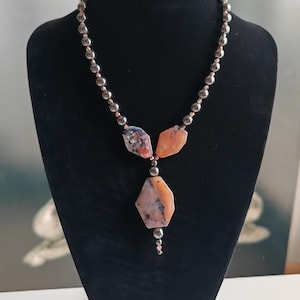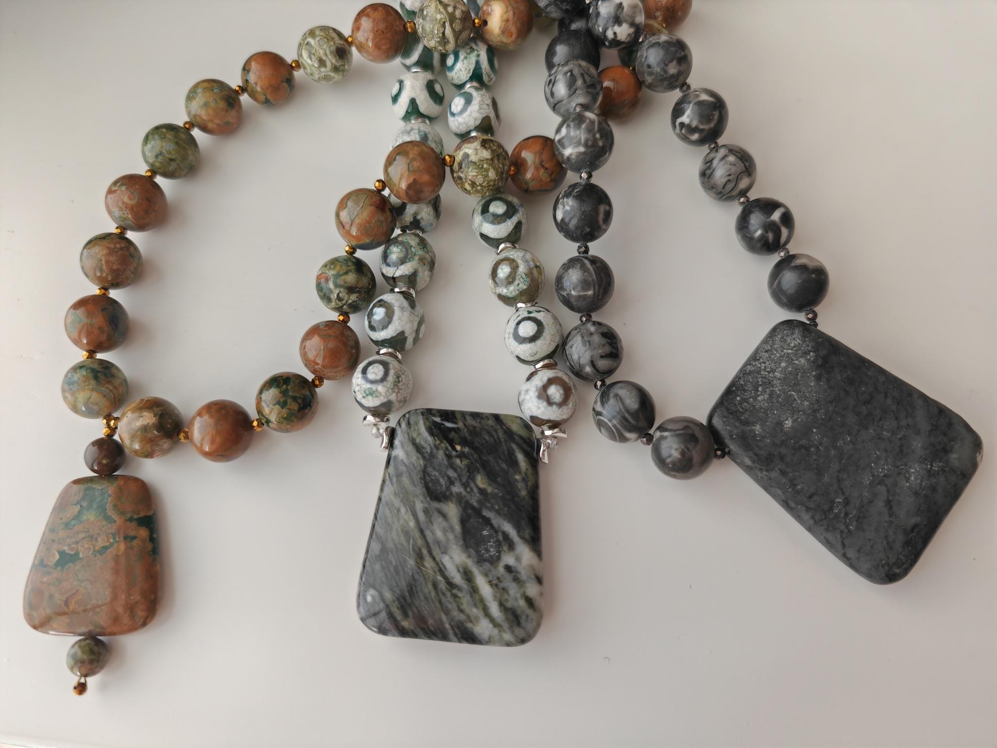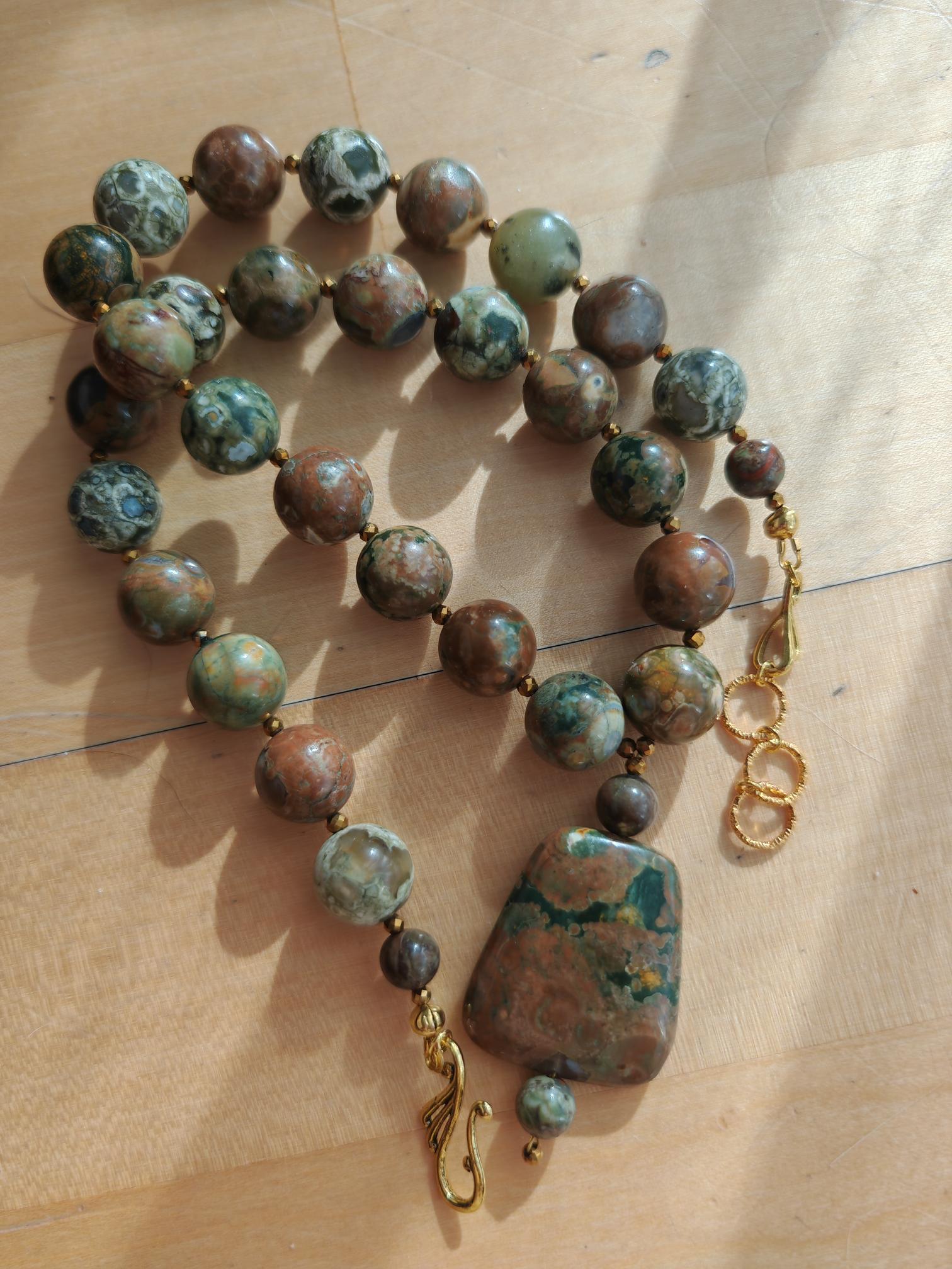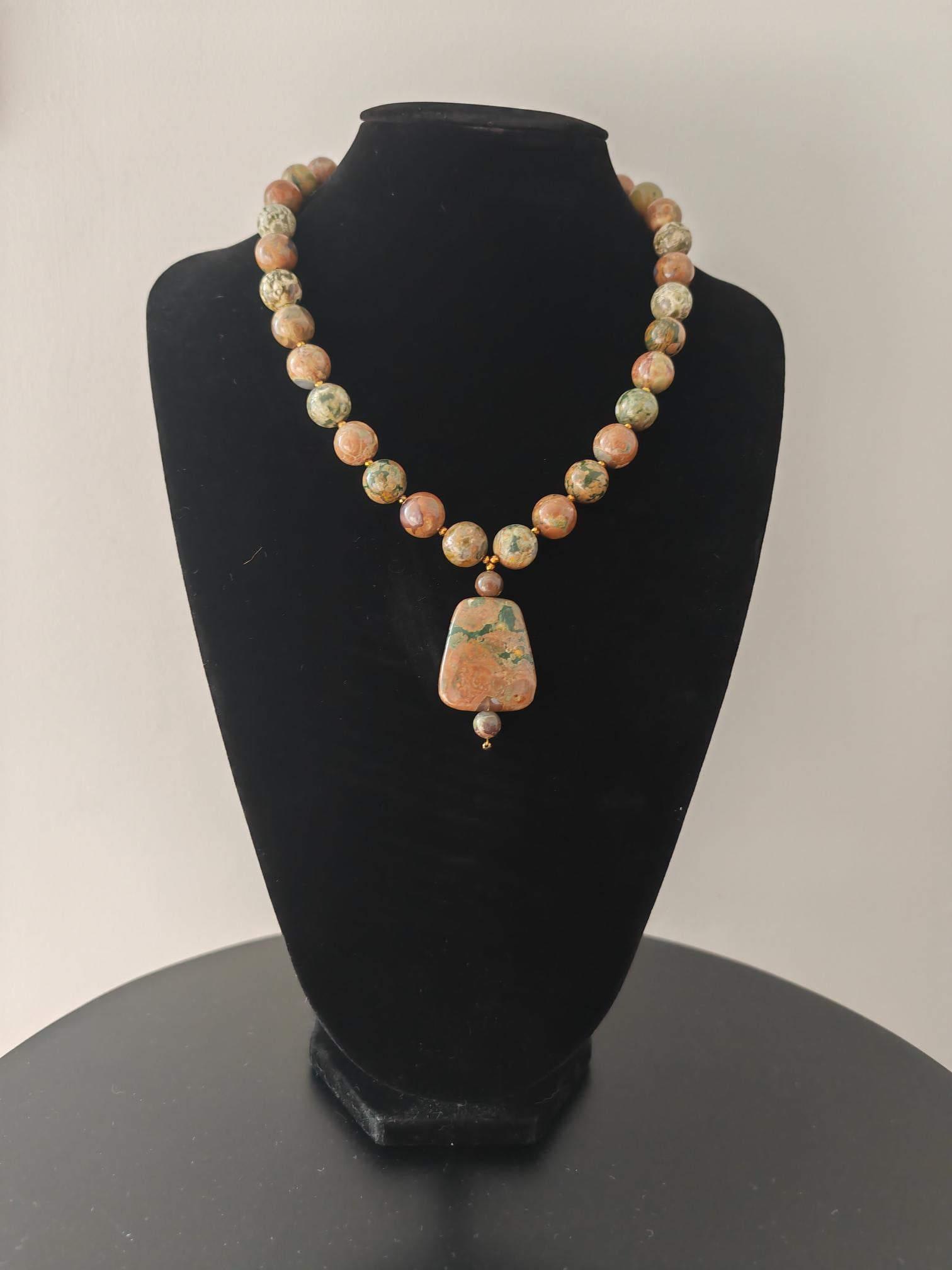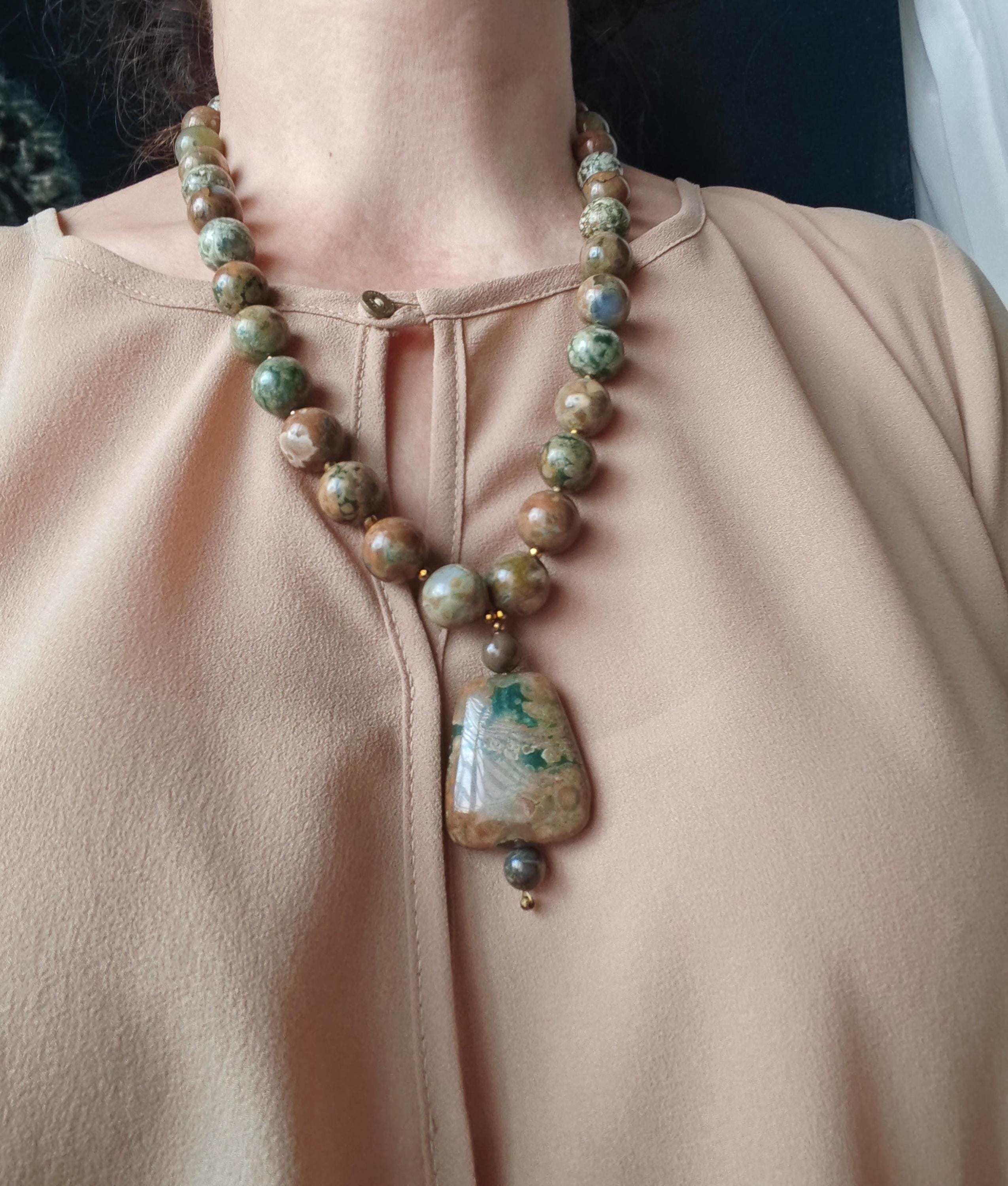 The ocean jasper necklace comes in a wide range of colors: brown, green, and cognac. The necklace length is approximately 54 cm plus an extension chain. This statement necklace is made of large, round, glossy pearls (14 mm and 8 mm) and faceted spinel pearls in cognac (3 mm). The pendant is approximately 5.5 cm long. The large stone in the pendant is trapezoidal (35 mm x 25 mm x 8 mm). The S-shaped chain clasp and the extension chain are gold-plated.