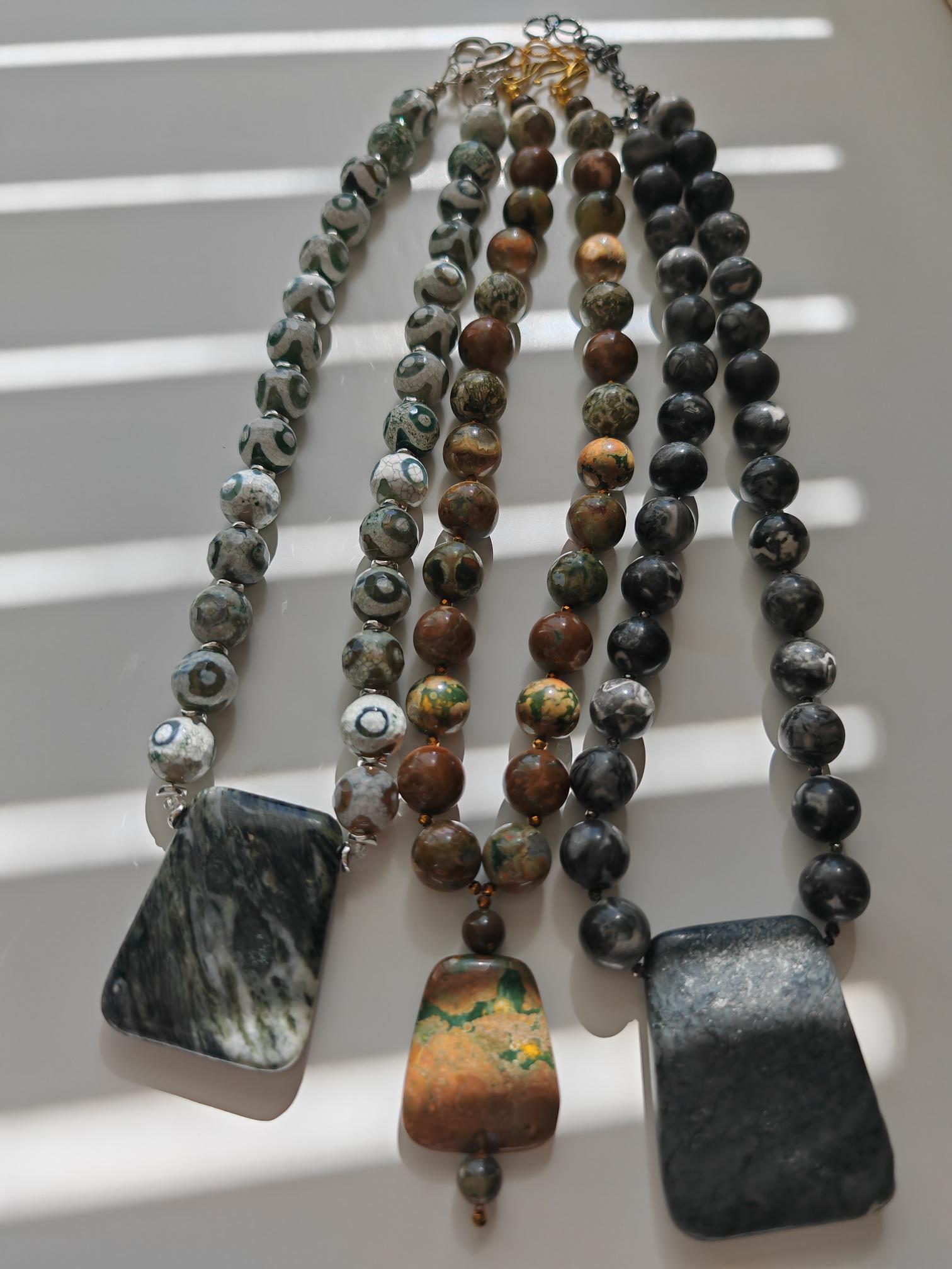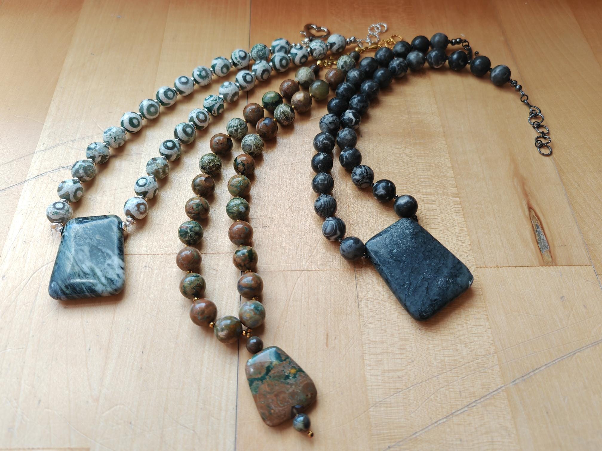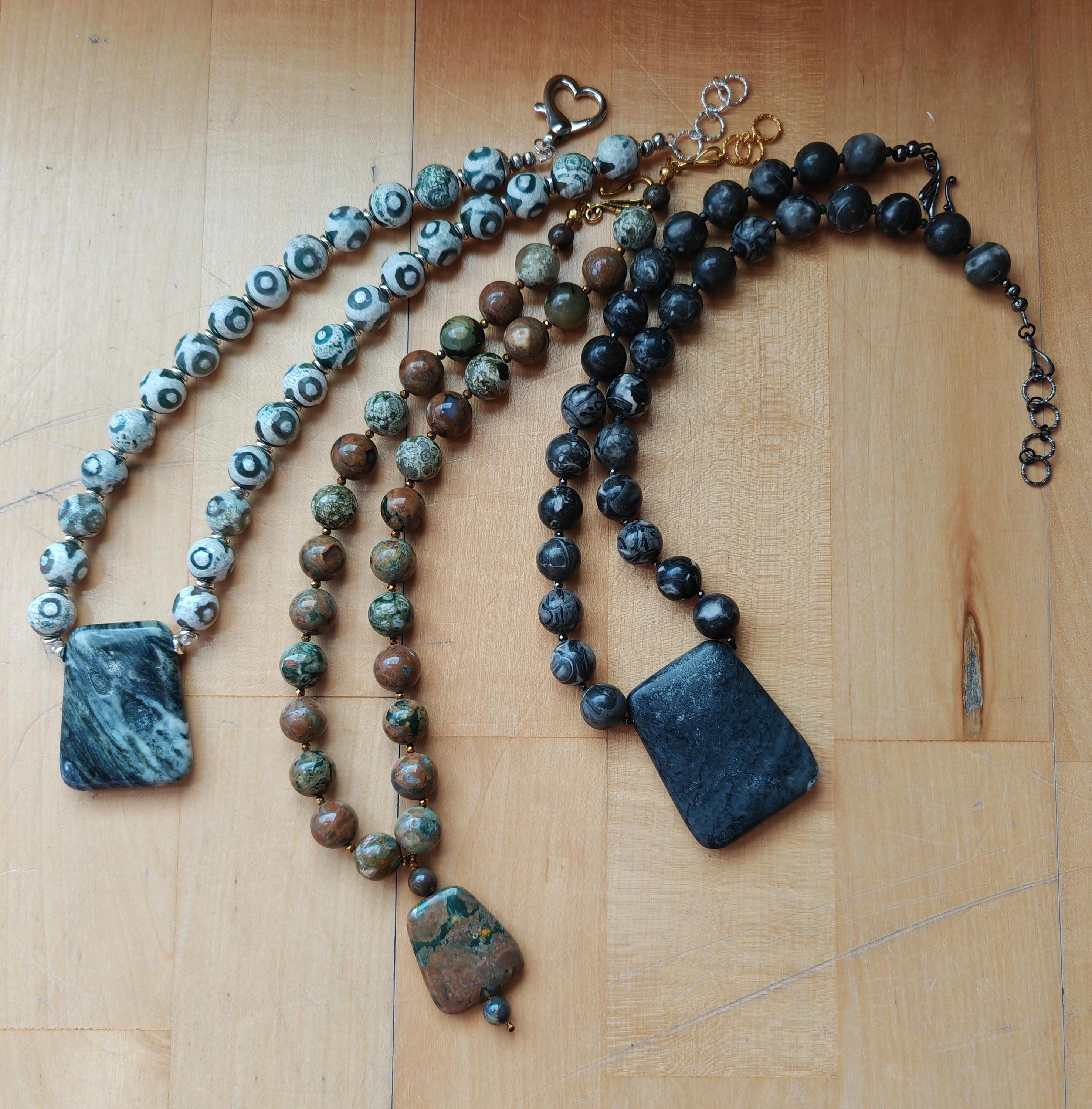 Handmade, solid necklaces with a large pendant. There are three chain options to choose from.