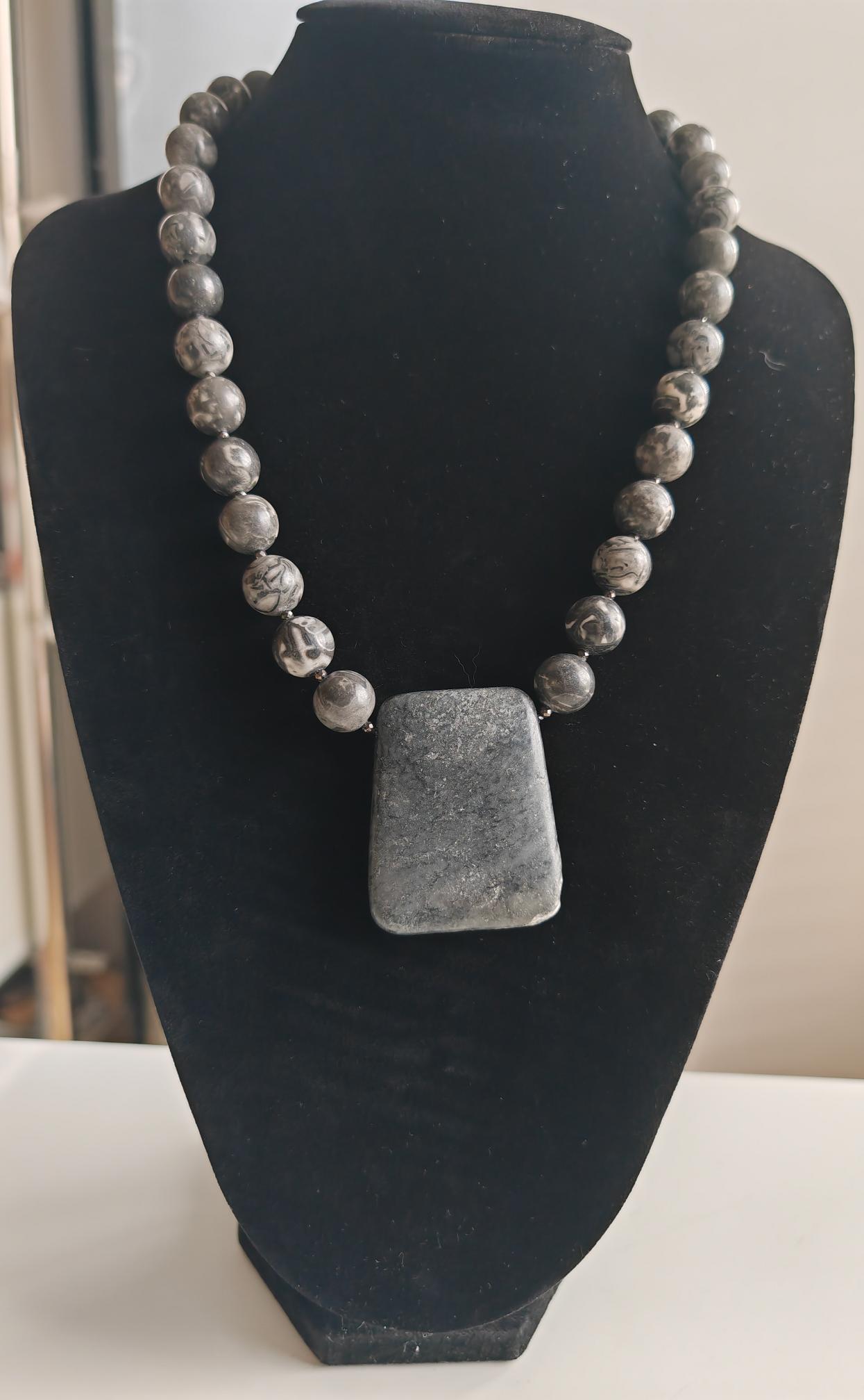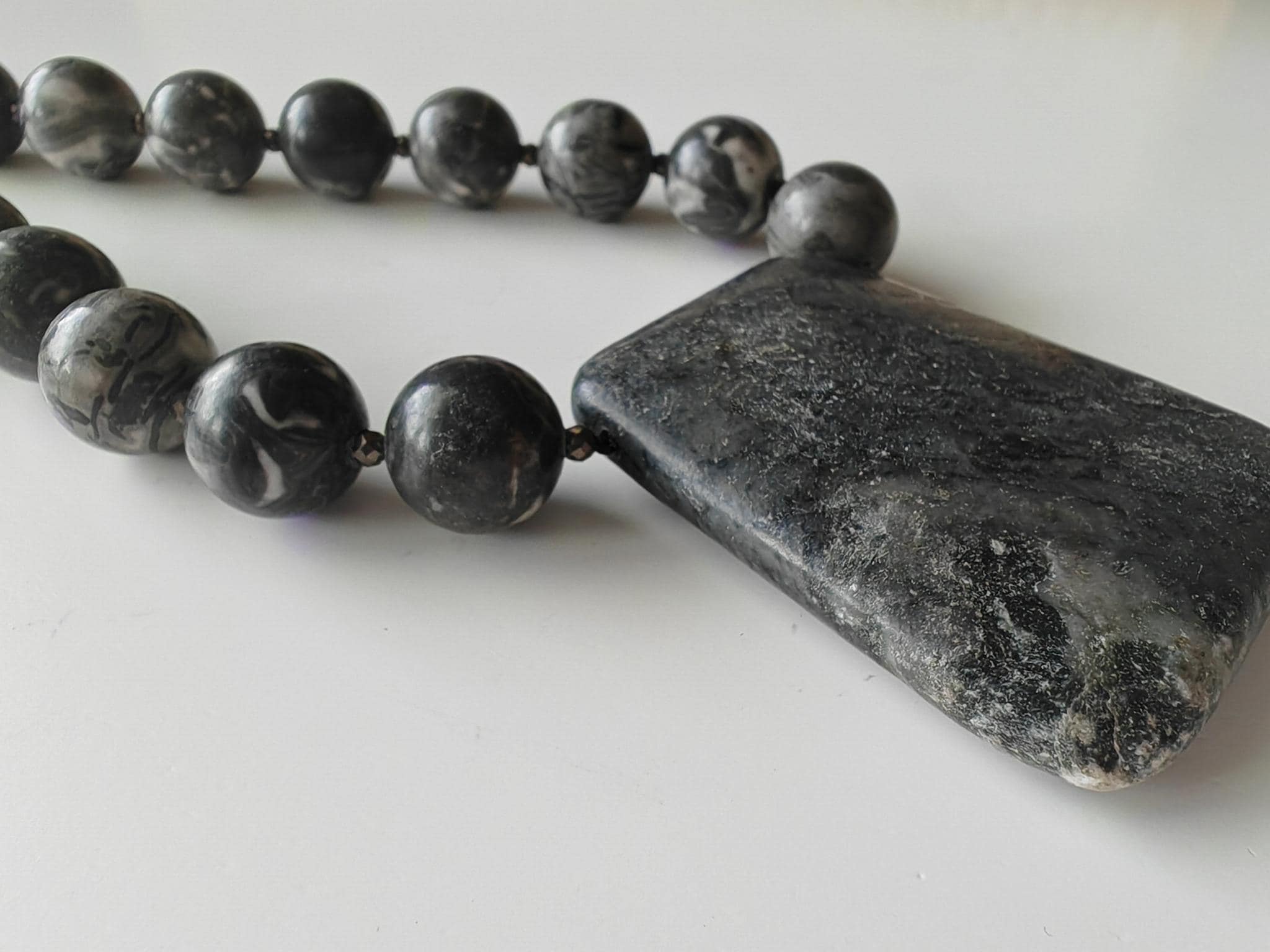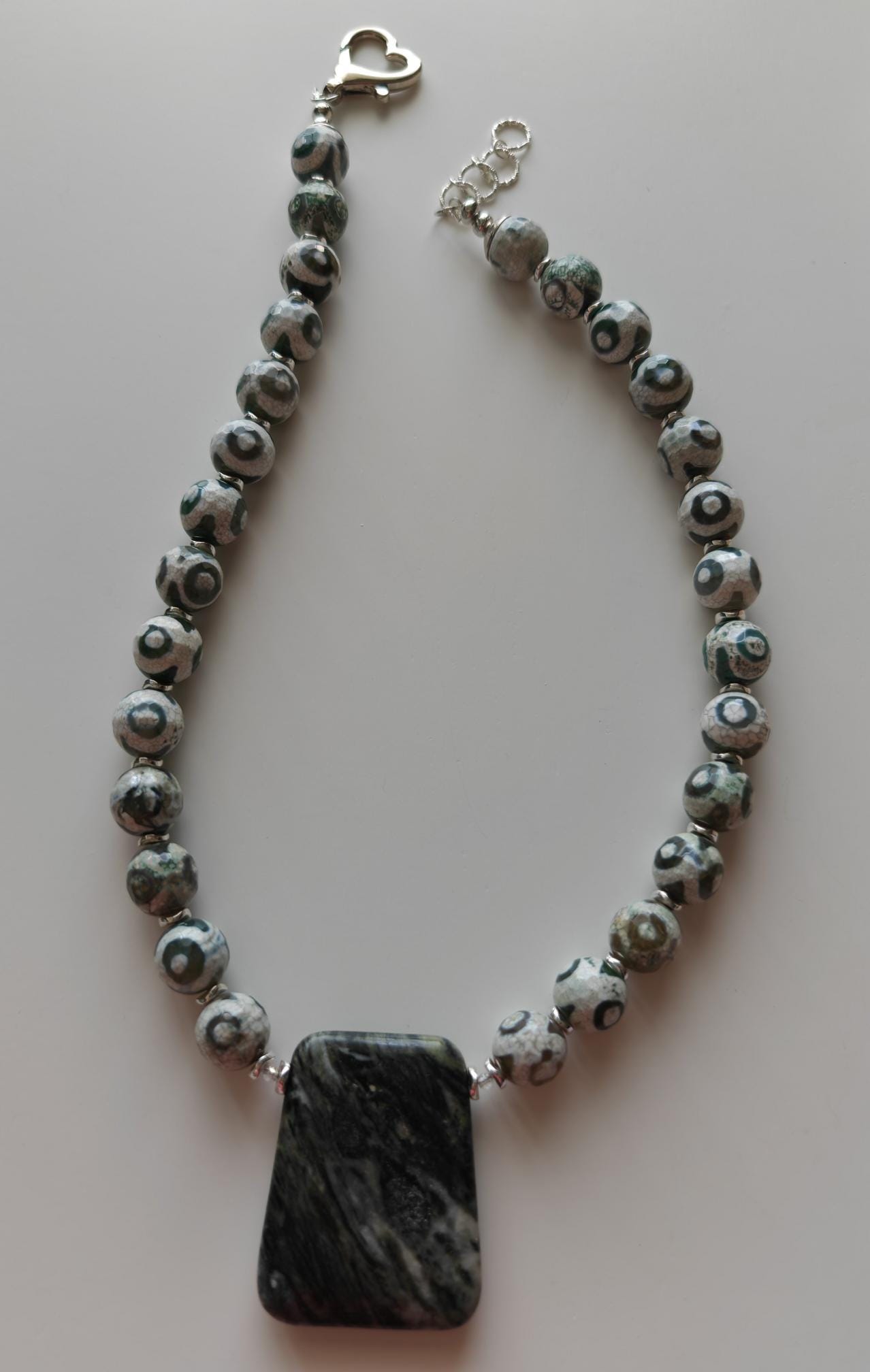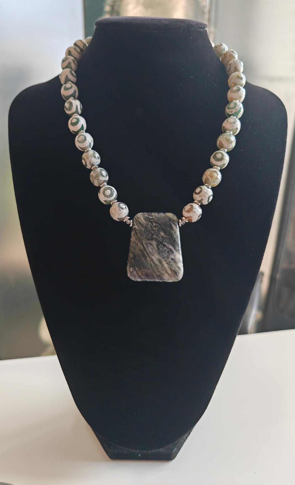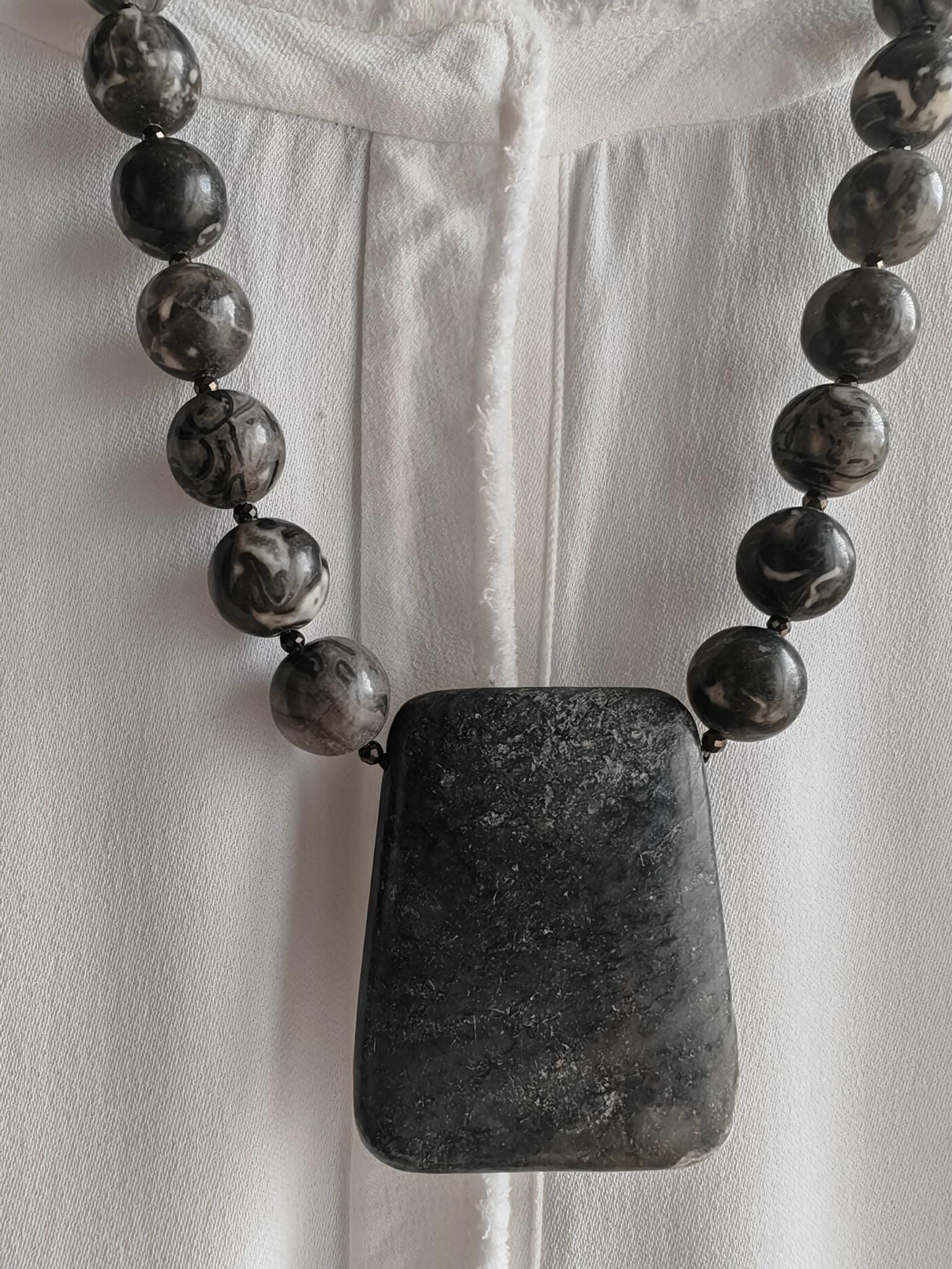 The gray/black/white agate necklace is approximately 60 cm long, plus an extension chain. The necklace is made of round agate beads (14 mm) and black faceted spinel beads (3 mm and 2 mm). The gray/black pendant is very solid (55 mm x 44 mm x 11 mm). The necklace clasp and extension chain are black.