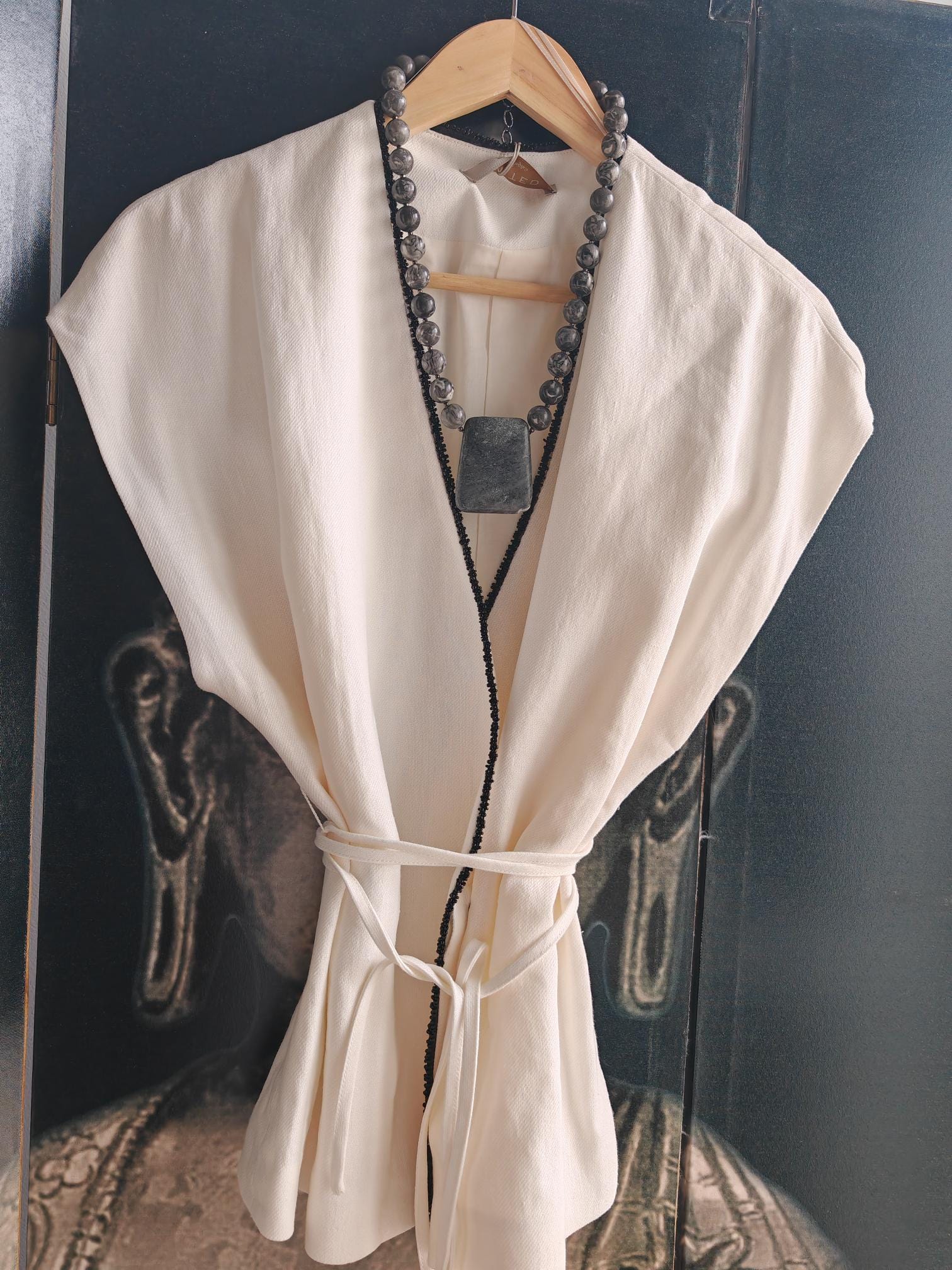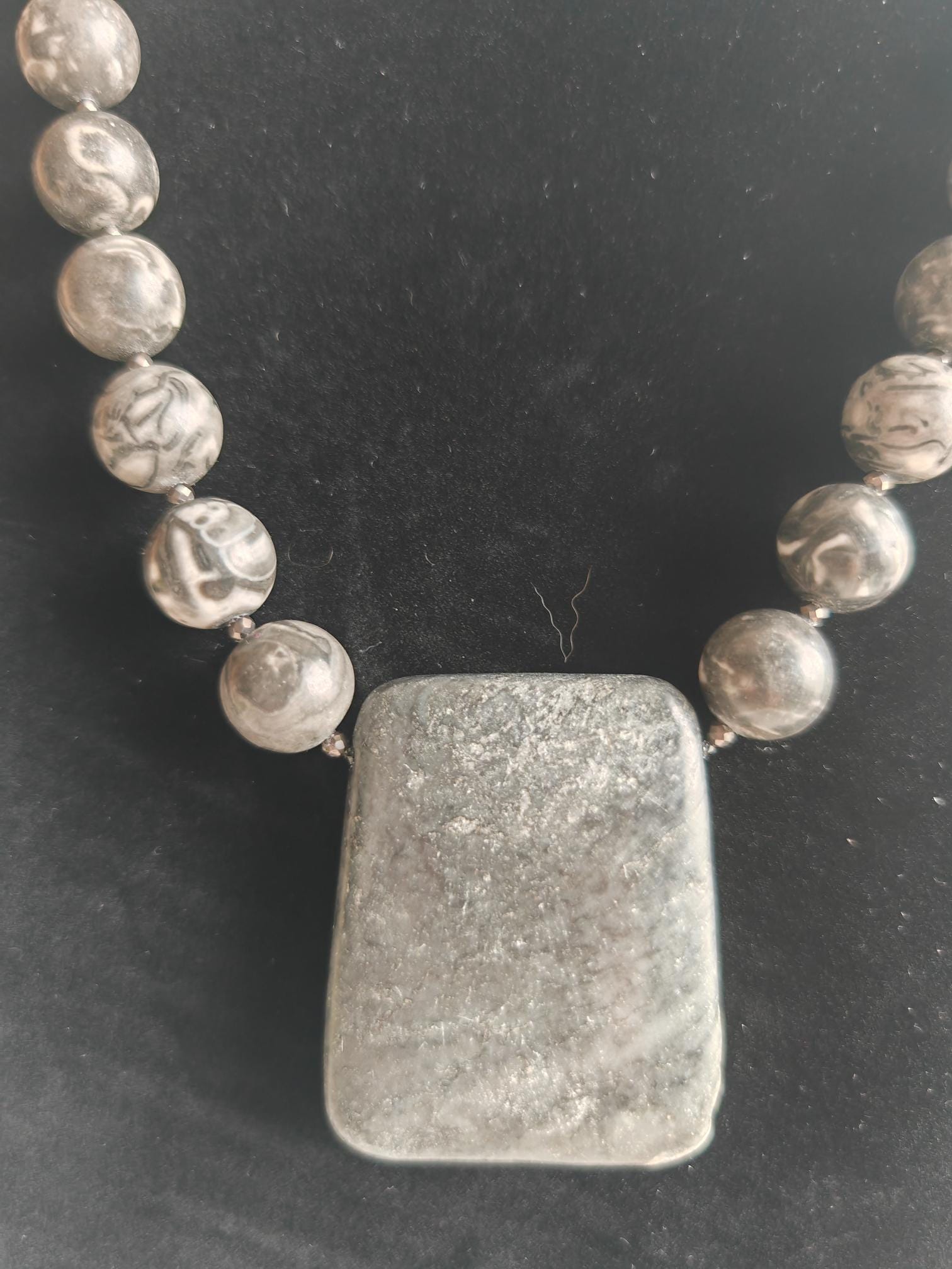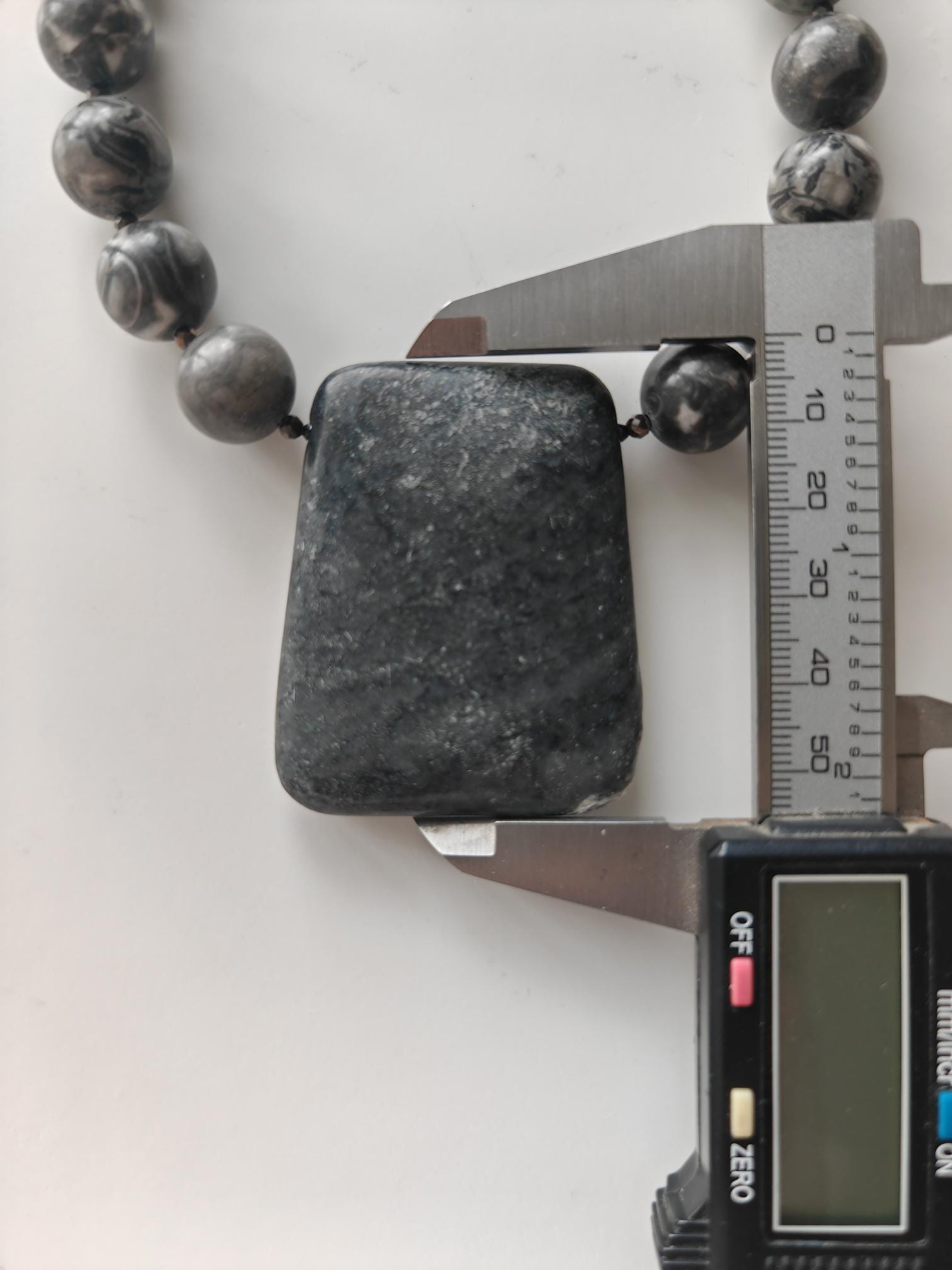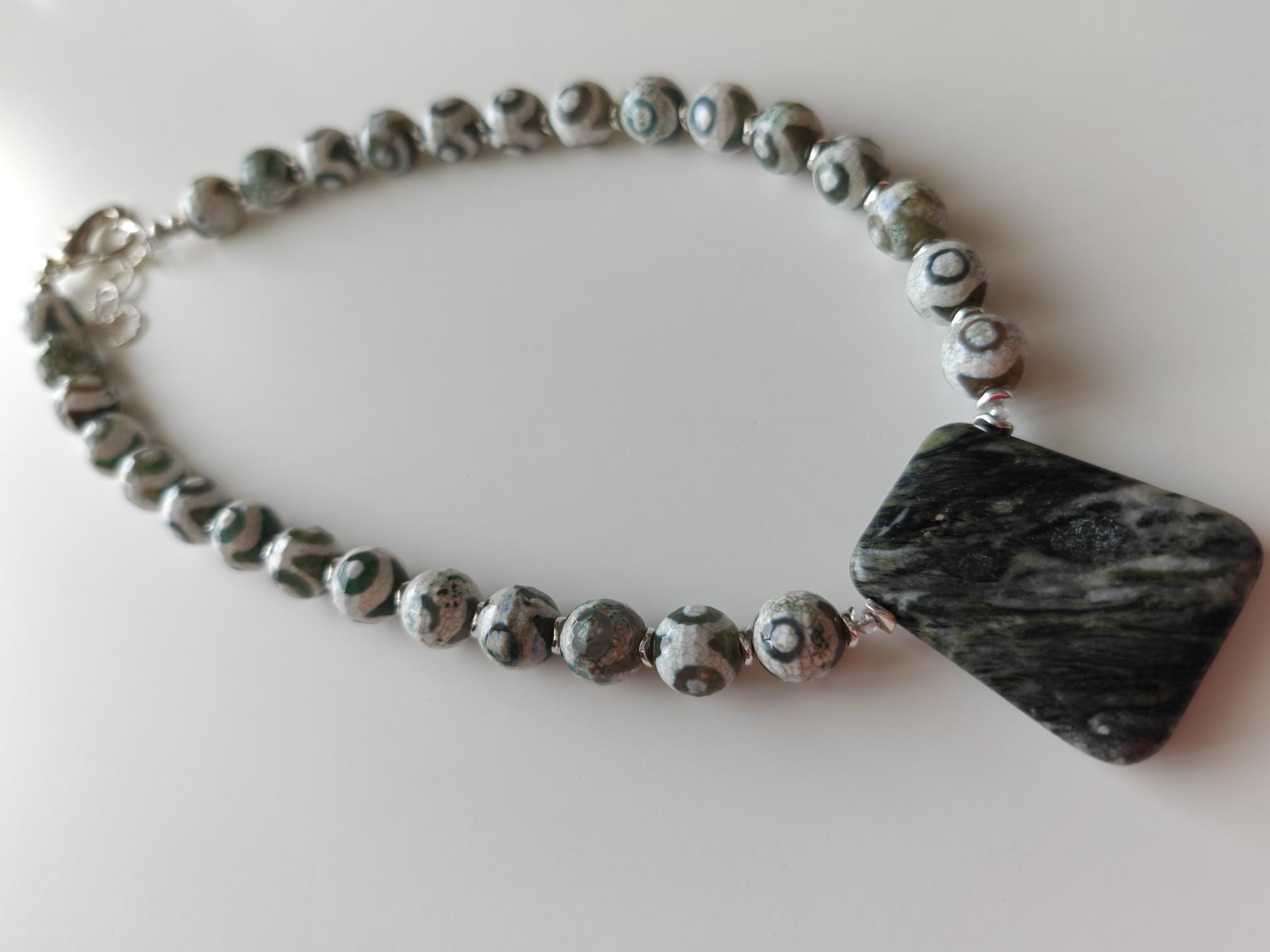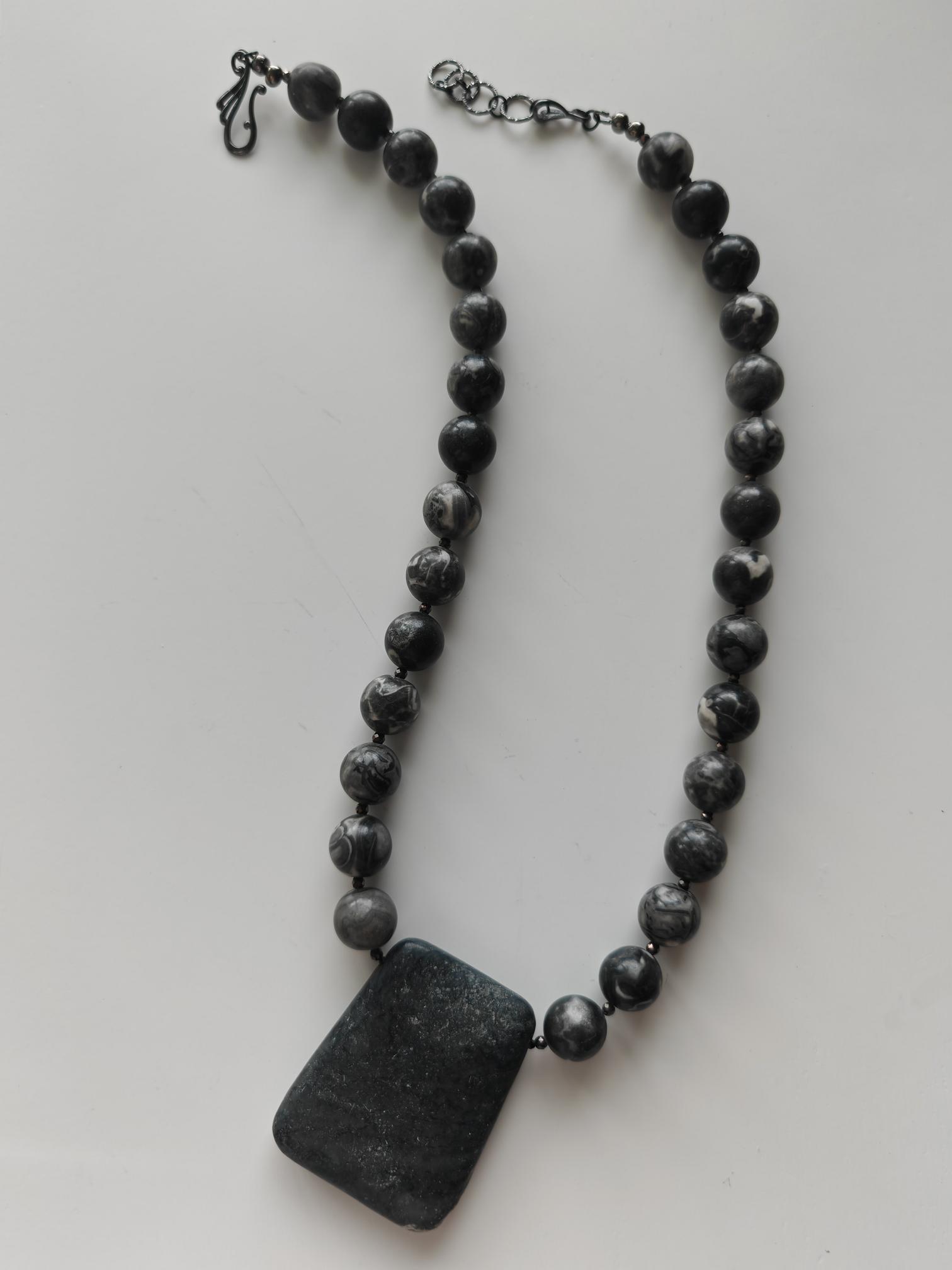 The gray/black/white agate necklace is approximately 60 cm long, plus an extension chain. The necklace is made of round agate beads (14 mm) and black faceted spinel beads (3 mm and 2 mm). The gray/black pendant is very solid (55 mm x 44 mm x 11 mm). The necklace clasp and extension chain are black.