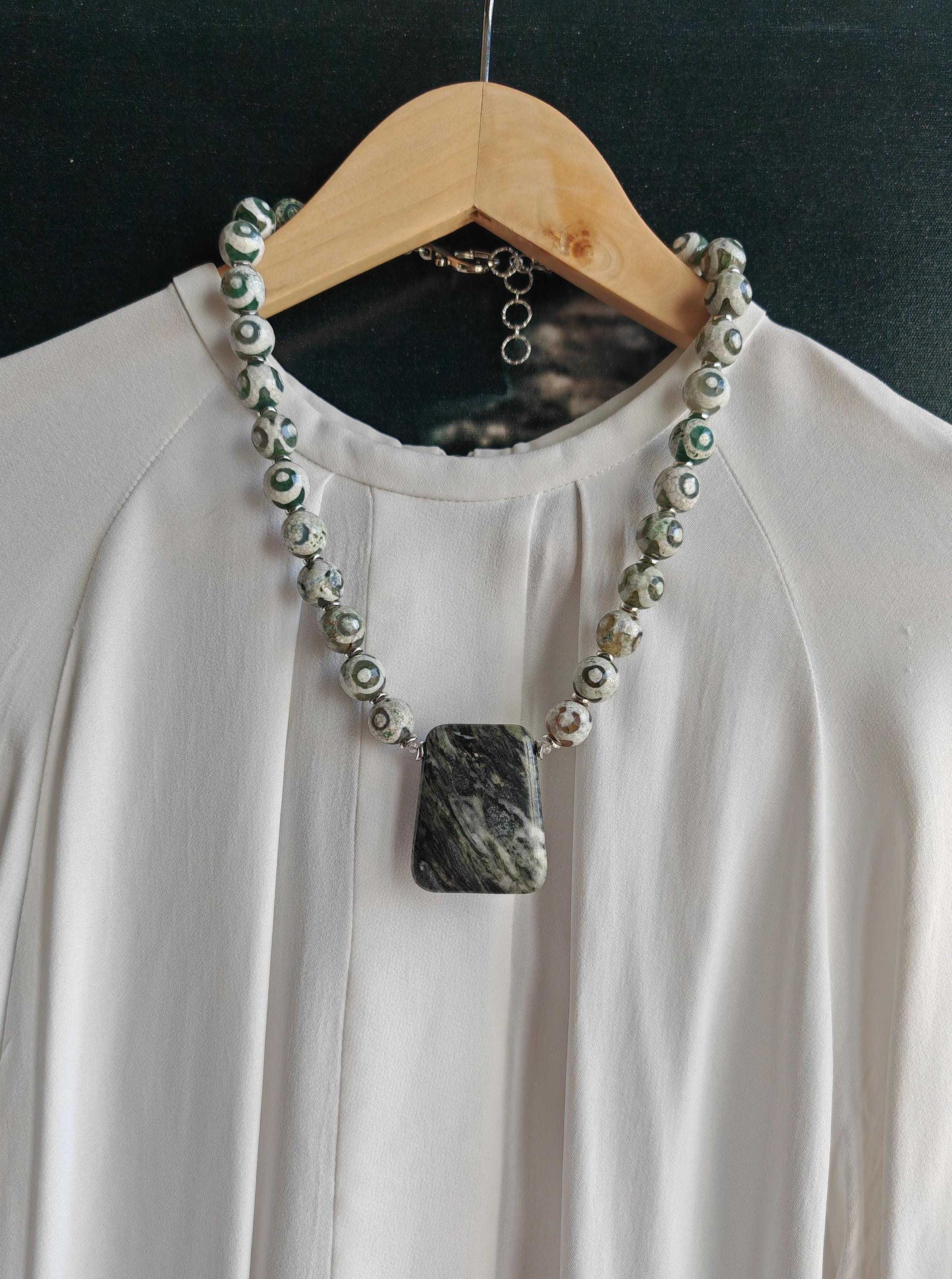 The green/white/gray agate necklace is approximately 54 cm long, plus an extension chain. The necklace is made of faceted agate beads (14 mm), wavy silver hematite discs (approx. 5 mm), and transparent faceted spinel beads (3 mm). The gray/green/black pendant is very solid (50 mm x 40 mm x 10 mm). The necklace clasp, extension chain, and bead caps are silver.