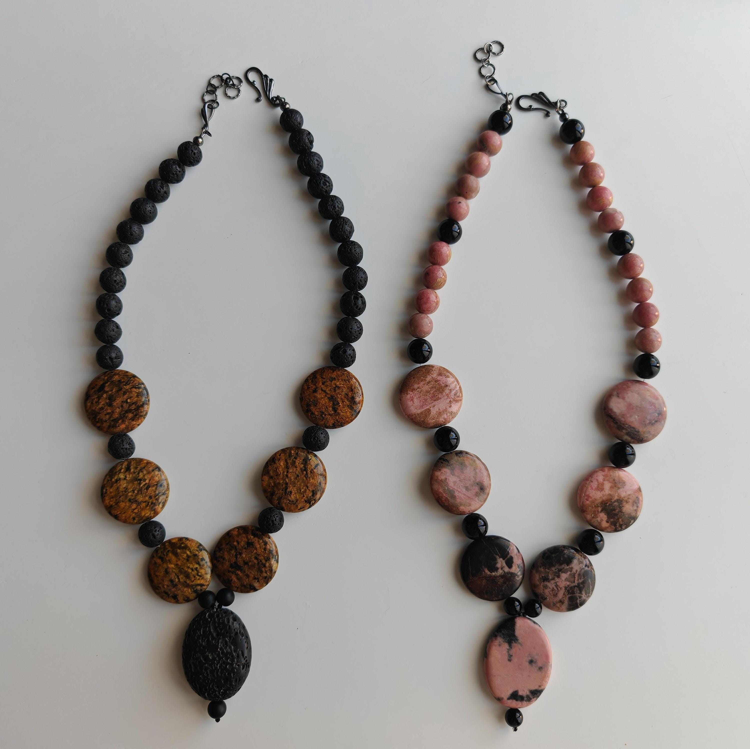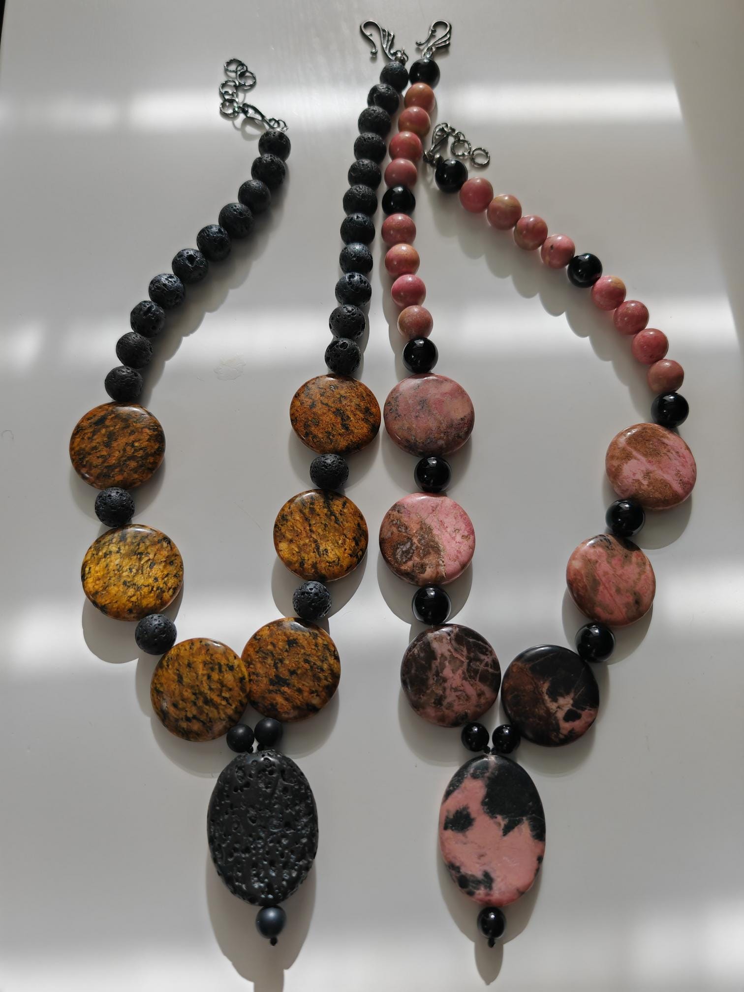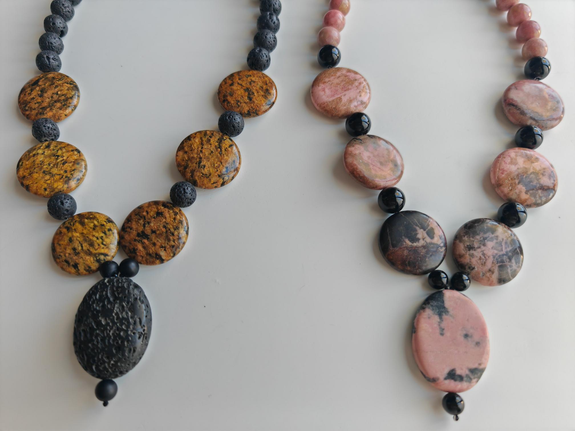 Handmade, colorful necklaces with pendants. There are two solid chains to choose from.