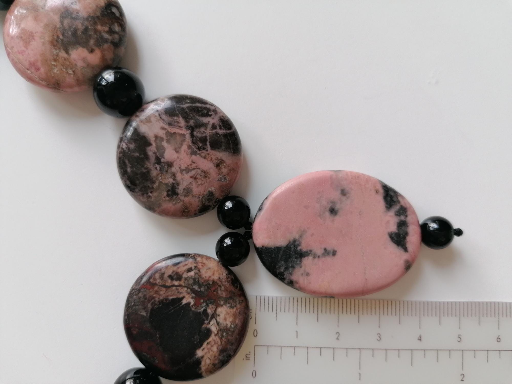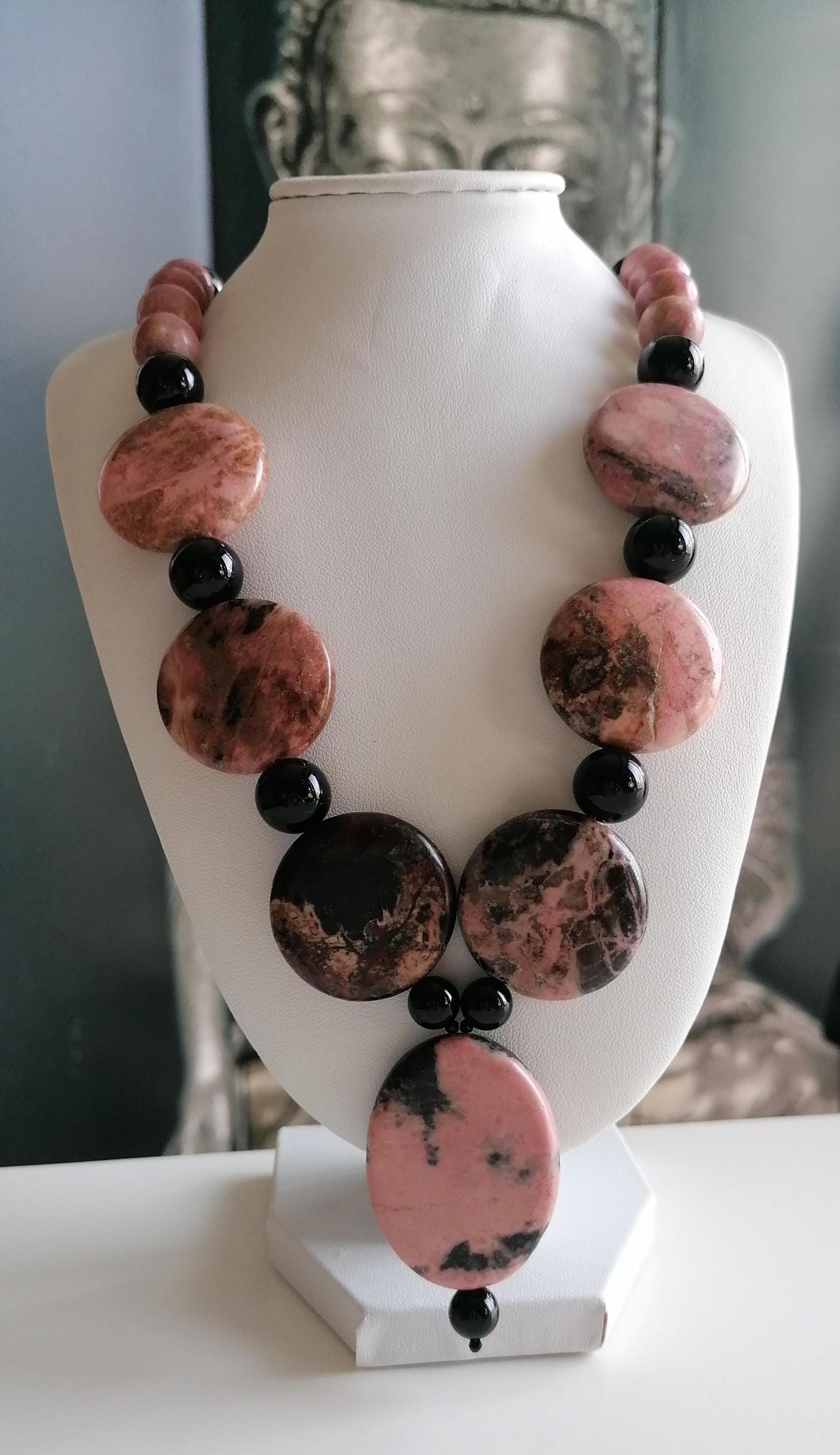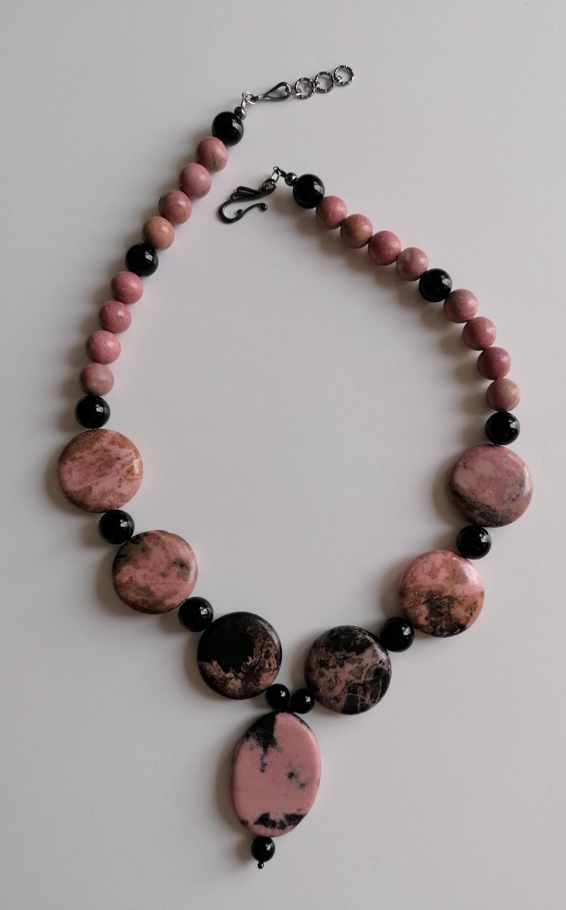 Rhodonite necklace with pendant in pink and black. This opulent statement necklace is 57 cm long plus an extension chain. The colorful piece is crafted from rhodonite beads (round beads 12 mm and coin-shaped beads approx. 30 mm x 10 mm), round high-gloss onyx beads (12 mm, 8 mm), and black faceted spinel beads (2 mm). The pendant is approx. 5 cm long and 3 cm wide. The S-shaped clasp and extension chain are black.