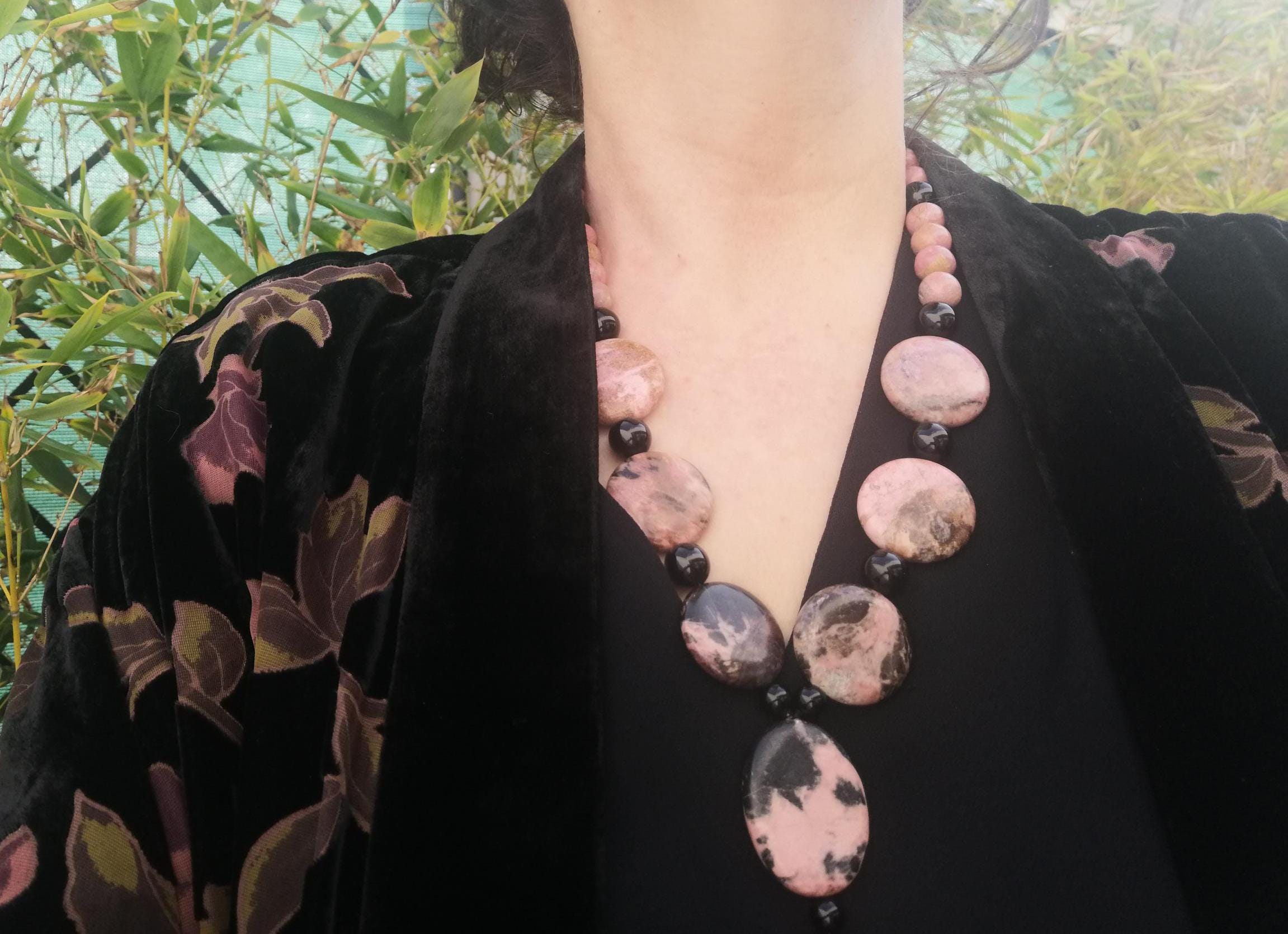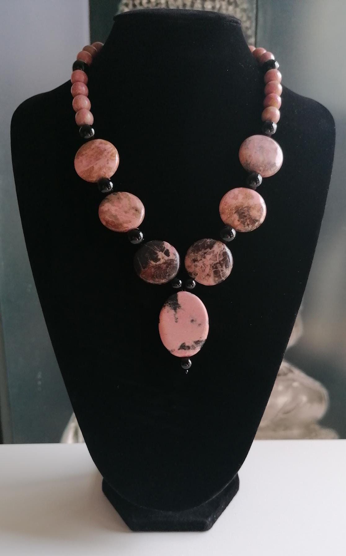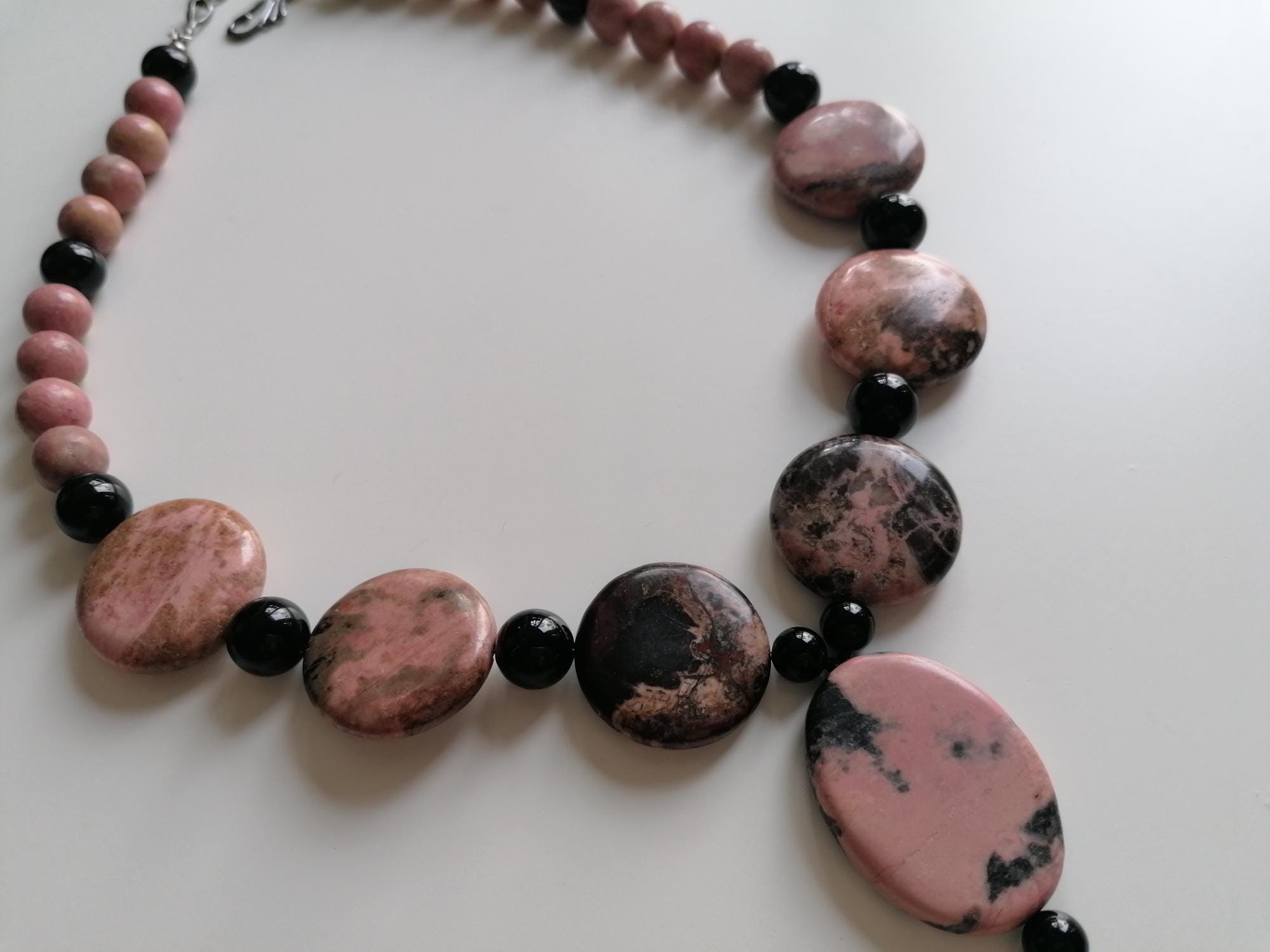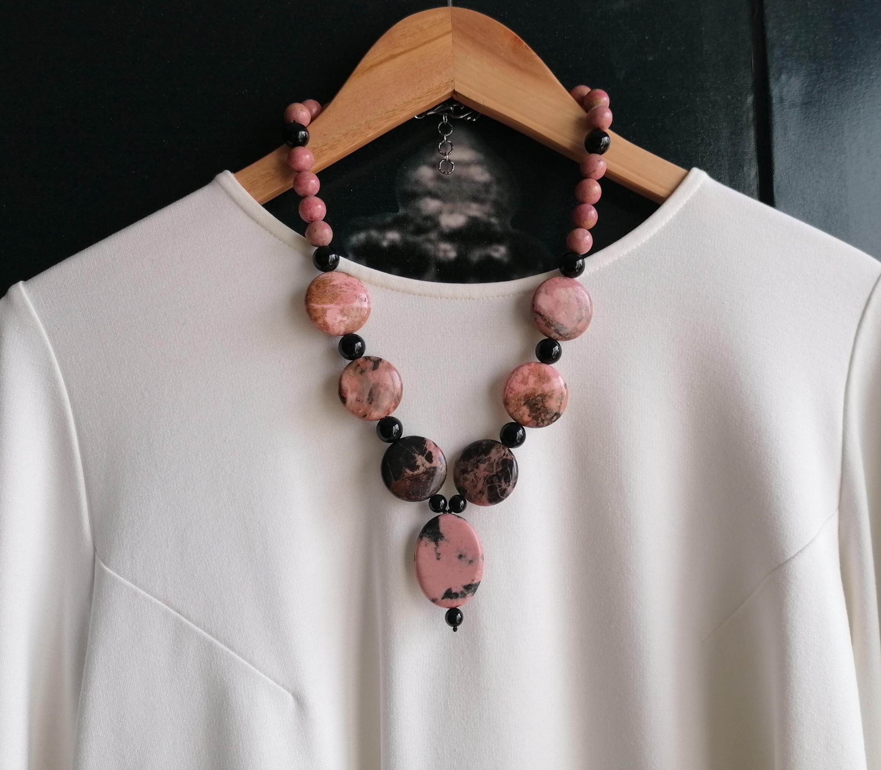 Rhodonite necklace with pendant in pink and black. This opulent statement necklace is 57 cm long plus an extension chain. The colorful piece is crafted from rhodonite beads (round beads 12 mm and coin-shaped beads approx. 30 mm x 10 mm), round high-gloss onyx beads (12 mm, 8 mm), and black faceted spinel beads (2 mm). The pendant is approx. 5 cm long and 3 cm wide. The S-shaped clasp and extension chain are black.