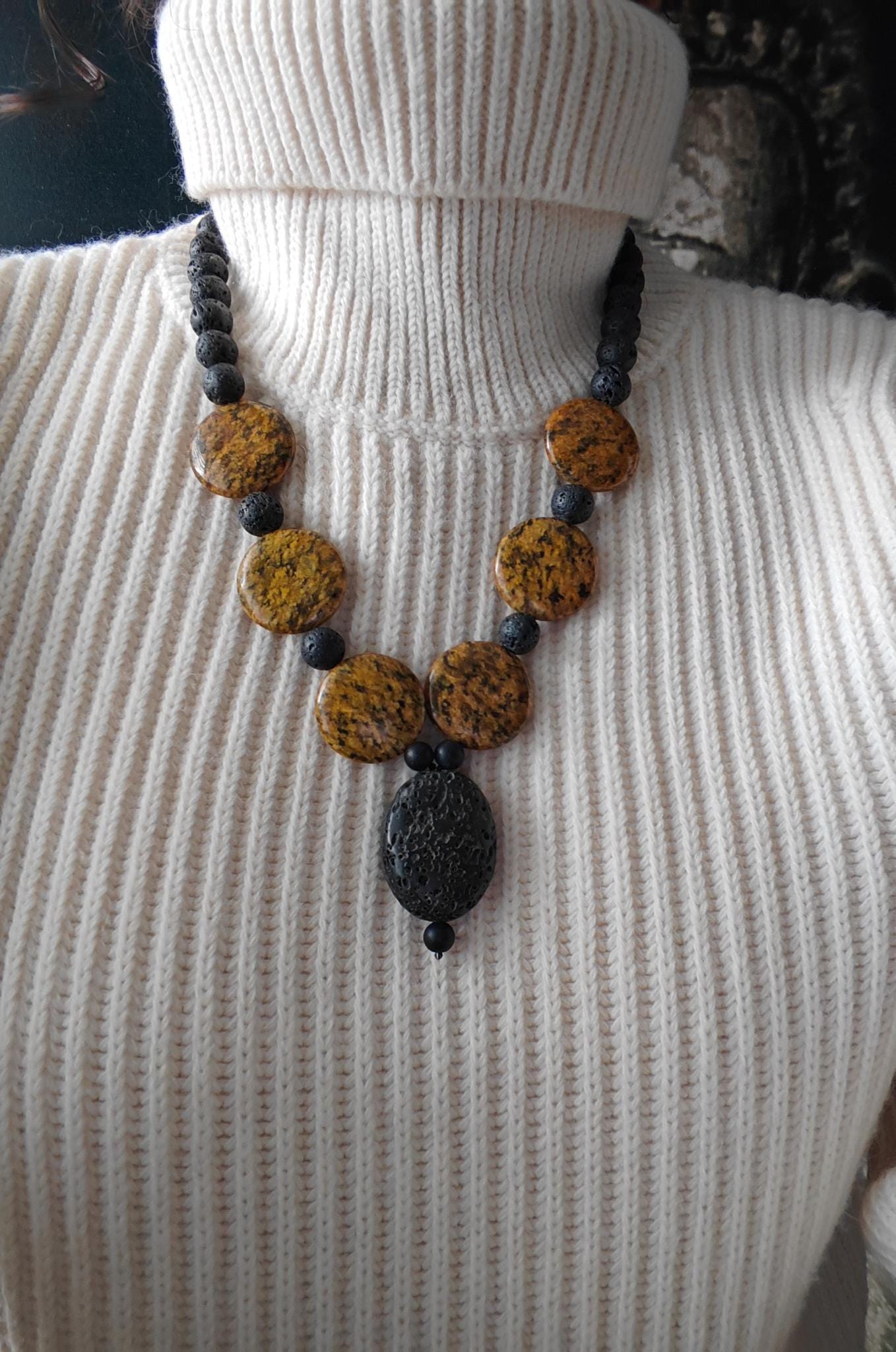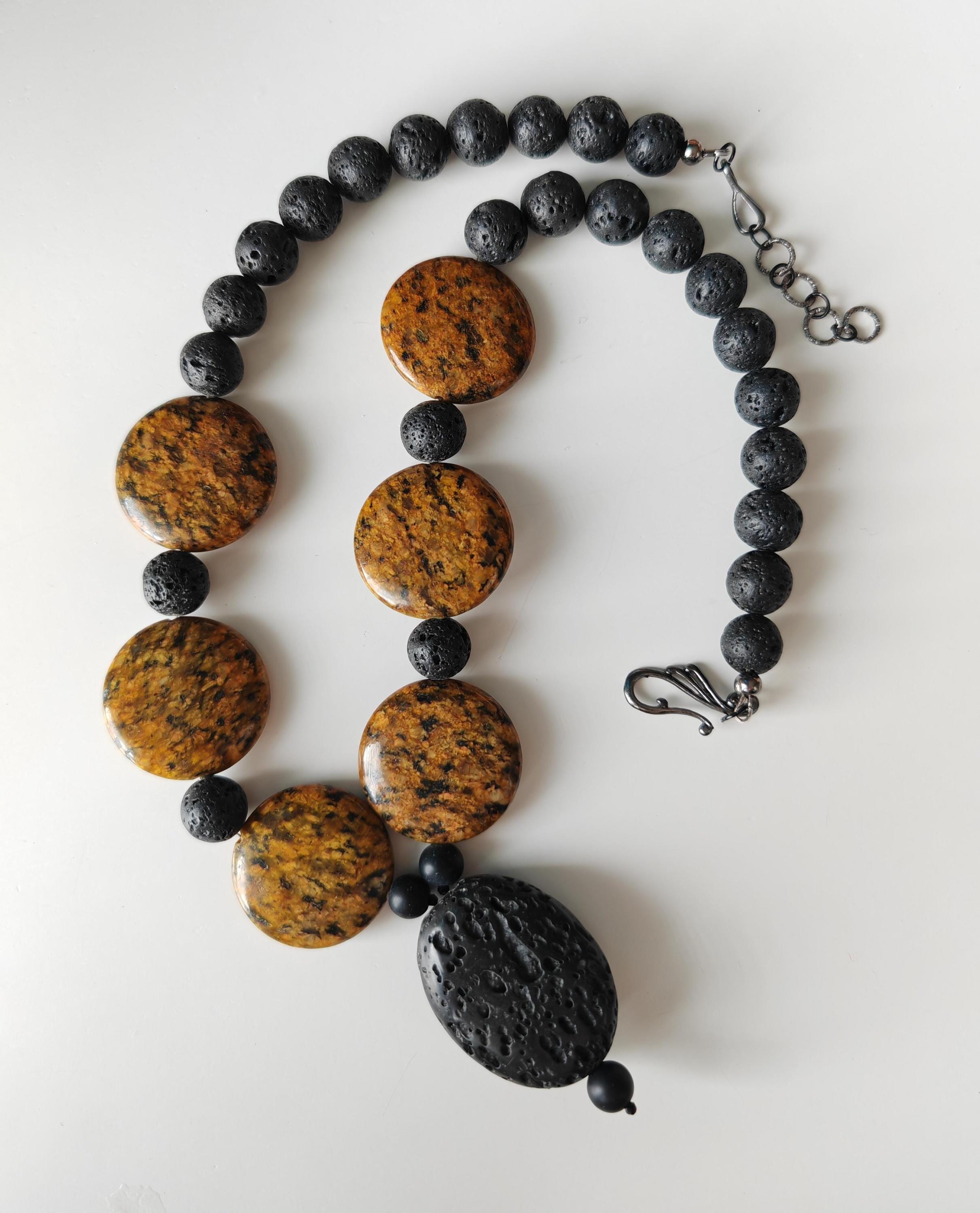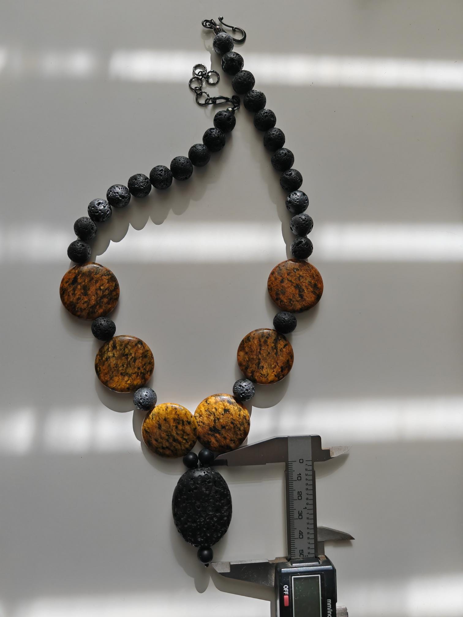 This mahogany obsidian necklace with a pendant is brown, yellow, and black. The opulent statement necklace is approximately 57 cm long, plus an extension chain. The piece is crafted from mahogany obsidian coins (30 mm x 7 mm), round matte onyx beads (8 mm), round black lava beads, and black faceted spinel beads (2 mm). The pendant is approximately 5 cm long and 3 cm wide (oval lava bead 40 mm x 15 mm). The S-shaped clasp and extension chain are black.