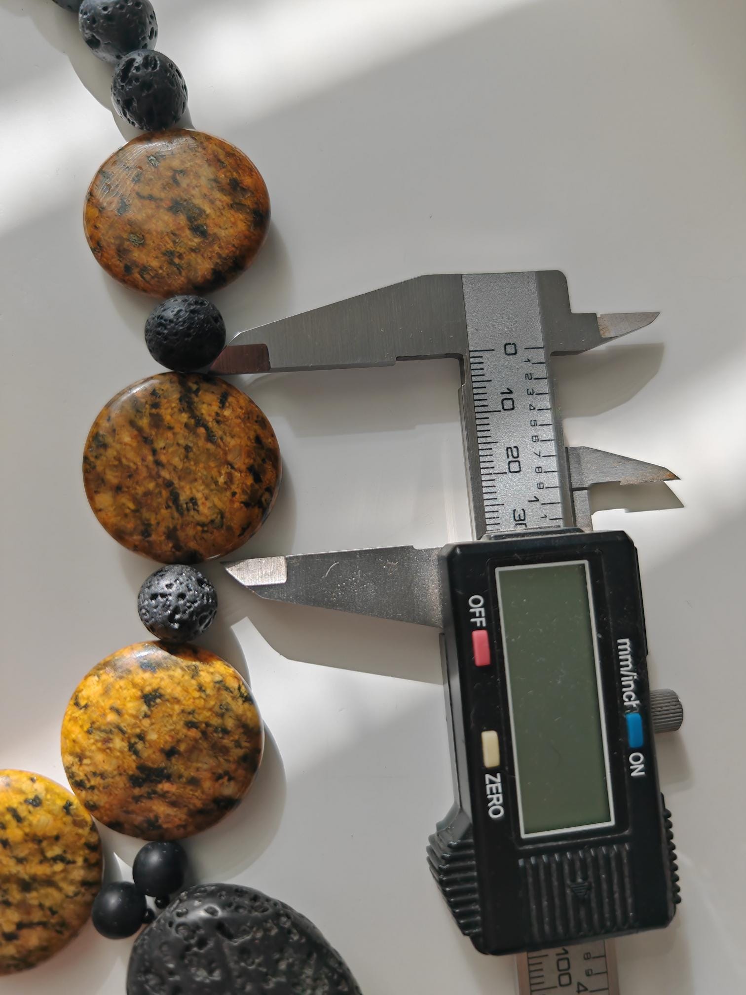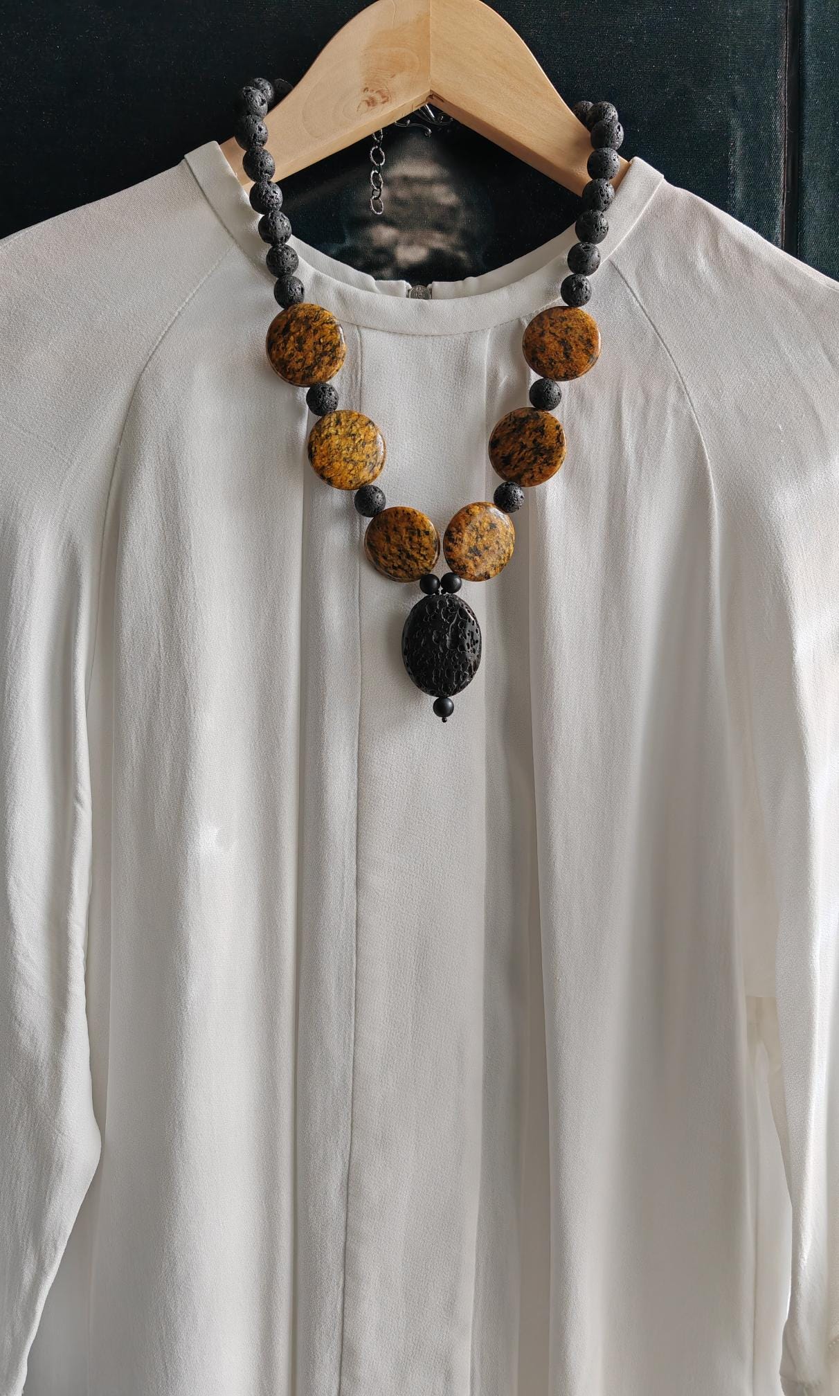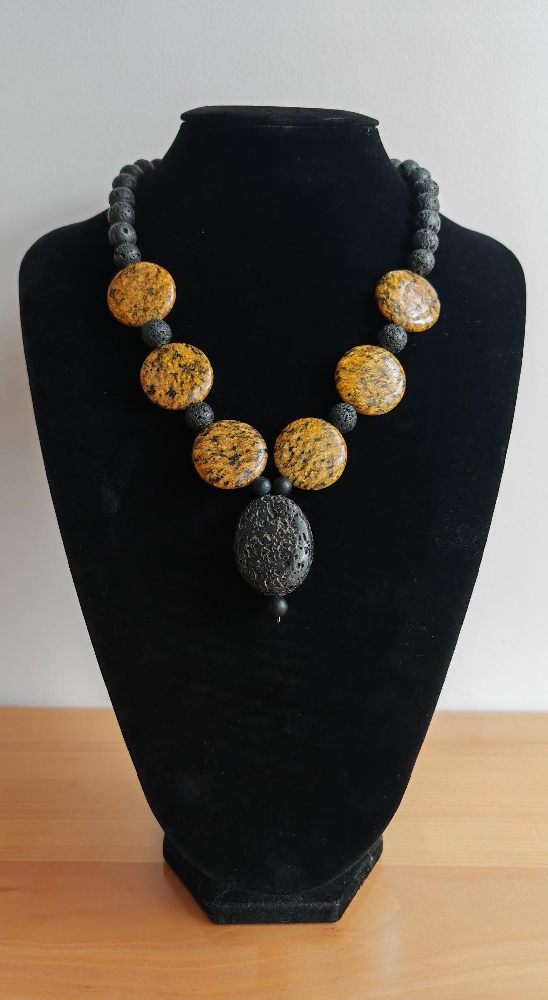 This mahogany obsidian necklace with a pendant is brown, yellow, and black. The opulent statement necklace is approximately 57 cm long, plus an extension chain. The piece is crafted from mahogany obsidian coins (30 mm x 7 mm), round matte onyx beads (8 mm), round black lava beads, and black faceted spinel beads (2 mm). The pendant is approximately 5 cm long and 3 cm wide (oval lava bead 40 mm x 15 mm). The S-shaped clasp and extension chain are black.