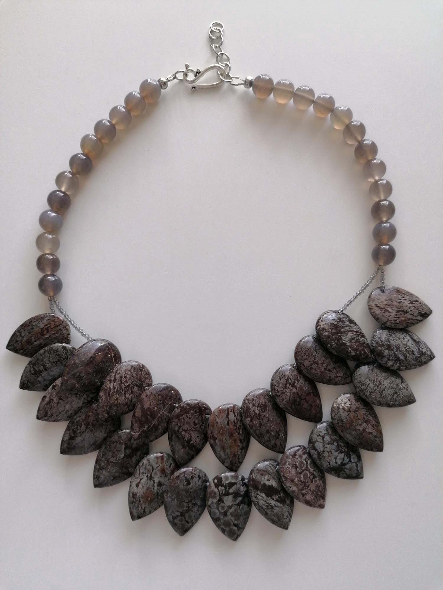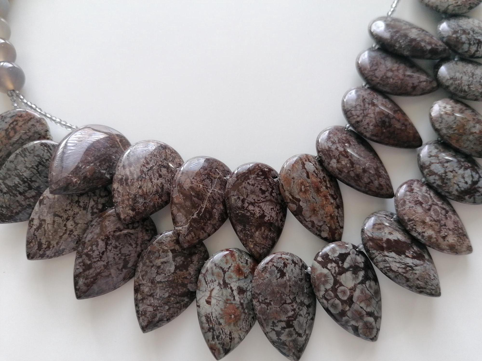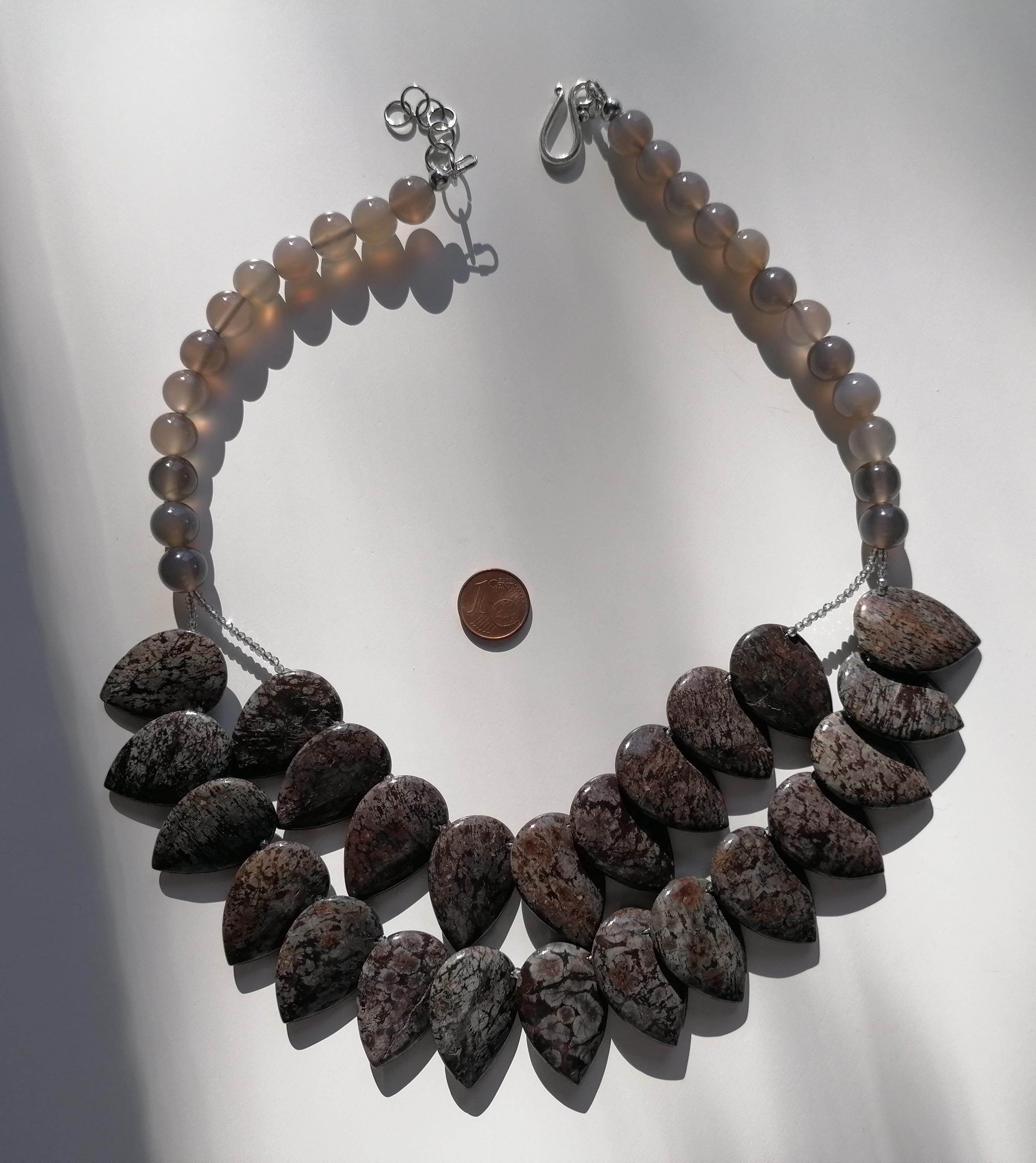 Handmade necklace made of Coffee Snowflake obsidian in chocolate brown, gray, and beige. This two-strand statement necklace is approximately 48 cm long, plus an extension chain. The necklace features teardrop-shaped Coffee Snowflake obsidian beads (approximately 3 cm x 2 cm), round gray agate beads (10 mm), and faceted gray spinel beads (2 mm). The S-clasp and extension chain are silver-colored. A beautiful gift!
