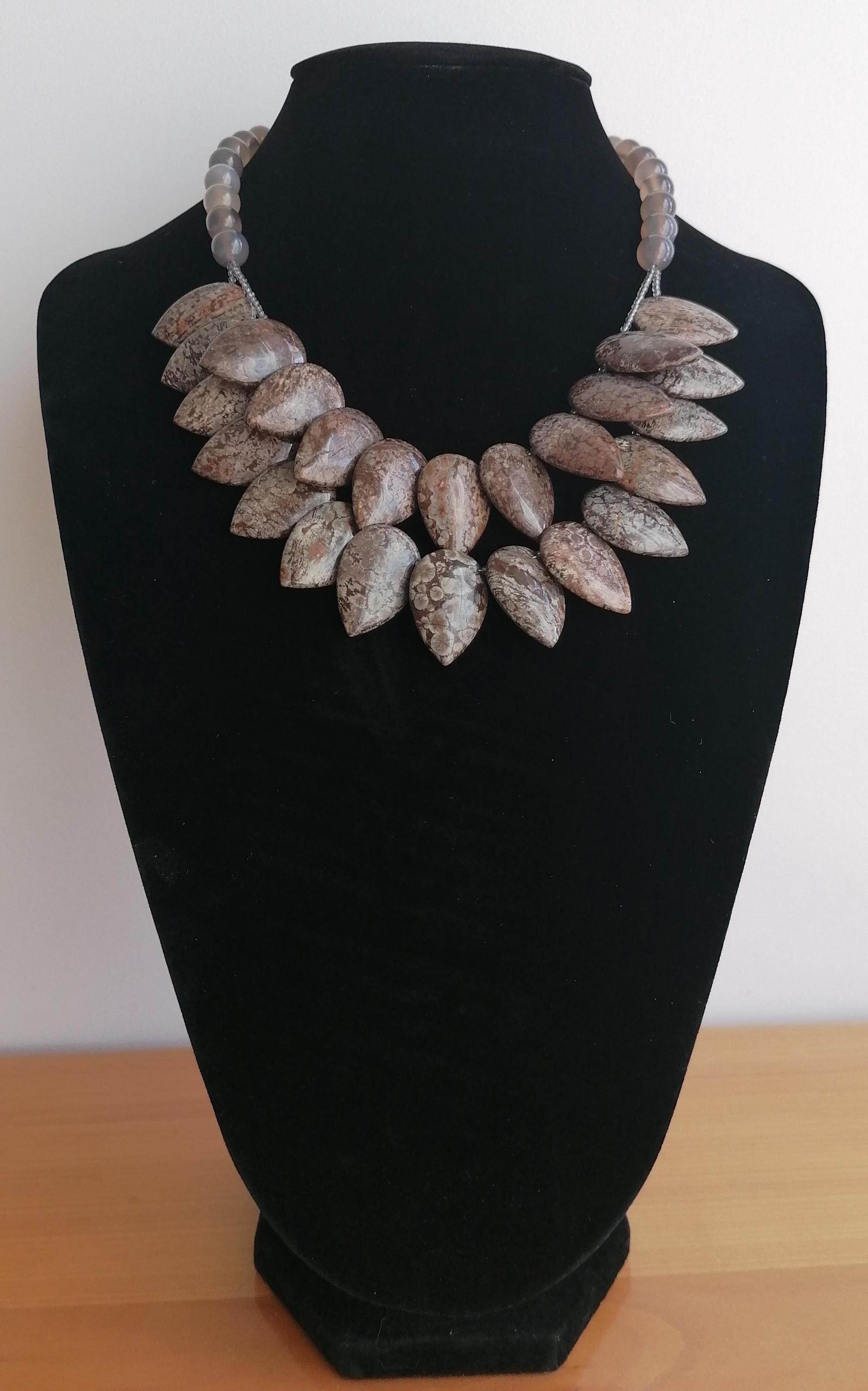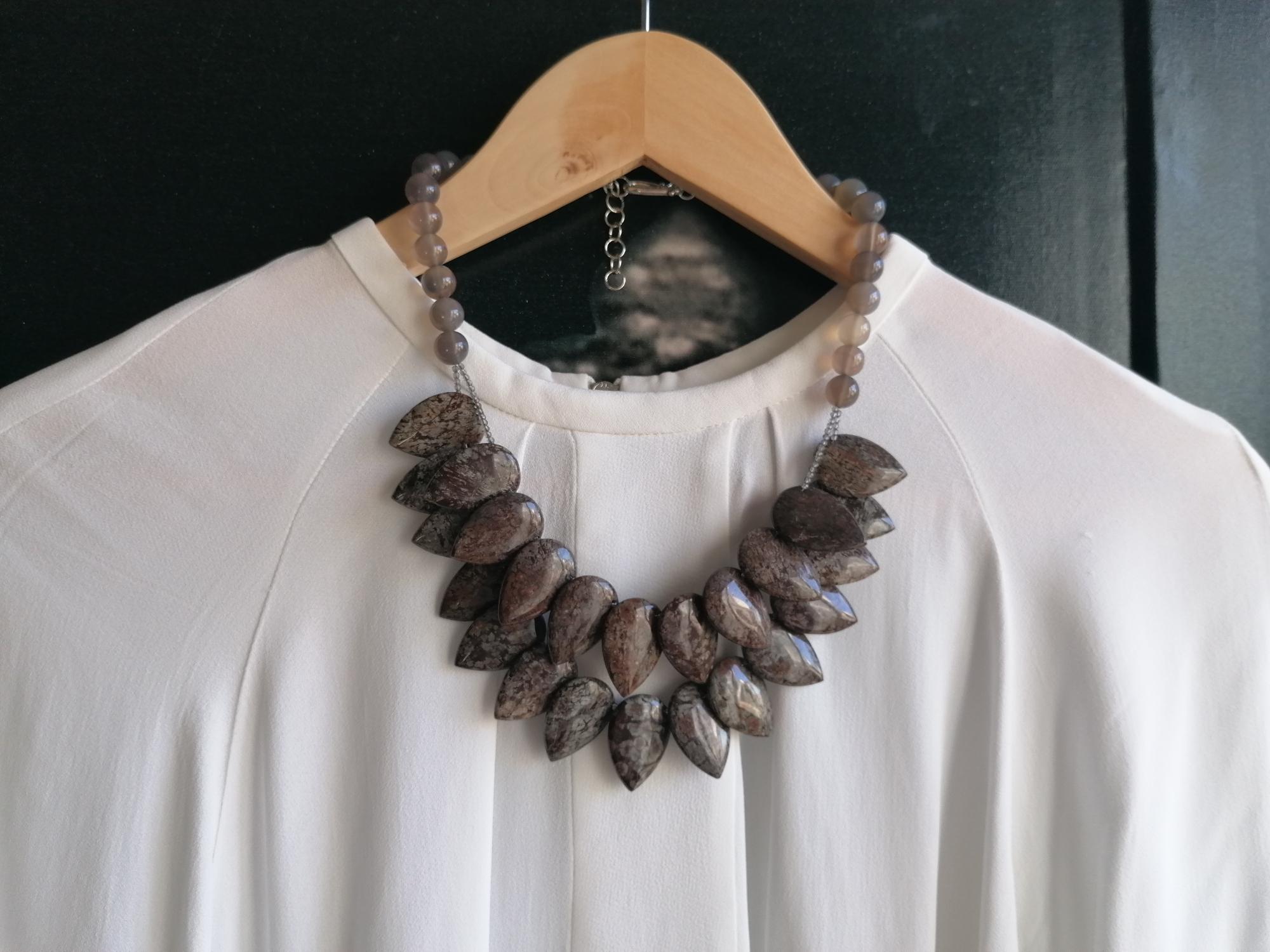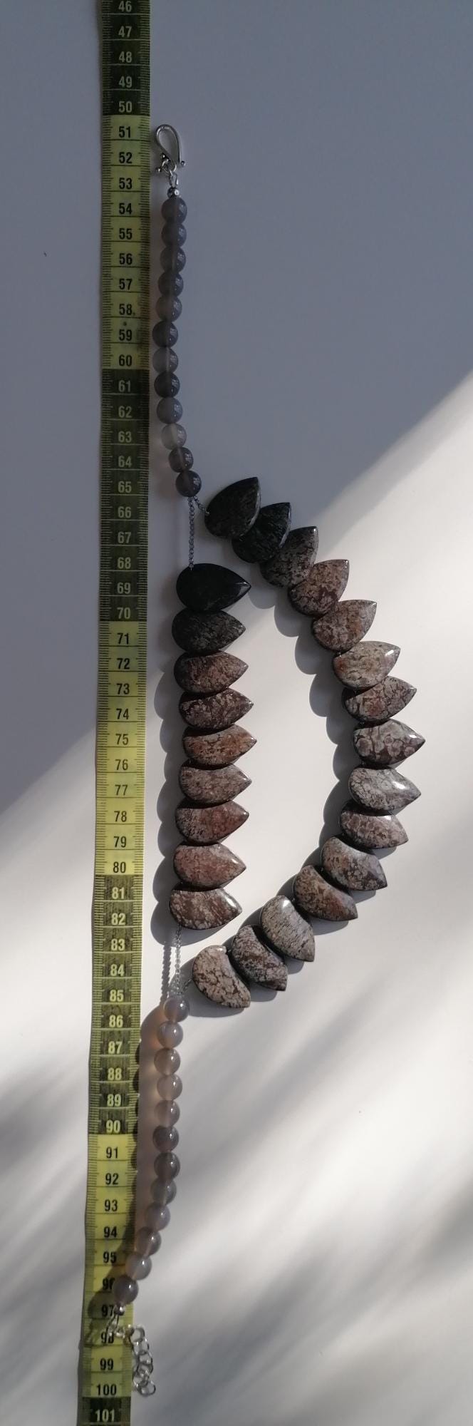 Handmade necklace made of Coffee Snowflake obsidian in chocolate brown, gray, and beige. This two-strand statement necklace is approximately 48 cm long, plus an extension chain. The necklace features teardrop-shaped Coffee Snowflake obsidian beads (approximately 3 cm x 2 cm), round gray agate beads (10 mm), and faceted gray spinel beads (2 mm). The S-clasp and extension chain are silver-colored. A beautiful gift!