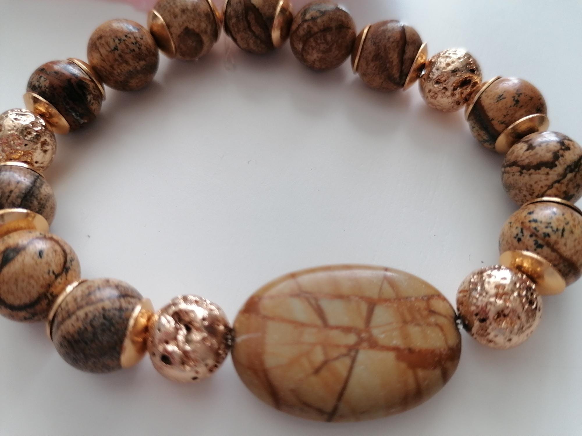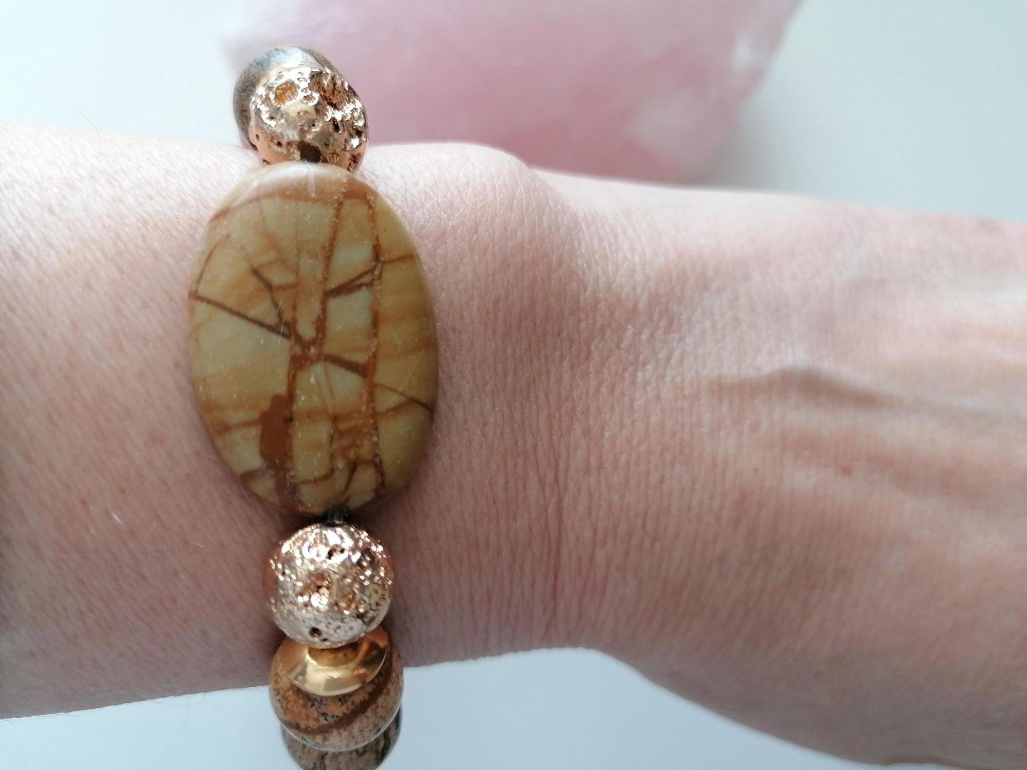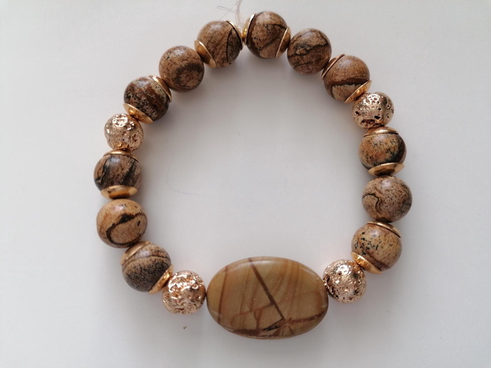 Handmade stretch bracelet made of landscape jasper in shades of brown and gold. Landscape jasper encompasses various shades of brown, from light to dark, and features black stripes, lines, or patterns. This unisex bracelet is crafted from large, round landscape jasper beads (12 mm) and gold-plated lava stone beads (10 mm). The large oval jasper bead measures approximately 30 mm x 20 mm x 7 mm. The metal bead caps are gold-colored.