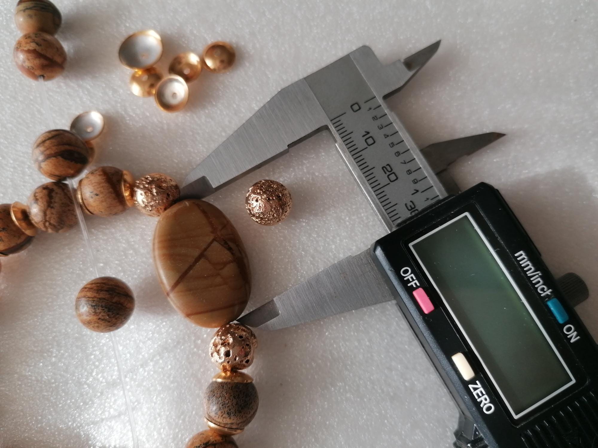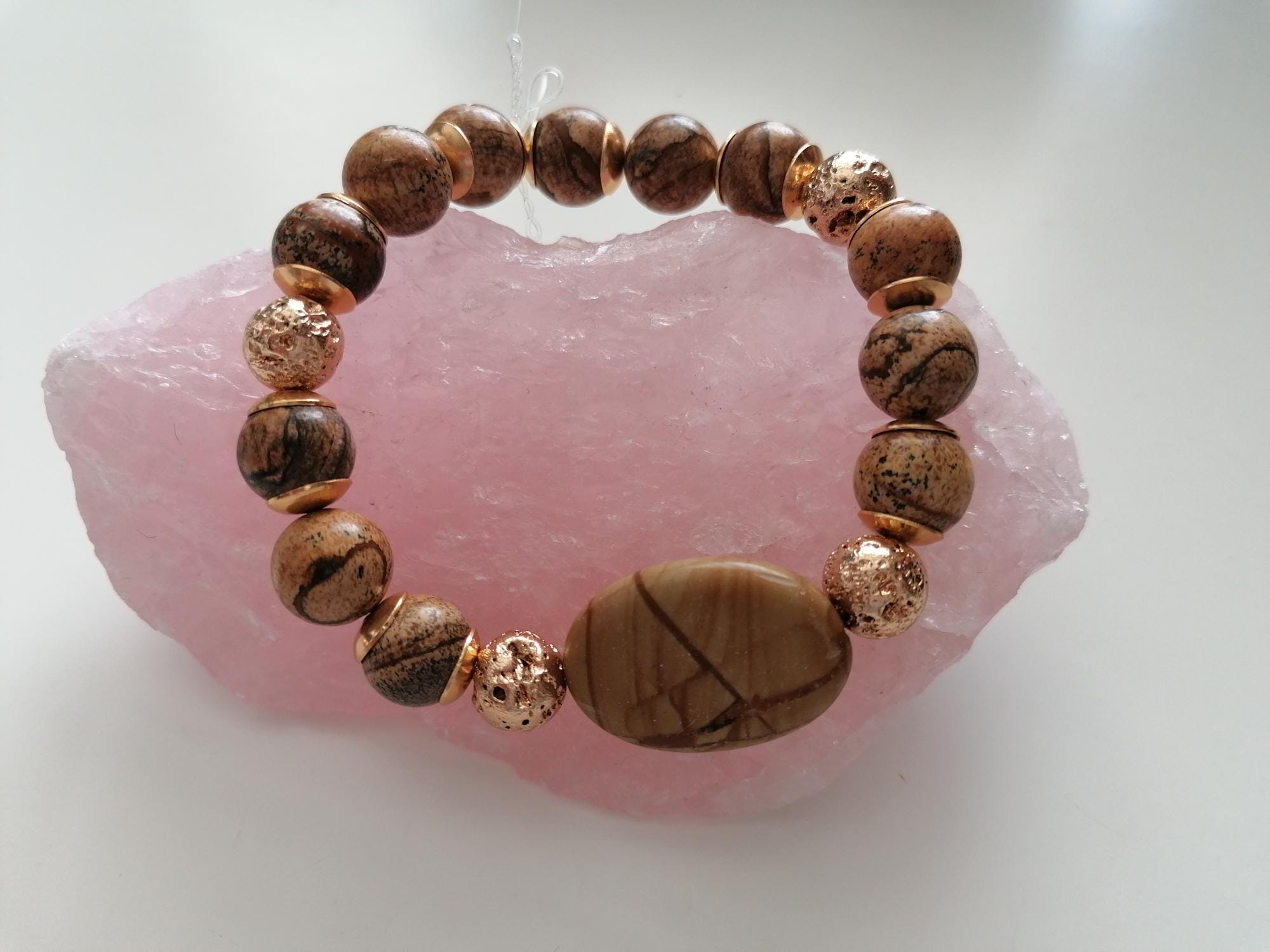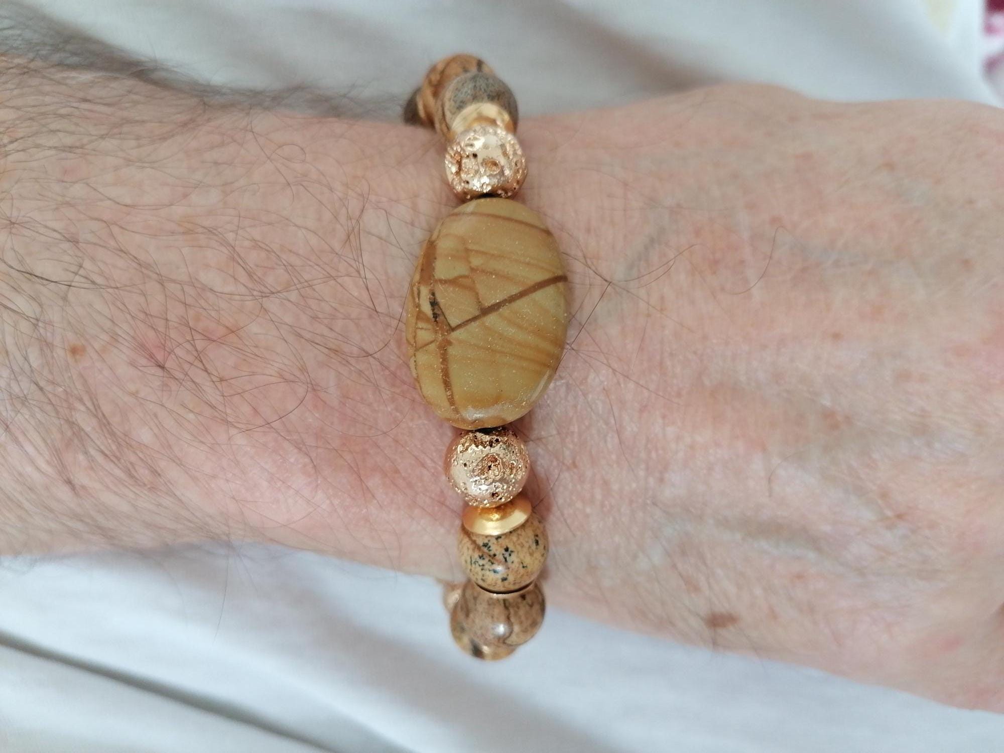 Handmade stretch bracelet made of landscape jasper in shades of brown and gold. Landscape jasper encompasses various shades of brown, from light to dark, and features black stripes, lines, or patterns. This unisex bracelet is crafted from large, round landscape jasper beads (12 mm) and gold-plated lava stone beads (10 mm). The large oval jasper bead measures approximately 30 mm x 20 mm x 7 mm. The metal bead caps are gold-colored.
