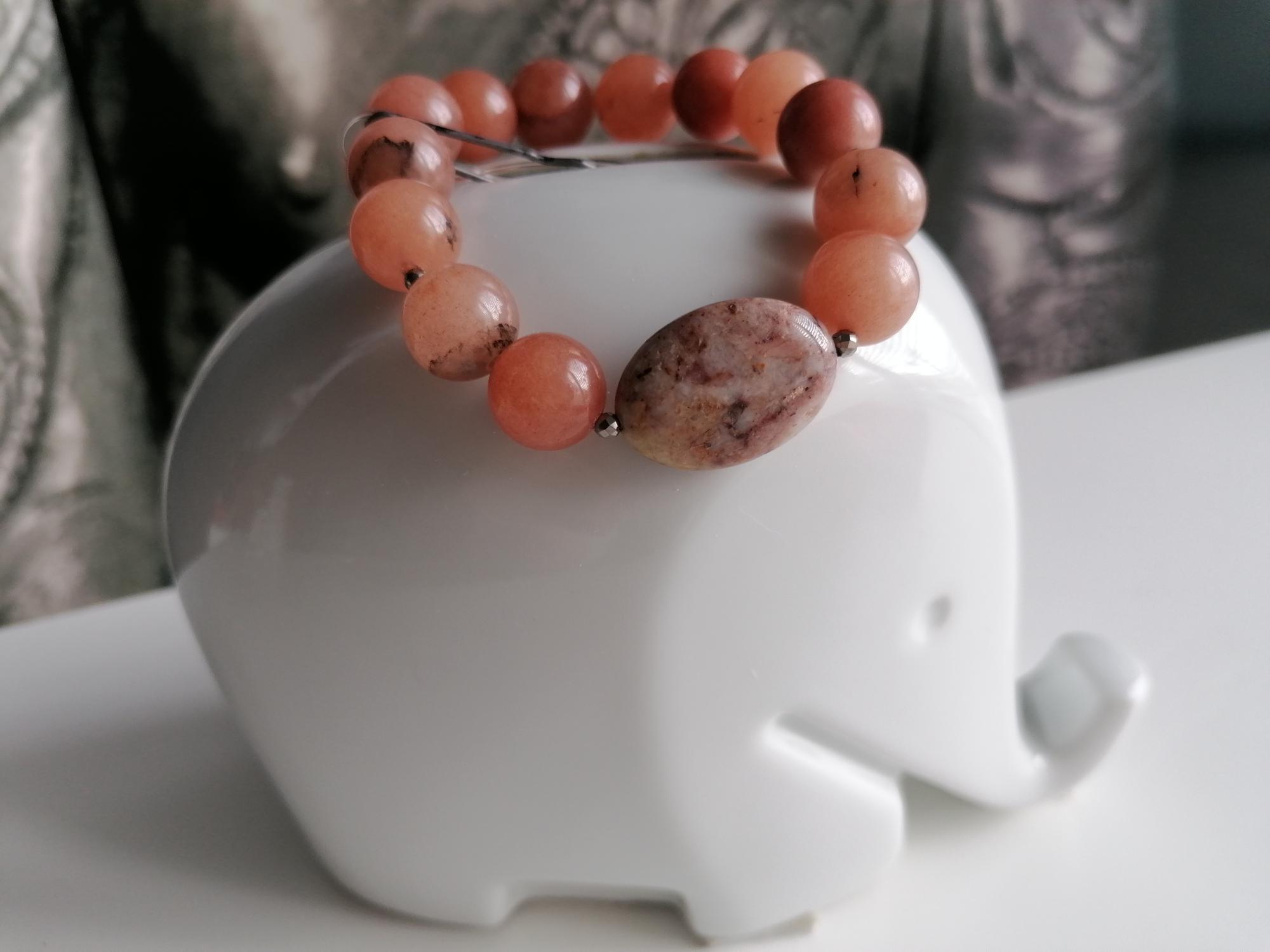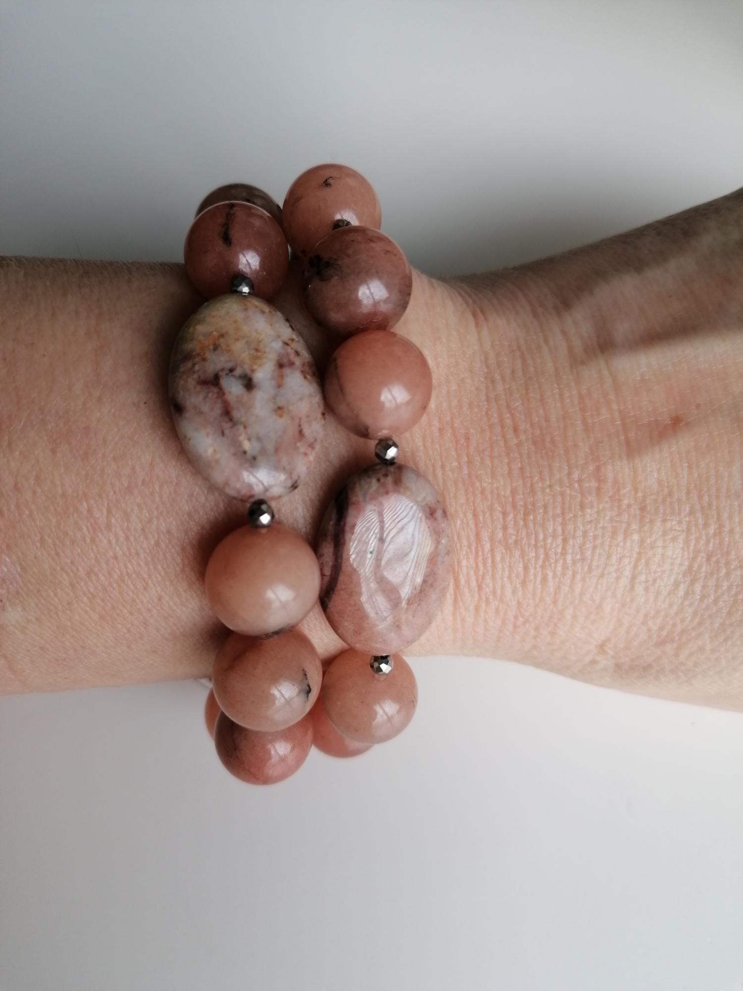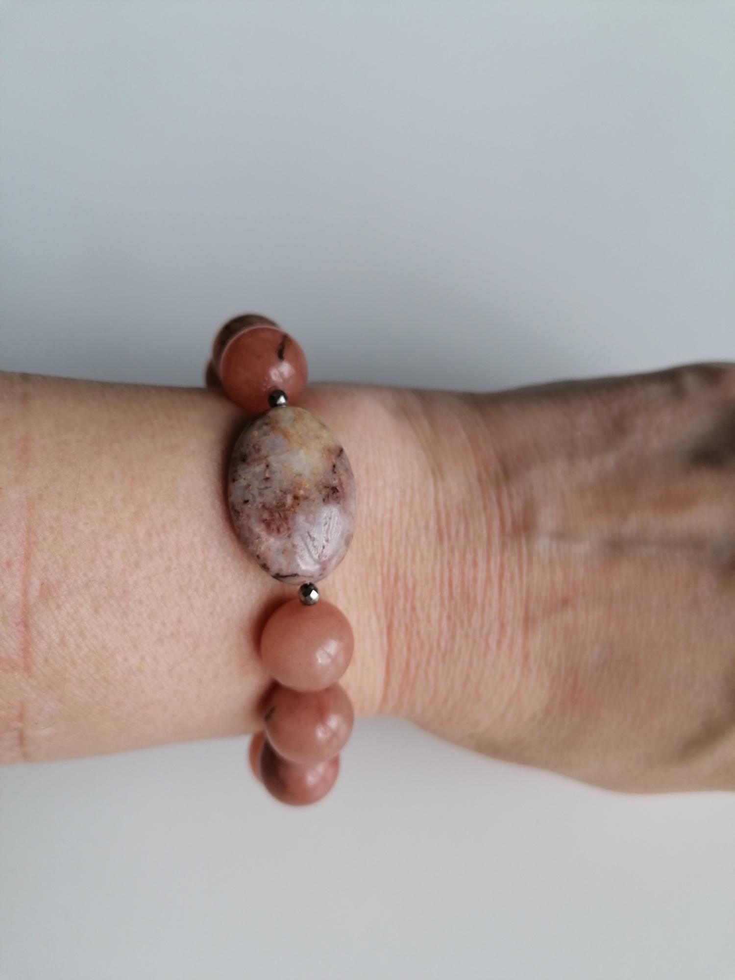Handmade stretch bracelet made of natural agate in a peach color. This statement bracelet is crafted from large round agate beads (14 mm), faceted spinel beads (3 mm), and oval jasper beads (25 mm x 18 mm). Two bracelets are available (see images showing one bracelet or two bracelets).