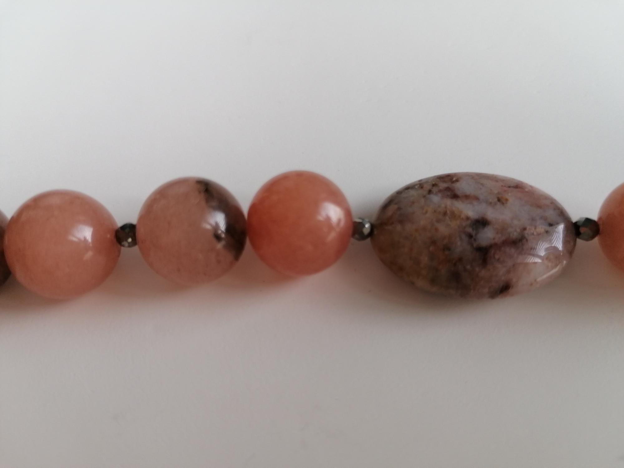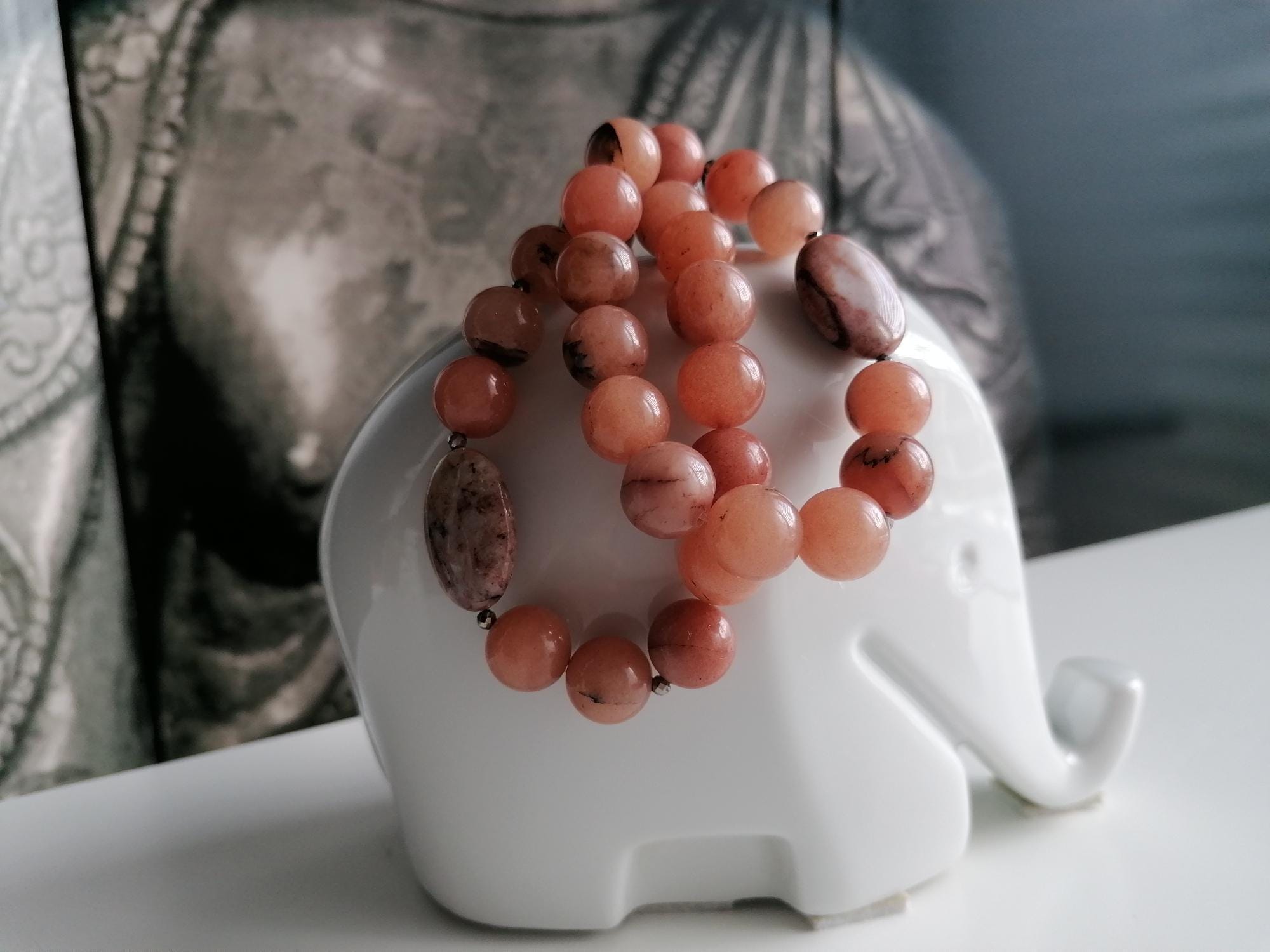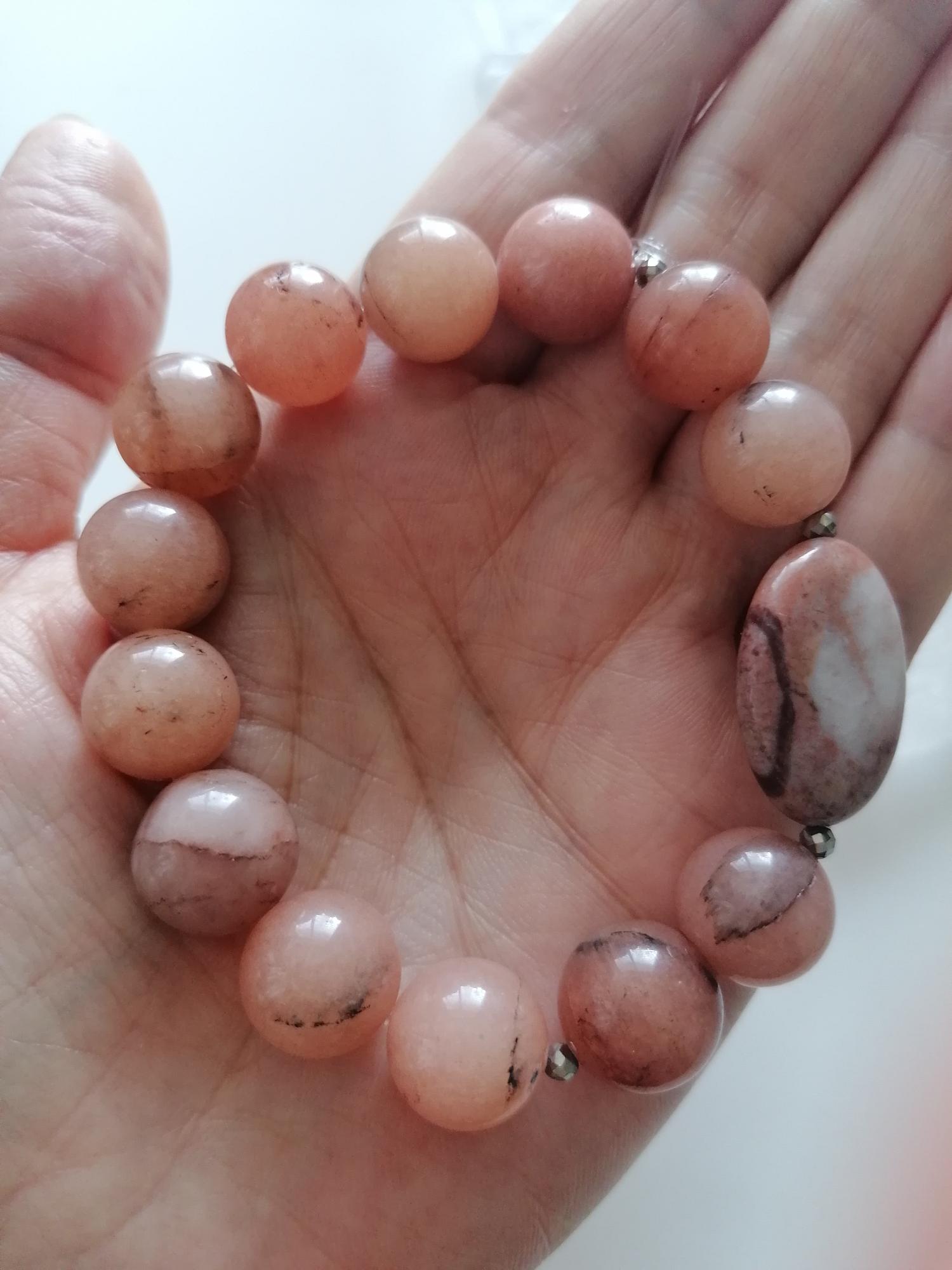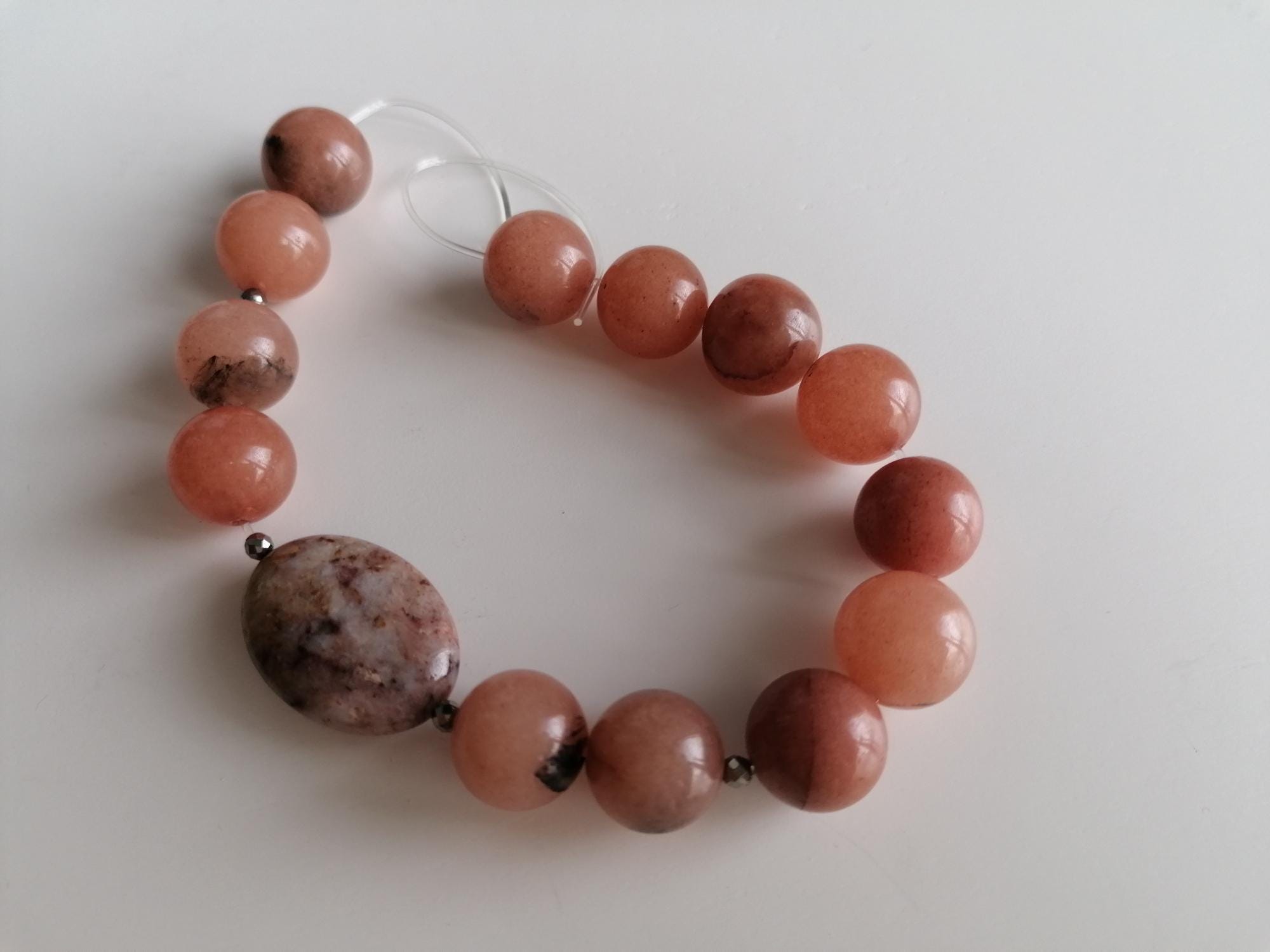 Handmade stretch bracelet made of natural agate in a peach color. This statement bracelet is crafted from large round agate beads (14 mm), faceted spinel beads (3 mm), and oval jasper beads (25 mm x 18 mm). Two bracelets are available (see images showing one bracelet or two bracelets).