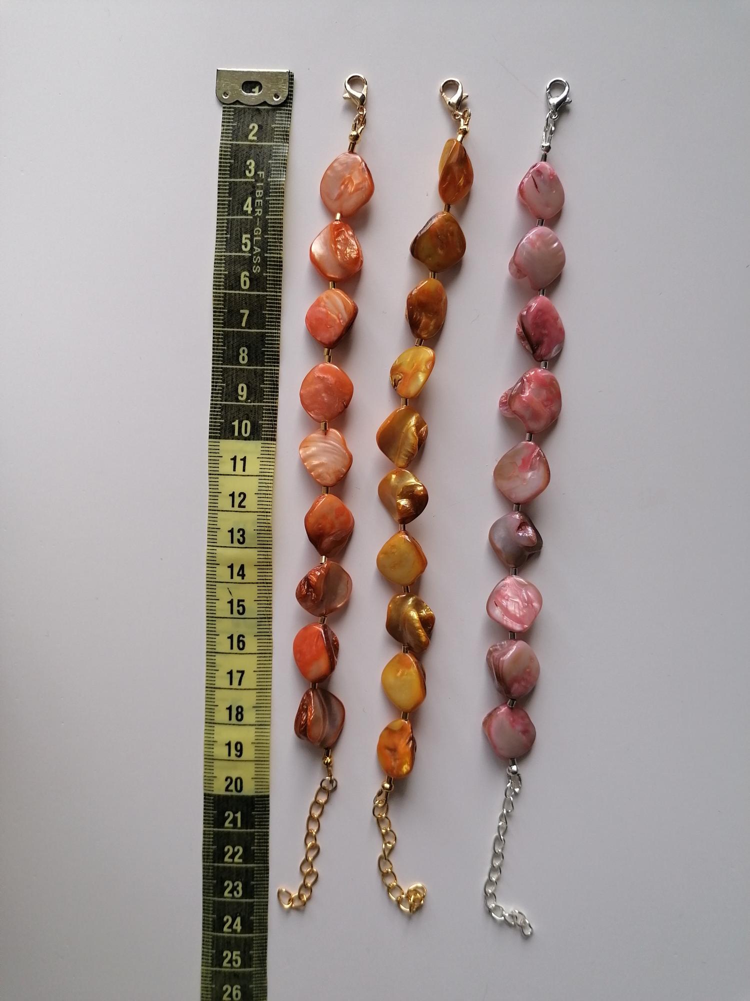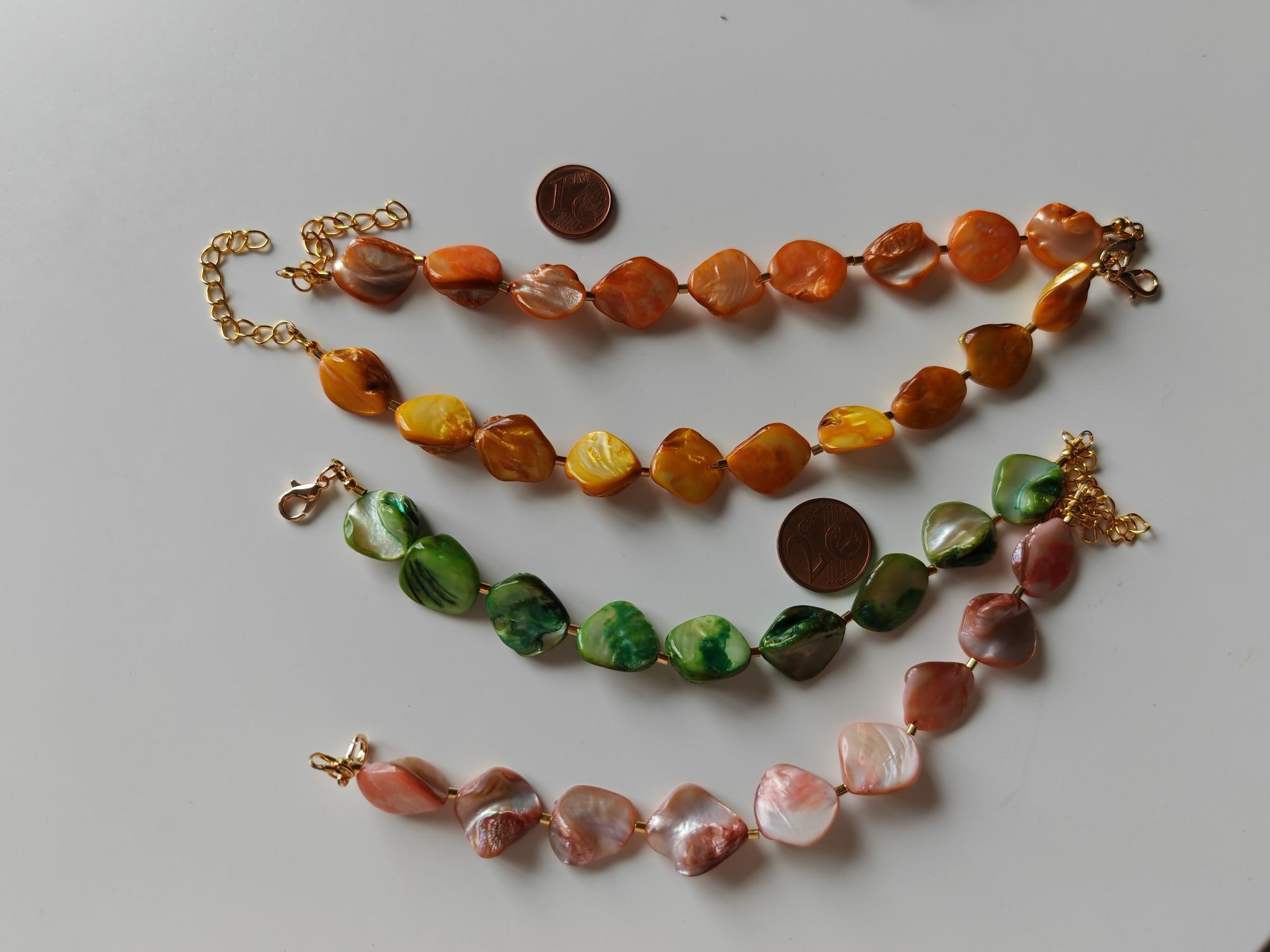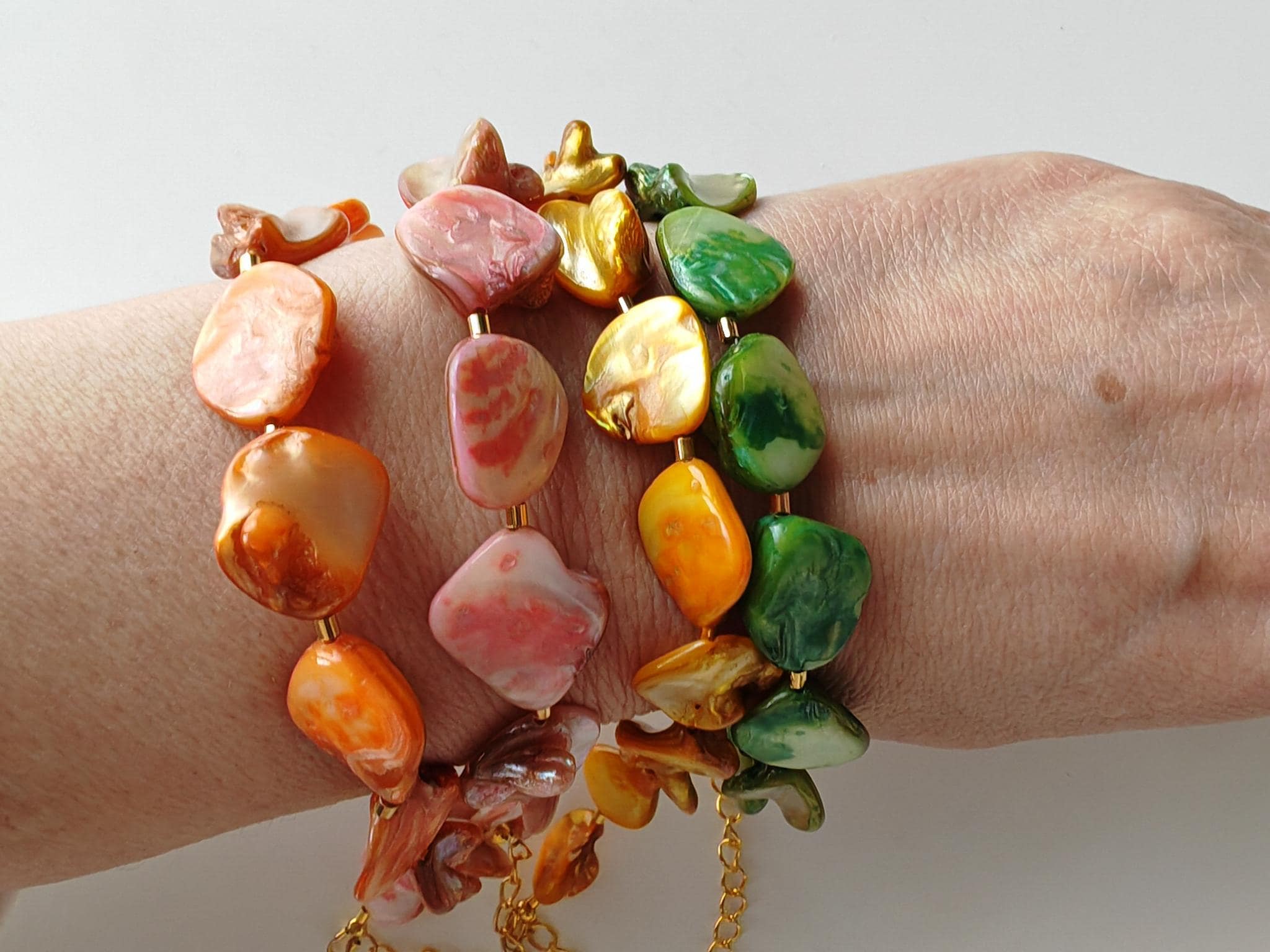 Handmade bracelets made of mother-of-pearl beads. There are four bracelets to choose from: rose/peach, yellow, green, and orange. The mother-of-pearl beads are approximately 10 mm - 14 mm in size (side). The bracelet length is approximately 19 cm plus an extension chain. The chain clasp, metal beads, and the extension chain are gold-plated.