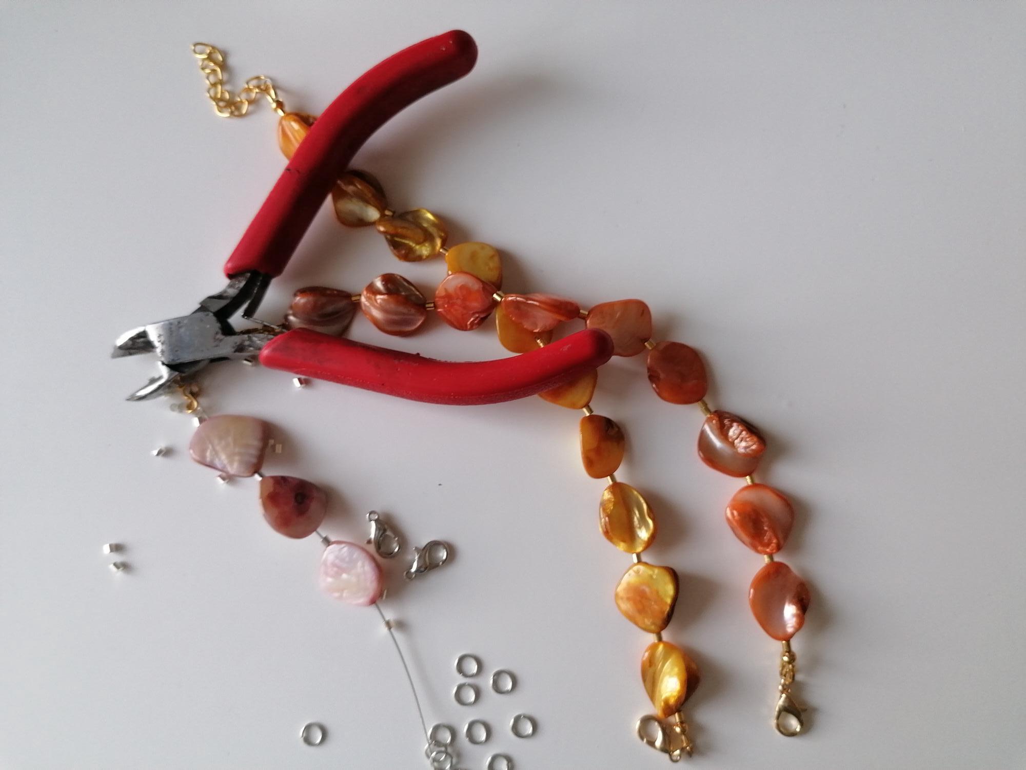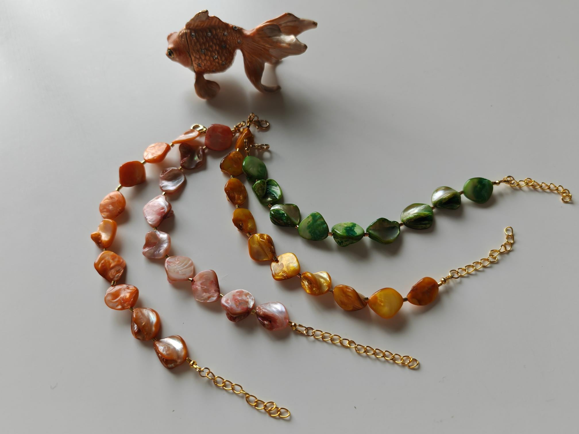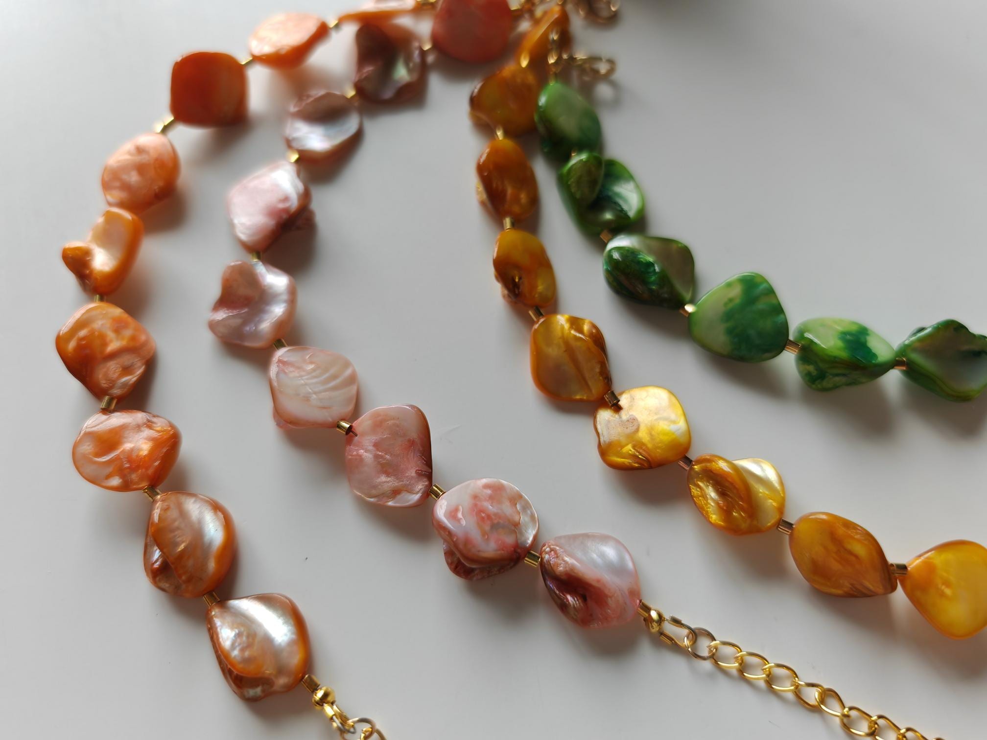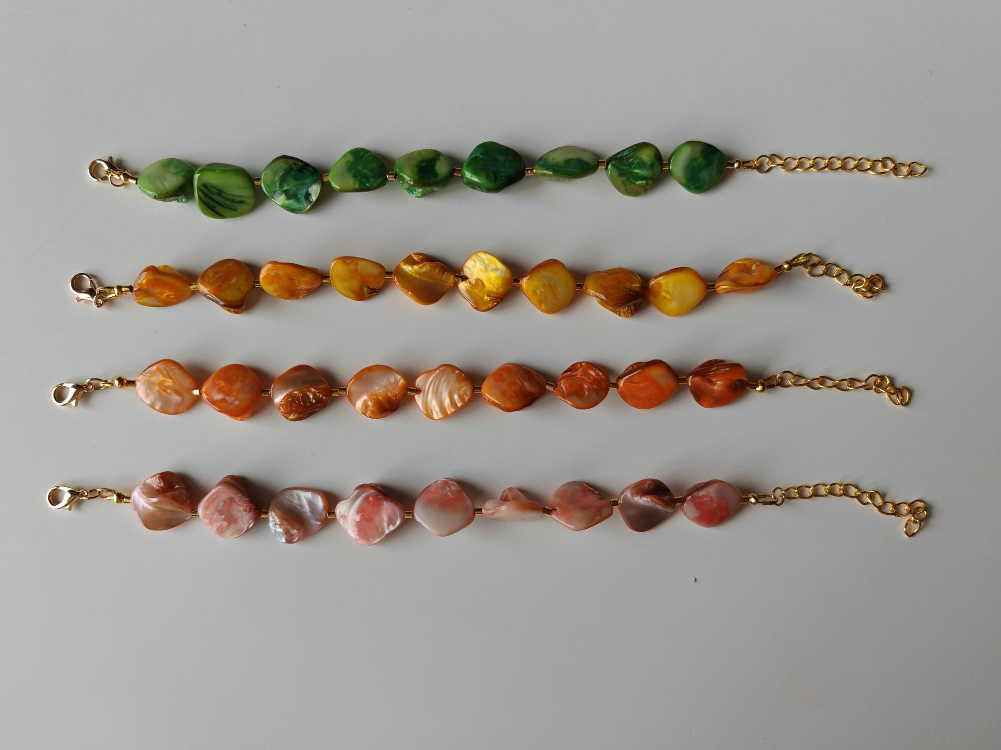 Handmade bracelets made of mother-of-pearl beads. There are four bracelets to choose from: rose/peach, yellow, green, and orange. The mother-of-pearl beads are approximately 10 mm - 14 mm in size (side). The bracelet length is approximately 19 cm plus an extension chain. The chain clasp, metal beads, and the extension chain are gold-plated.