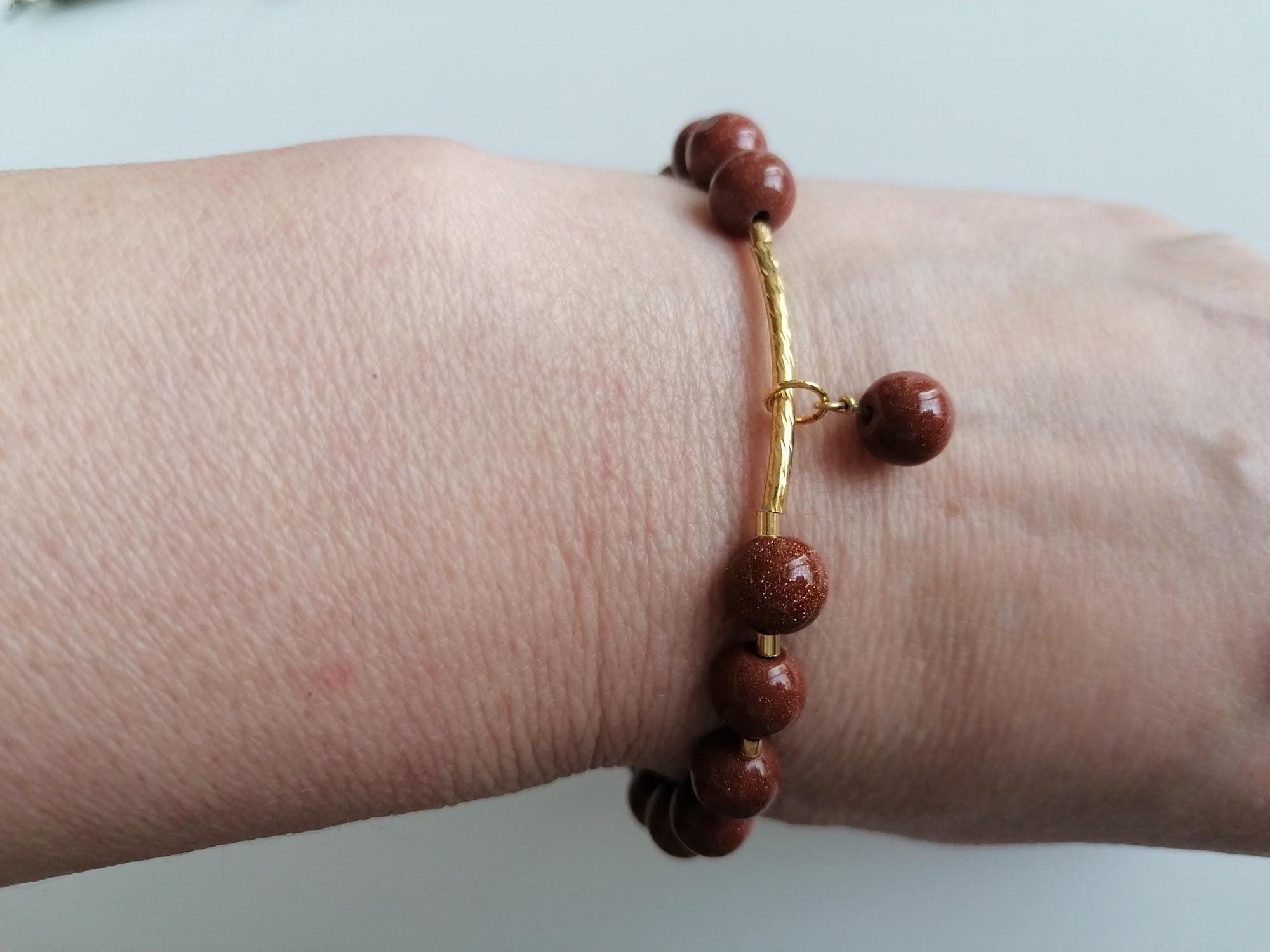6. Goldfluss Armband mit einer runden hängenden Perle (8 mm) in Braun/Gold wurde aus runden Goldfluss Perlen (8 mm) gefertigt. Armband Verschluß, Verlängerungskettchen, Metall Stäbchen und Metall Perlchen sind in Gold.