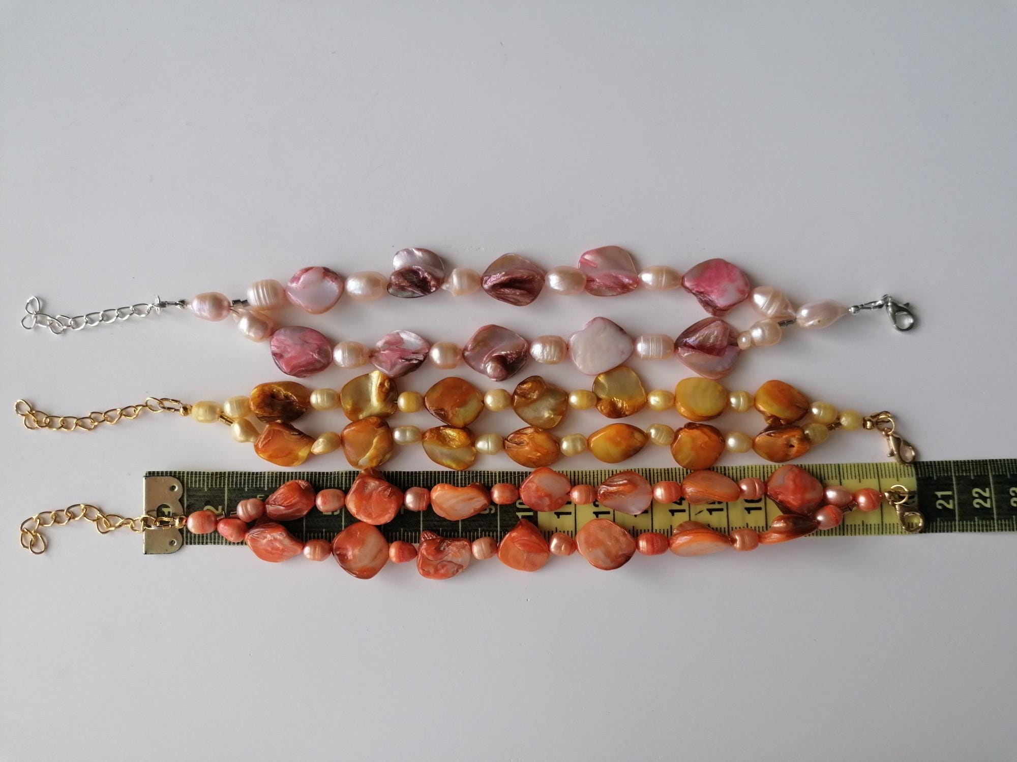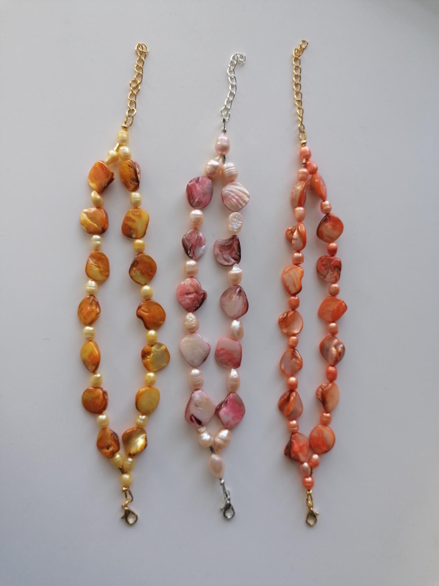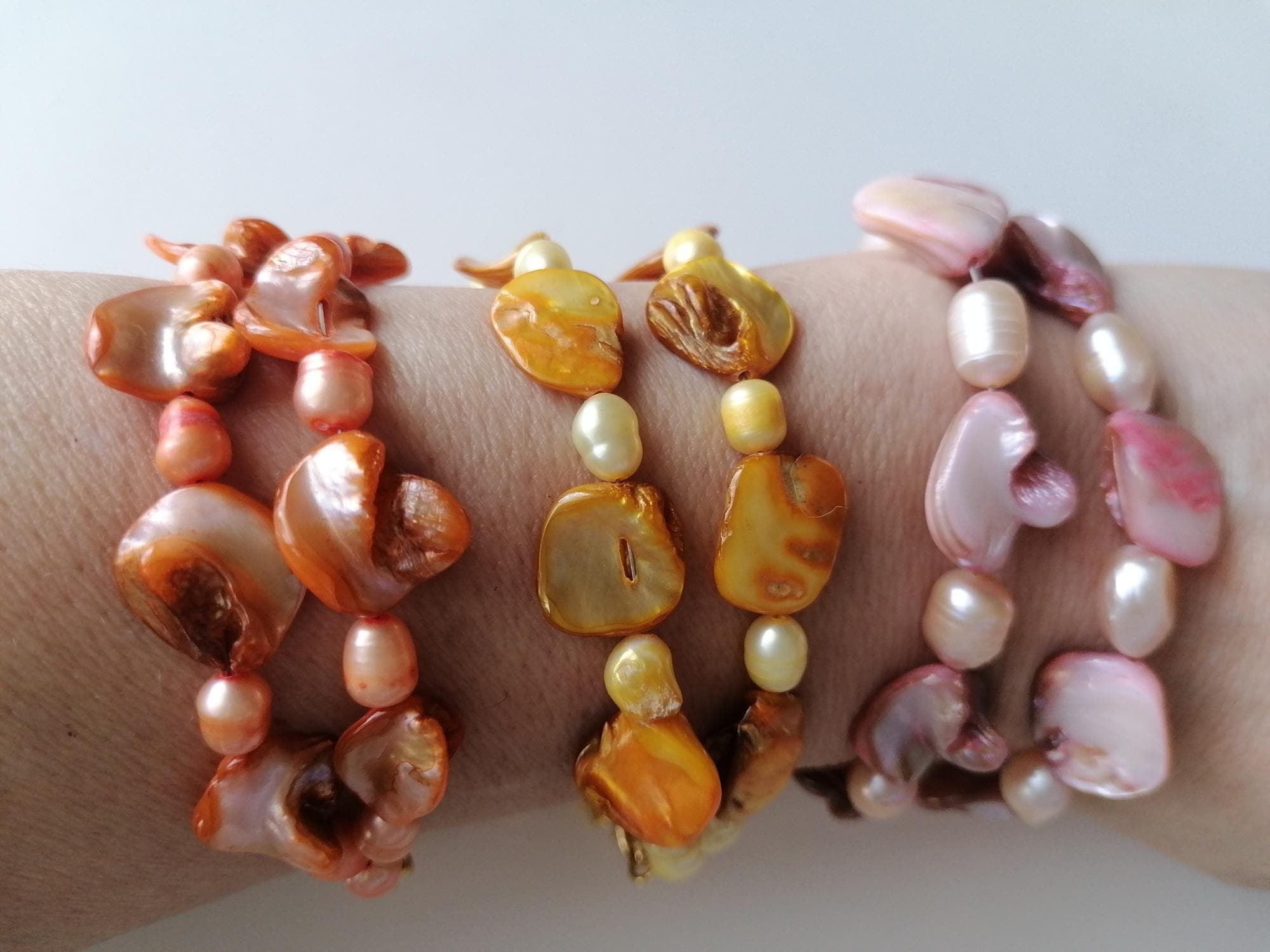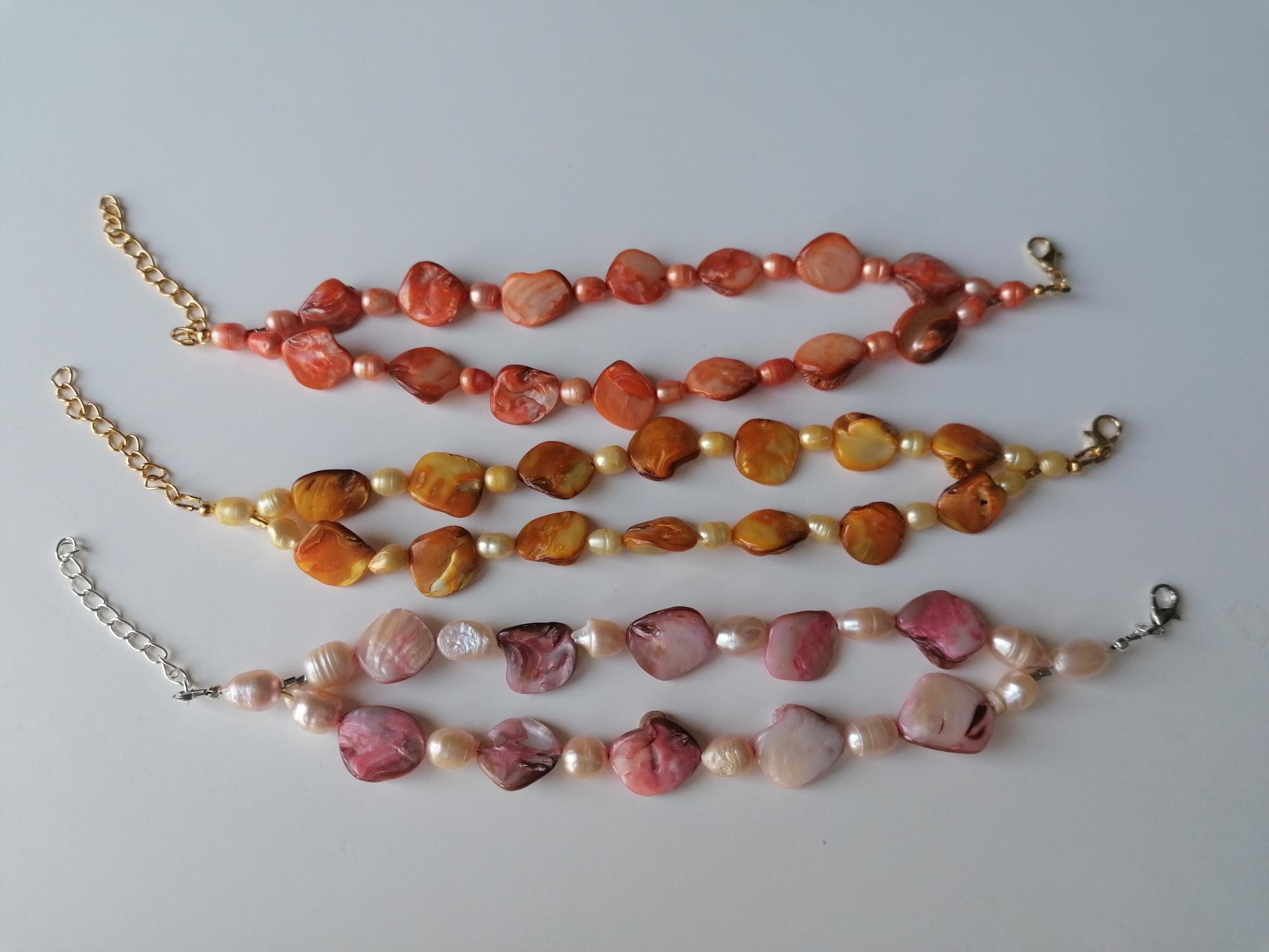 There are 3 bracelets to choose from: in rose/peach, in yellow and in orange. The mother-of-pearl pearls are approx. 10 mm - 14 mm (side), the freshwater pearls in rose are approx. 8 mm - 12 mm, in yellow and orange are approx. 7 mm - 11 mm. The bracelet length is approx. 20 cm plus an extension chain. The chain clasp and the extension chain in the rose version are silver, in the yellow and orange versions they are gold.