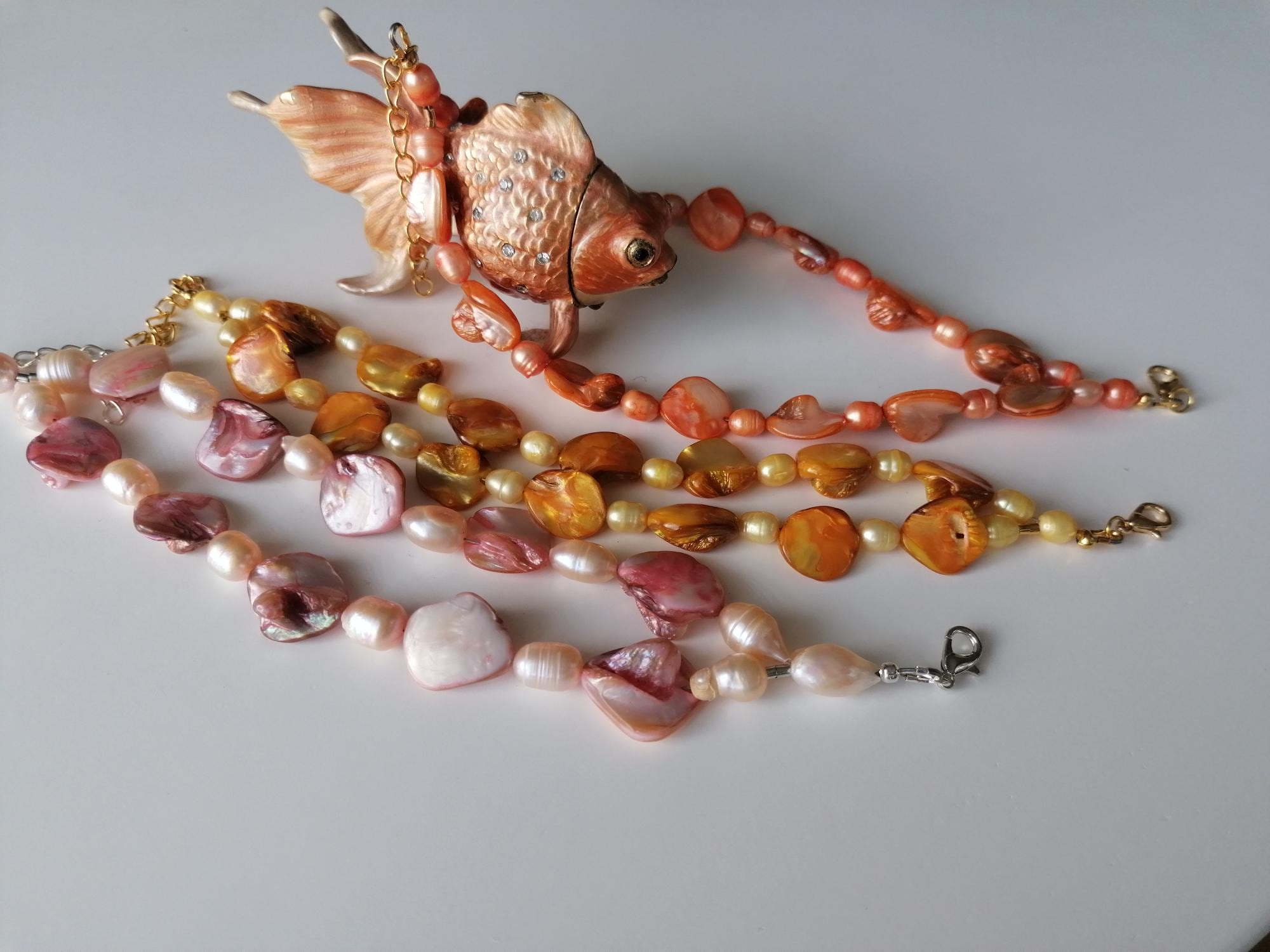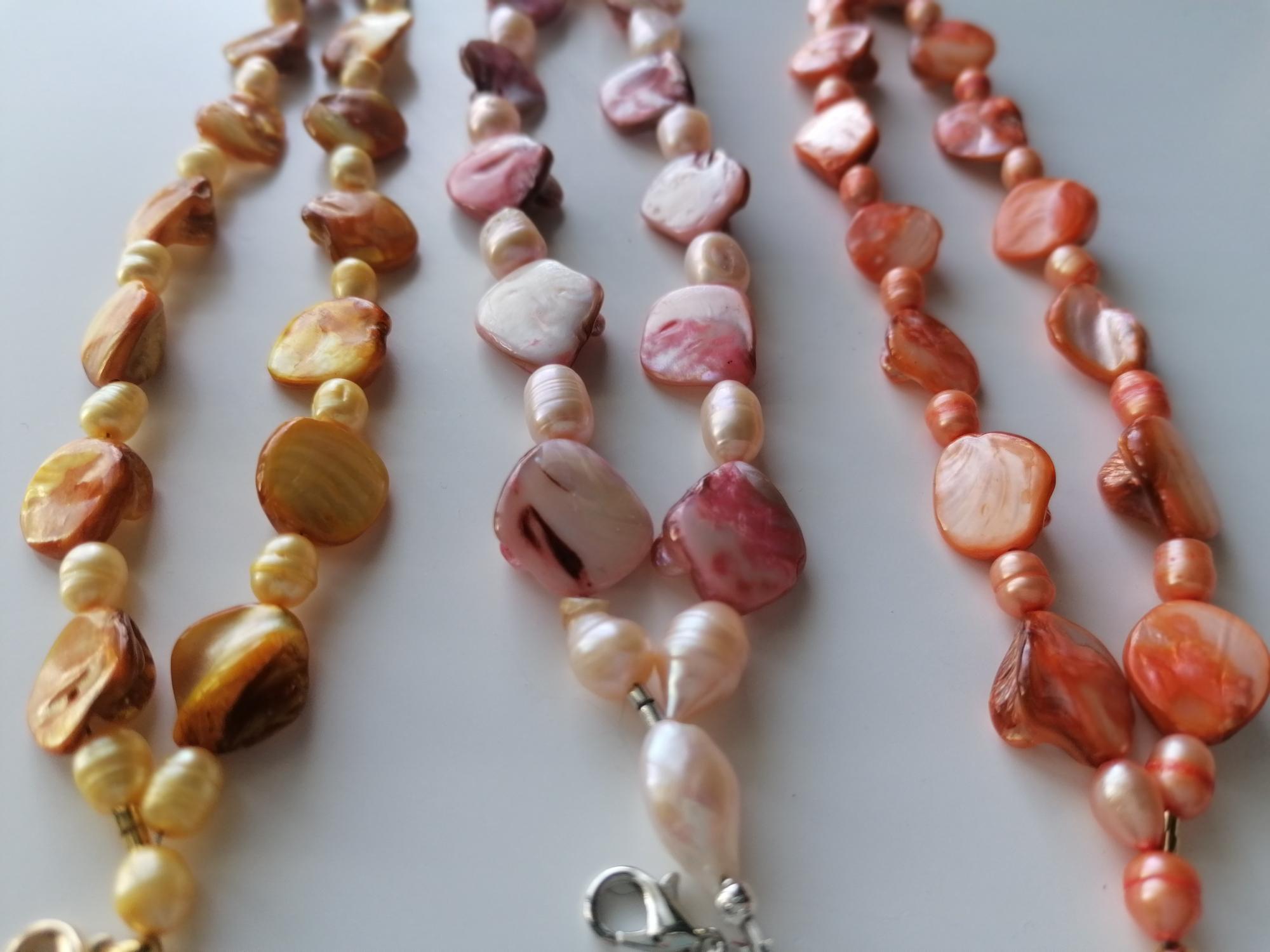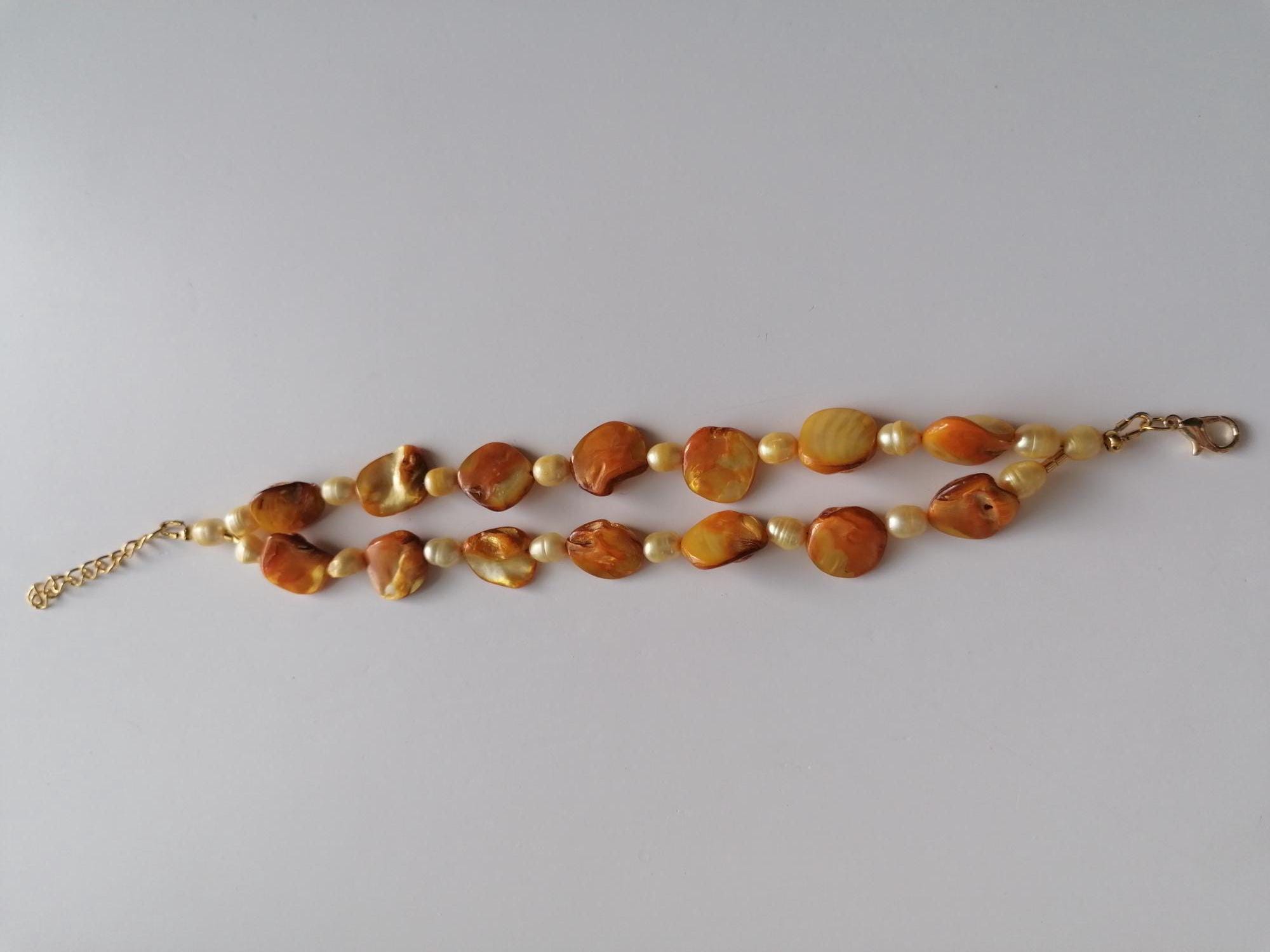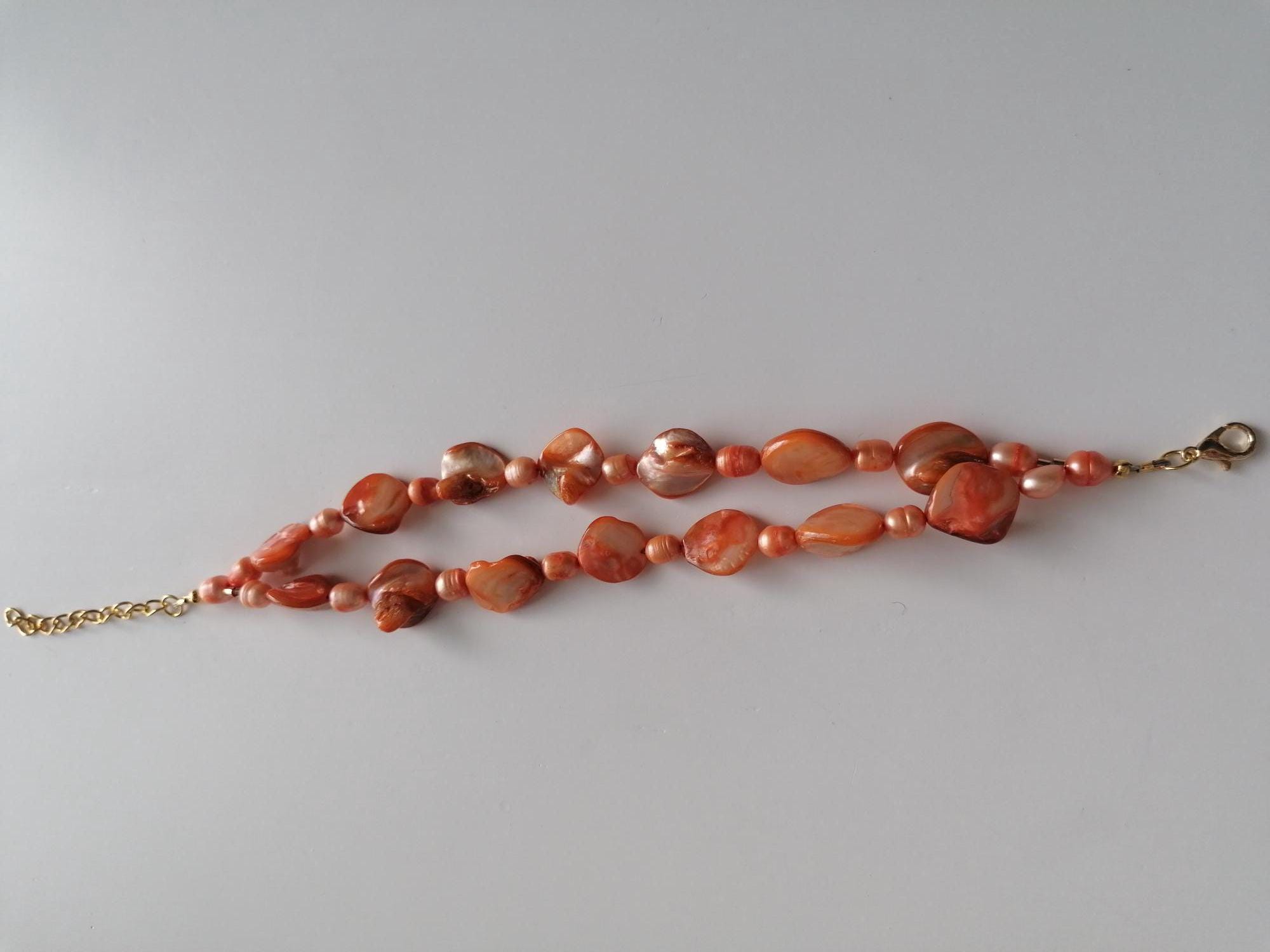 There are 3 bracelets to choose from: in rose/peach, in yellow and in orange. The mother-of-pearl pearls are approx. 10 mm - 14 mm (side), the freshwater pearls in rose are approx. 8 mm - 12 mm, in yellow and orange are approx. 7 mm - 11 mm. The bracelet length is approx. 20 cm plus an extension chain. The chain clasp and the extension chain in the rose version are silver, in the yellow and orange versions they are gold.