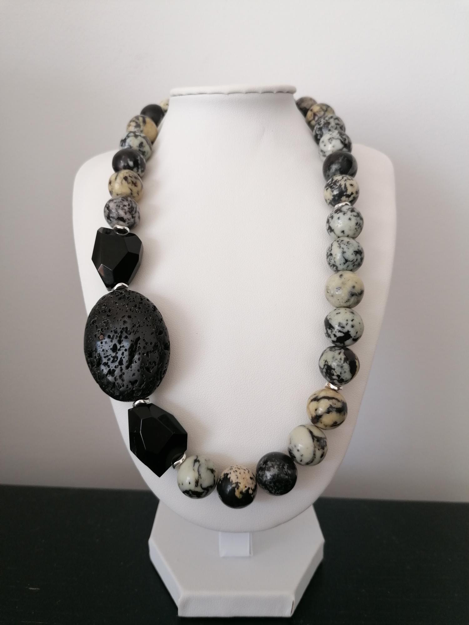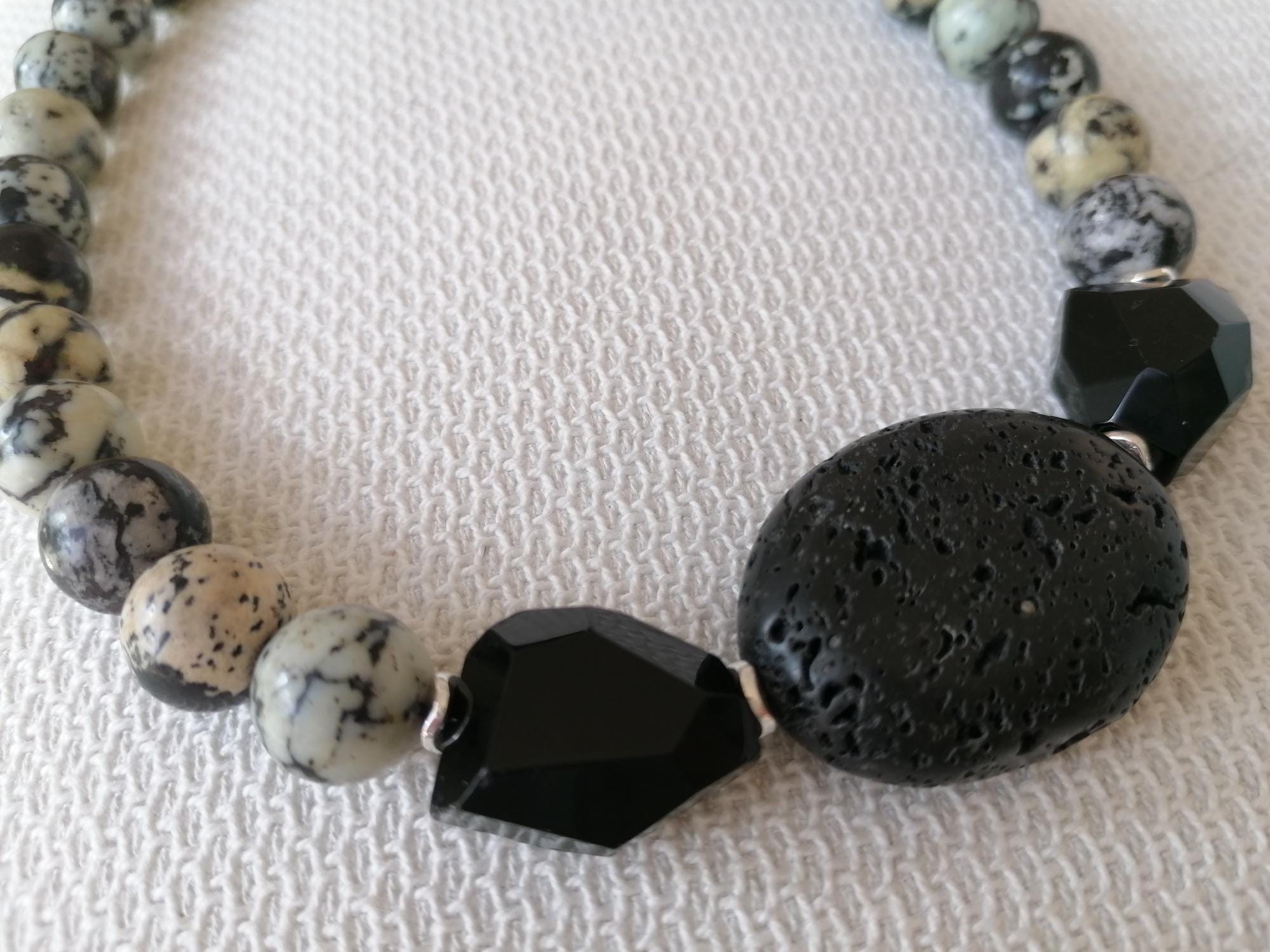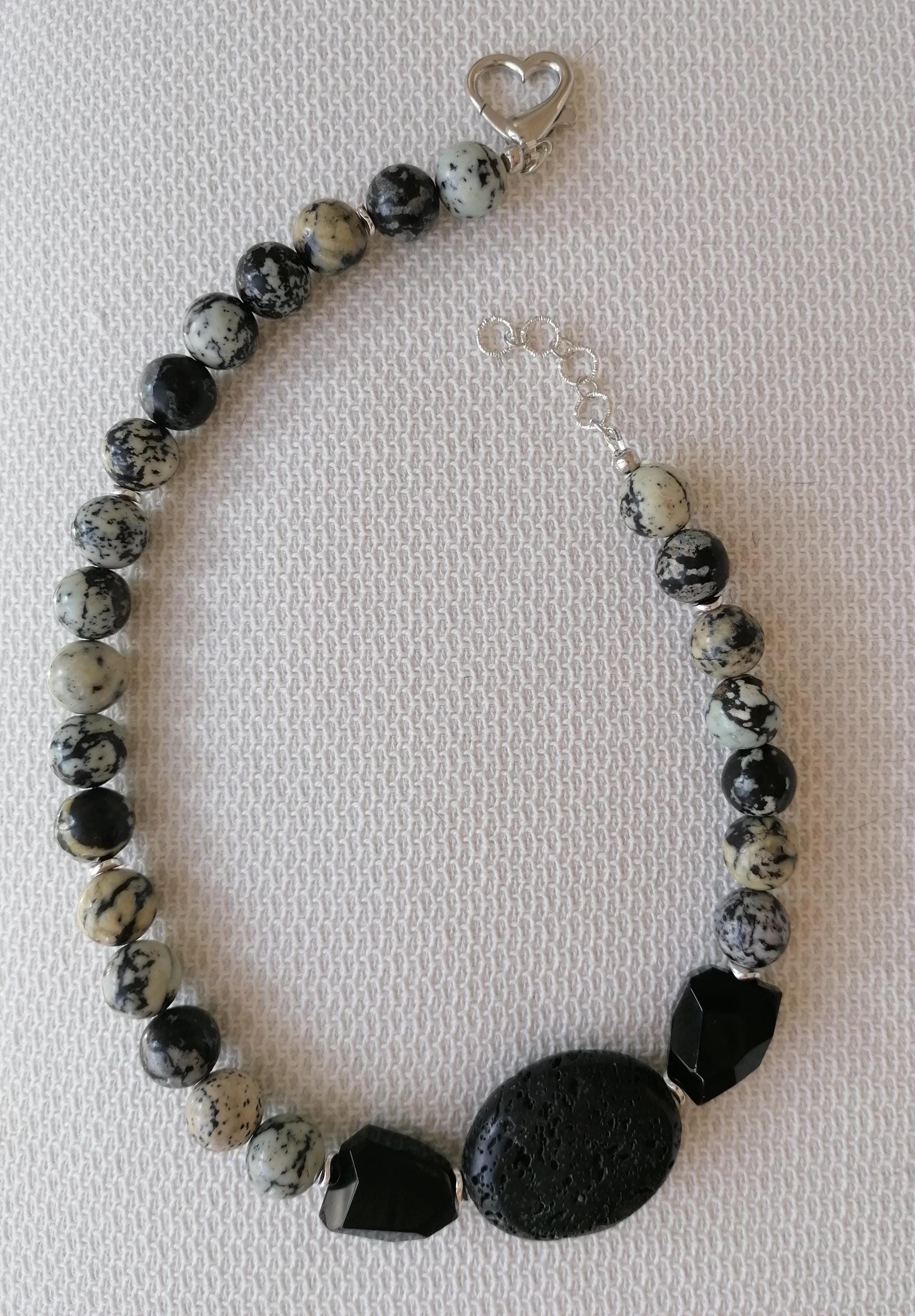 The agate necklace in grey/light blue/black was made from round agate beads (approx. 14 mm). The chain length is approx. 47.5 cm plus an extension chain. The heart chain clasp and the extension chain are silver in color. The oval lava stone bead is 40 mm x 31 mm x 15 mm. The faceted onyx beads are approx. 25 mm x 20 mm x 13 mm. The hematite beads (curved discs) in silver are 6 mm.