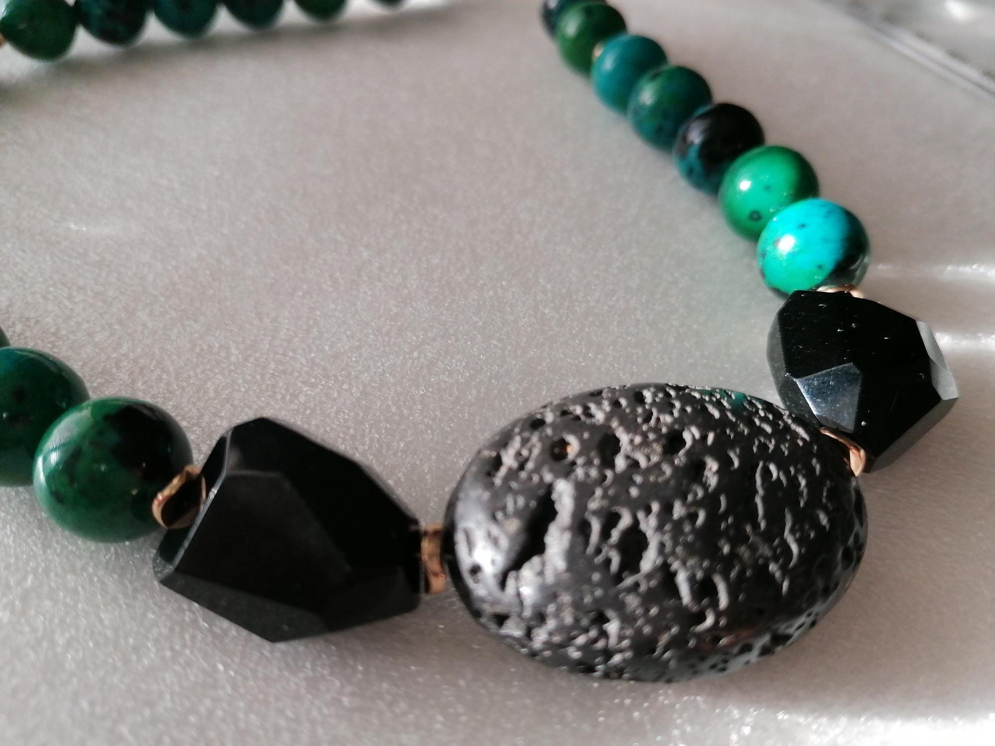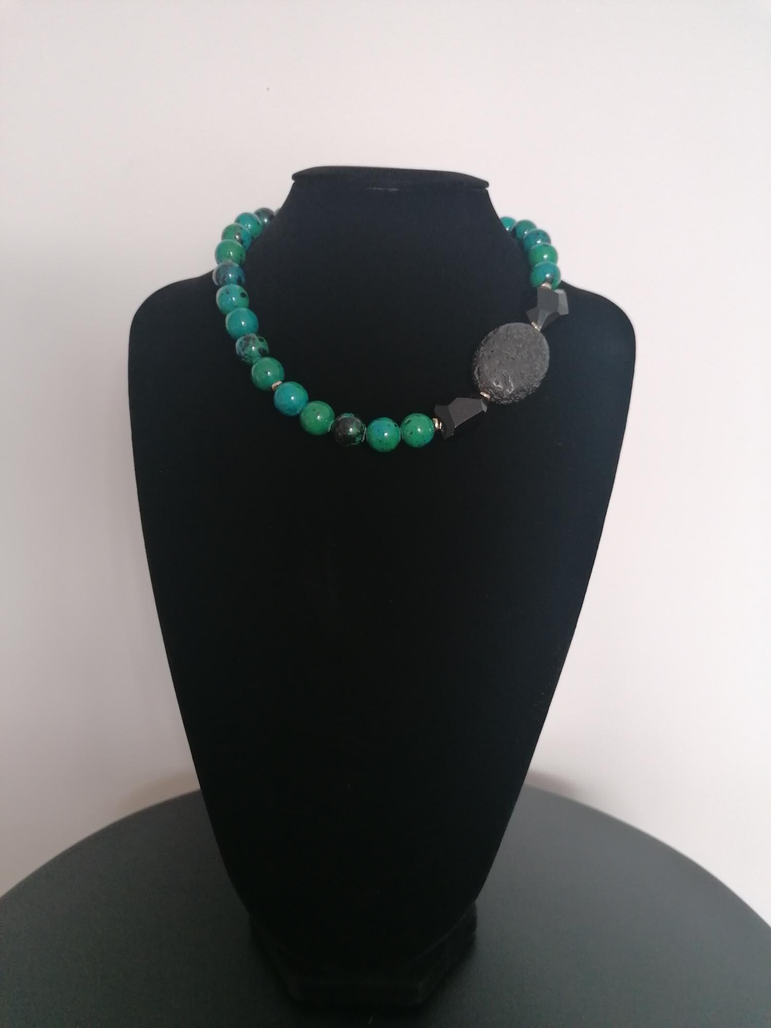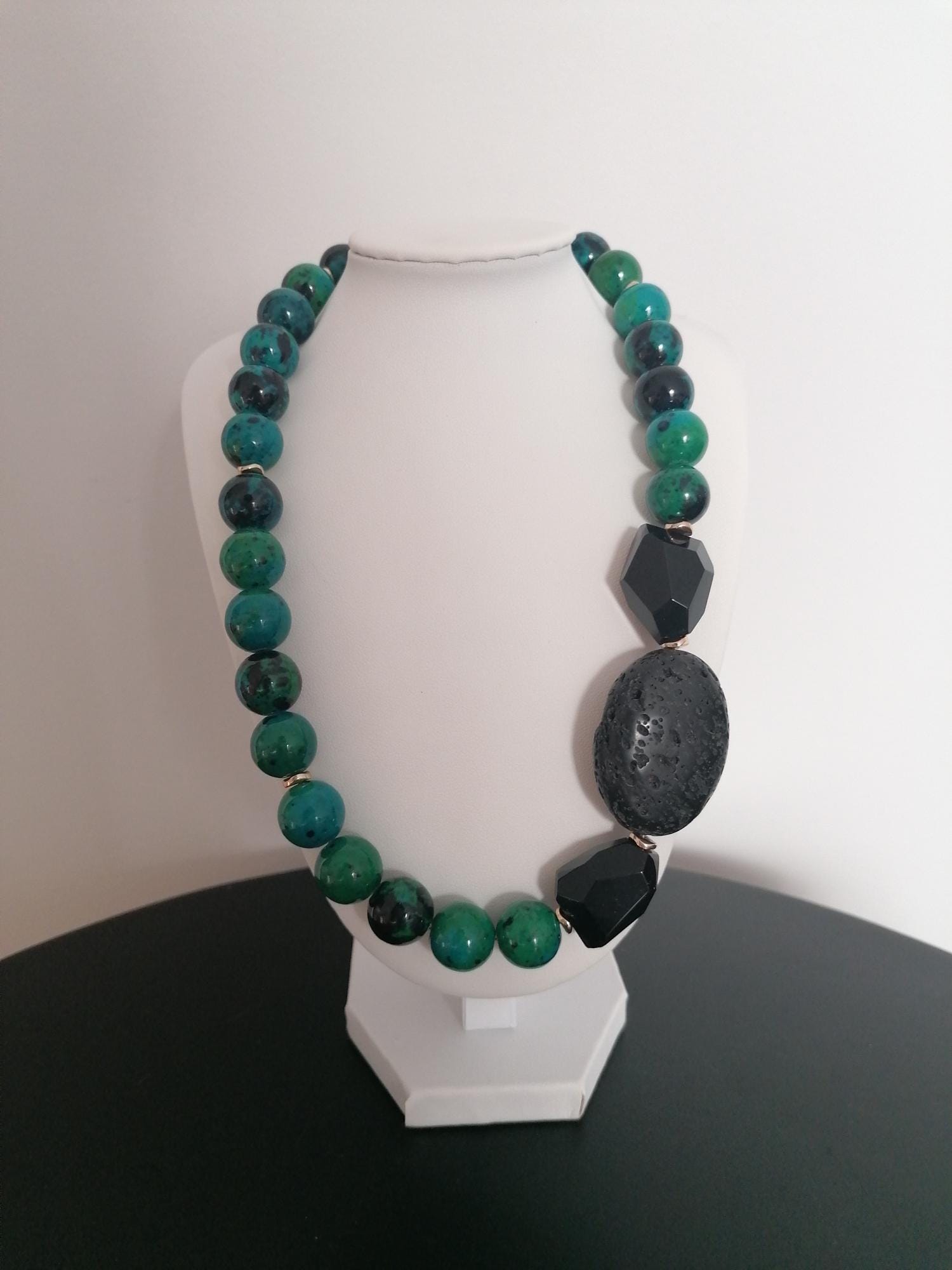 The chrysocolla necklace in blue/green/black was made from round chrysocolla beads (approx. 14 mm). The chain length is approx. 49 cm plus an extension chain. The heart chain clasp and the extension chain are gold in color. The oval lava stone bead is 40 mm x 31 mm x 15 mm. The faceted onyx beads are approx. 25 mm x 20 mm x 13 mm. The golden hematite beads (curved discs) are 6 mm.