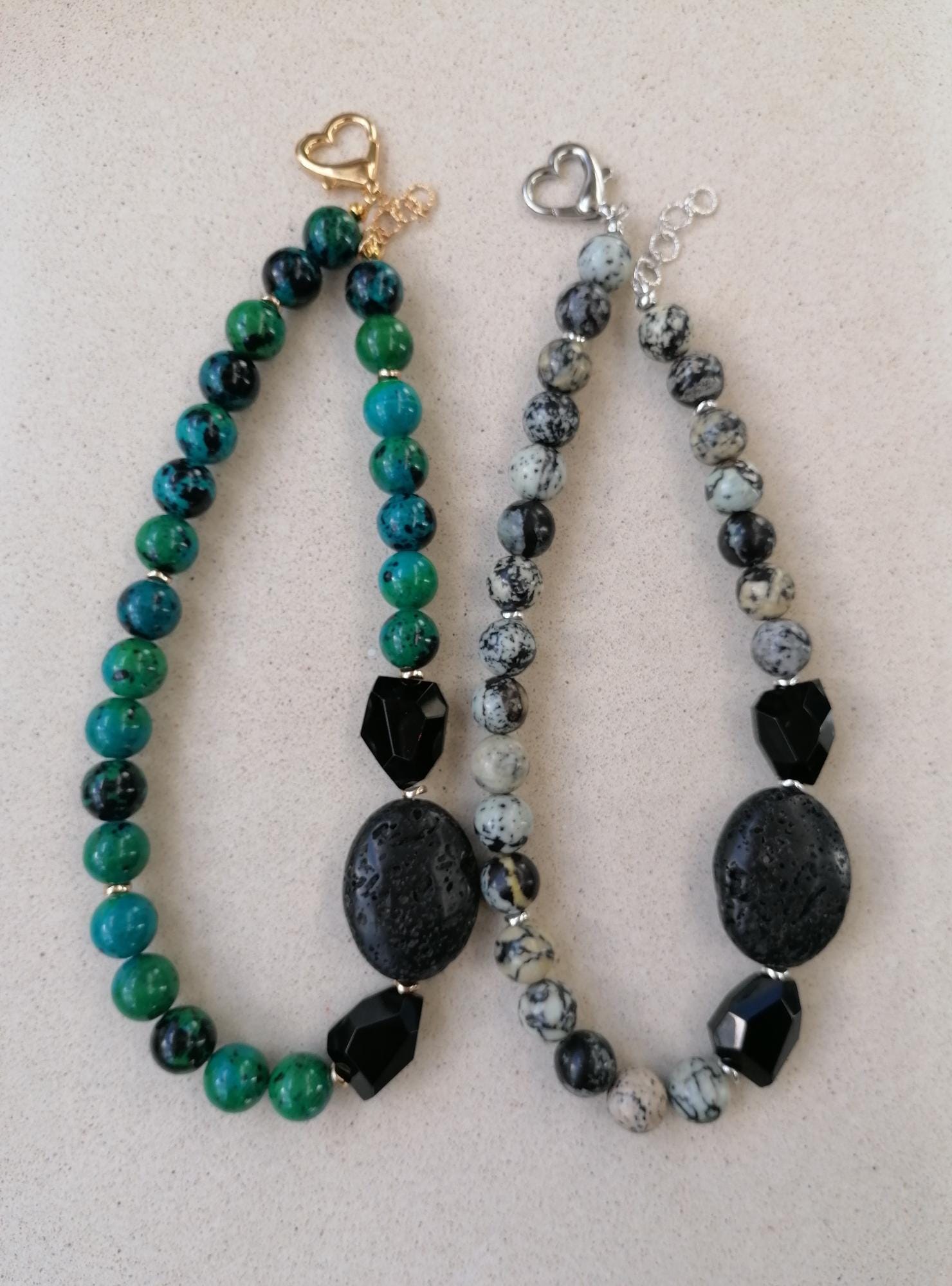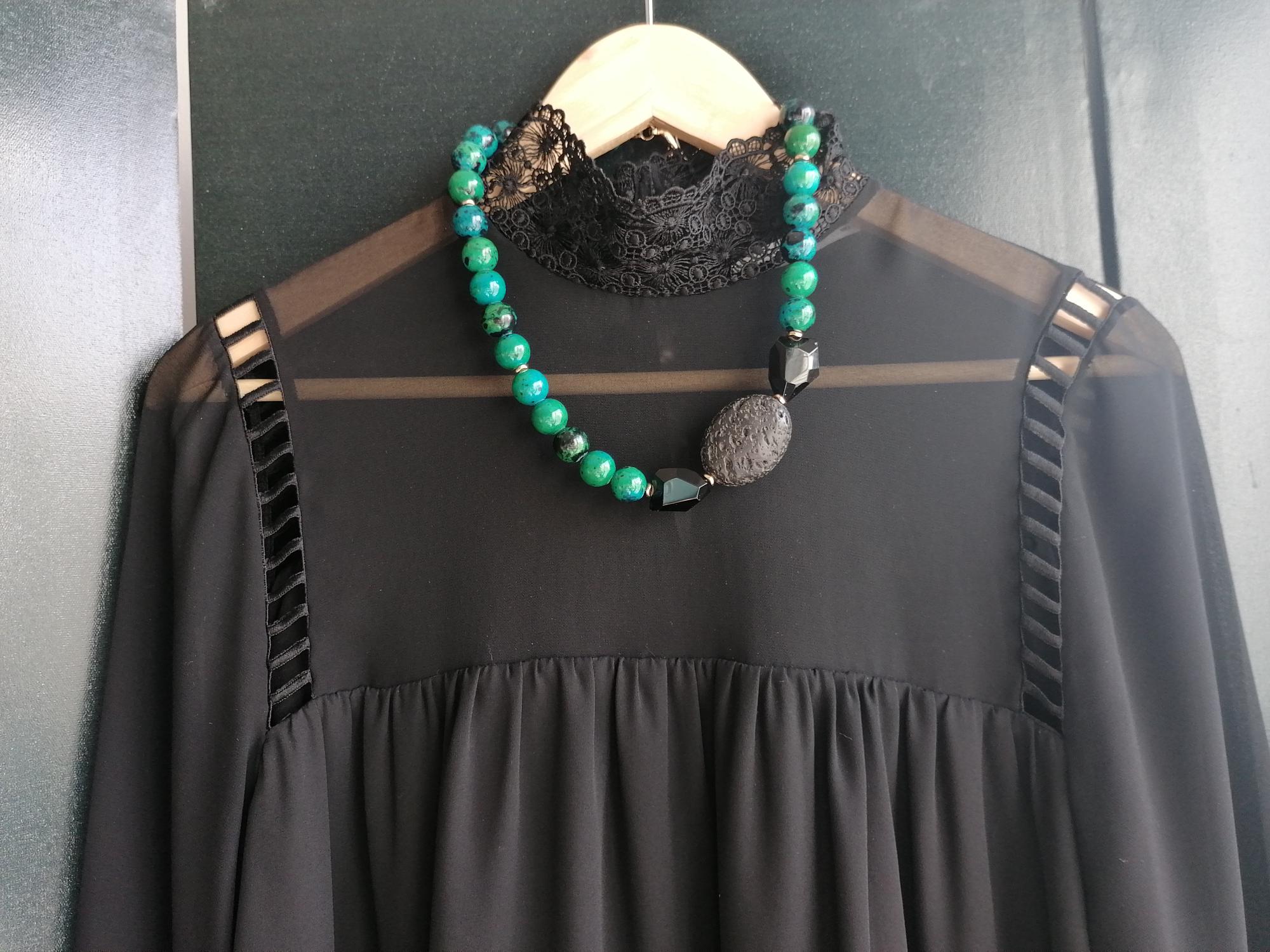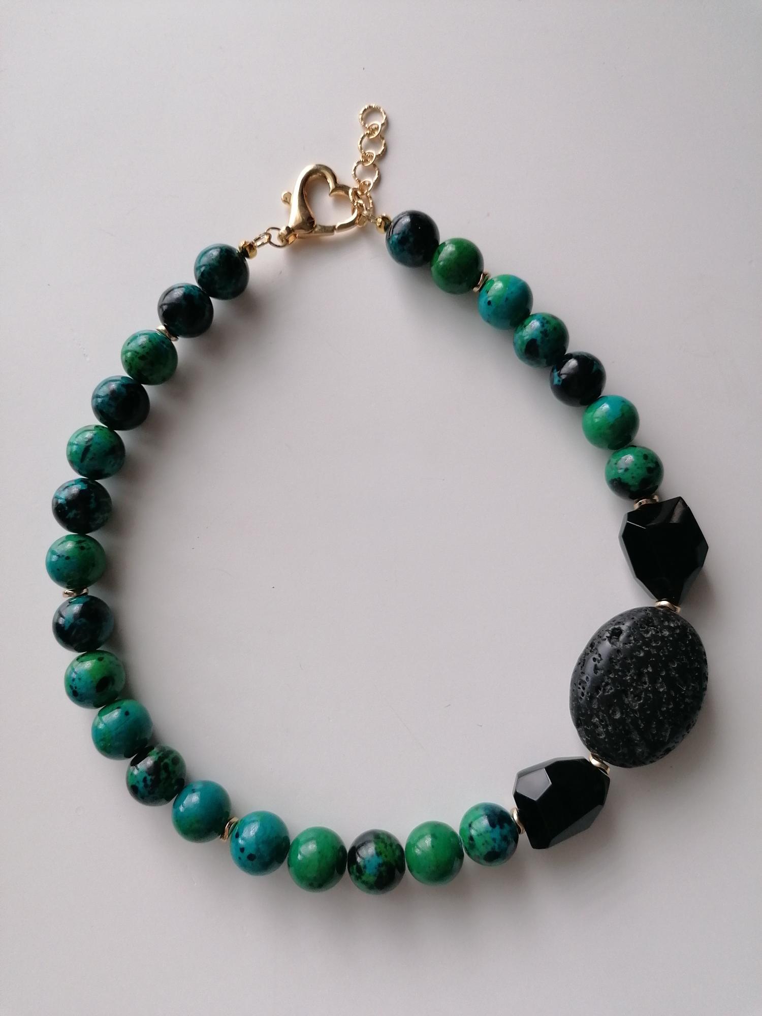 The chrysocolla necklace in blue/green/black was made from round chrysocolla beads (approx. 14 mm). The chain length is approx. 49 cm plus an extension chain. The heart chain clasp and the extension chain are gold in color. The oval lava stone bead is 40 mm x 31 mm x 15 mm. The faceted onyx beads are approx. 25 mm x 20 mm x 13 mm. The golden hematite beads (curved discs) are 6 mm.