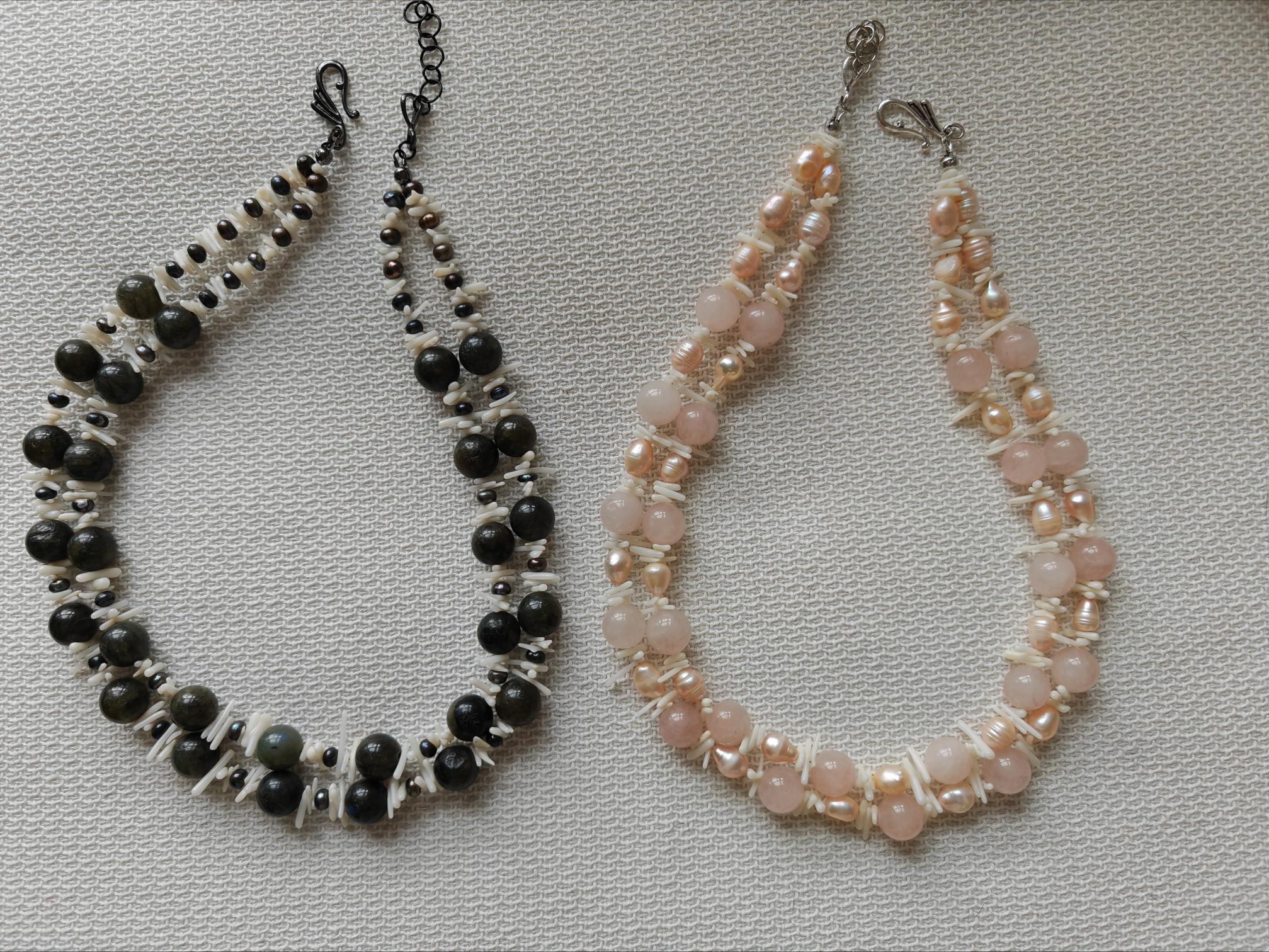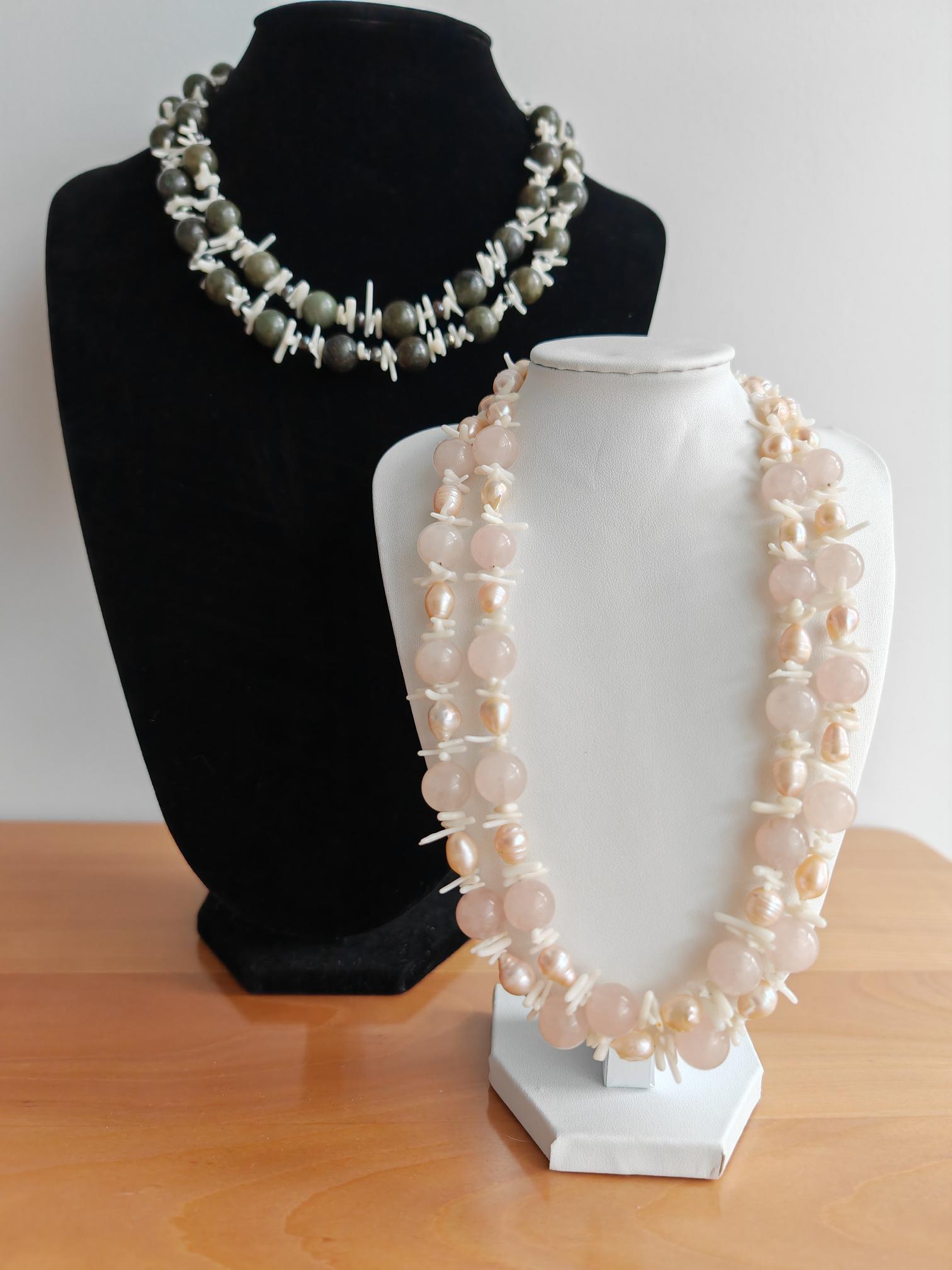 Handmade gemstone necklaces with coral and freshwater pearls. Two necklaces are available.