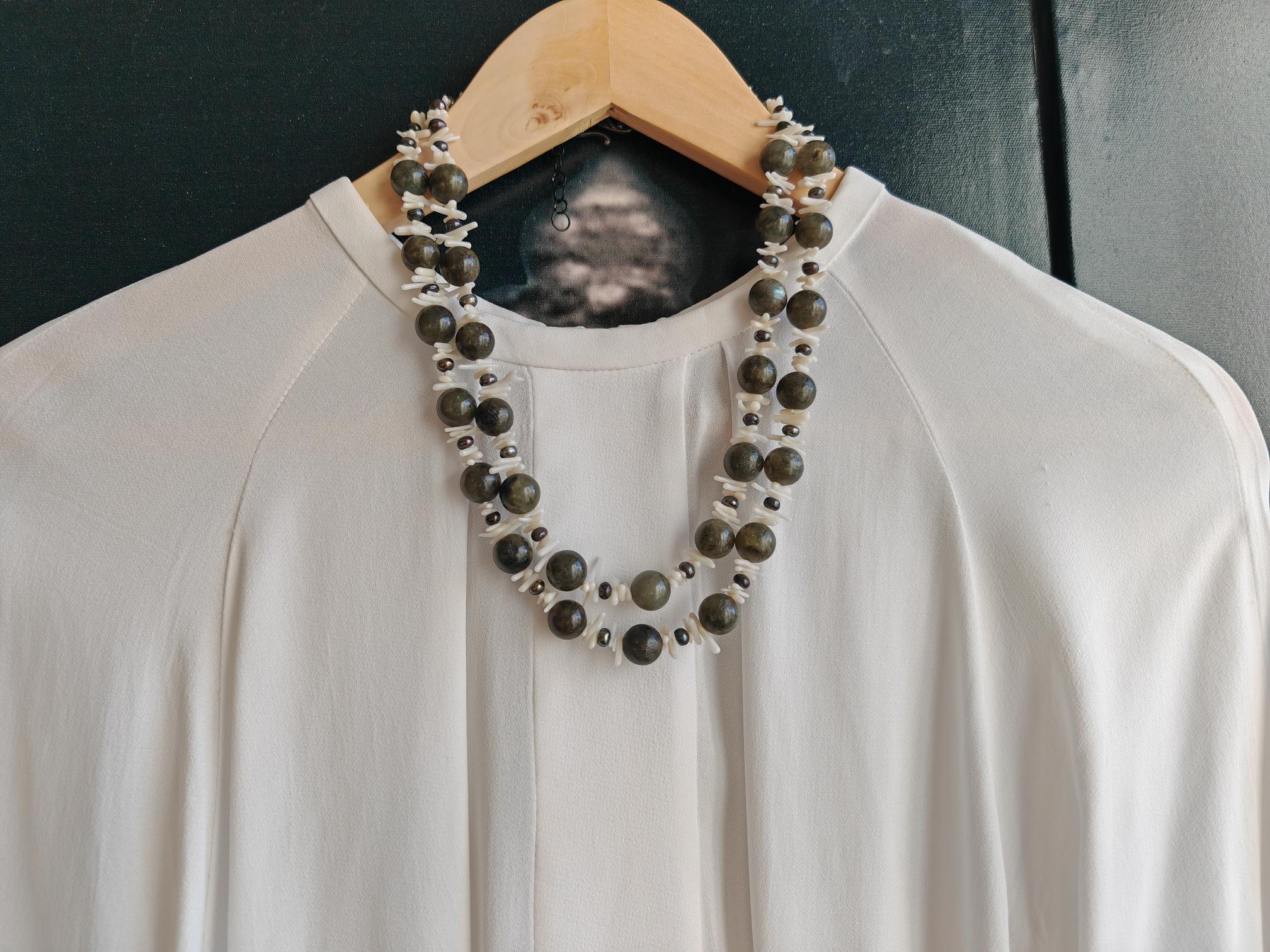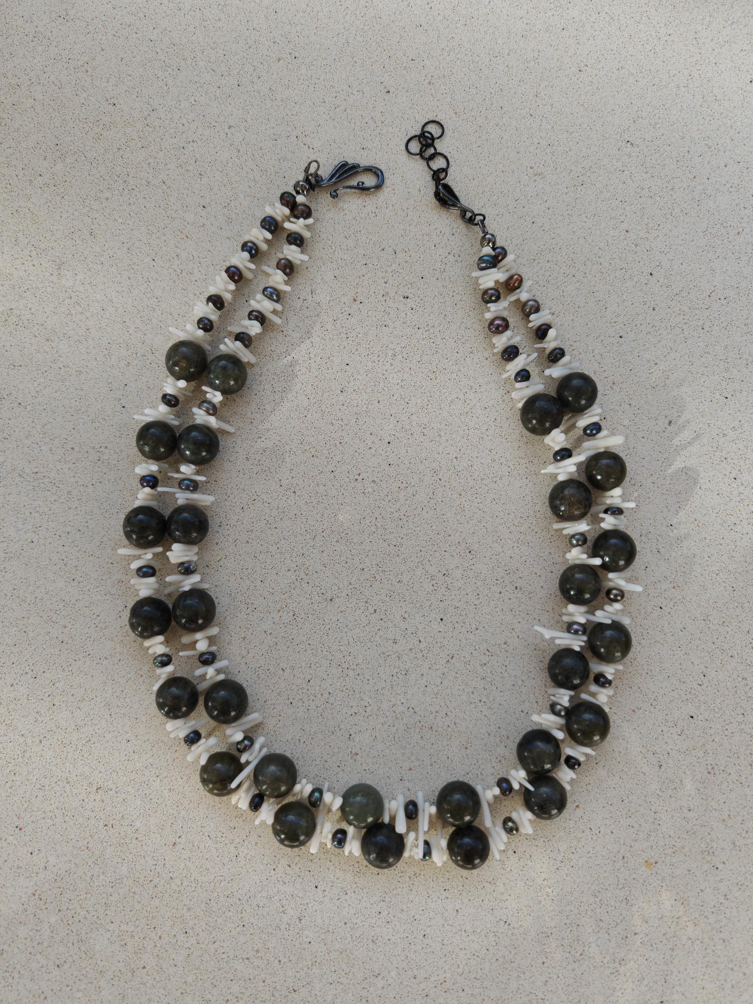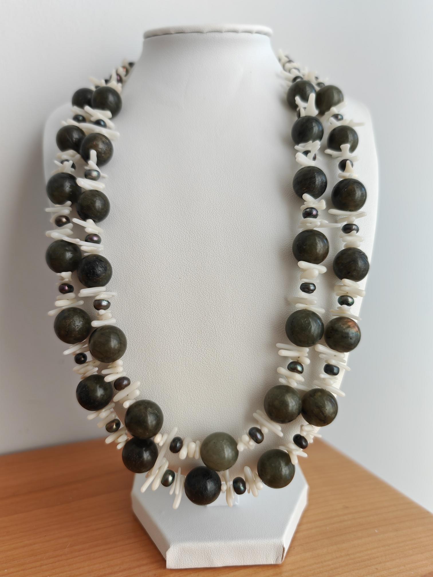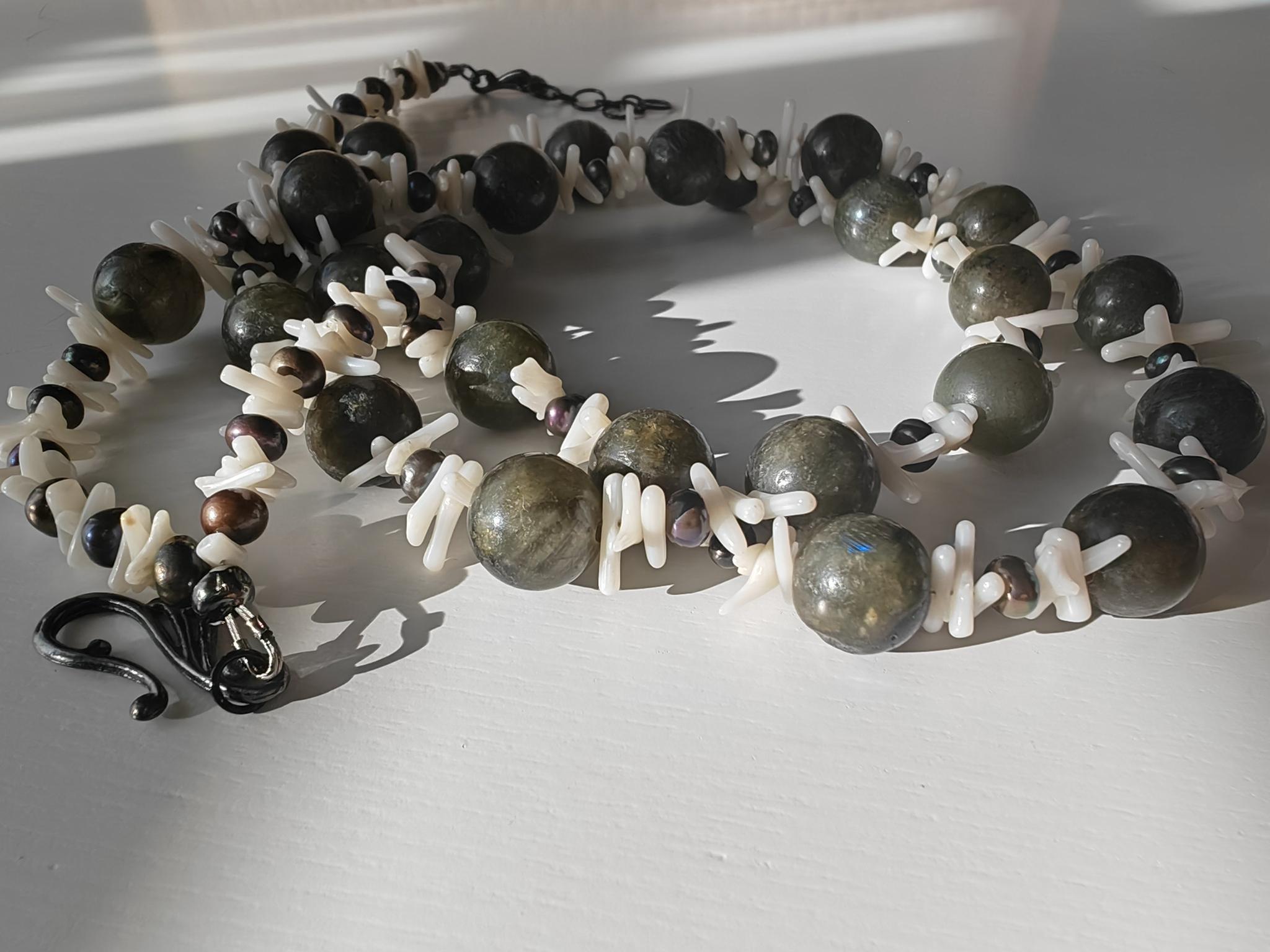 The two-strand labradorite necklace is made from round, rather matte and not very smooth labradorite beads in grey/olive green (12 mm), white branch coral (4 mm - 14 mm), and freshwater pearls in anthracite (approx. 4 mm - 6 mm). The S-shaped clasp and the extension chain are black.