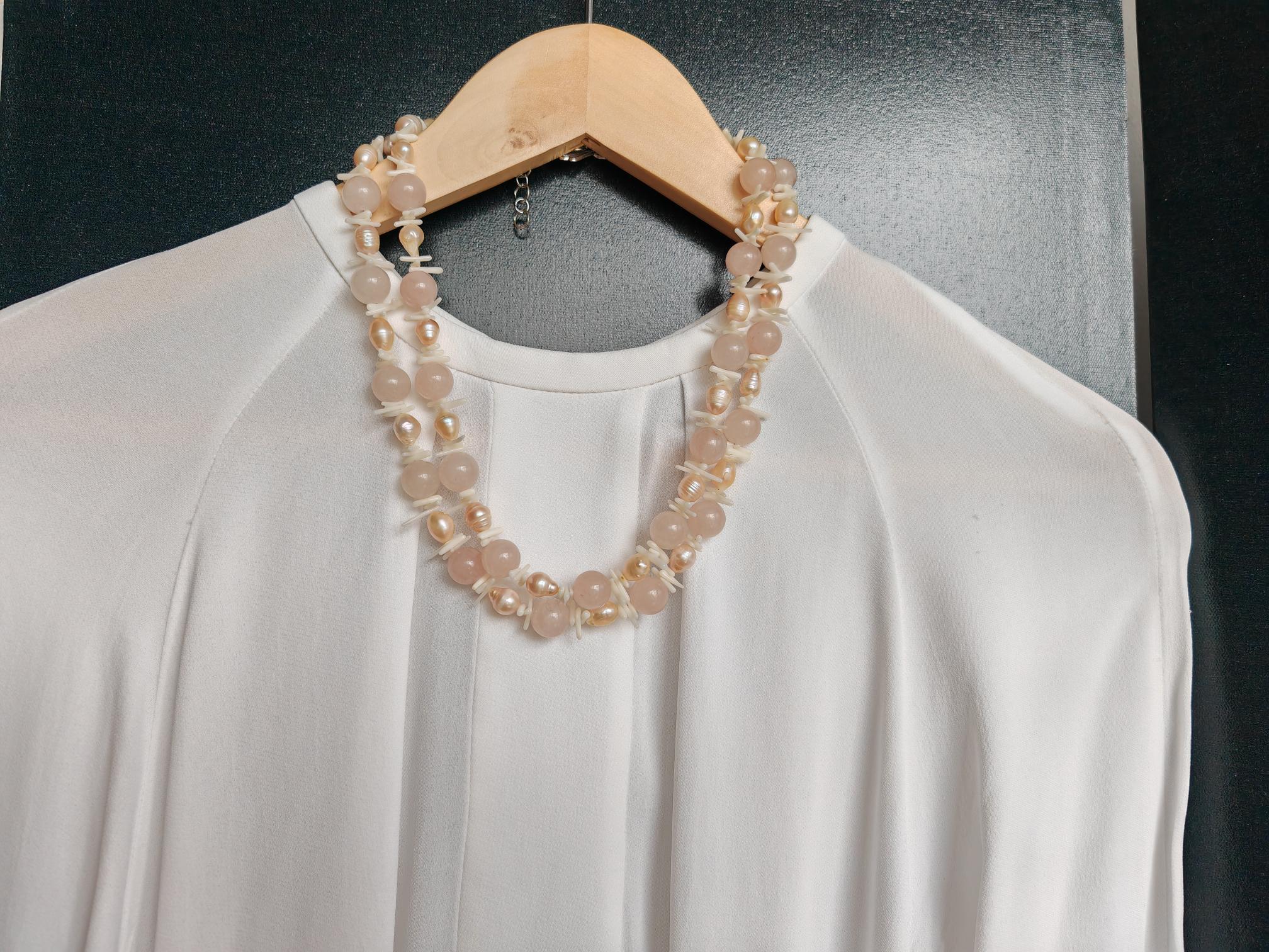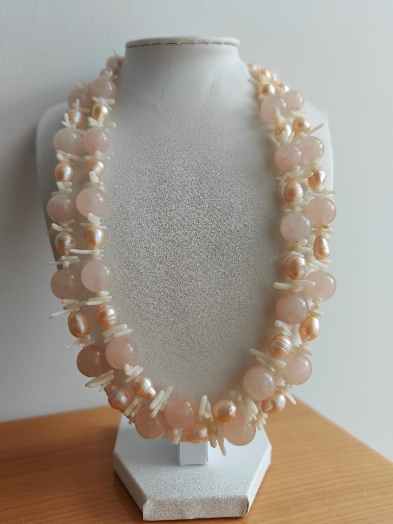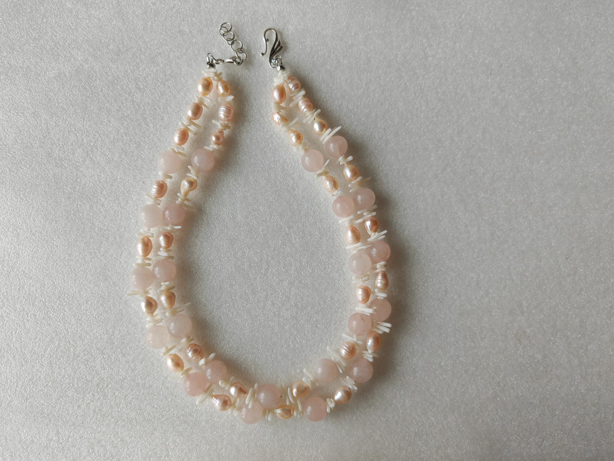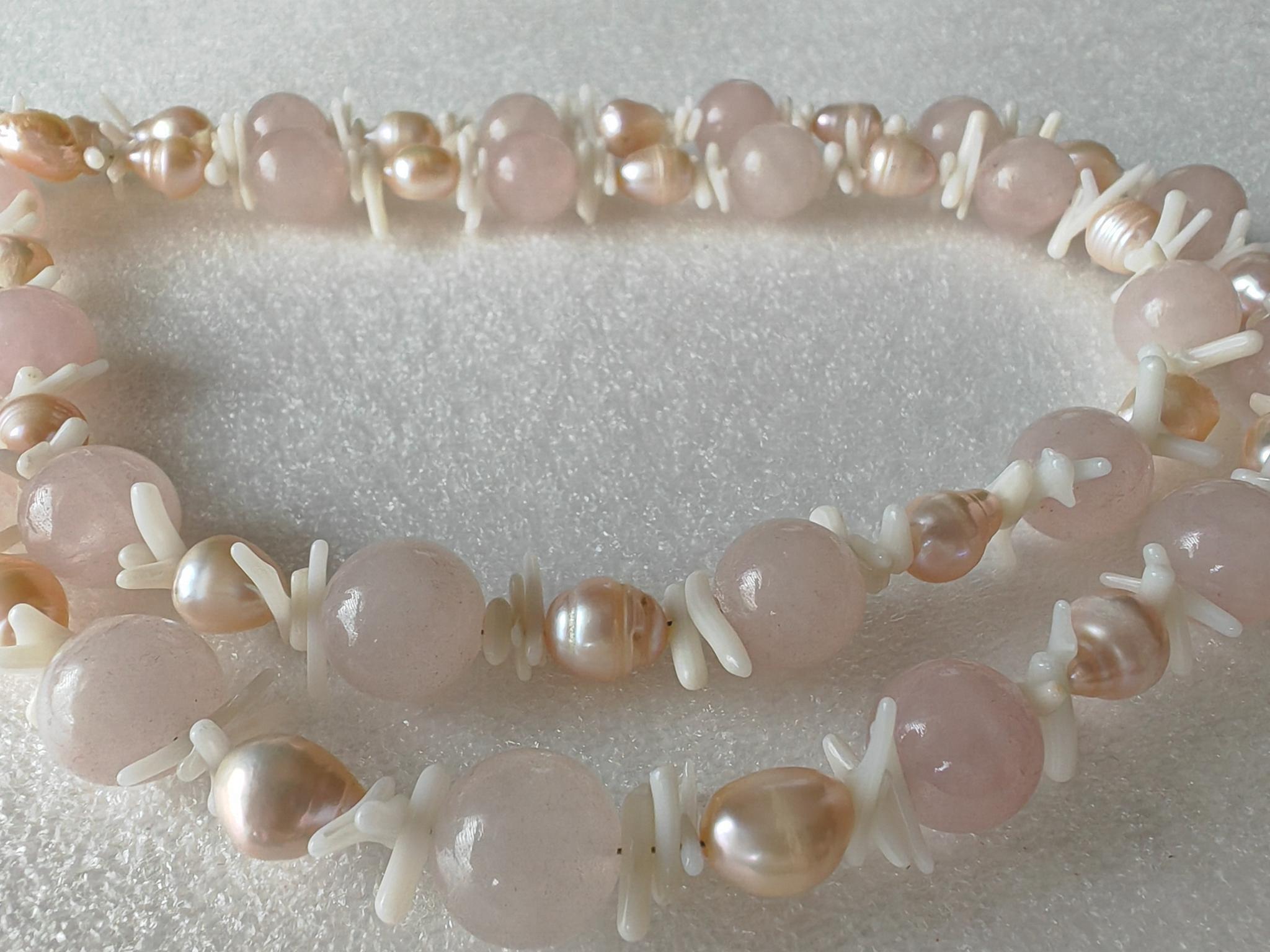 This two-strand rose quartz necklace is crafted from round rose quartz beads in rose (12 mm), white branch coral beads (4 mm - 14 mm), and light pink freshwater pearls (approx. 6 mm - 10 mm). The S-shaped clasp and extension chain are silver.