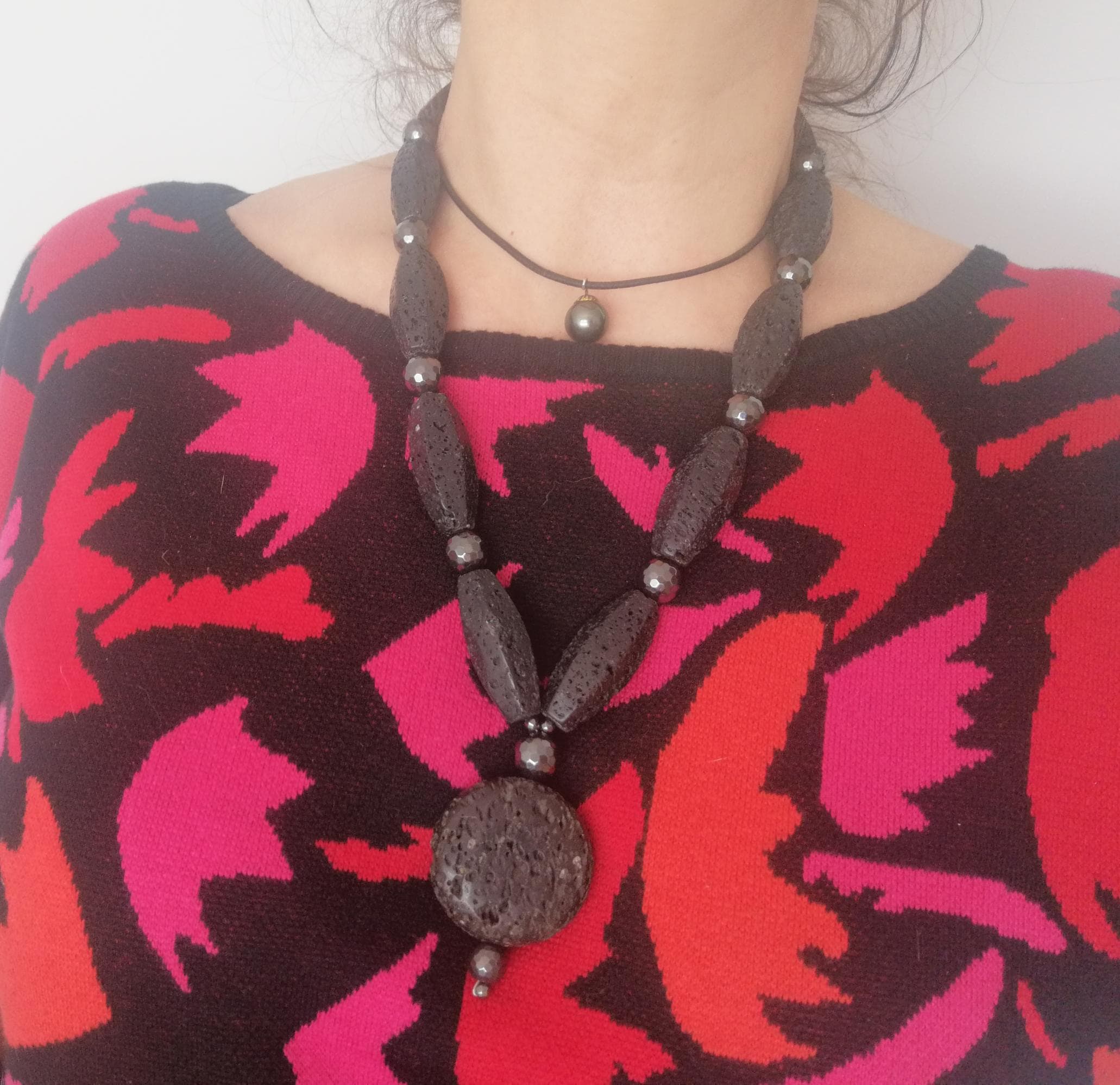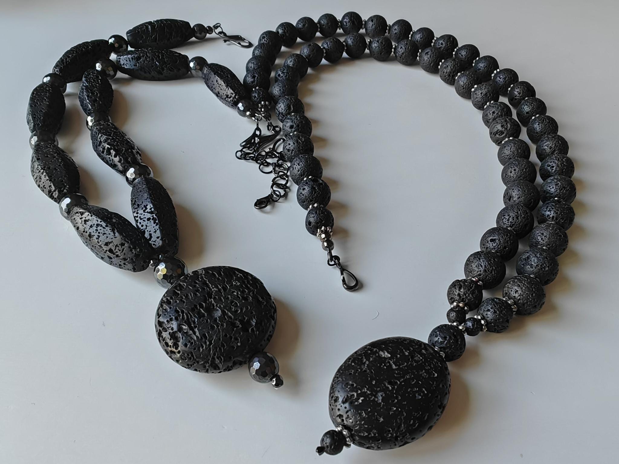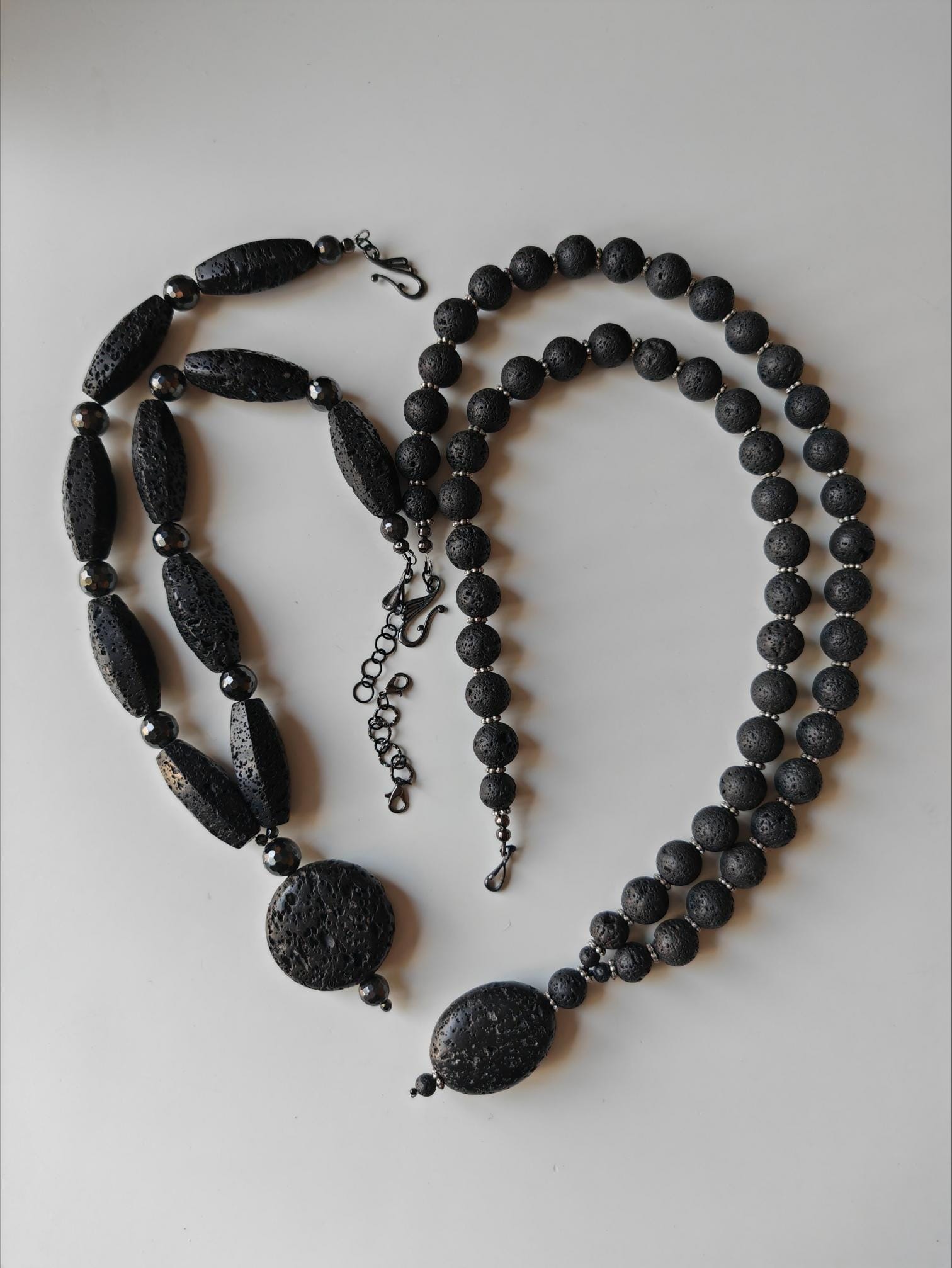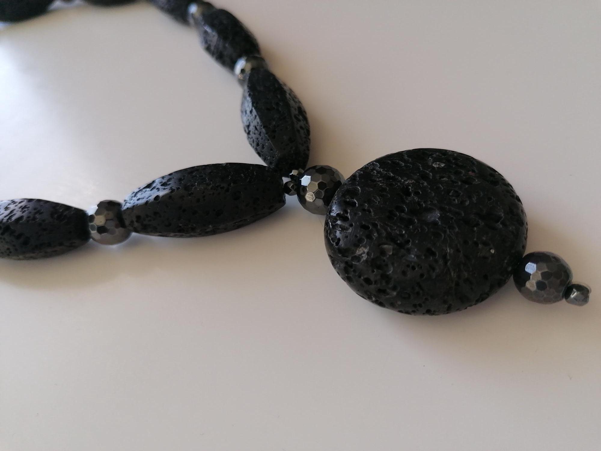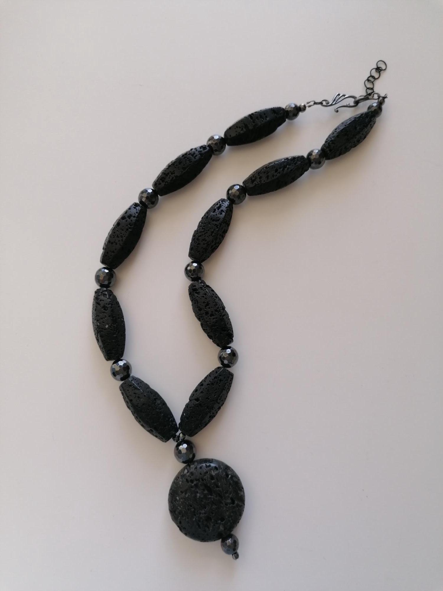 The shorter statement necklace with a round pendant is 58.5 cm long plus a removable extender chain. The necklace is made of hexagonal black lava stone beads (40 mm x 17 mm) and faceted black hematite beads (12 mm, 10 mm, and 4 mm). The coin-shaped lava stone pendant is approximately 65 mm long (the round bead is 40 mm x 15 mm). The necklace clasp and extender chain are black. The necklace weighs approximately 200 grams.