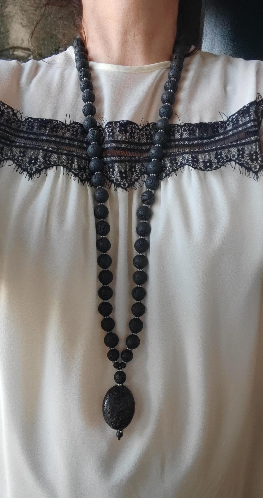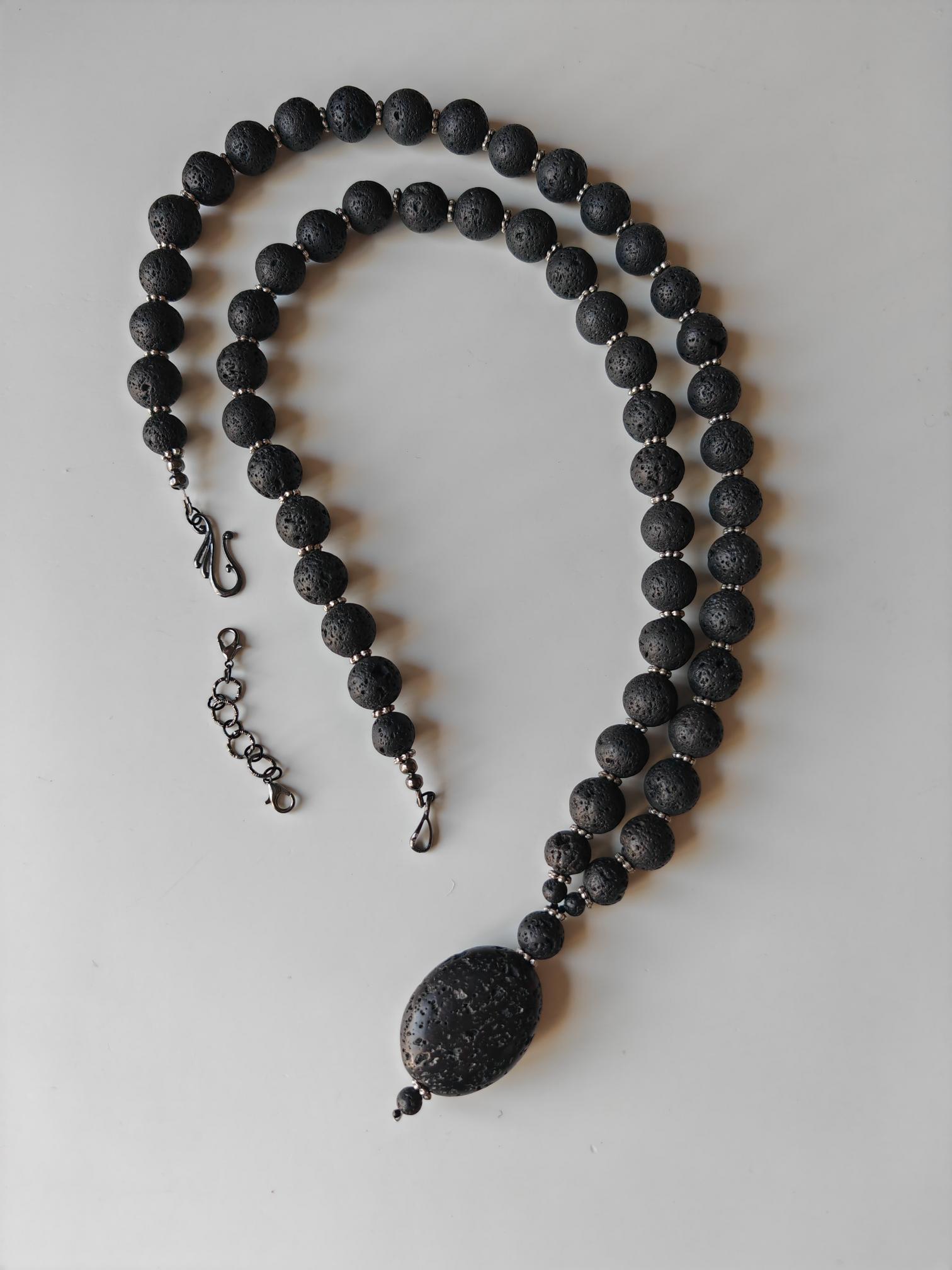 The long lava stone necklace with an oval pendant is 94 cm long plus a removable extender. The pendant is 65 mm long (oval bead is 40 mm x 15 mm). The solid necklace is made of black lava stone beads (16 mm, 12 mm, 8 mm) and black faceted spinel beads (2 mm). The metal beads (6 mm discs) are silver. The chain clasp and the extender are black.