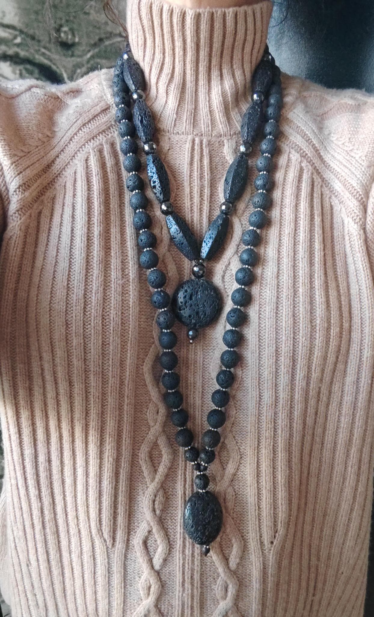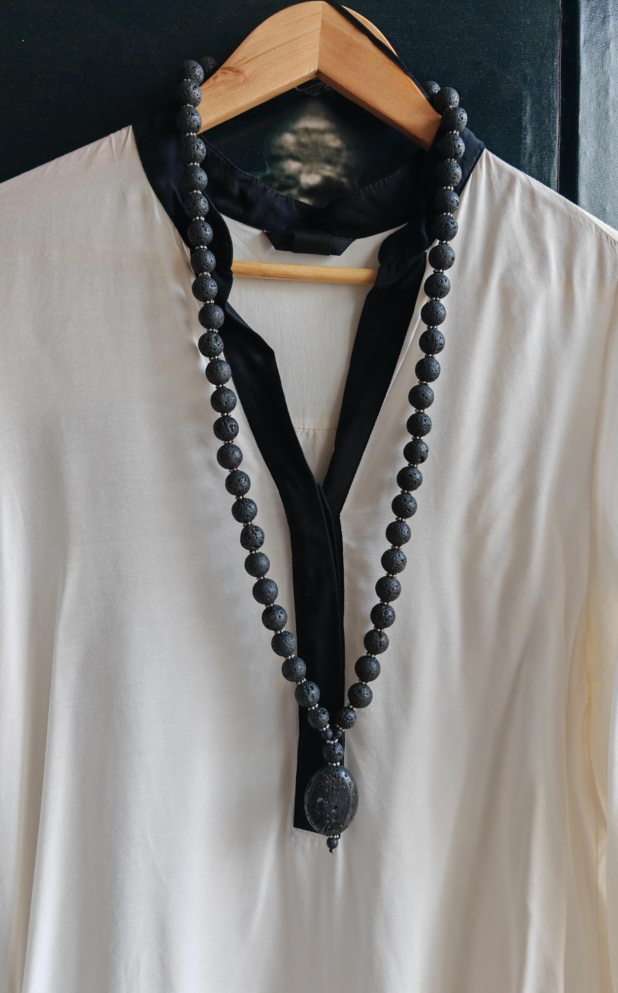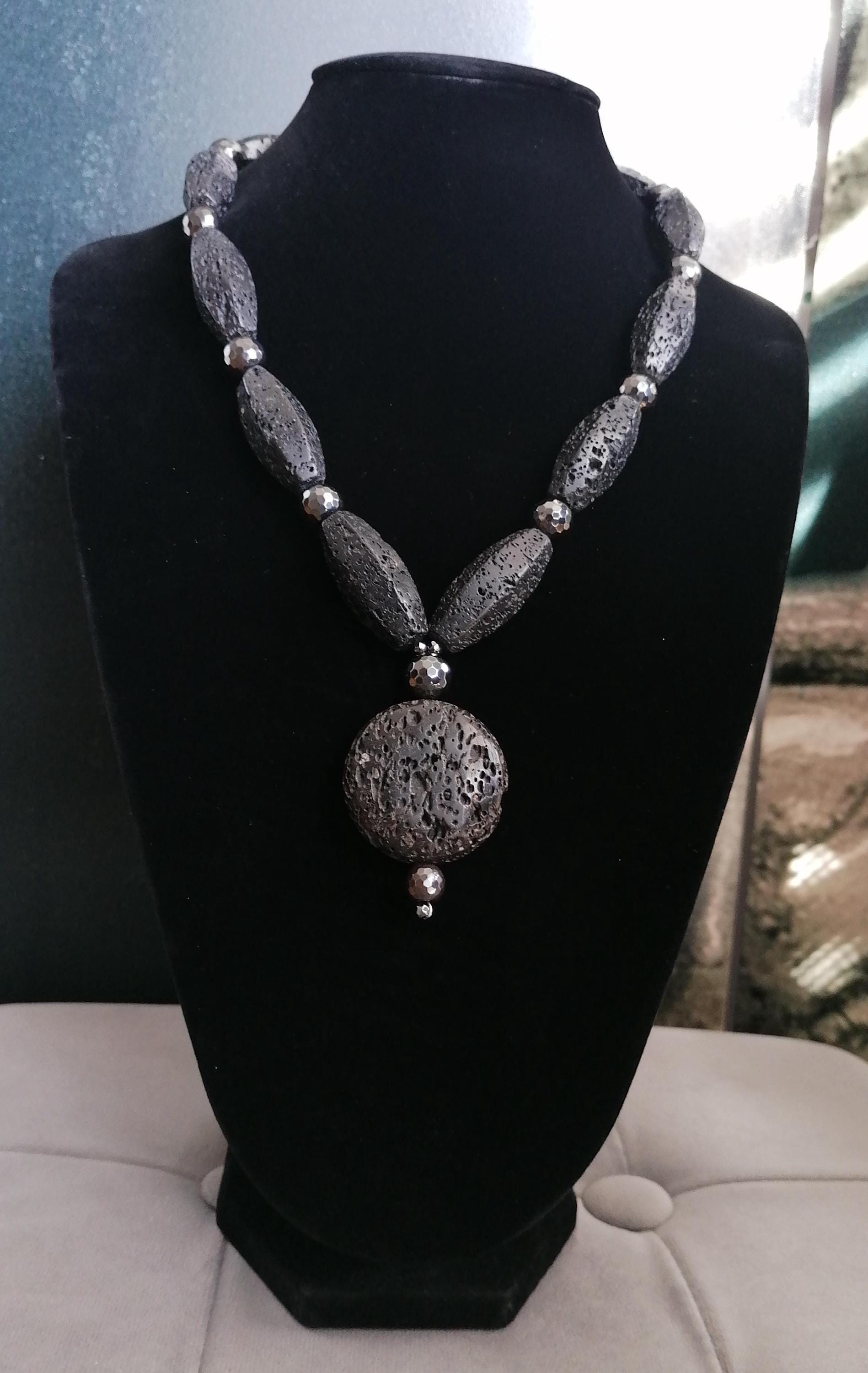 Handmade solid lava stone necklaces with black pendants. Two statement necklaces are available.