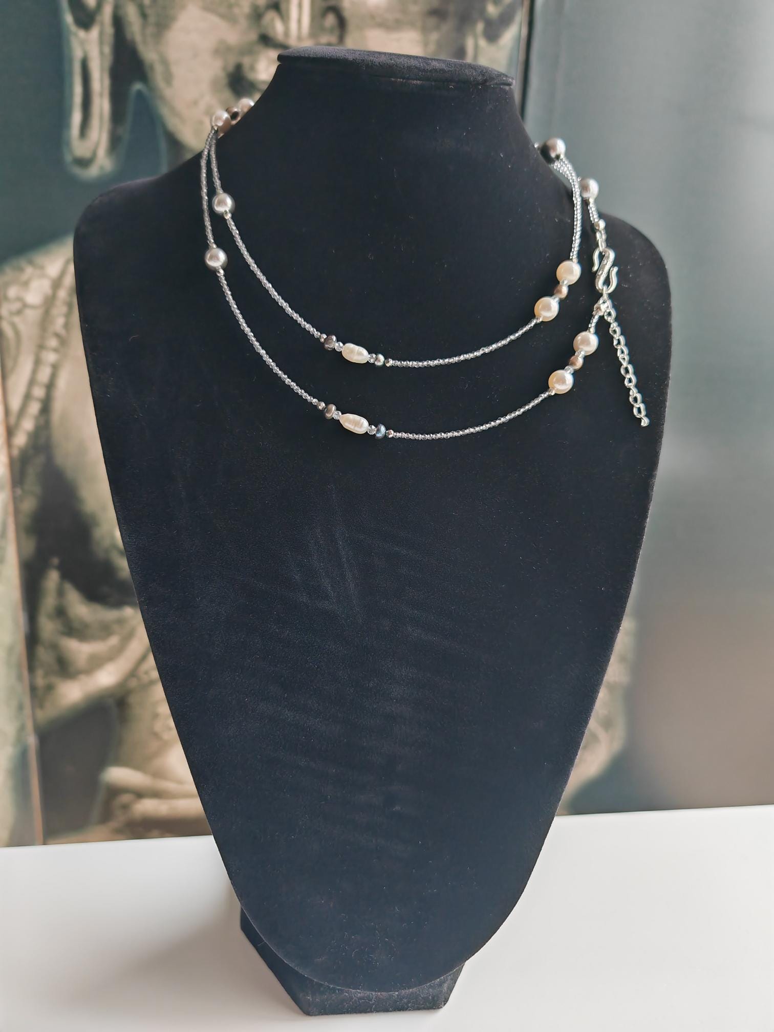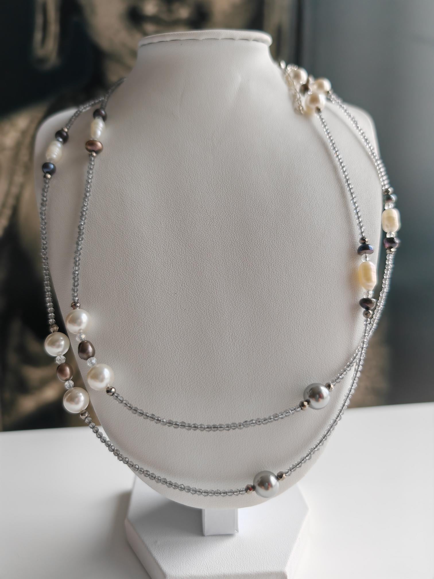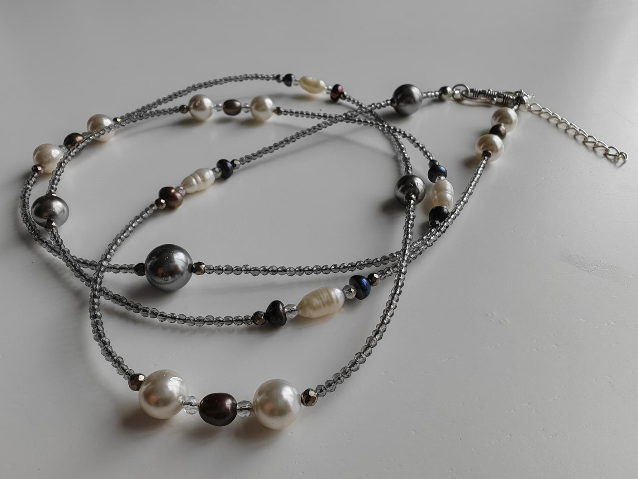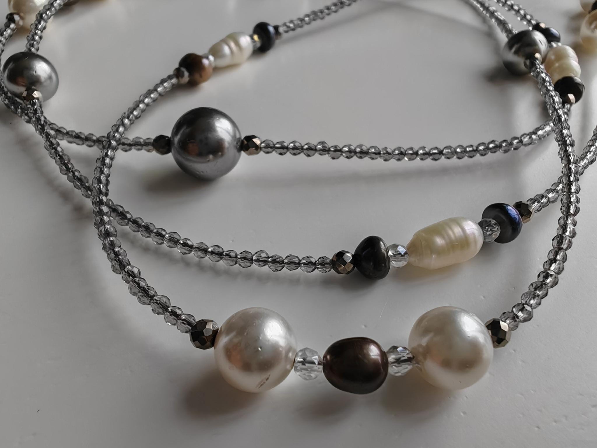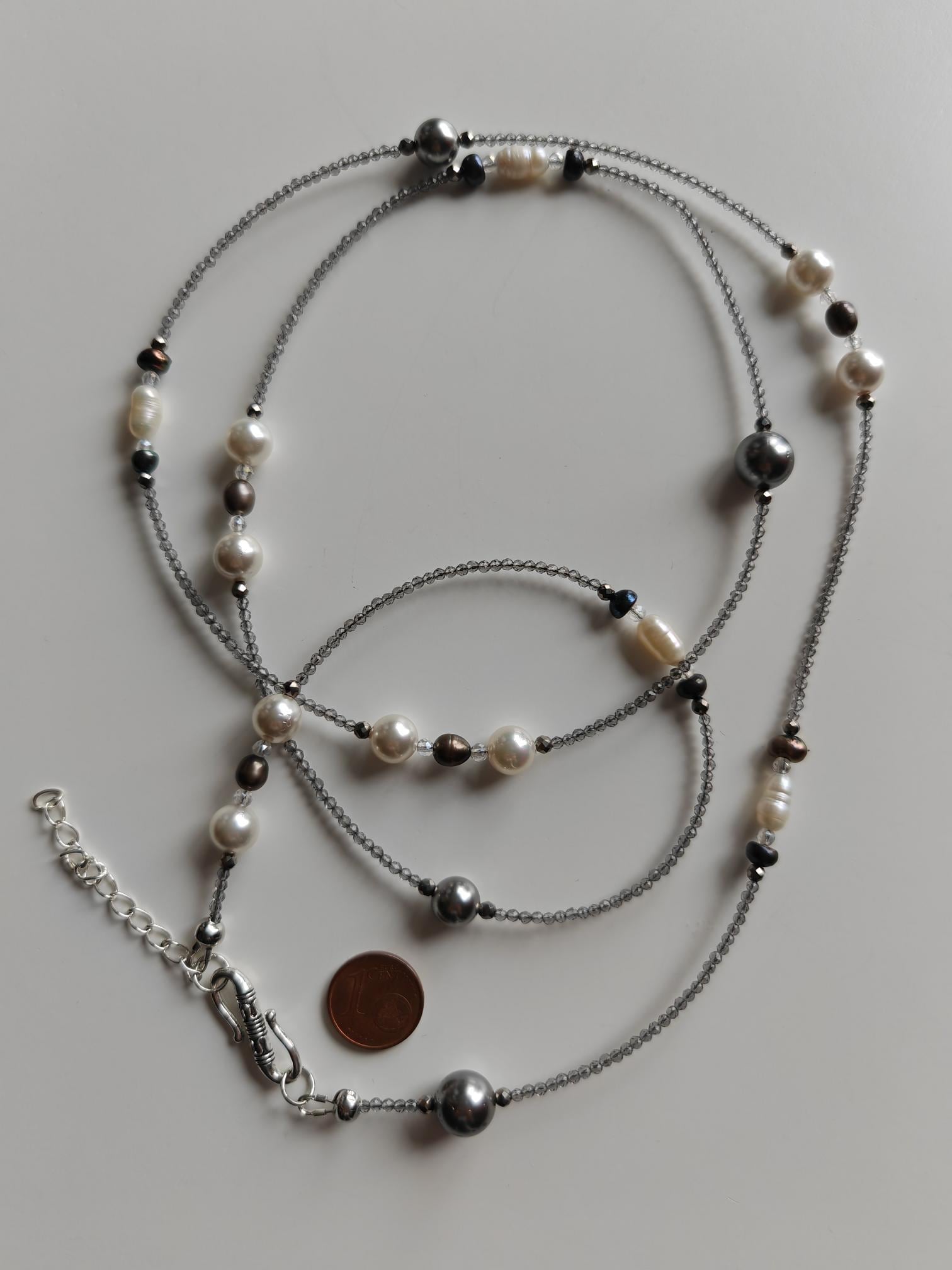 Handmade, approximately 103 cm long, very fine necklace in gray. This delicate necklace is made from spinel beads (gray 2 mm faceted beads, 3 mm faceted clear and anthracite beads), freshwater pearls (gray beads 5 mm - 6 mm, anthracite/purple beads approx. 4 mm - 5 mm, white beads 9 mm - 11 mm), and cultured shell pearls (white beads 8 mm, gray beads 8 mm and 12 mm). The S-clasp and extension chain are silver-colored. You can wear this fine necklace in various ways, including as a bracelet. Nice gift!