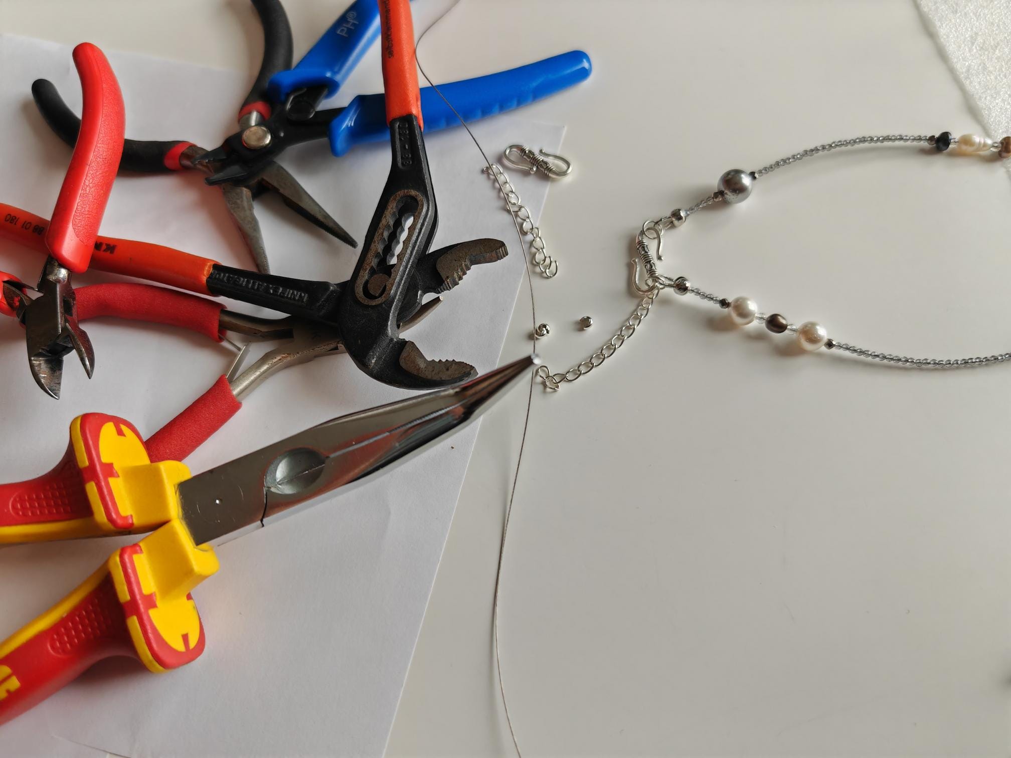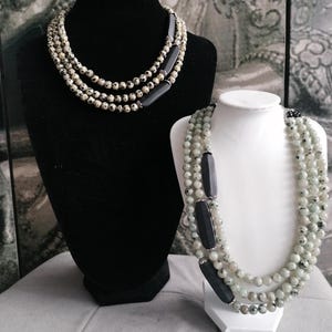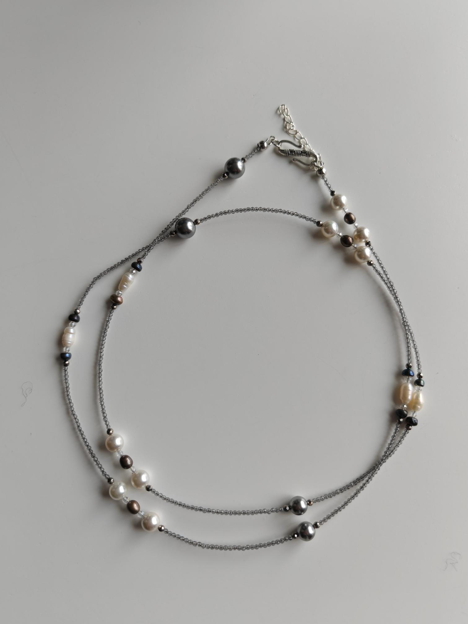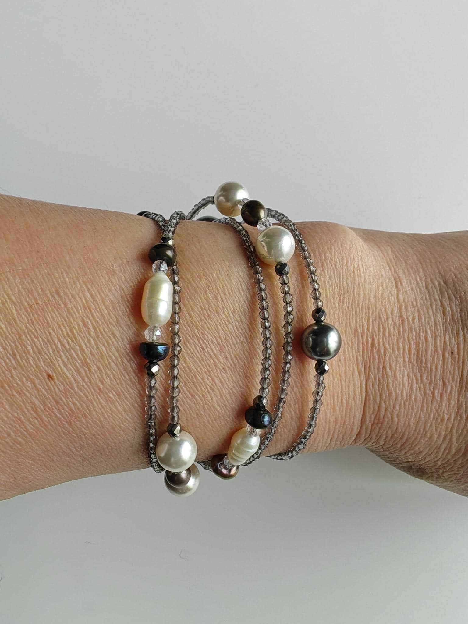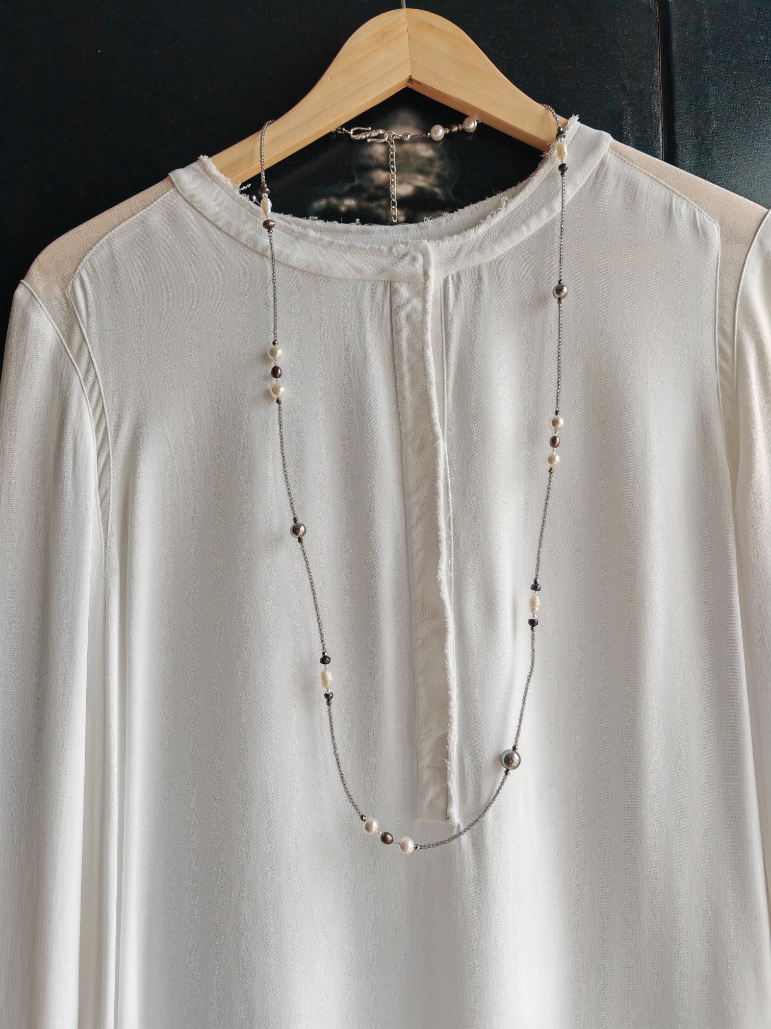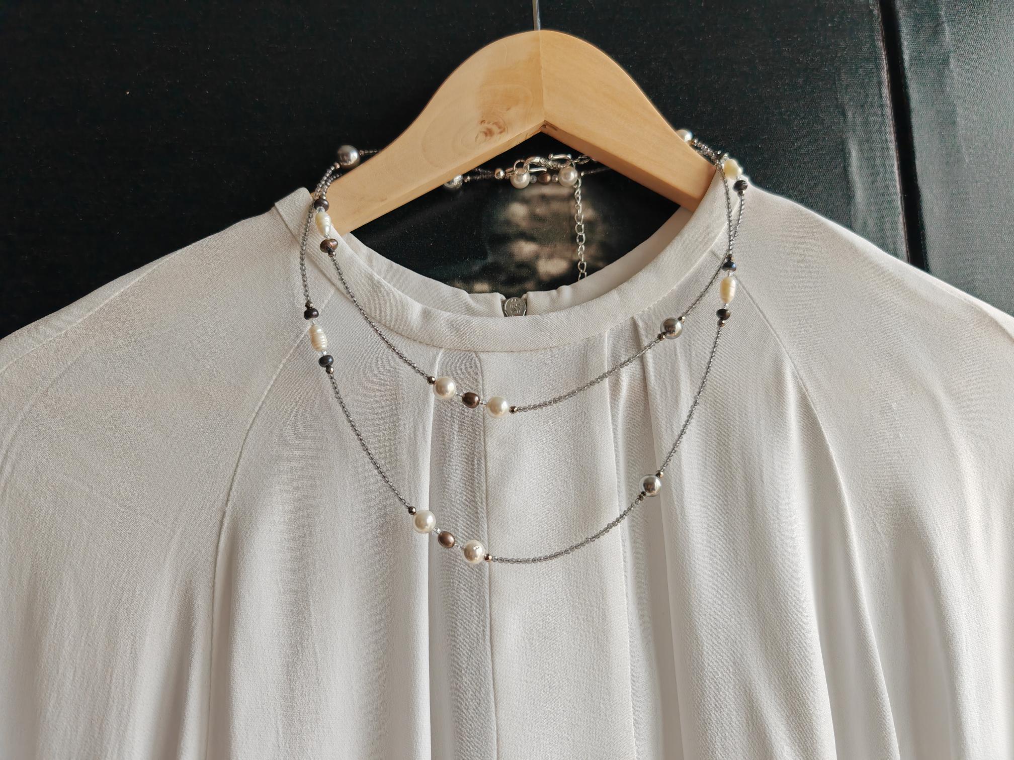 Handmade, approximately 103 cm long, very fine necklace in gray. This delicate necklace is made from spinel beads (gray 2 mm faceted beads, 3 mm faceted clear and anthracite beads), freshwater pearls (gray beads 5 mm - 6 mm, anthracite/purple beads approx. 4 mm - 5 mm, white beads 9 mm - 11 mm), and cultured shell pearls (white beads 8 mm, gray beads 8 mm and 12 mm). The S-clasp and extension chain are silver-colored. You can wear this fine necklace in various ways, including as a bracelet. Nice gift!