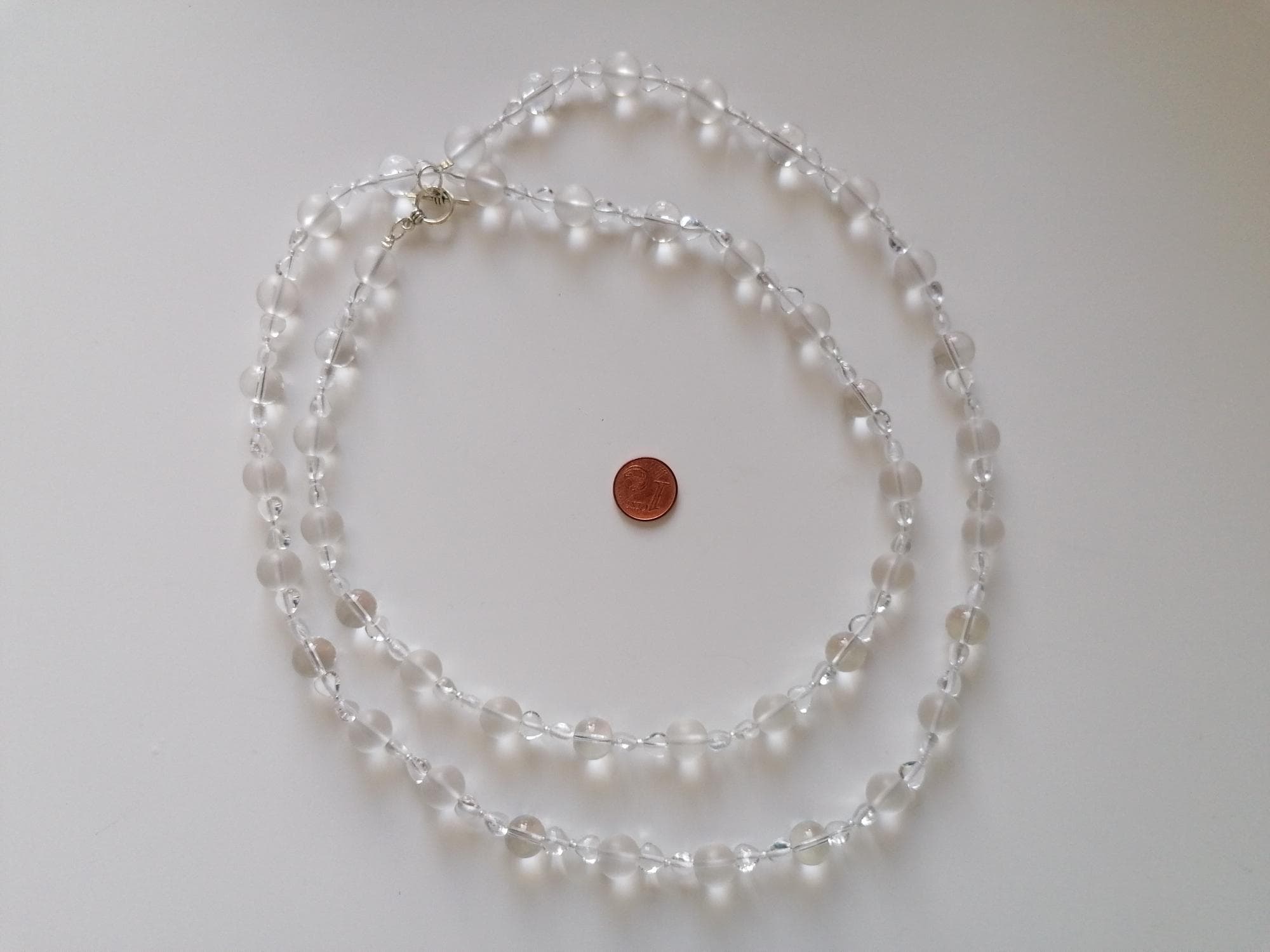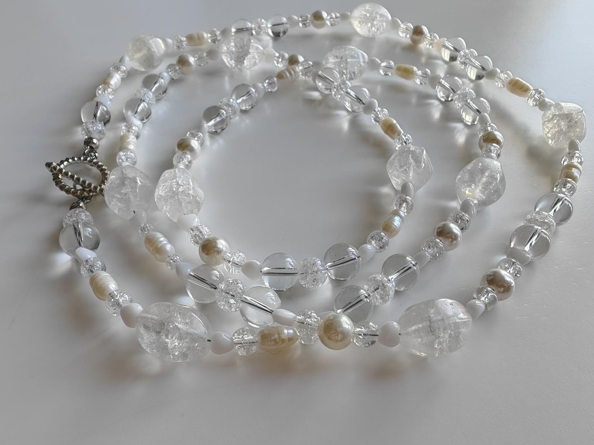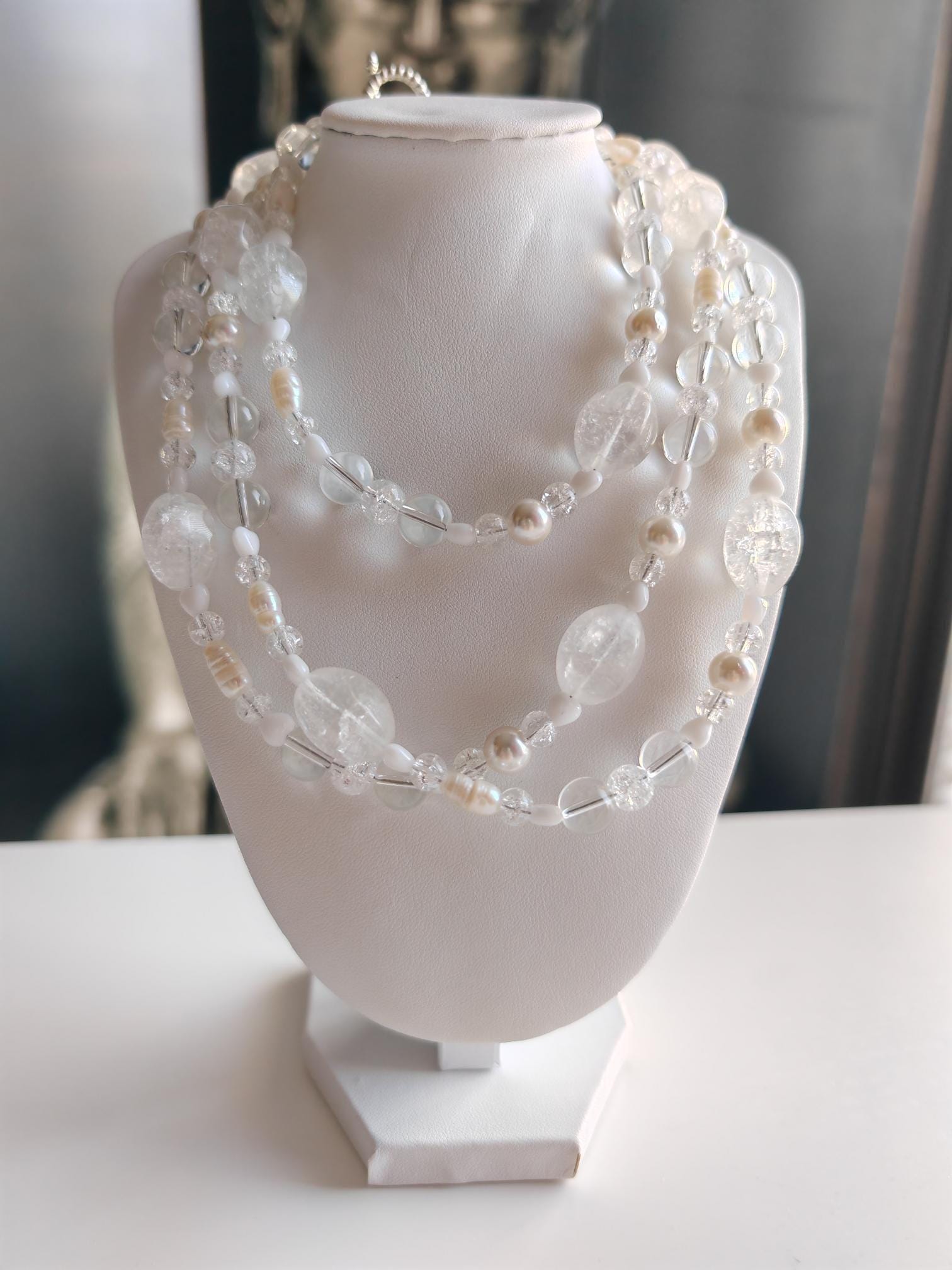 The solid gemstone necklace is 120 cm long. This elegant necklace is made of rock crystal beads (clear round beads 10 mm, cracked olive beads 20 mm x 15 mm, cracked round beads of 6 mm and 8 mm), white freshwater pearls (approx. 10 mm x 5 mm), white shell pearls (8 mm), and white heart-shaped Bohemian glass beads (approx. 5 mm). The toggle clasp is silver. You can wear this delicate necklace in a variety of ways (see photos) or combine it with other jewelry.