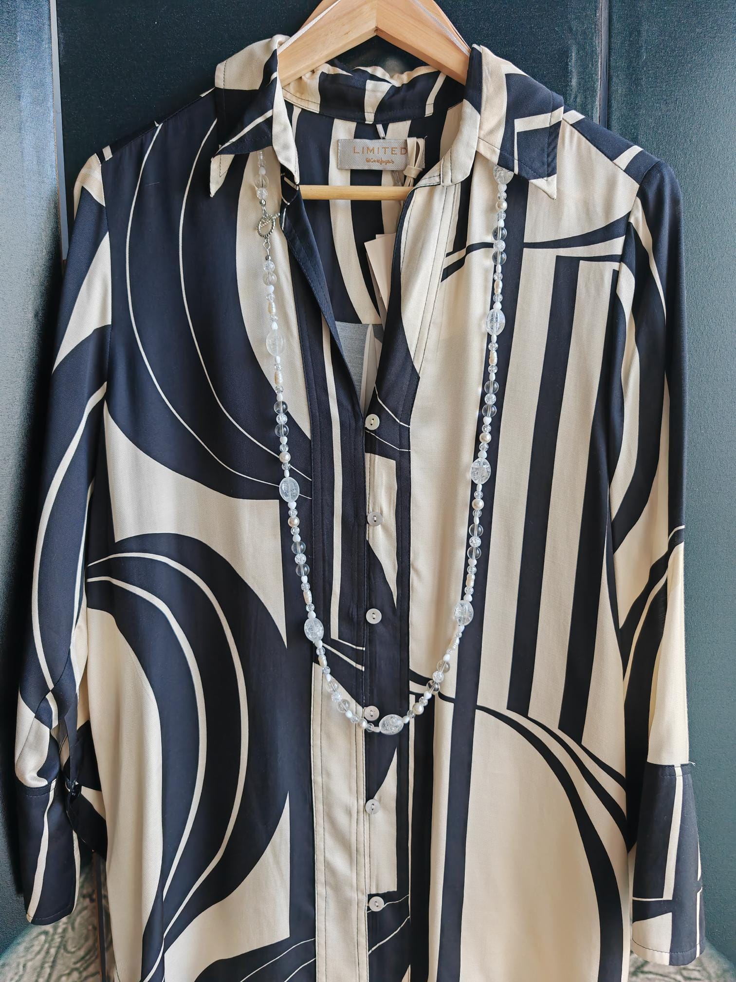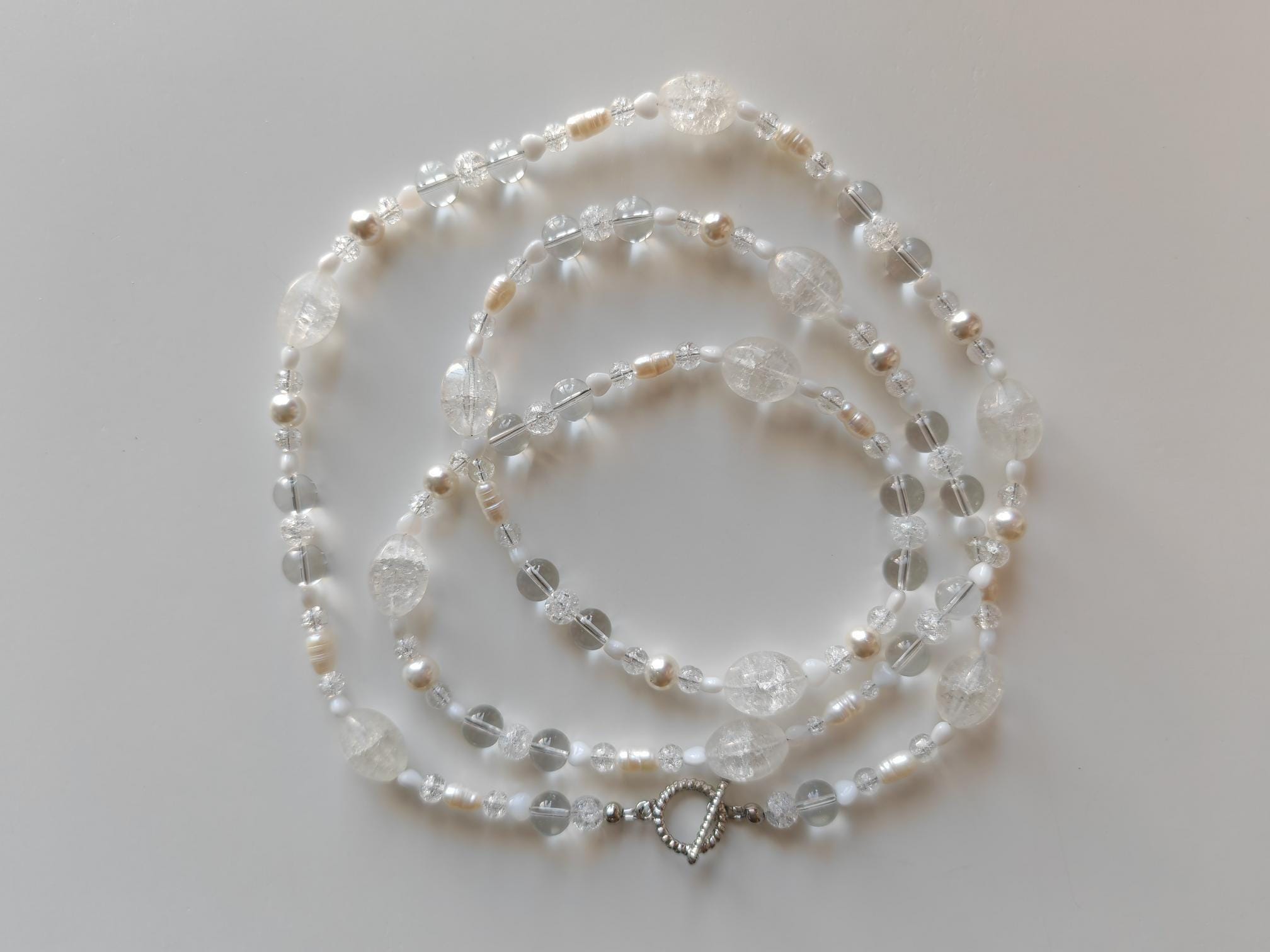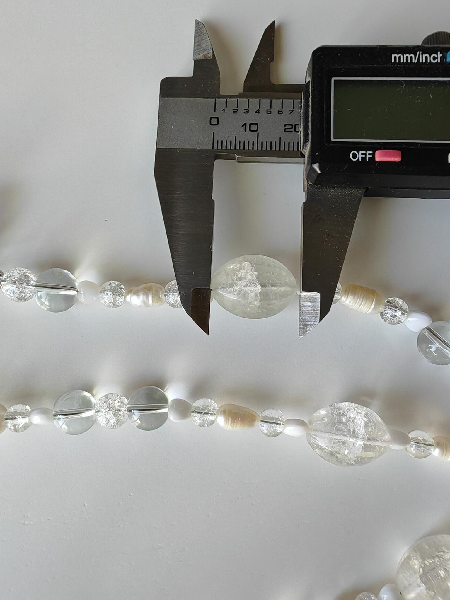 The solid gemstone necklace is 120 cm long. This elegant necklace is made of rock crystal beads (clear round beads 10 mm, cracked olive beads 20 mm x 15 mm, cracked round beads of 6 mm and 8 mm), white freshwater pearls (approx. 10 mm x 5 mm), white shell pearls (8 mm), and white heart-shaped Bohemian glass beads (approx. 5 mm). The toggle clasp is silver. You can wear this delicate necklace in a variety of ways (see photos) or combine it with other jewelry.