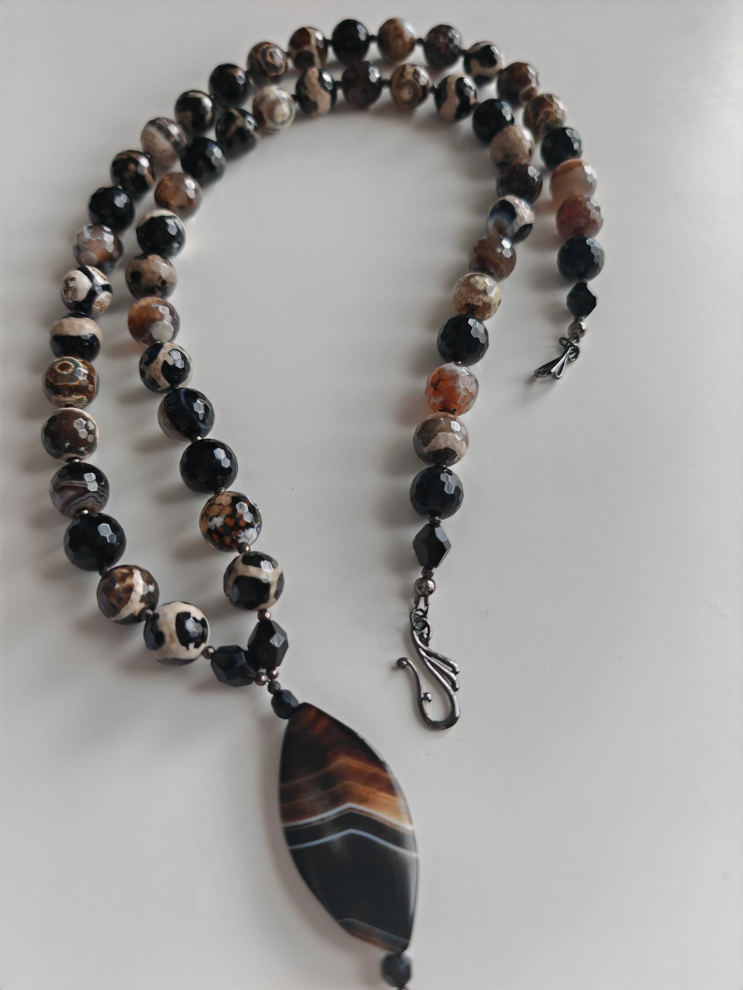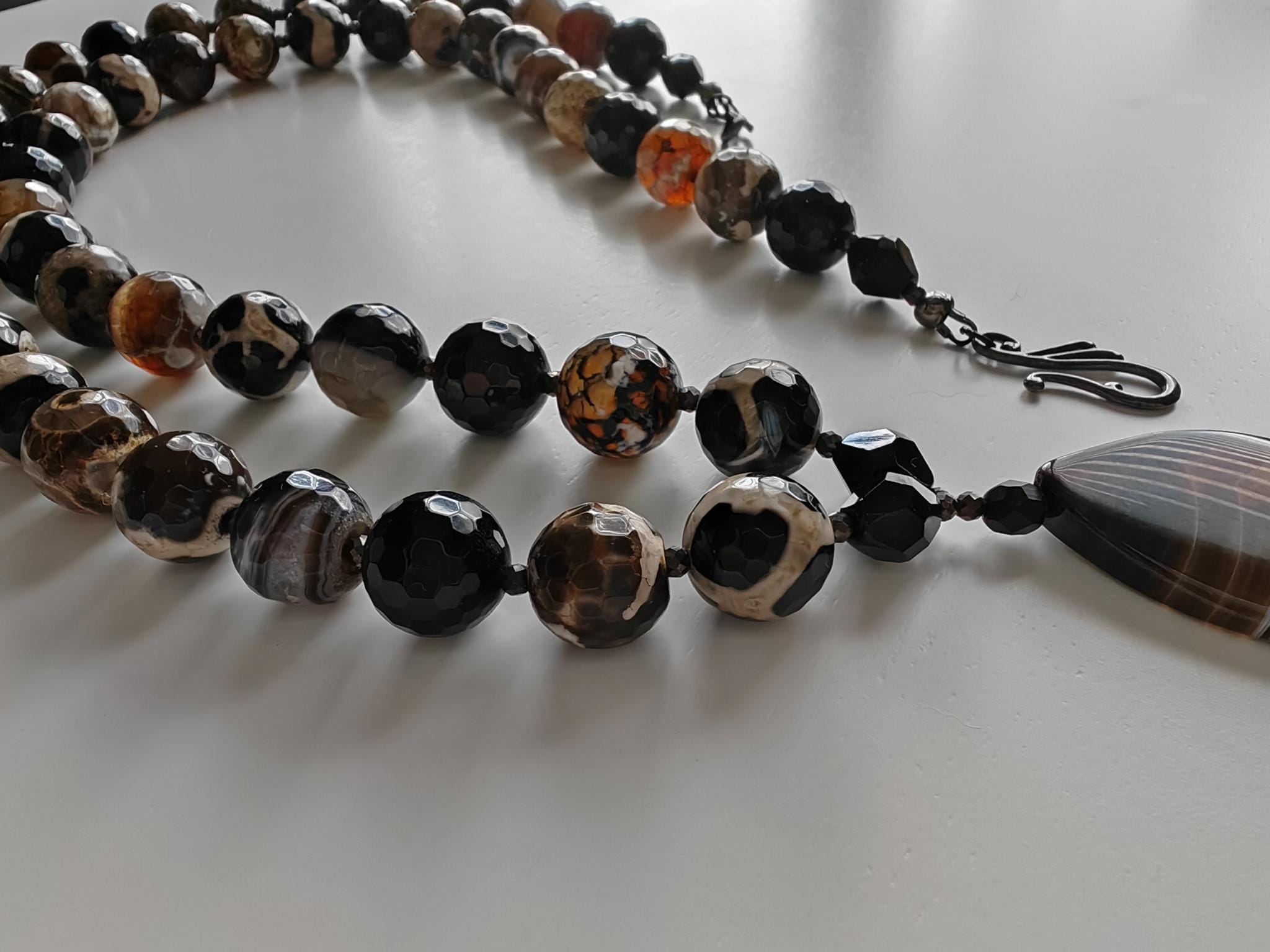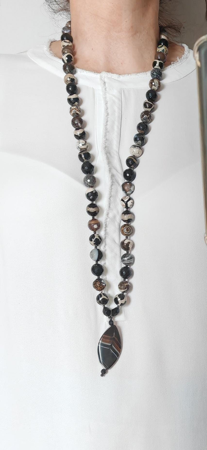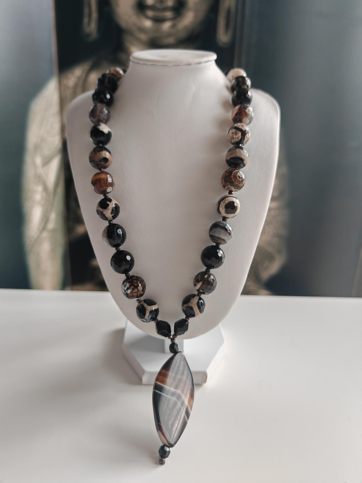 The long agate necklace with pendant and removable extension chain is approximately 96 cm long. The heavy chain in brown/black/beige/gray is made of round, faceted, shiny agate beads in brown/black/beige/gray (14 mm), faceted onyx beads in black (14 mm), faceted spinel beads in black (3 mm), and faceted Bohemian glass beads in black. The necklace clasp and the extension chain (removable) are black. The necklace pendant is approximately 70 mm long. You have the option of wearing this chunky chain in various ways, alone or in combination with other chains. You can wear the chain every day as well as for special occasions.
