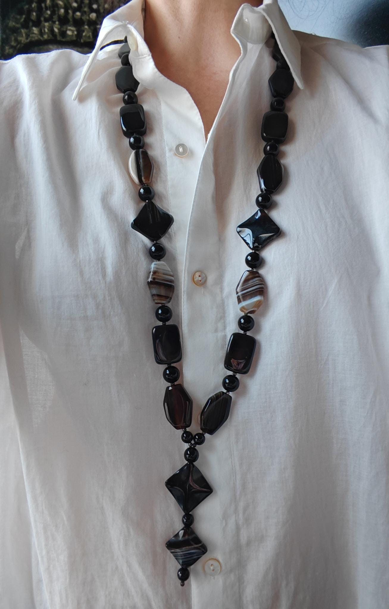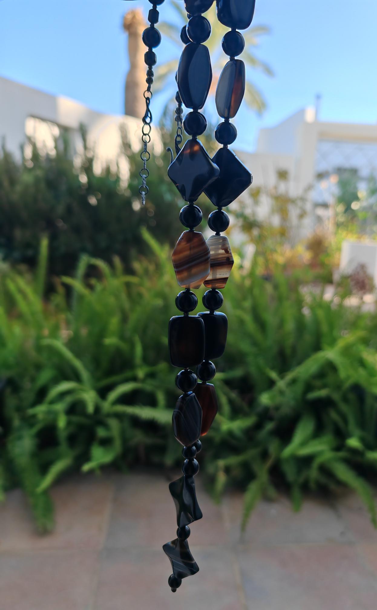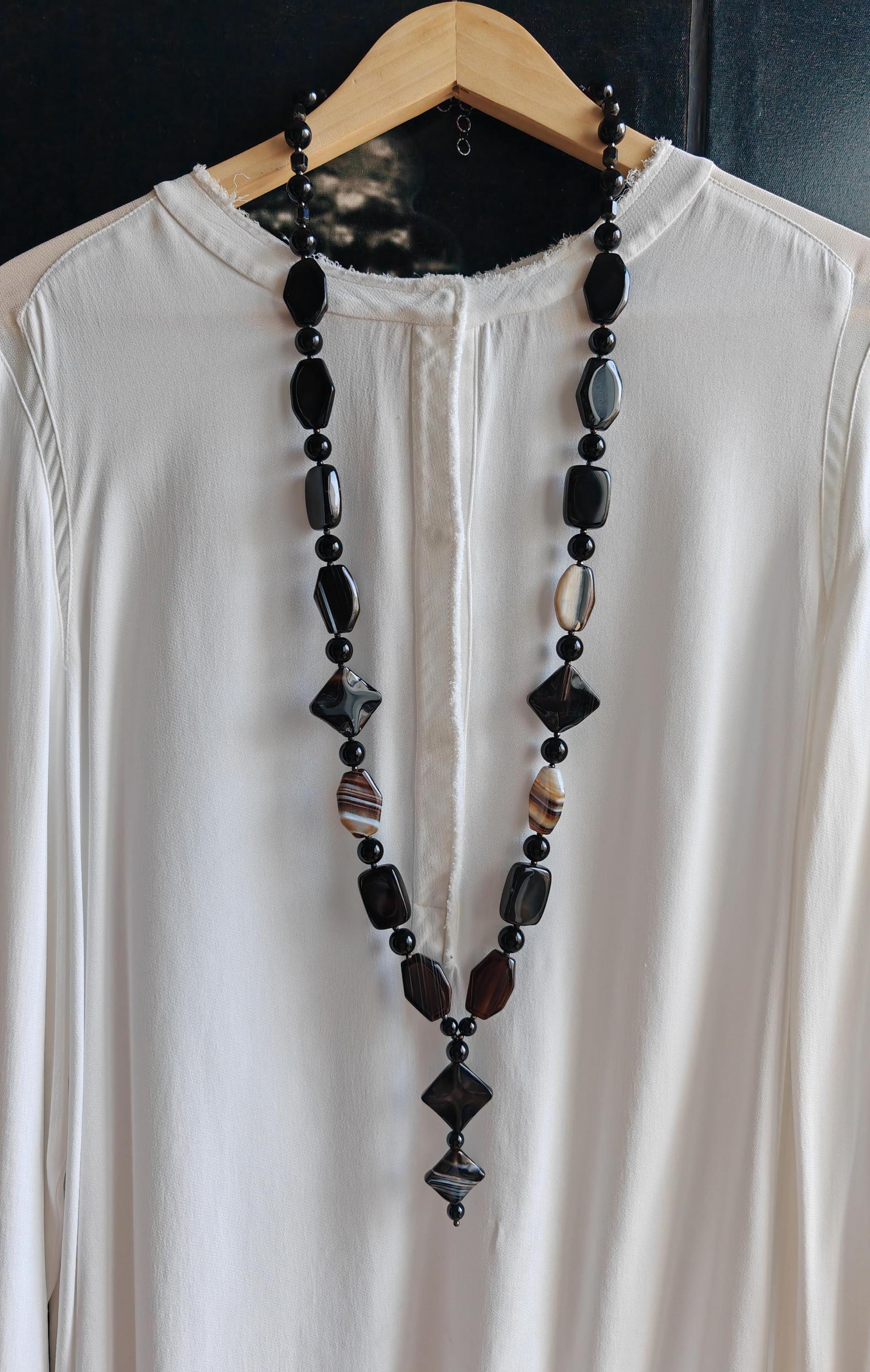 The long agate necklace with a long pendant and extension chain is approx. 97 cm long. The heavy chain in black/brown/beige is made of shiny agate beads (7-sided beads in black/brown and brown/beige/gray 29 mm x 21 mm x 7 mm, 4-sided beads in black/brown 28 mm x 20 mm x 7 mm, diamond-shaped beads 30 mm x 30 mm x 6 mm and 27 mm x 27 mm x 6 mm), high-gloss onyx beads in black (12 mm, 10 mm and 8 mm), faceted spinel beads in black (3 mm) and faceted Bohemian glass beads in black (8 mm). The chain clasp and the extension chain are black. The necklace pendant is approx. 85 mm long. You can wear this massive necklace in a variety of ways, either alone or combined with other necklaces. You can wear this opulent necklace both everyday and for special occasions.