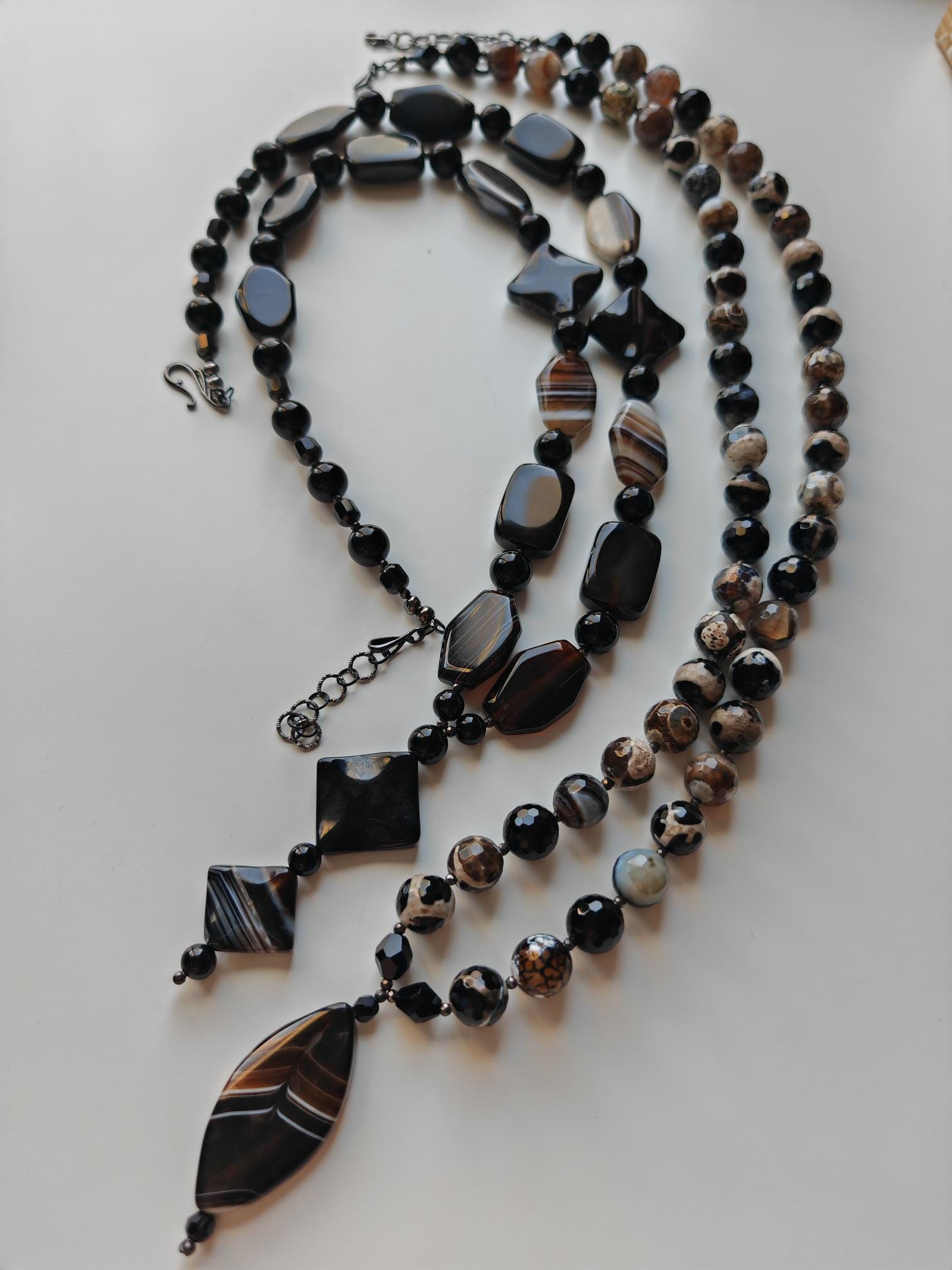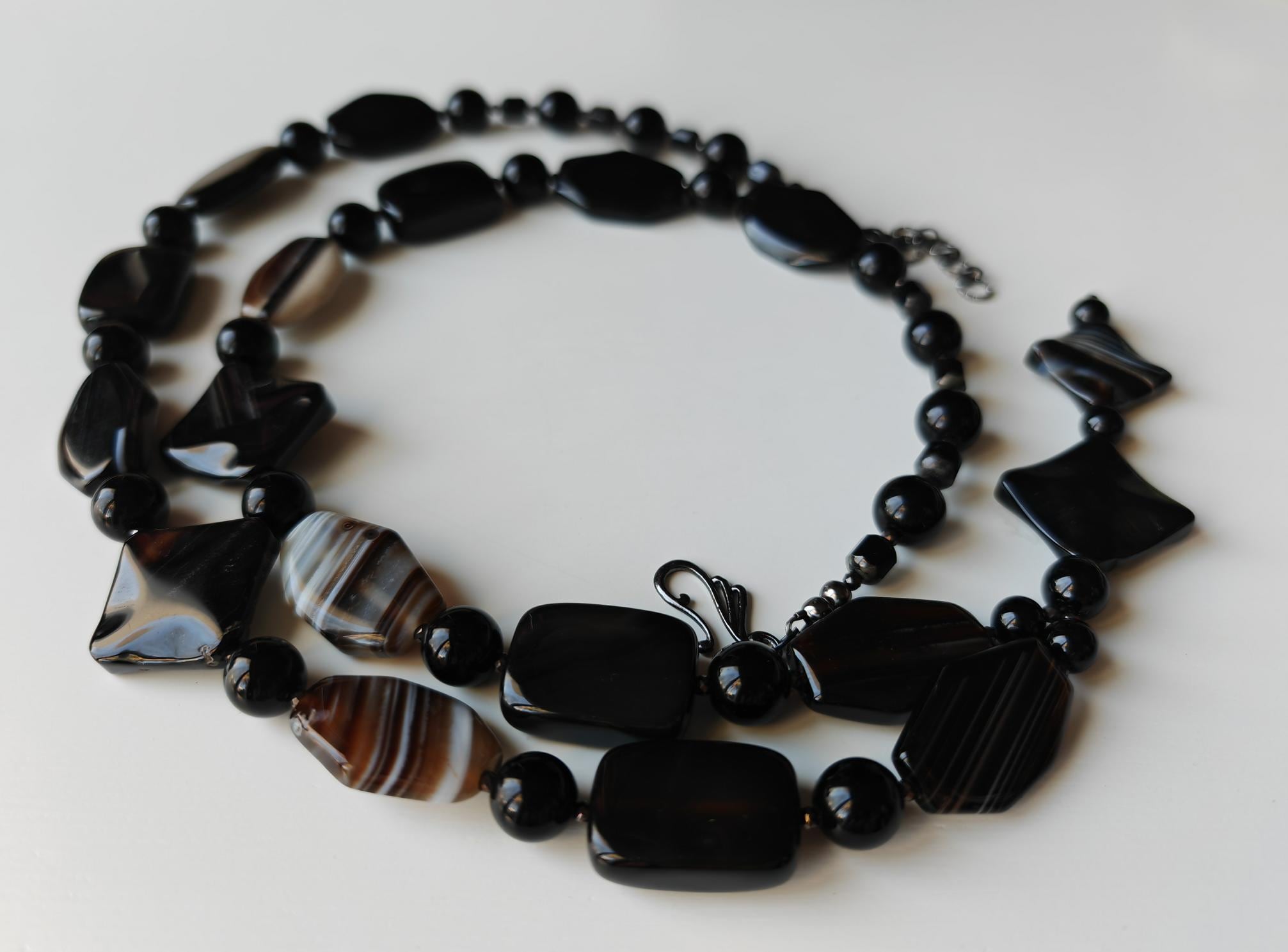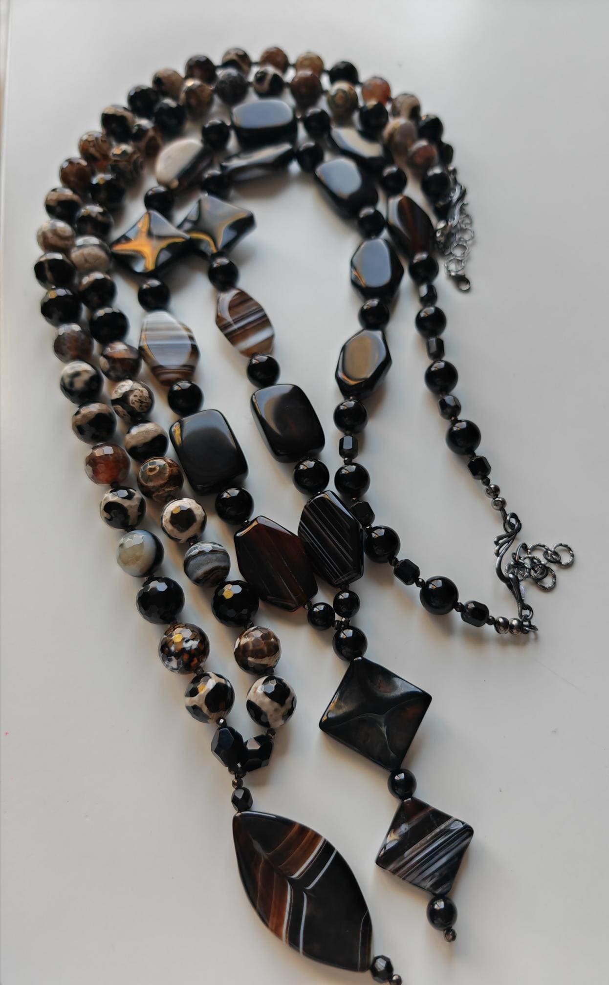 The long agate necklace with a long pendant and extension chain is approx. 97 cm long. The heavy chain in black/brown/beige is made of shiny agate beads (7-sided beads in black/brown and brown/beige/gray 29 mm x 21 mm x 7 mm, 4-sided beads in black/brown 28 mm x 20 mm x 7 mm, diamond-shaped beads 30 mm x 30 mm x 6 mm and 27 mm x 27 mm x 6 mm), high-gloss onyx beads in black (12 mm, 10 mm and 8 mm), faceted spinel beads in black (3 mm) and faceted Bohemian glass beads in black (8 mm). The chain clasp and the extension chain are black. The necklace pendant is approx. 85 mm long. You can wear this massive necklace in a variety of ways, either alone or combined with other necklaces. You can wear this opulent necklace both everyday and for special occasions.
