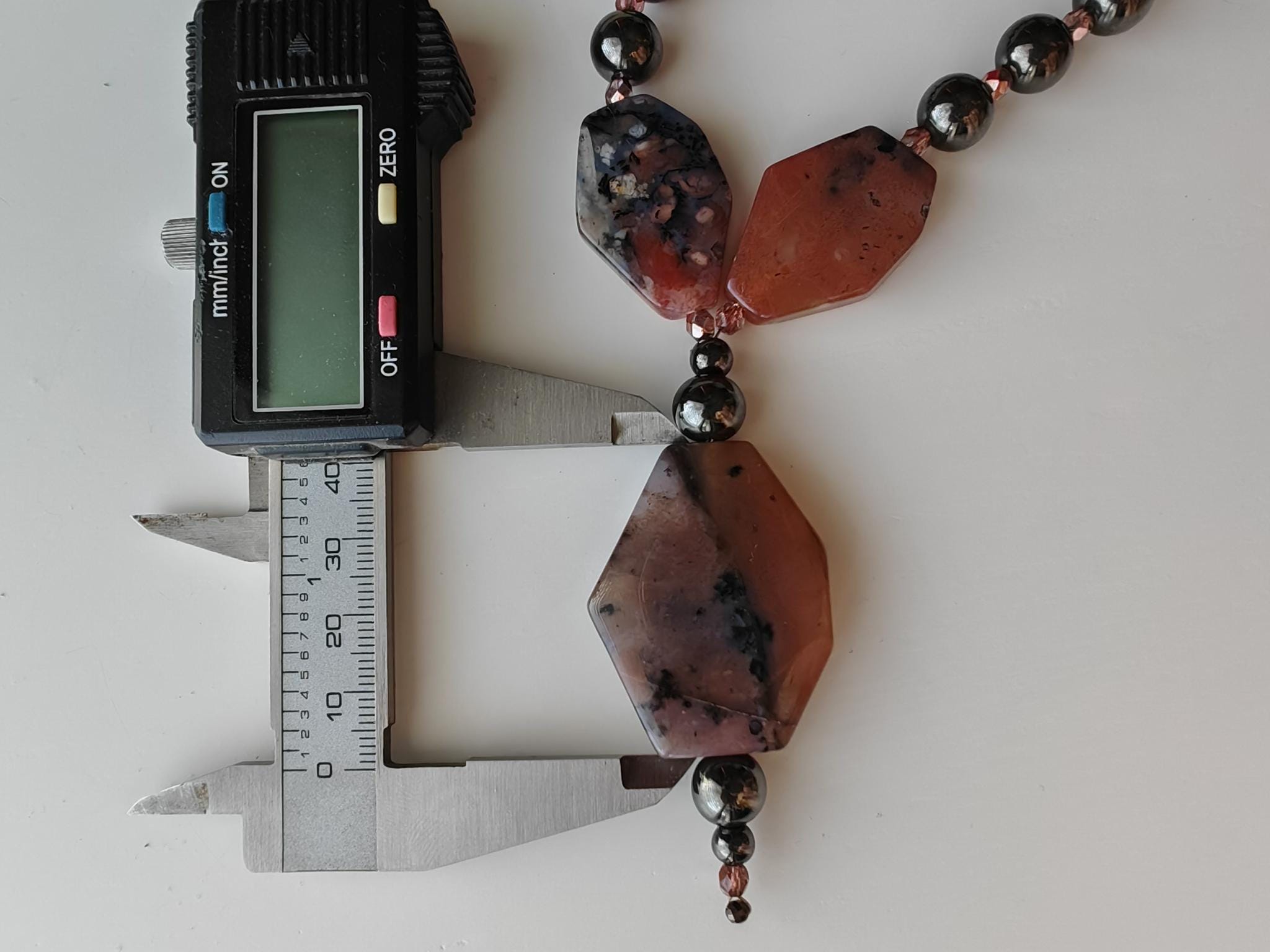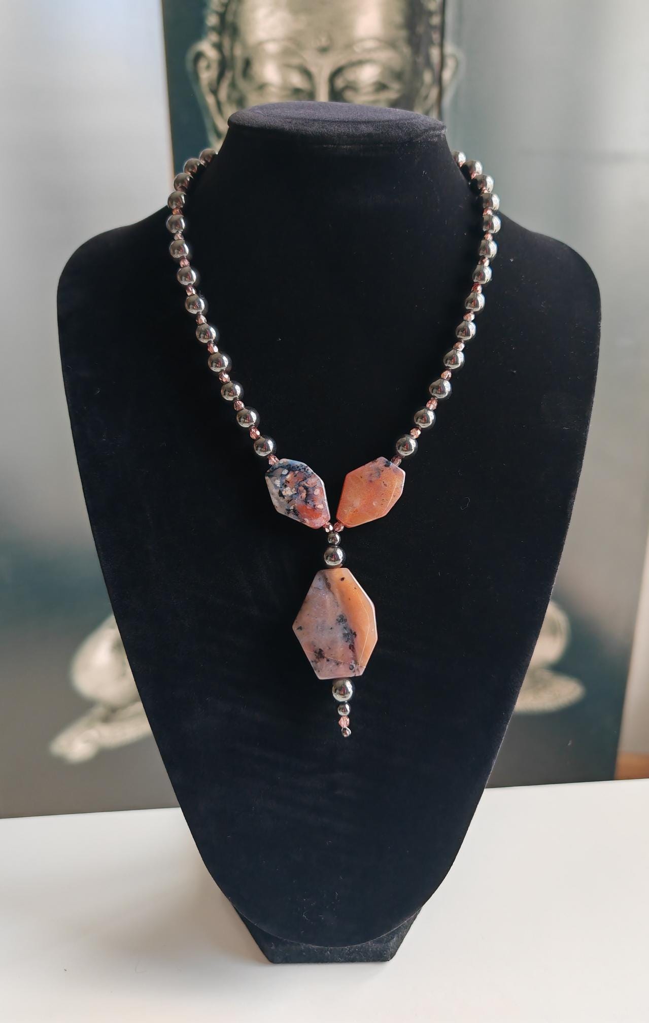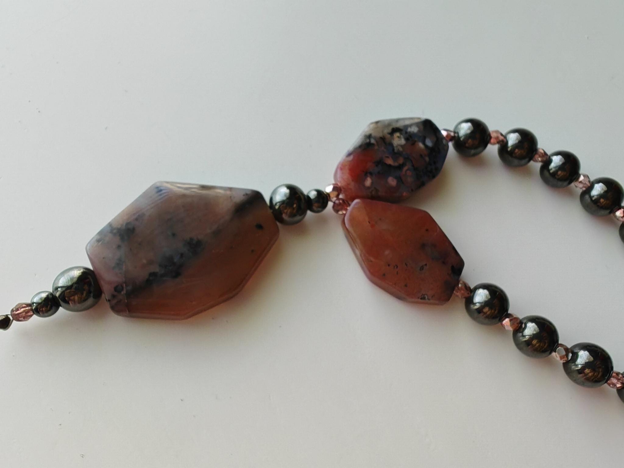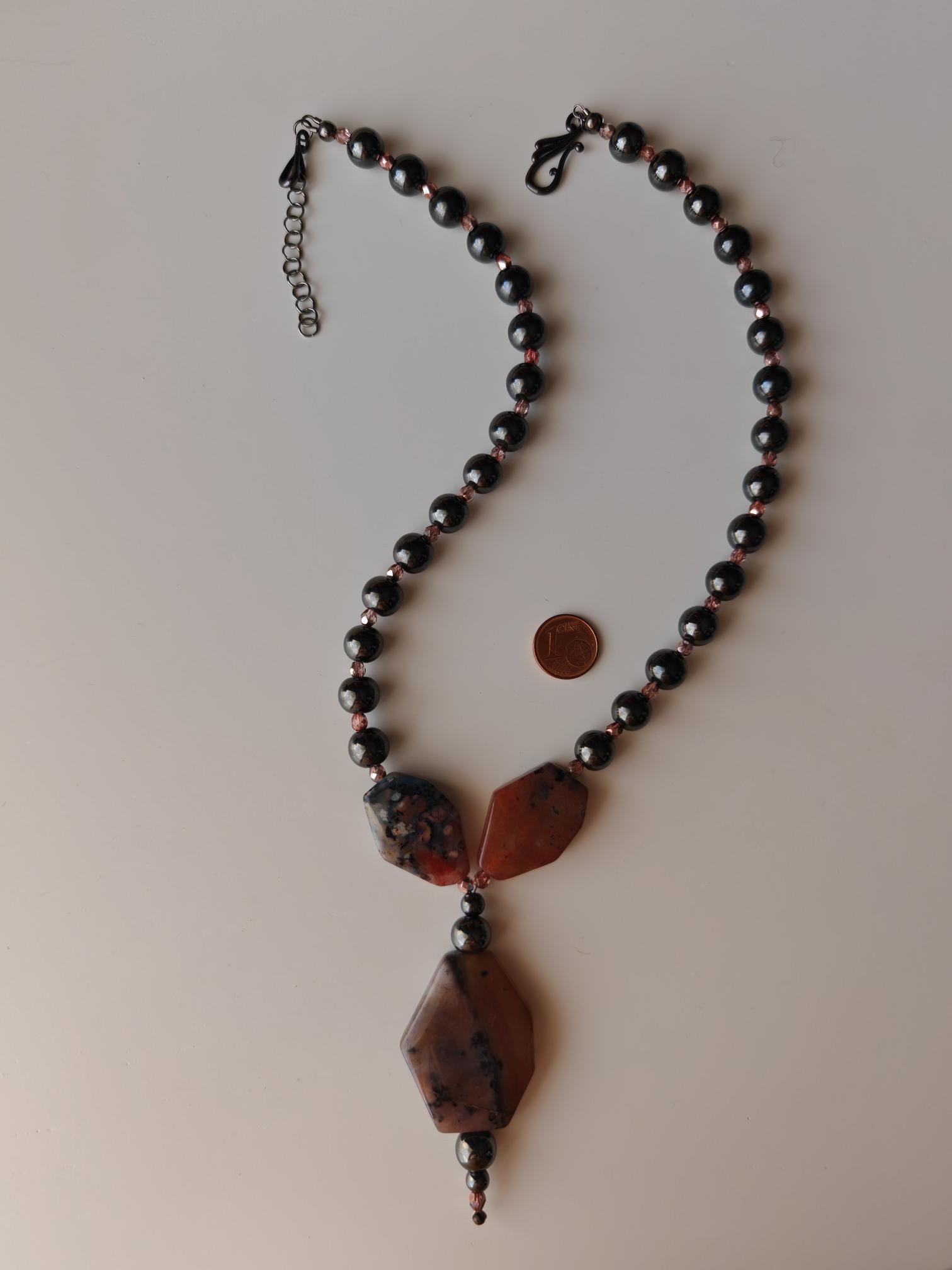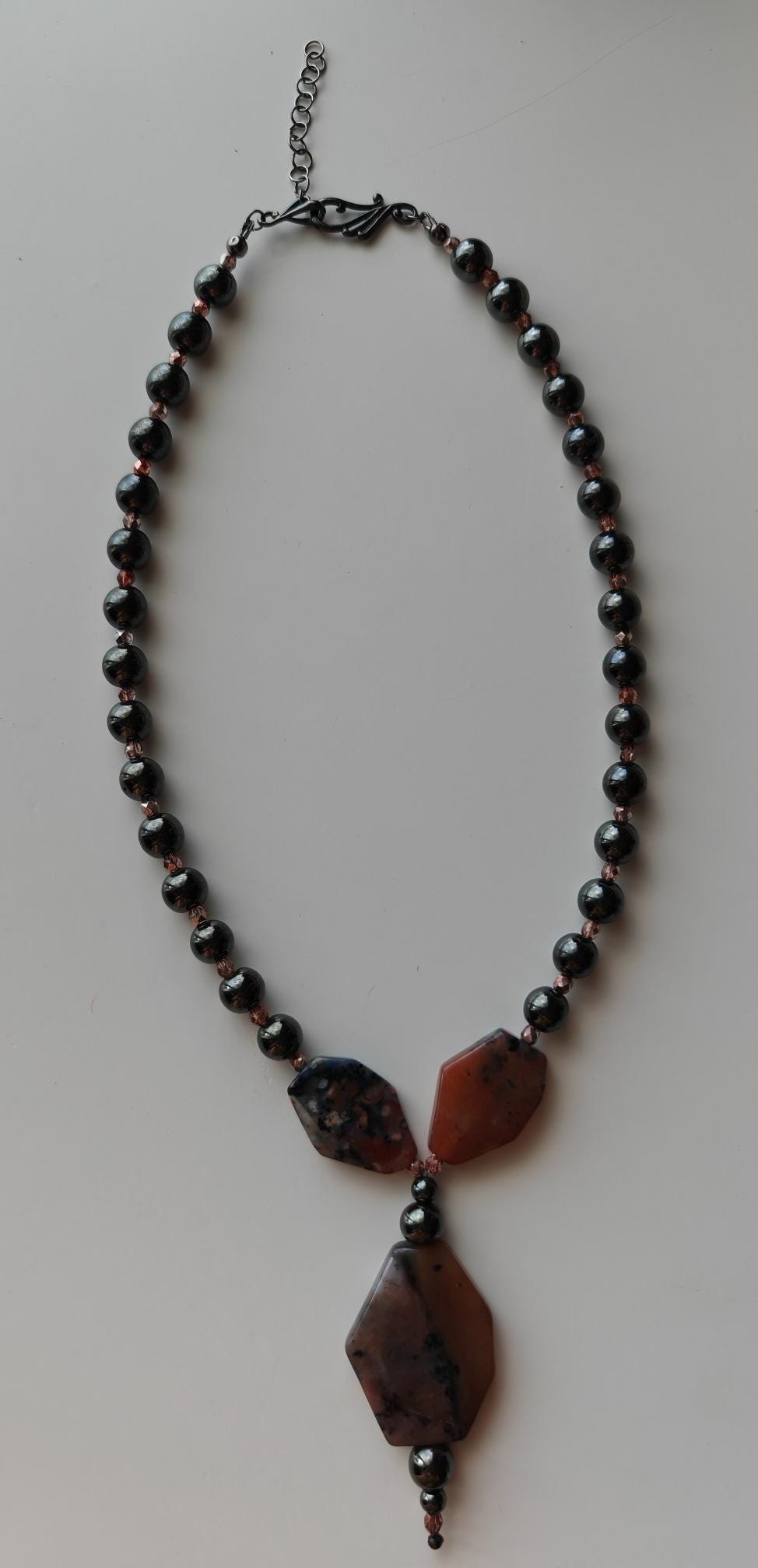 This handmade necklace with a black and rose gold pendant is approximately 55 cm long. The necklace is crafted from black high-gloss hematite beads (10 mm and 6 mm), faceted rose gold Bohemian glass beads (4 mm), faceted black spinel beads (3 mm), and 7-sided jasper multicolored beads in black, rose gold, and gray (41 mm x 31 mm x 9 mm and 30 mm x 21 mm x 7 mm). The pendant is approximately 75 mm long. The S-clasp and extension chain are black.