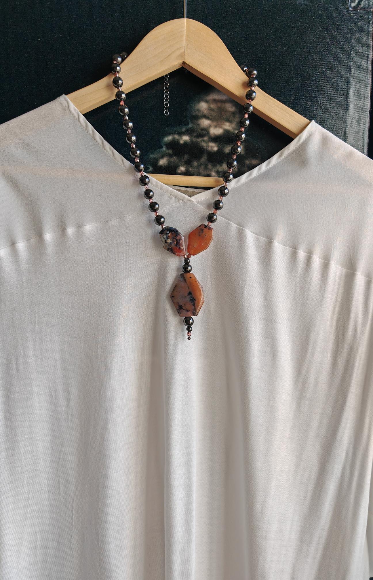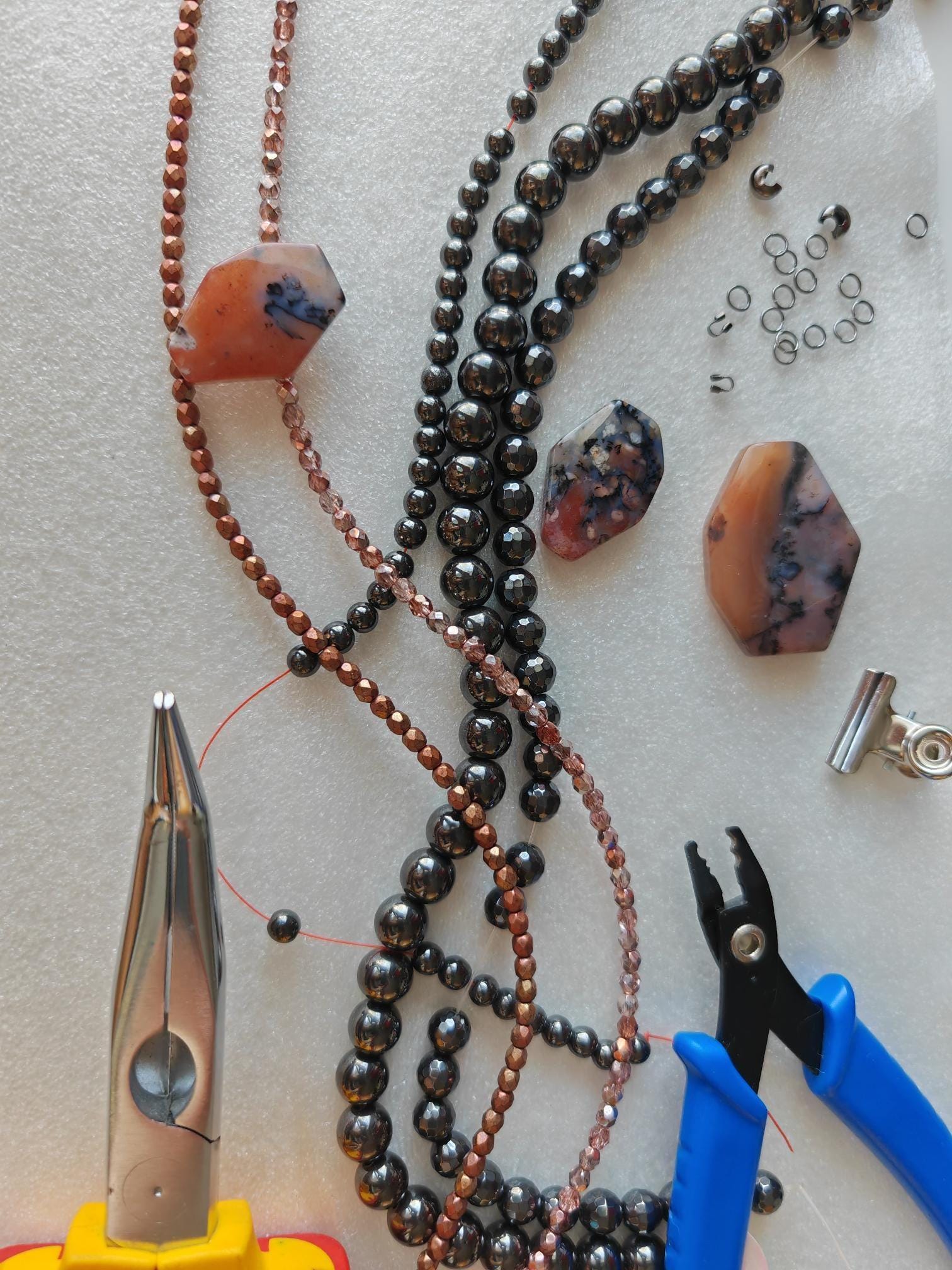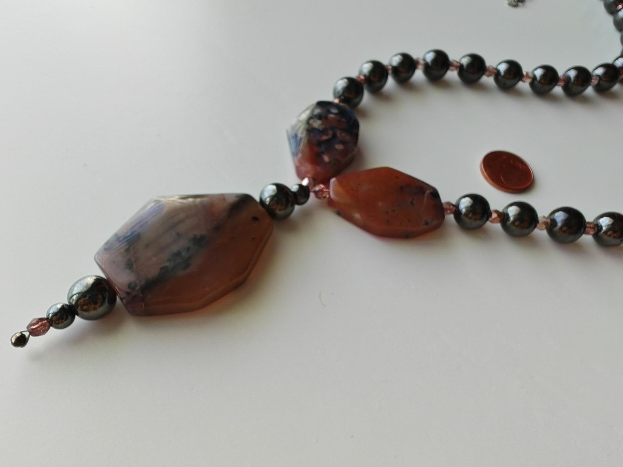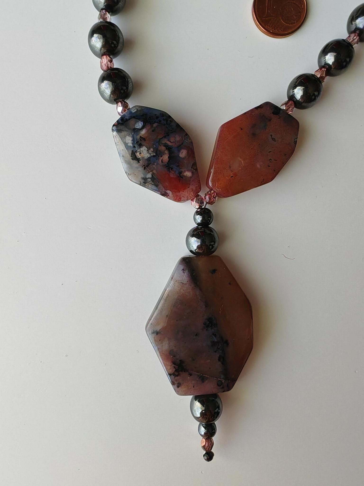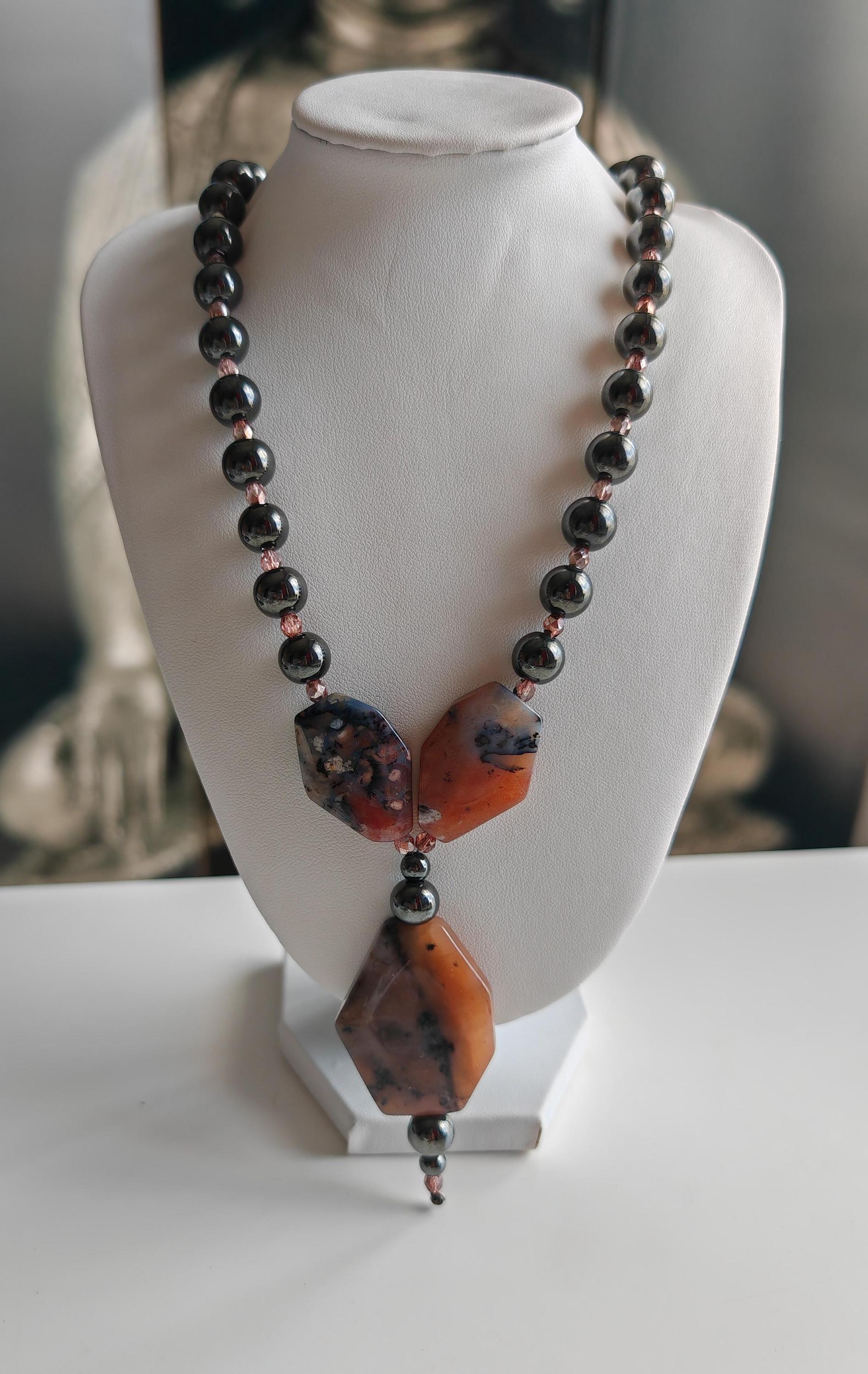 This handmade necklace with a black and rose gold pendant is approximately 55 cm long. The necklace is crafted from black high-gloss hematite beads (10 mm and 6 mm), faceted rose gold Bohemian glass beads (4 mm), faceted black spinel beads (3 mm), and 7-sided jasper multicolored beads in black, rose gold, and gray (41 mm x 31 mm x 9 mm and 30 mm x 21 mm x 7 mm). The pendant is approximately 75 mm long. The S-clasp and extension chain are black.